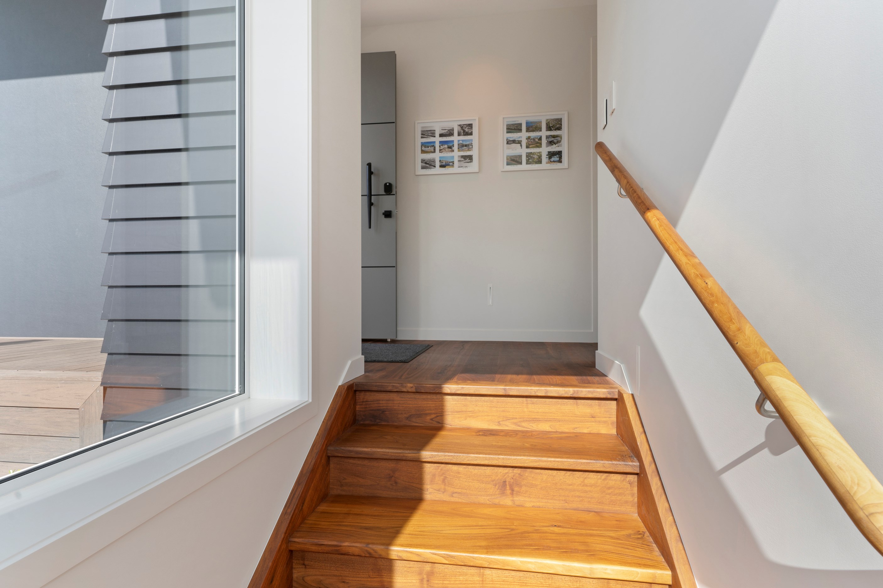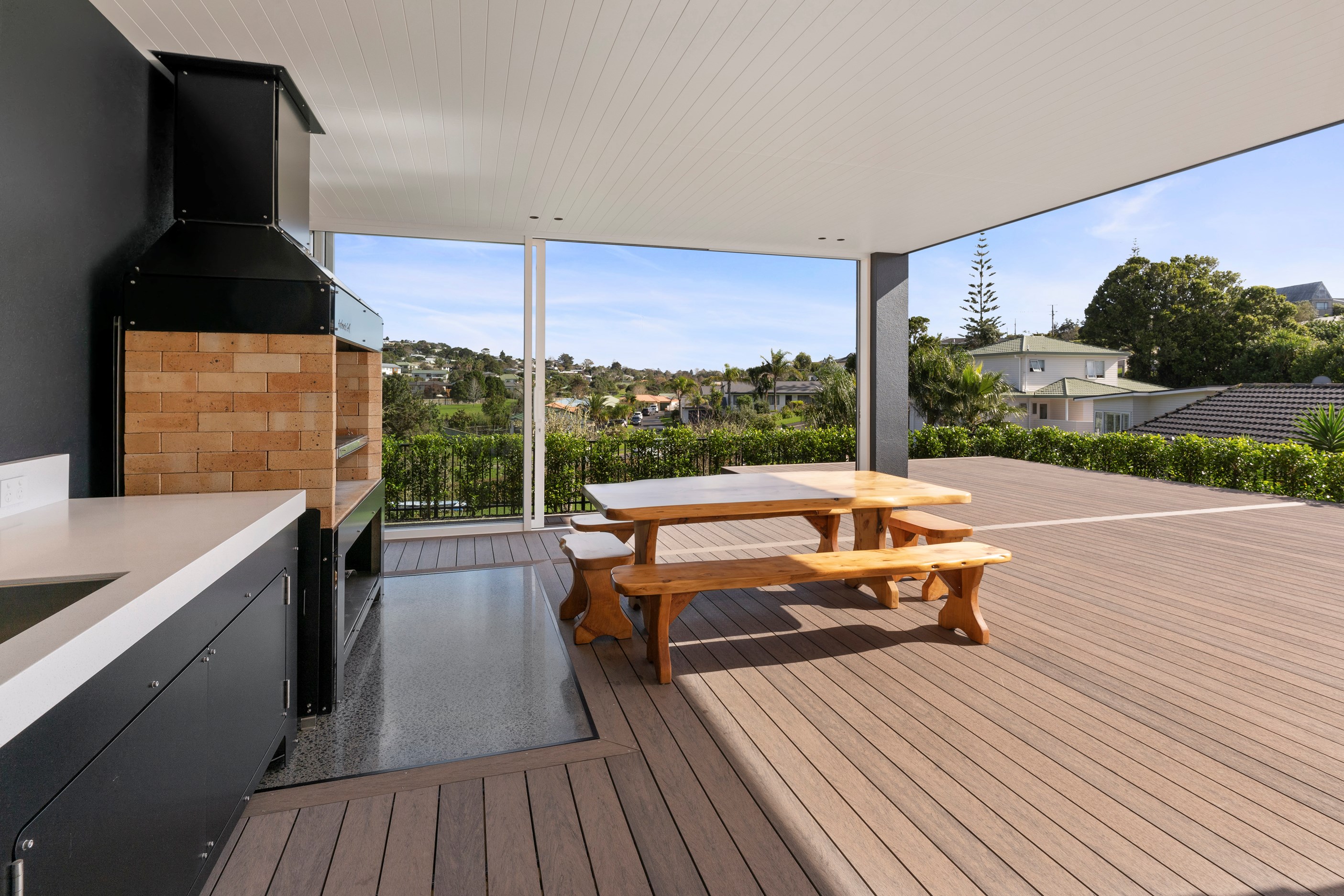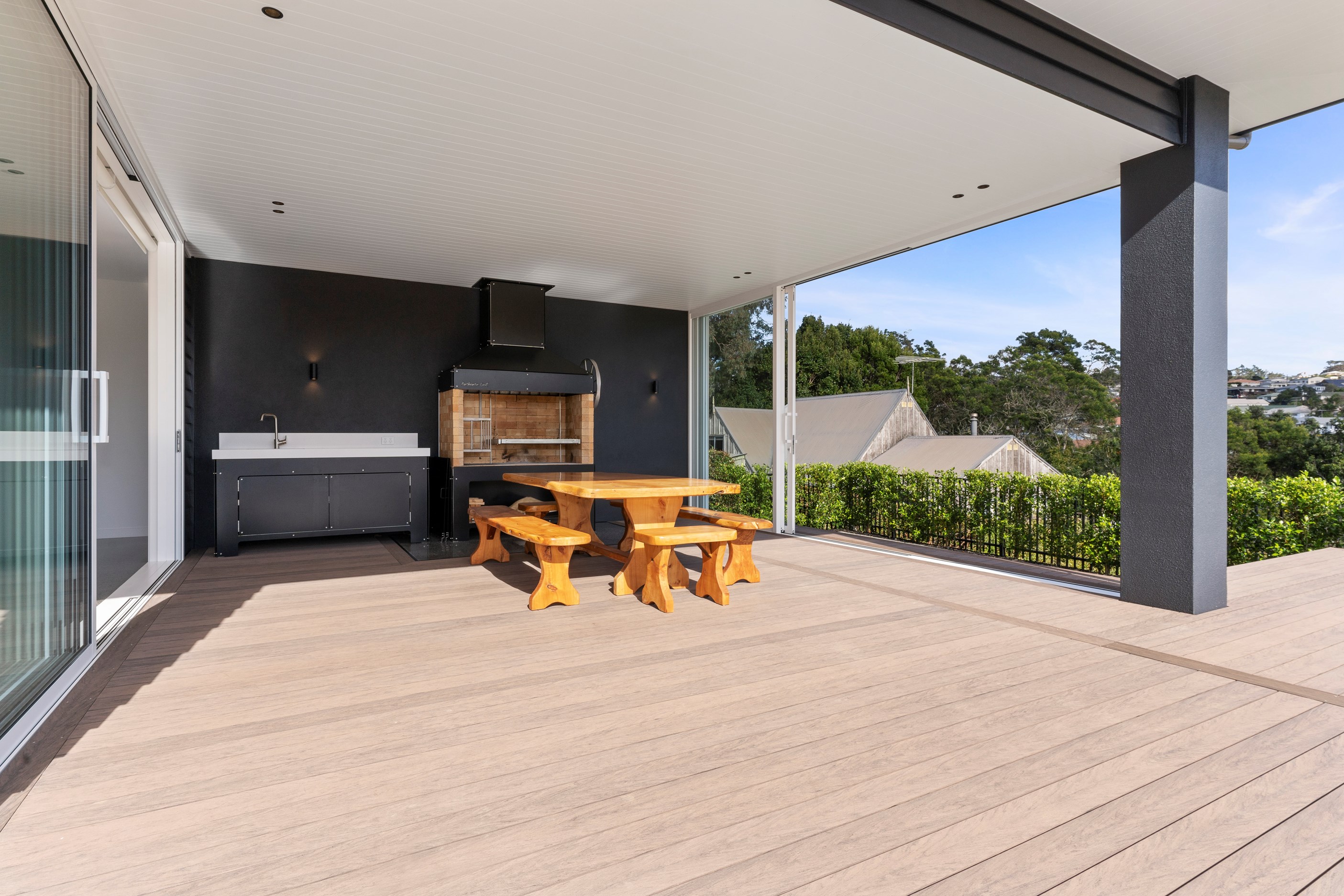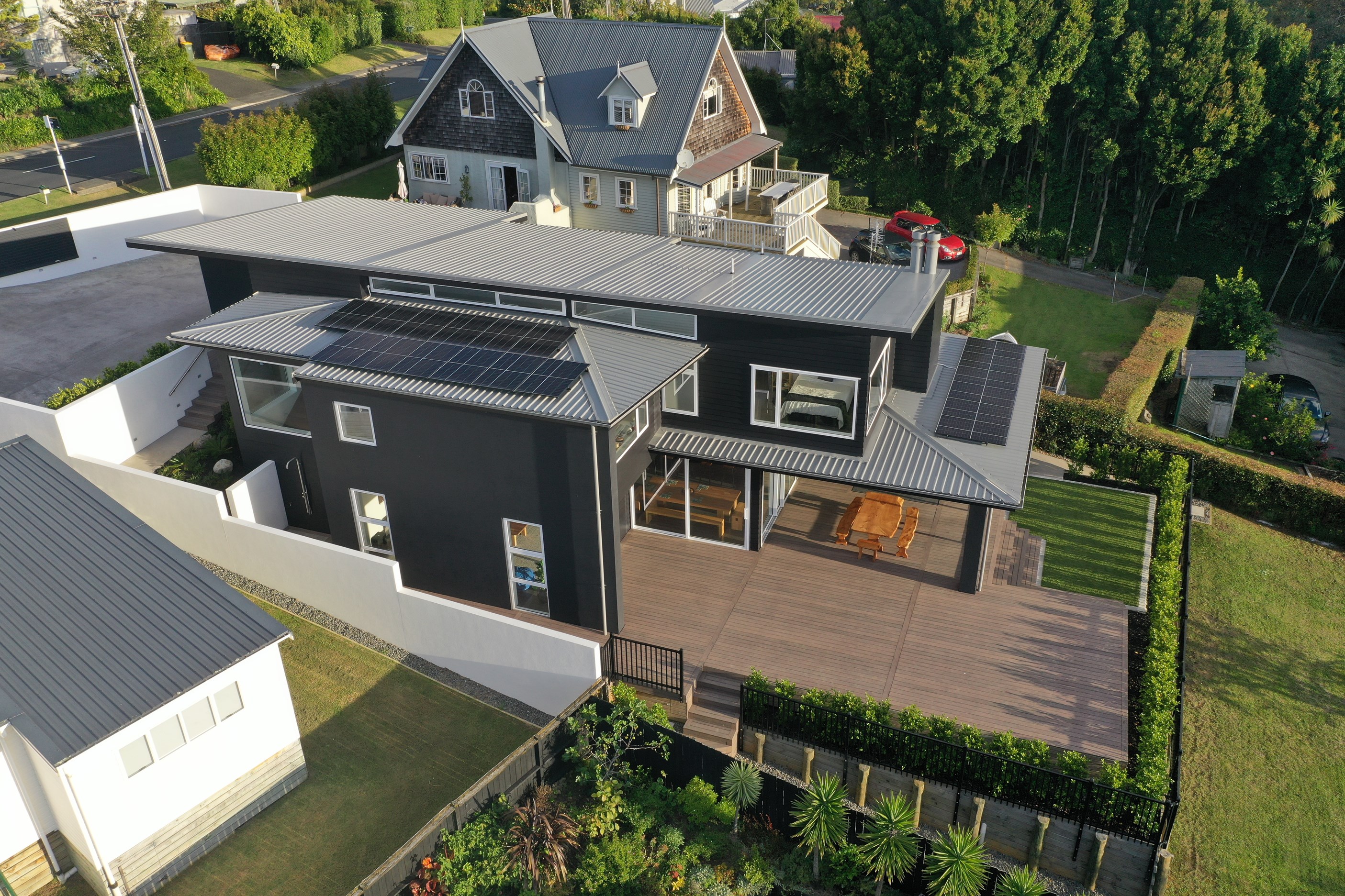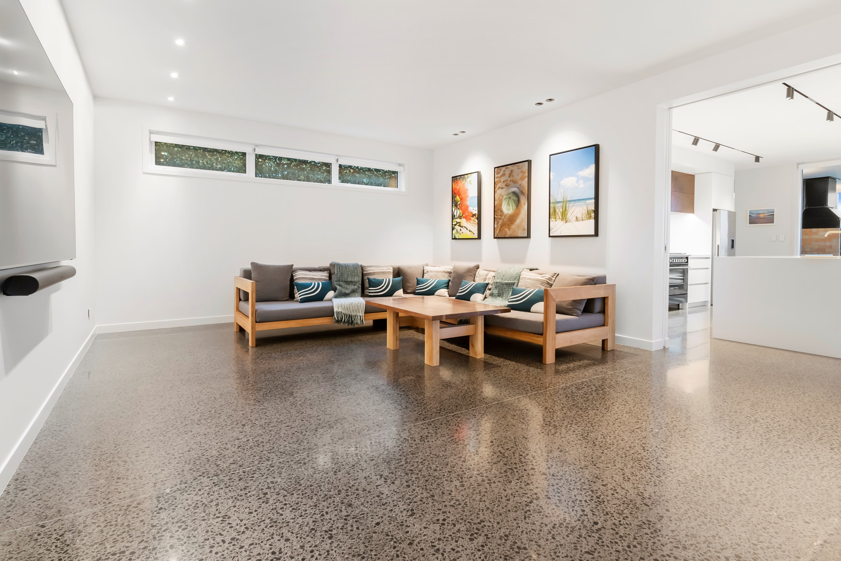 Coastal living doesn’t get much better than this — start your day by strolling to the beach for a morning dip then freshen up back home in the private outdoor shower, before enjoying breakfast on the sun-soaked deck. On the weekends it’s all about entertaining, with a walk-in commercial chiller to store the drinks and living spaces which flow seamlessly out to the partially covered deck, where the centrepiece is the Argentinian-style brick grill. Light filters into the 306sqm home, making details like the polished concrete floors and the solid walnut used on the wide staircase shine. The flooring in the entryway is also walnut as is the elevator flooring (accessibility is another highlight of this home). There’s plenty of room for family life, with two large living spaces on the open-plan ground floor partitioned off from the kitchen and dining area with carefully placed built-in shelving. Downstairs also houses a laundry, garage and guest toilet, and a scullery incorporating that famous walk-in chiller. Upstairs are four bedrooms, including a spacious main bedroom with ensuite, plus a study and family bathroom. Importantly, the house is also set up for a sustainable future, with solar panels and an EV car charging station.
