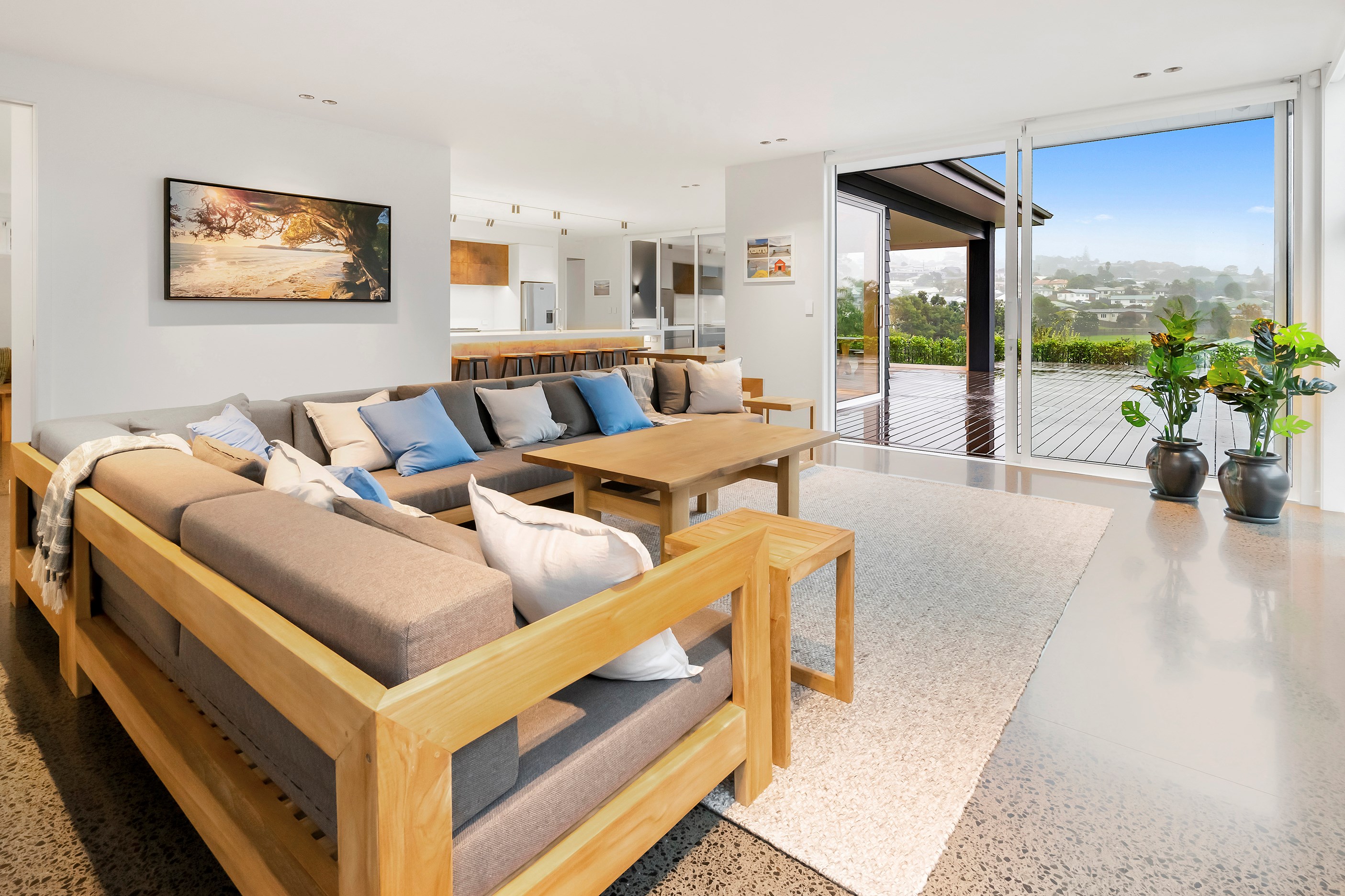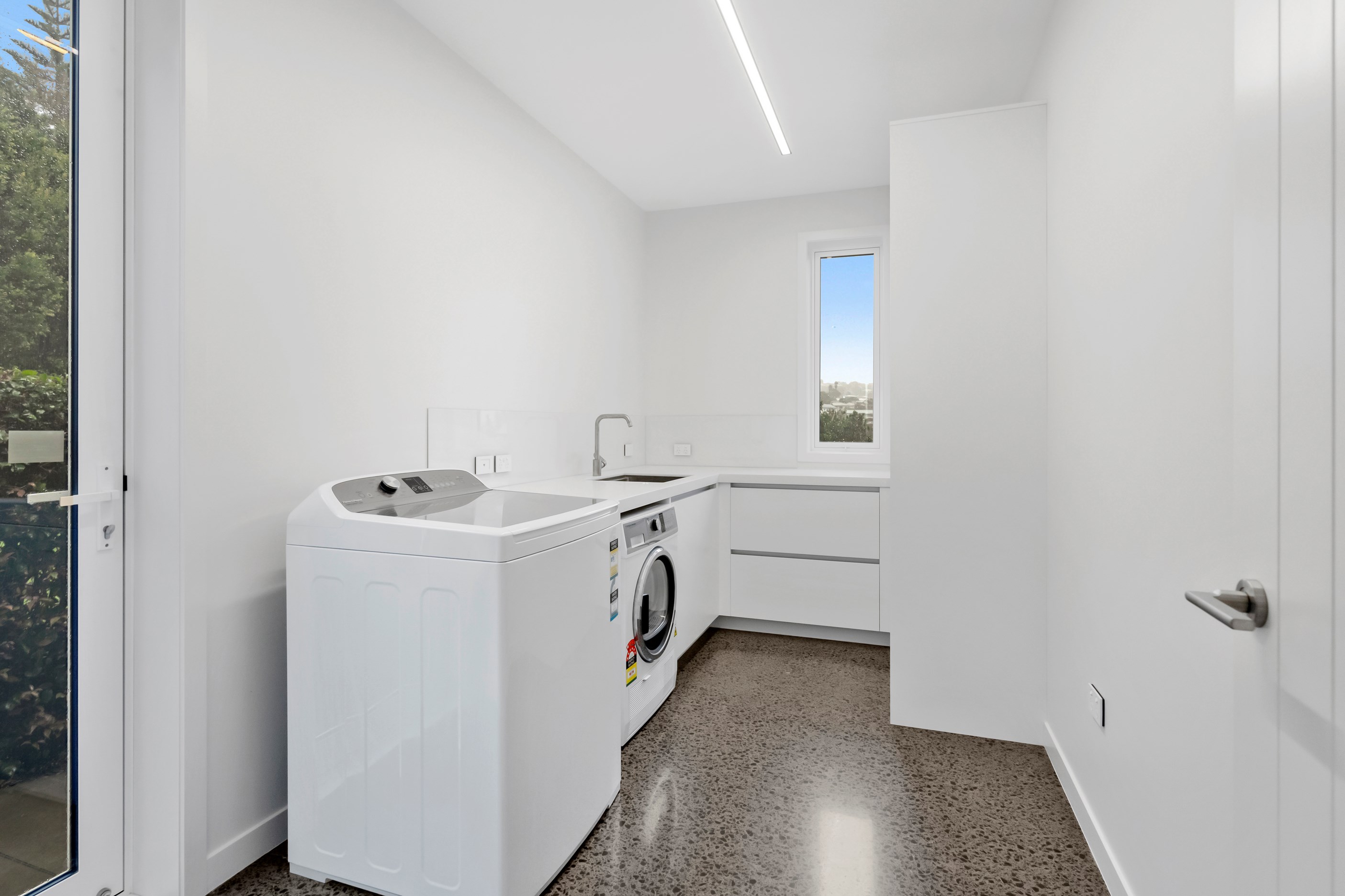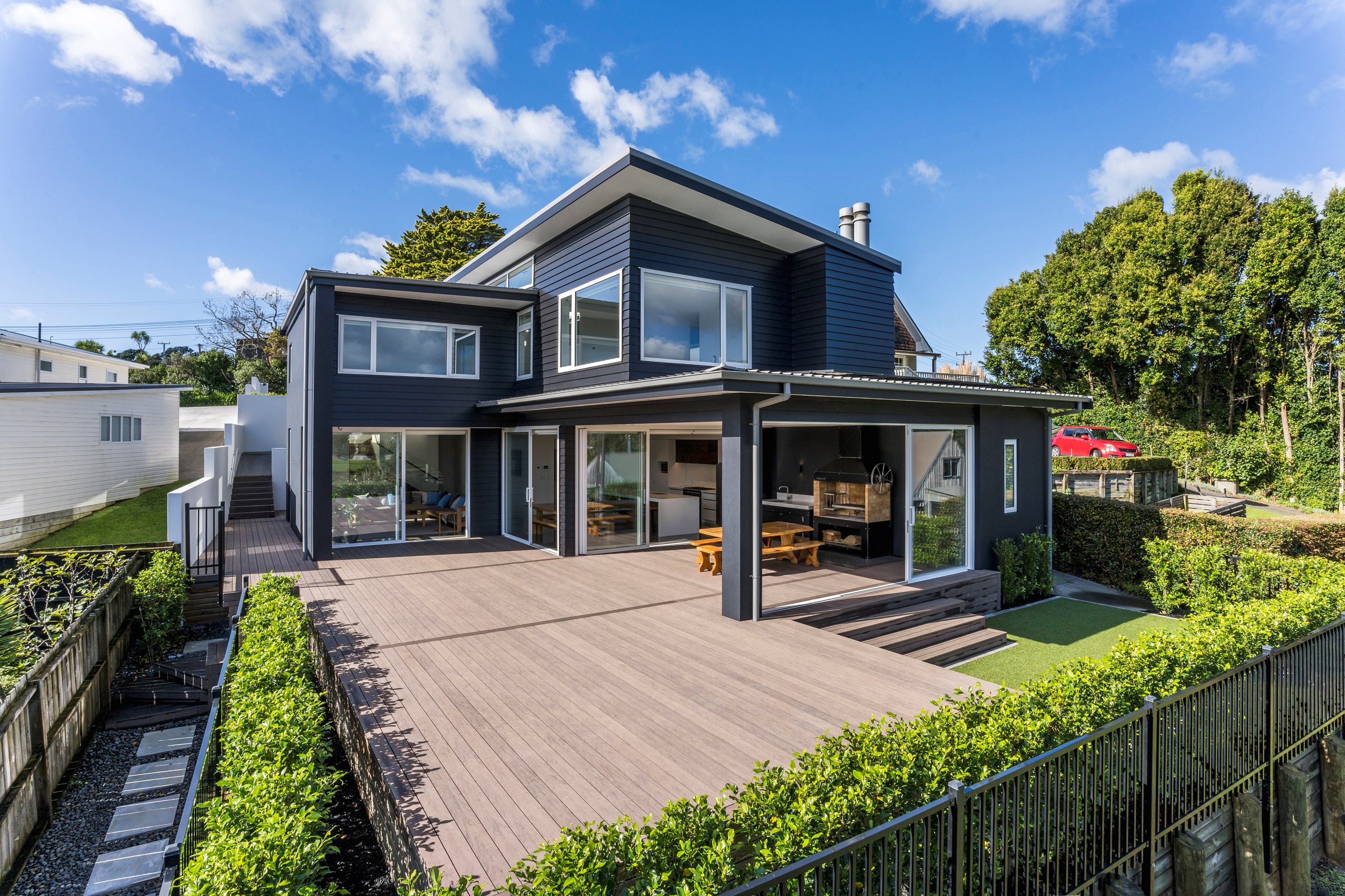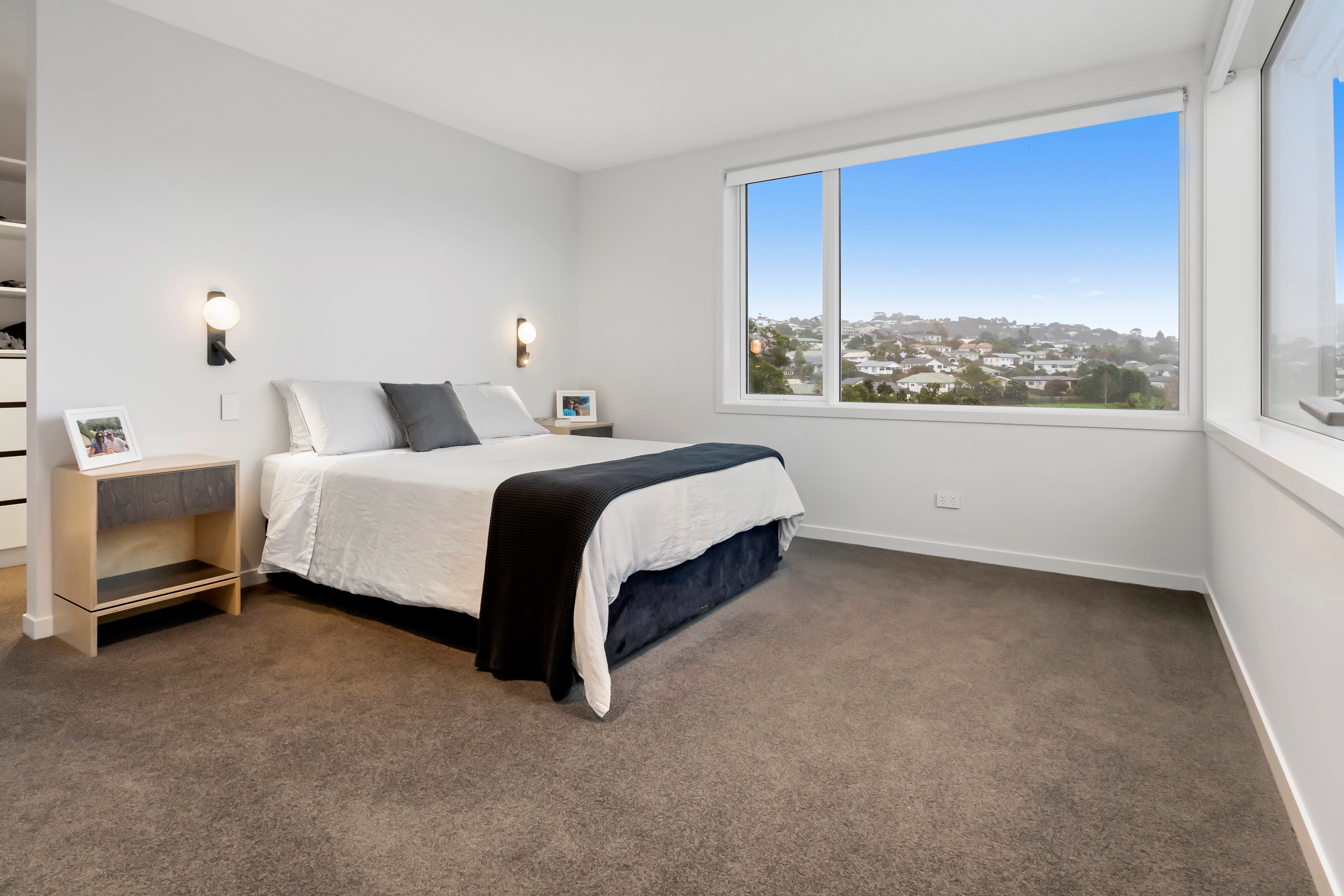 Coastal living doesn’t get much better than this — start your day by strolling to the beach for a morning dip then freshen up back home in the private outdoor shower, before enjoying breakfast on the sun-soaked deck. On the weekends it’s all about entertaining, with a walk-in commercial chiller to store the drinks and living spaces which flow seamlessly out to the partially covered deck, where the centrepiece is the Argentinian-style brick grill. Light filters into the 306sqm home, making details like the polished concrete floors and the solid walnut used on the wide staircase shine. The flooring in the entryway is also walnut as is the elevator flooring (accessibility is another highlight of this home). There’s plenty of room for family life, with two large living spaces on the open-plan ground floor partitioned off from the kitchen and dining area with carefully placed built-in shelving. Downstairs also houses a laundry, garage and guest toilet, and a scullery incorporating that famous walk-in chiller. Upstairs are four bedrooms, including a spacious main bedroom with ensuite, plus a study and family bathroom. Importantly, the house is also set up for a sustainable future, with solar panels and an EV car charging station.