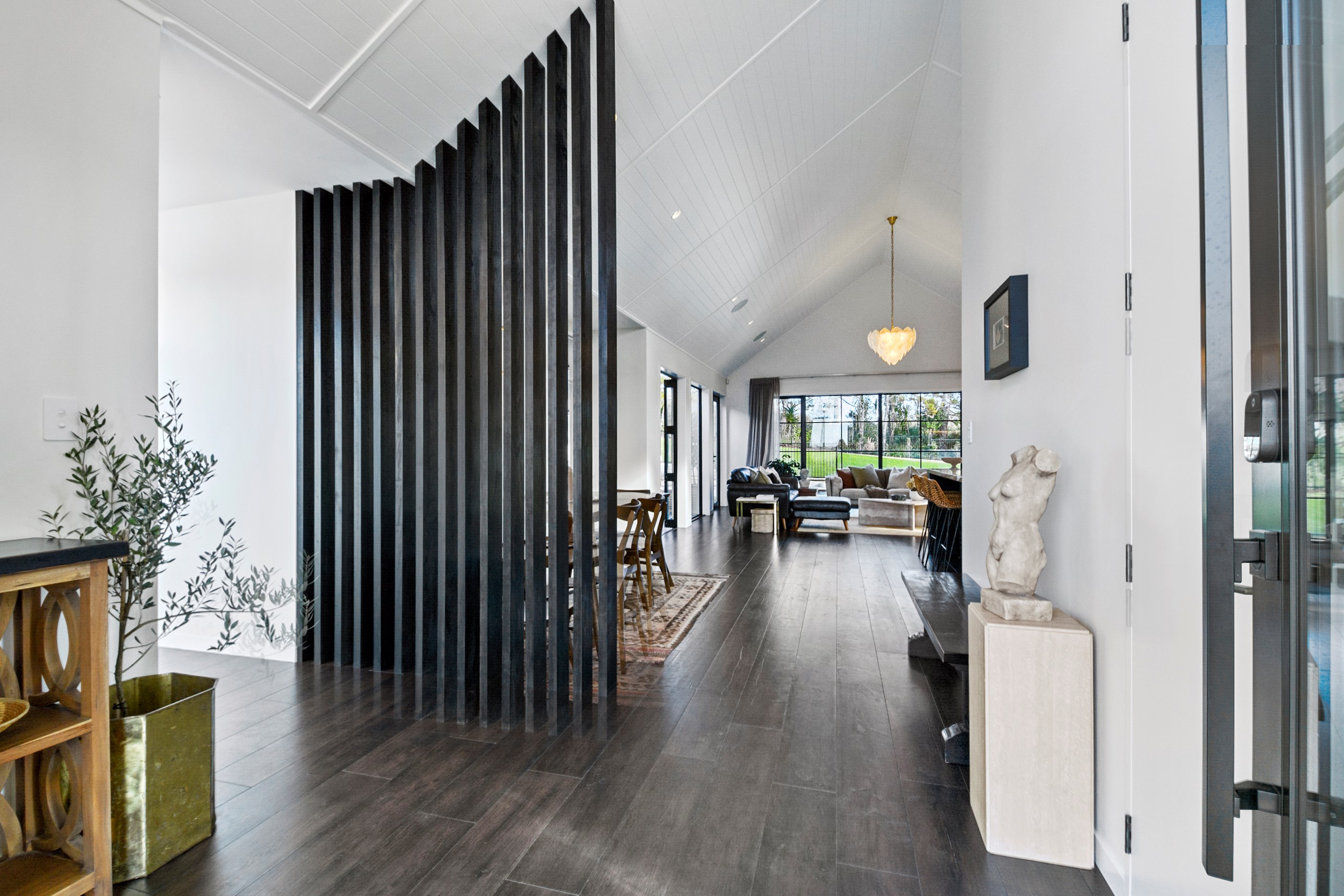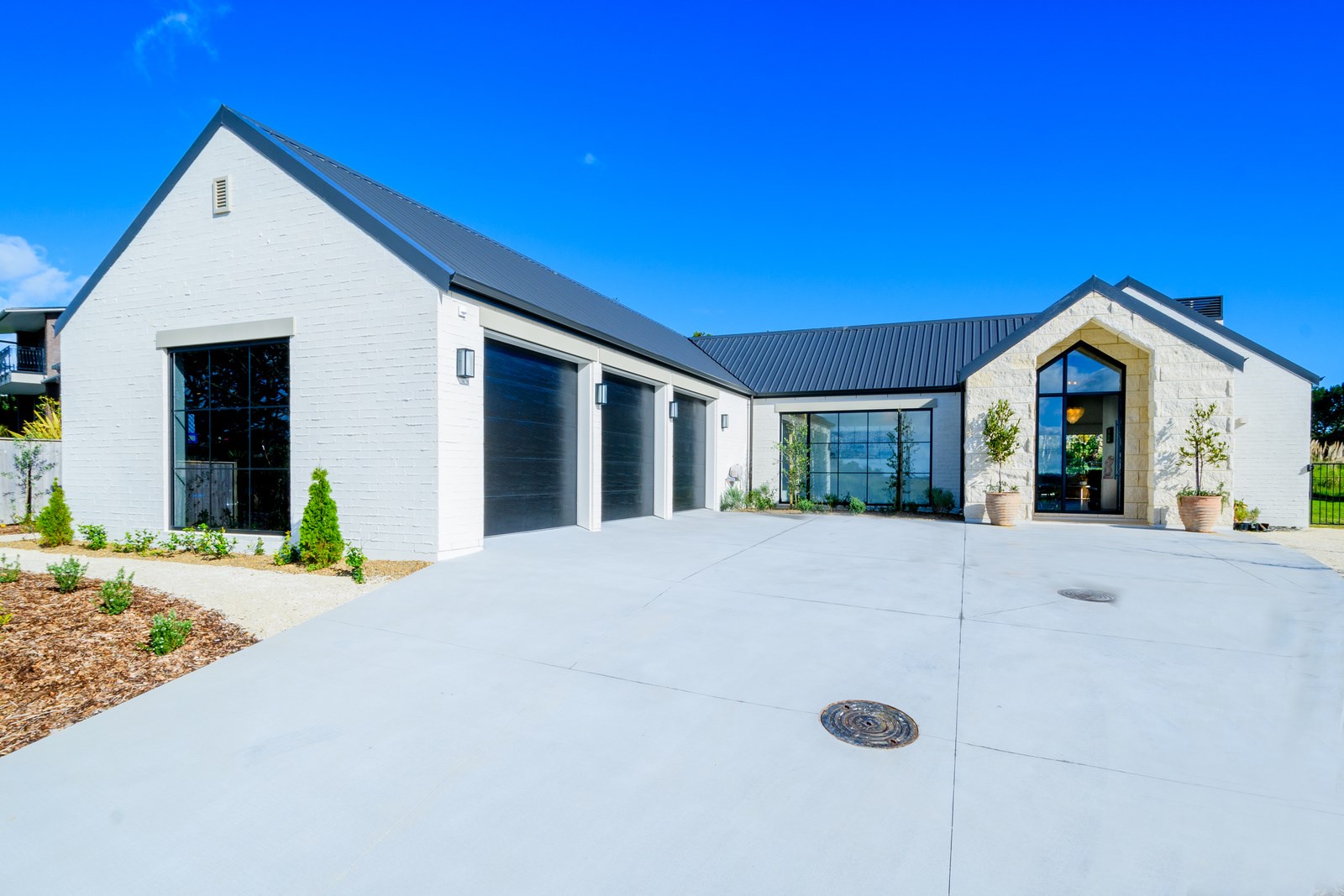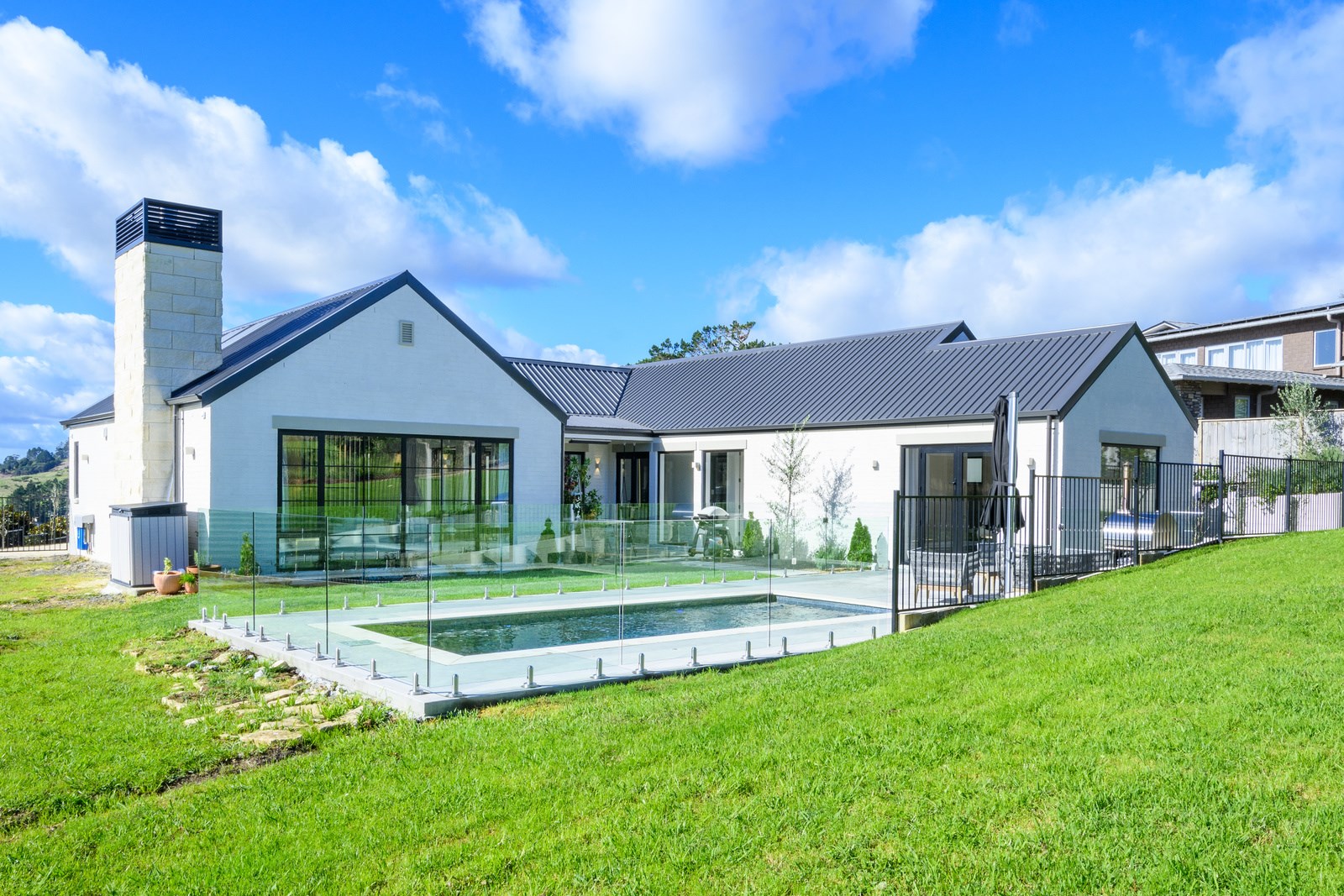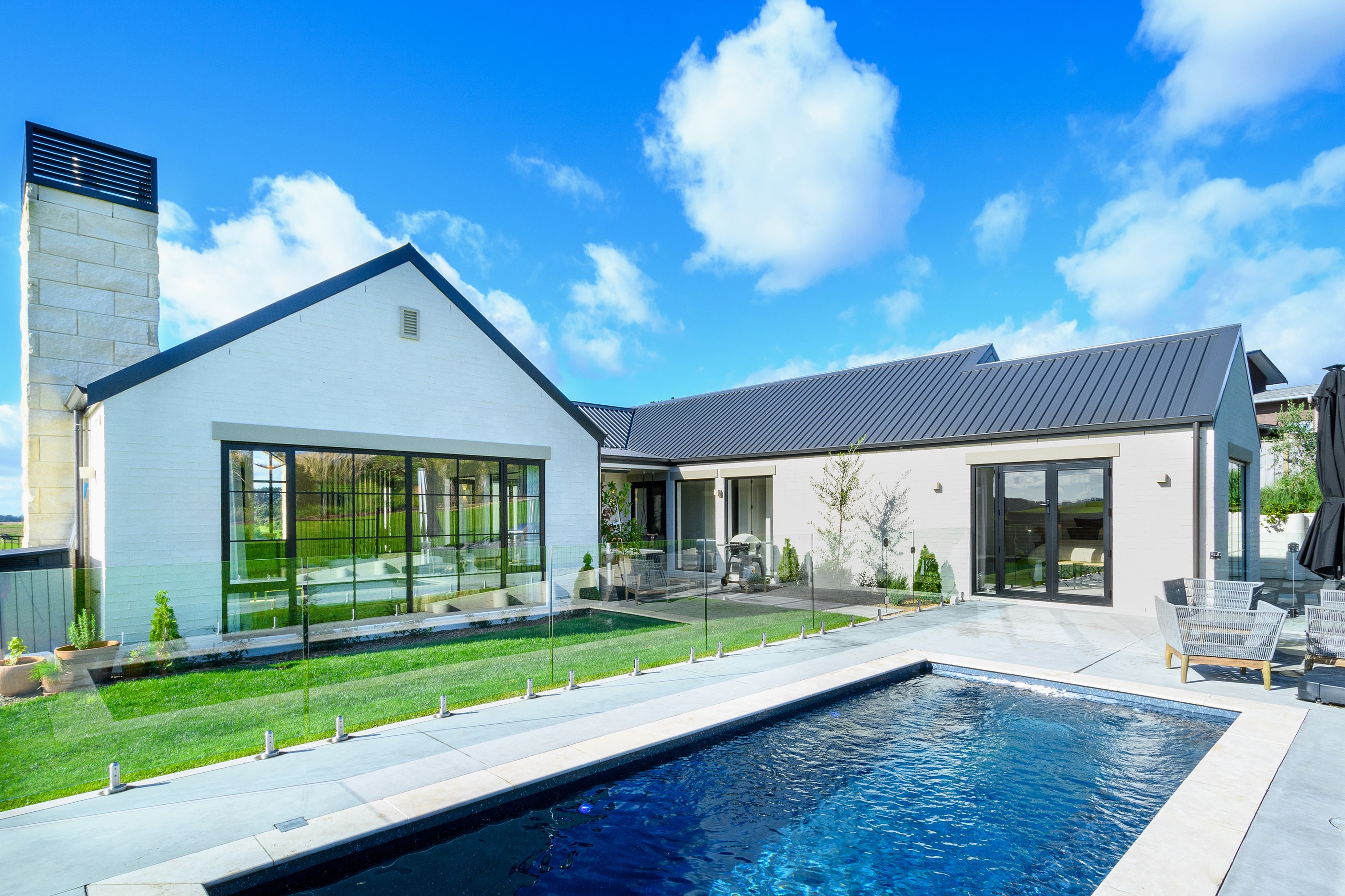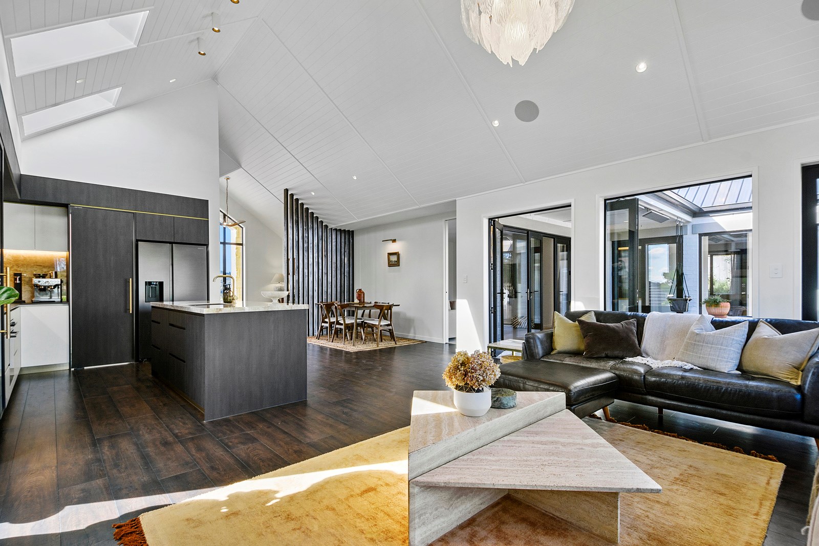 There’s something a little bit special about this 283sqm four-bedroom home that was built to maximise rolling views across the valley. The wow effect starts with the entry portico clad in split-faced Oamaru stone that surrounds the glass entry door and complements the adjacent wall of windows and contrasting textured-brick walls. This grand entry leads into the kitchen-living-dining area where cathedral ceilings make the room feel spacious, crafted timber slats screen the dining space and skylights brighten the well-appointed kitchen with its brass fixtures and marbled Dekton island bench. The living space is ideal for relaxing or entertaining. It has striking views, a fireplace with custom fluted stone and doors opening to a private, partially covered courtyard that leads to the pool and lawns beyond. An adjacent media room connects the two wings. The opposite wing is home to the main bedroom suite with walk-in wardrobe and ensuite, three further bedrooms (one decorated as an office), the family bathroom and a triple garage. The bathrooms feature in-wall toilet systems and stone basins along with brass and gunmetal fixtures that enhance the traditional aesthetic, as do the hardwood floors throughout.