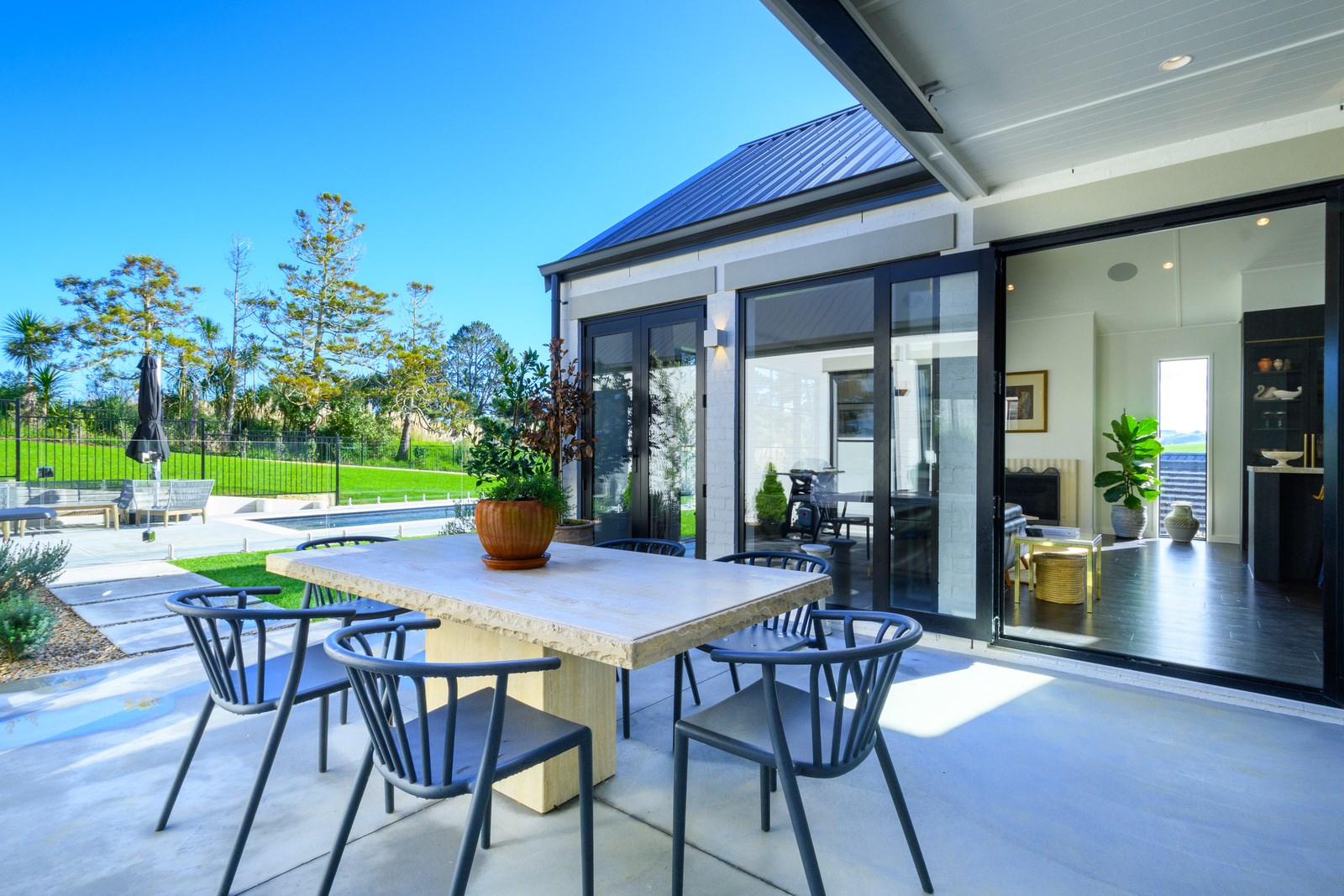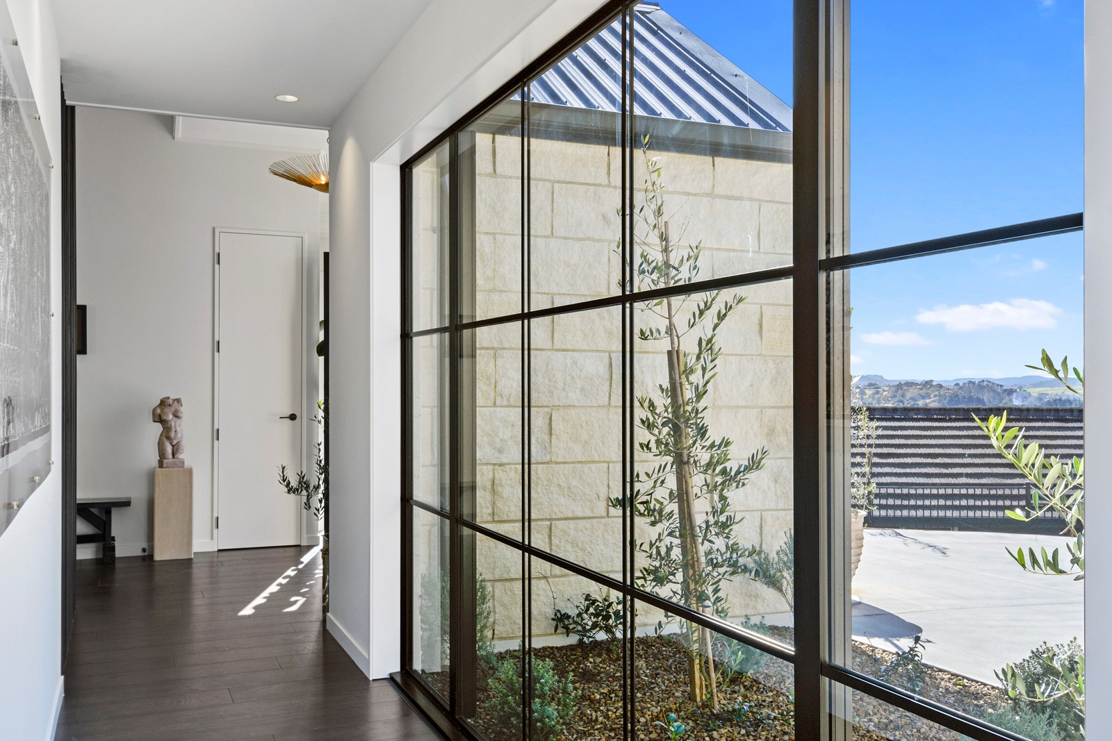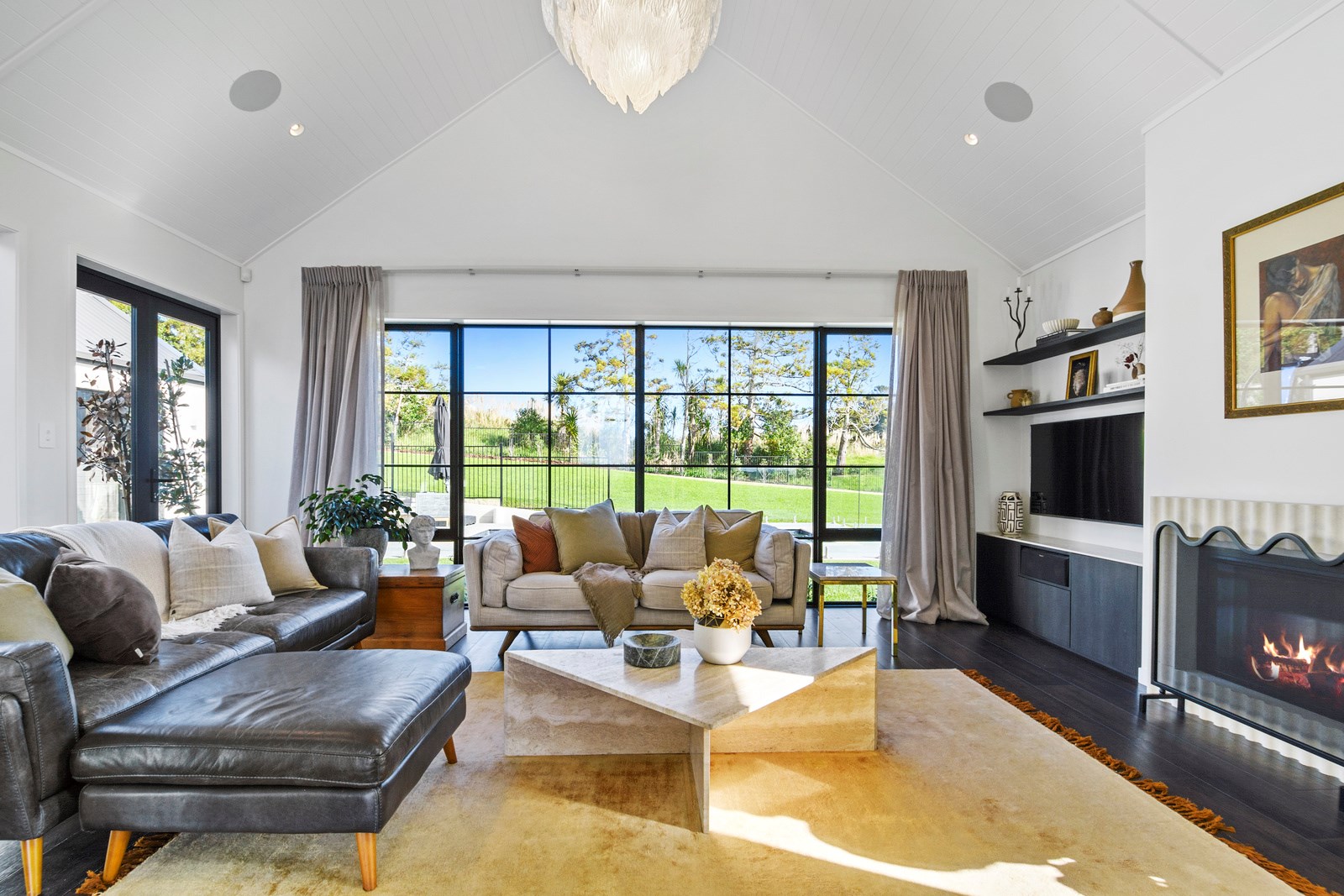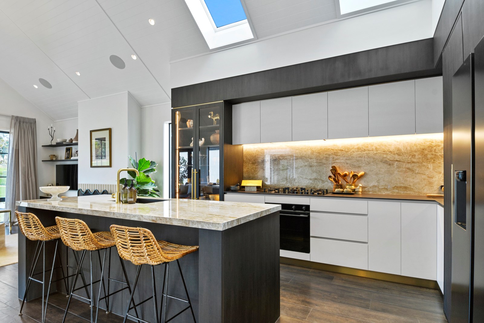 There’s something a little bit special about this 283sqm four-bedroom home that was built to maximise rolling views across the valley. The wow effect starts with the entry portico clad in split-faced Oamaru stone that surrounds the glass entry door and complements the adjacent wall of windows and contrasting textured-brick walls. This grand entry leads into the kitchen-living-dining area where cathedral ceilings make the room feel spacious, crafted timber slats screen the dining space and skylights brighten the well-appointed kitchen with its brass fixtures and marbled Dekton island bench. The living space is ideal for relaxing or entertaining. It has striking views, a fireplace with custom fluted stone and doors opening to a private, partially covered courtyard that leads to the pool and lawns beyond. An adjacent media room connects the two wings. The opposite wing is home to the main bedroom suite with walk-in wardrobe and ensuite, three further bedrooms (one decorated as an office), the family bathroom and a triple garage. The bathrooms feature in-wall toilet systems and stone basins along with brass and gunmetal fixtures that enhance the traditional aesthetic, as do the hardwood floors throughout.