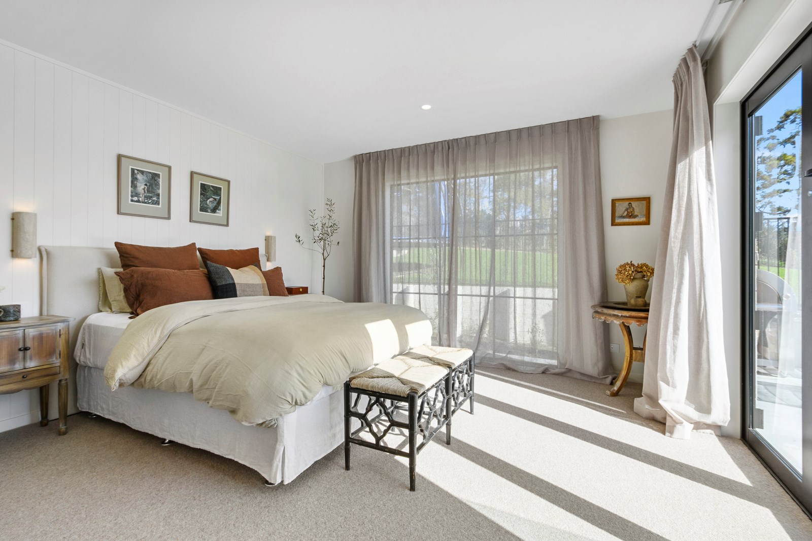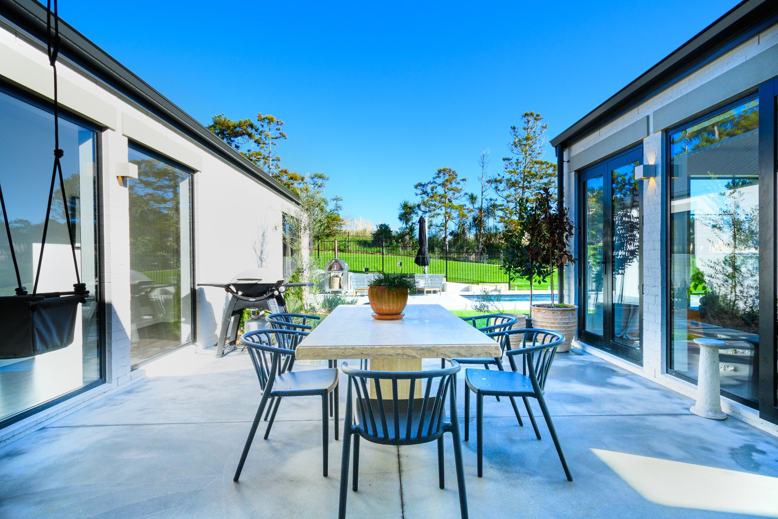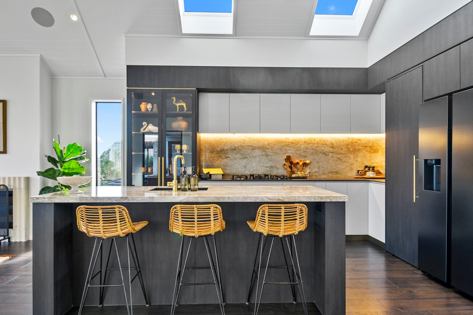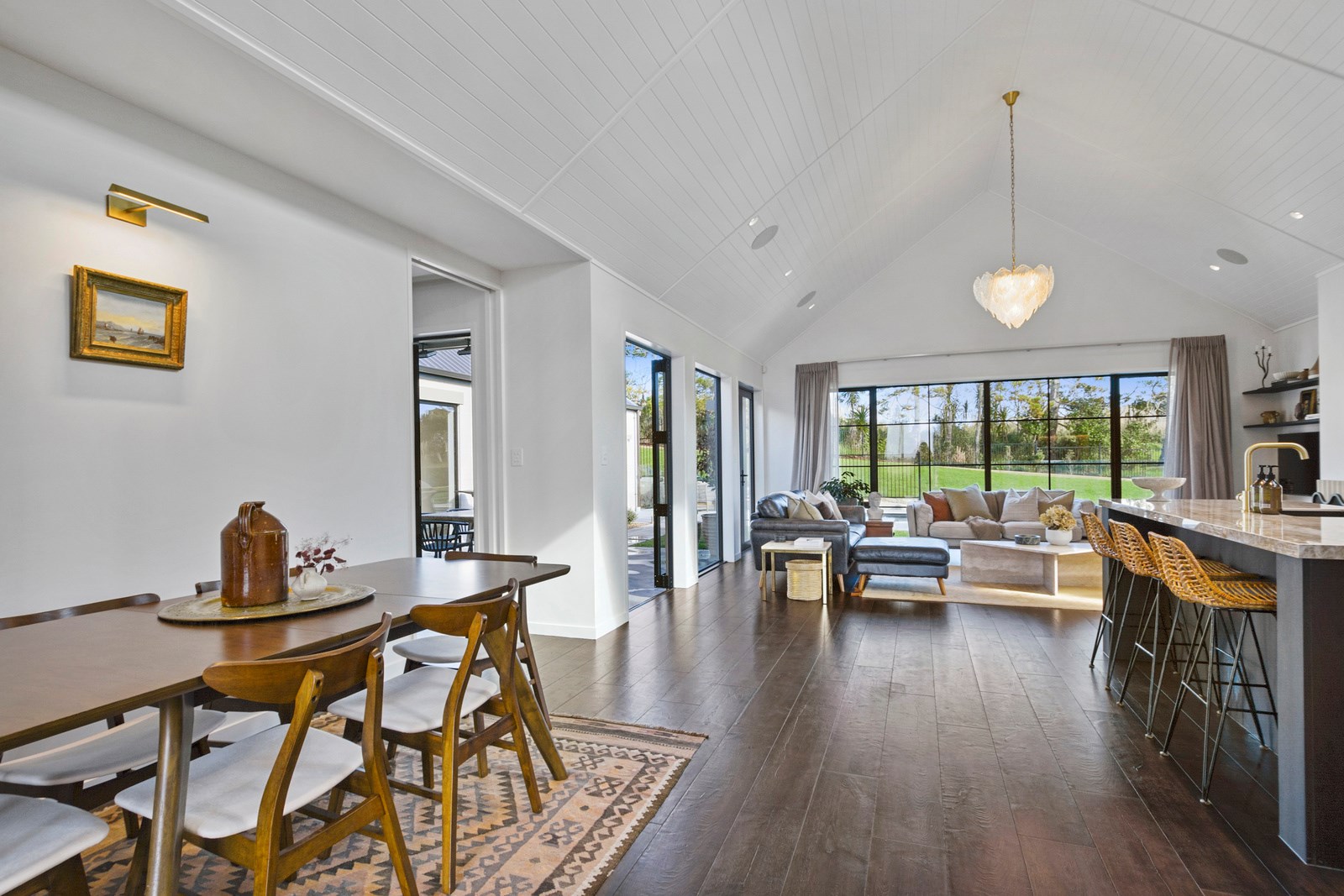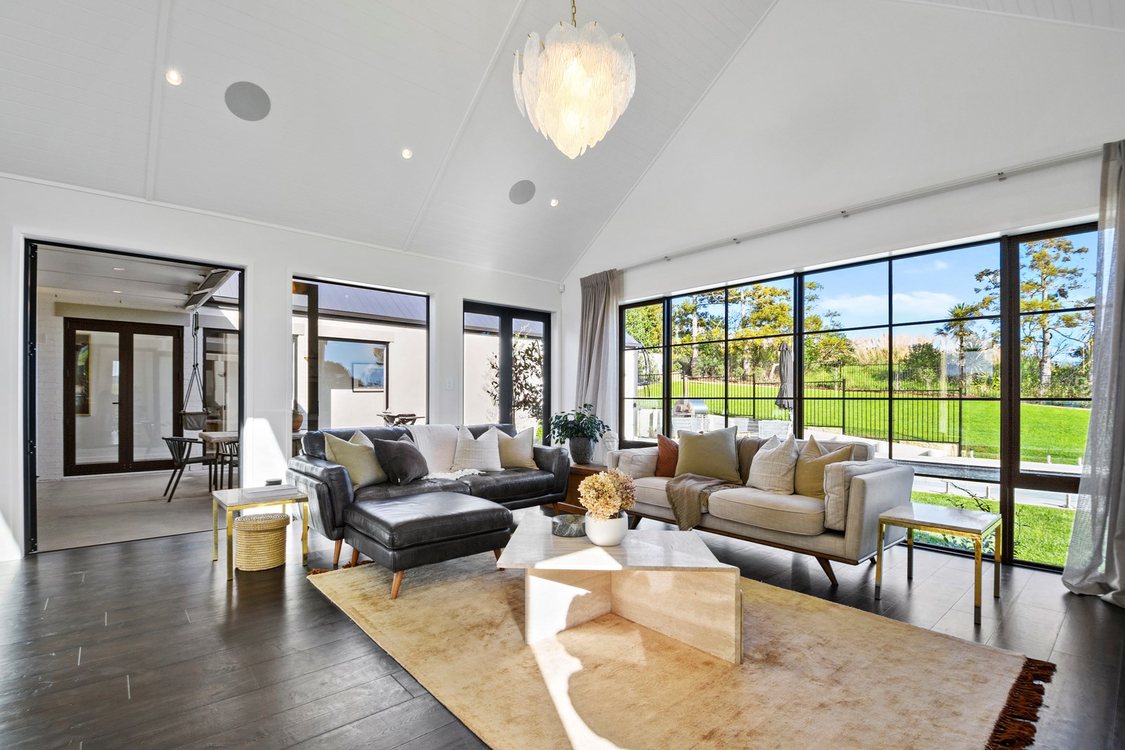 There’s something a little bit special about this 283sqm four-bedroom home that was built to maximise rolling views across the valley. The wow effect starts with the entry portico clad in split-faced Oamaru stone that surrounds the glass entry door and complements the adjacent wall of windows and contrasting textured-brick walls. This grand entry leads into the kitchen-living-dining area where cathedral ceilings make the room feel spacious, crafted timber slats screen the dining space and skylights brighten the well-appointed kitchen with its brass fixtures and marbled Dekton island bench. The living space is ideal for relaxing or entertaining. It has striking views, a fireplace with custom fluted stone and doors opening to a private, partially covered courtyard that leads to the pool and lawns beyond. An adjacent media room connects the two wings. The opposite wing is home to the main bedroom suite with walk-in wardrobe and ensuite, three further bedrooms (one decorated as an office), the family bathroom and a triple garage. The bathrooms feature in-wall toilet systems and stone basins along with brass and gunmetal fixtures that enhance the traditional aesthetic, as do the hardwood floors throughout.