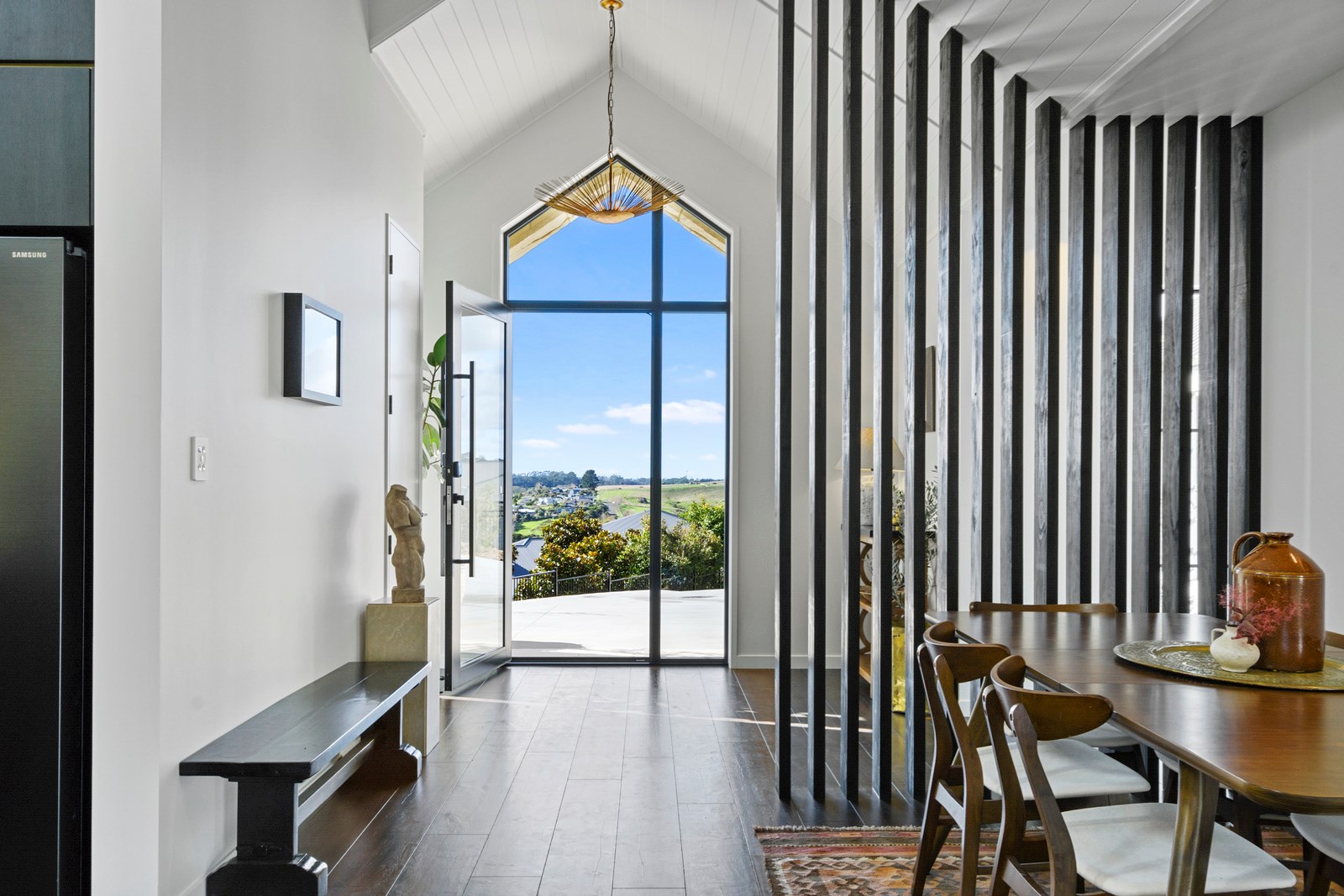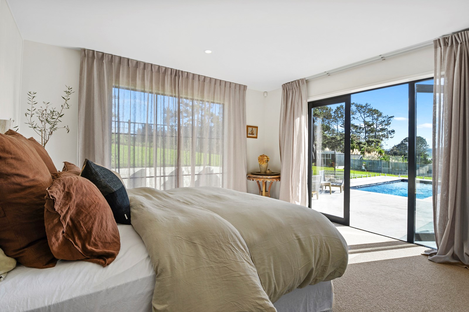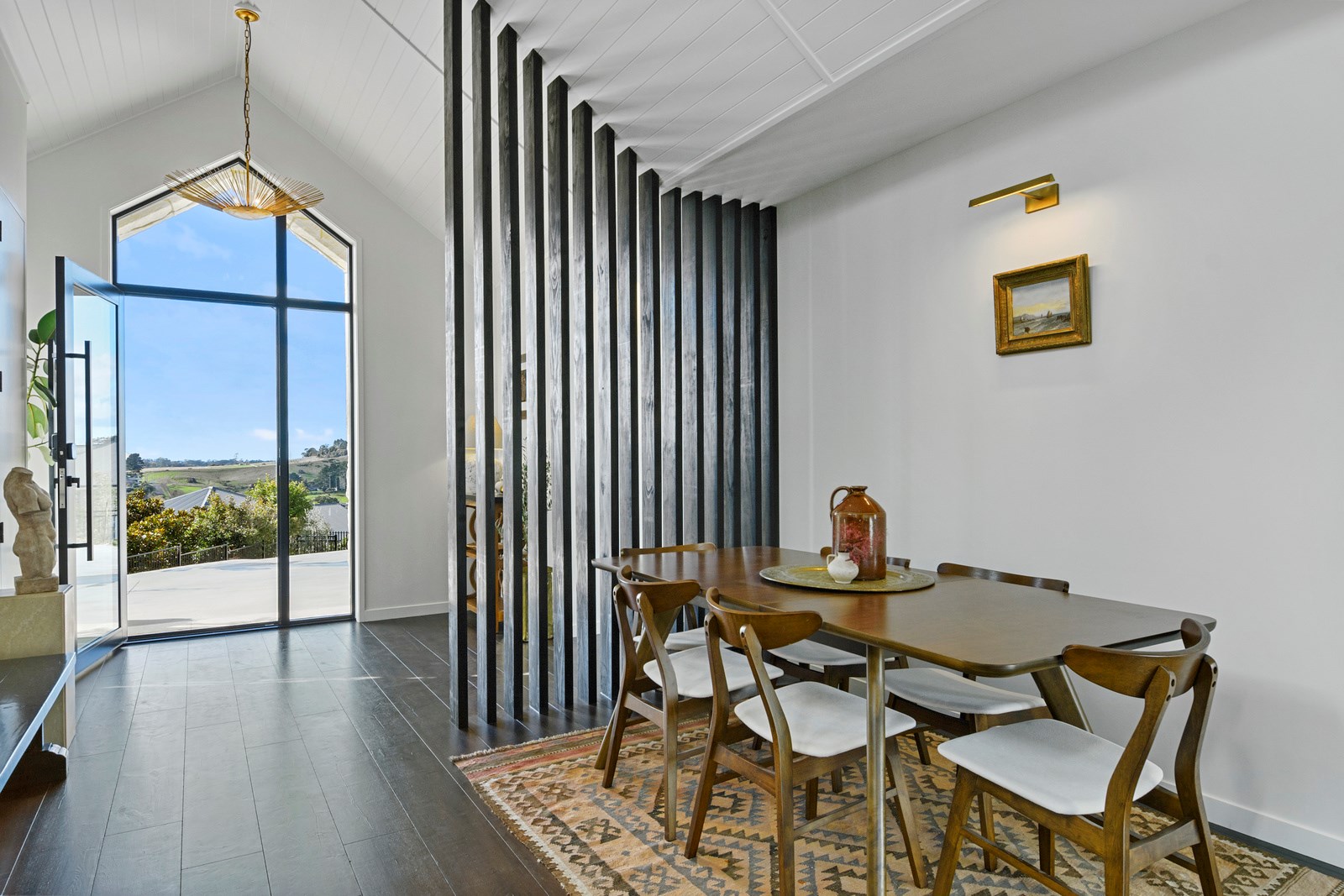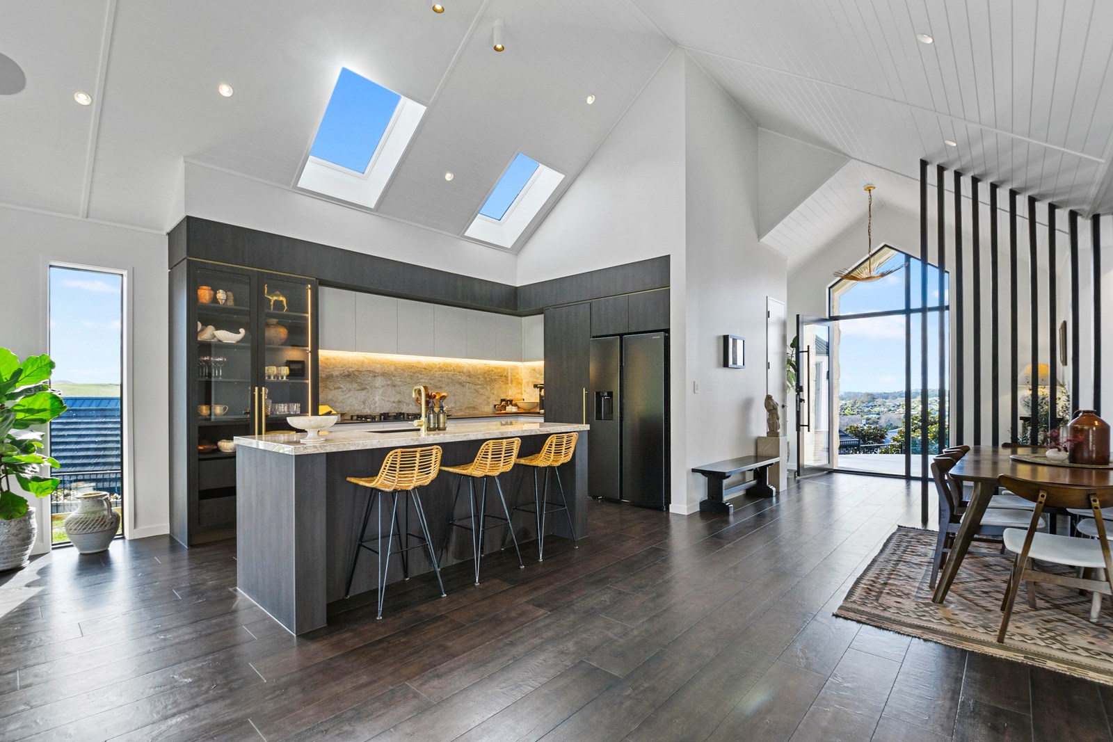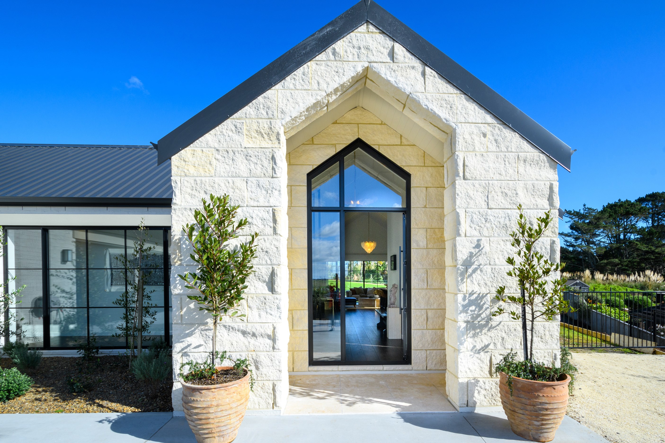 There’s something a little bit special about this 283sqm four-bedroom home that was built to maximise rolling views across the valley. The wow effect starts with the entry portico clad in split-faced Oamaru stone that surrounds the glass entry door and complements the adjacent wall of windows and contrasting textured-brick walls. This grand entry leads into the kitchen-living-dining area where cathedral ceilings make the room feel spacious, crafted timber slats screen the dining space and skylights brighten the well-appointed kitchen with its brass fixtures and marbled Dekton island bench. The living space is ideal for relaxing or entertaining. It has striking views, a fireplace with custom fluted stone and doors opening to a private, partially covered courtyard that leads to the pool and lawns beyond. An adjacent media room connects the two wings. The opposite wing is home to the main bedroom suite with walk-in wardrobe and ensuite, three further bedrooms (one decorated as an office), the family bathroom and a triple garage. The bathrooms feature in-wall toilet systems and stone basins along with brass and gunmetal fixtures that enhance the traditional aesthetic, as do the hardwood floors throughout.