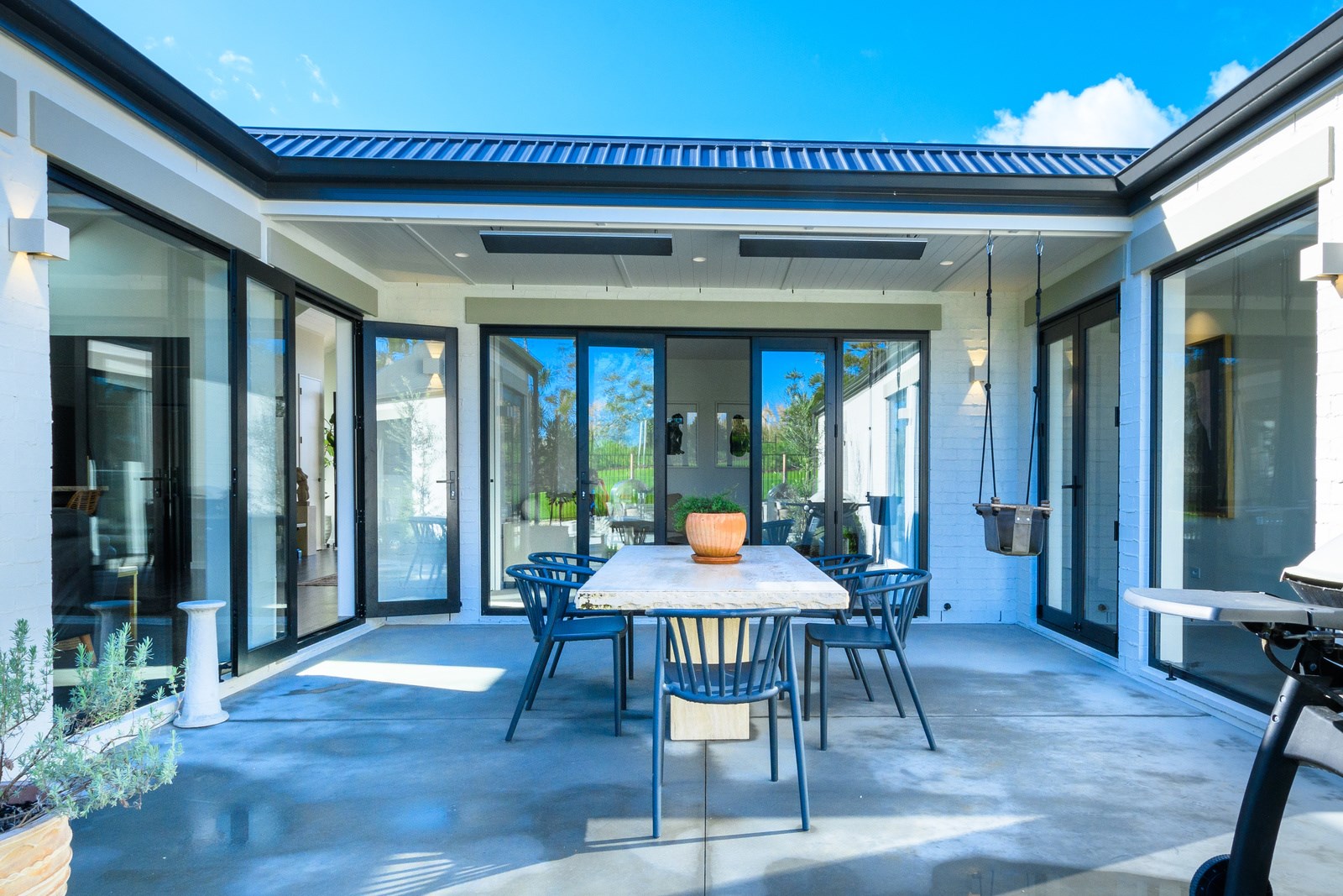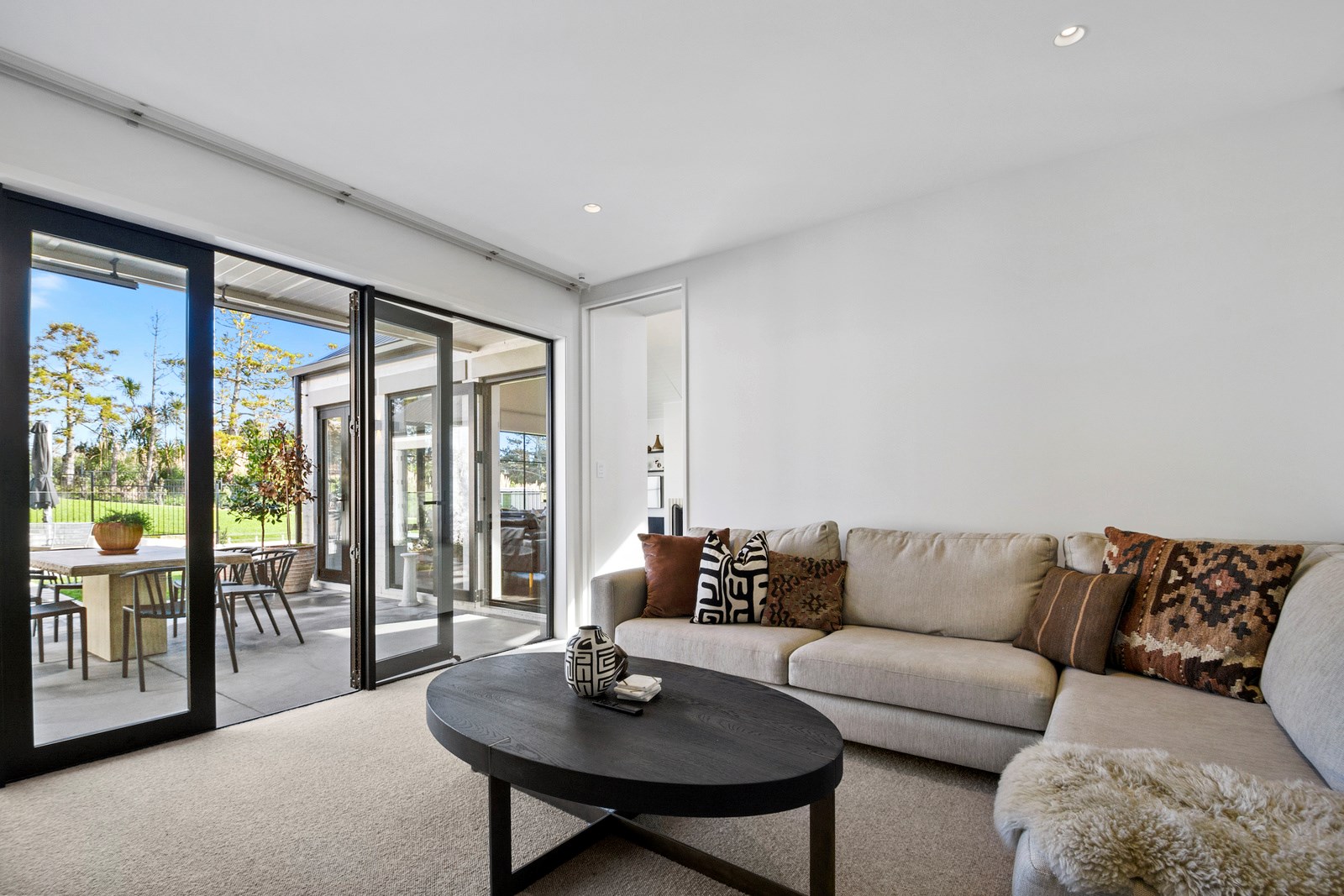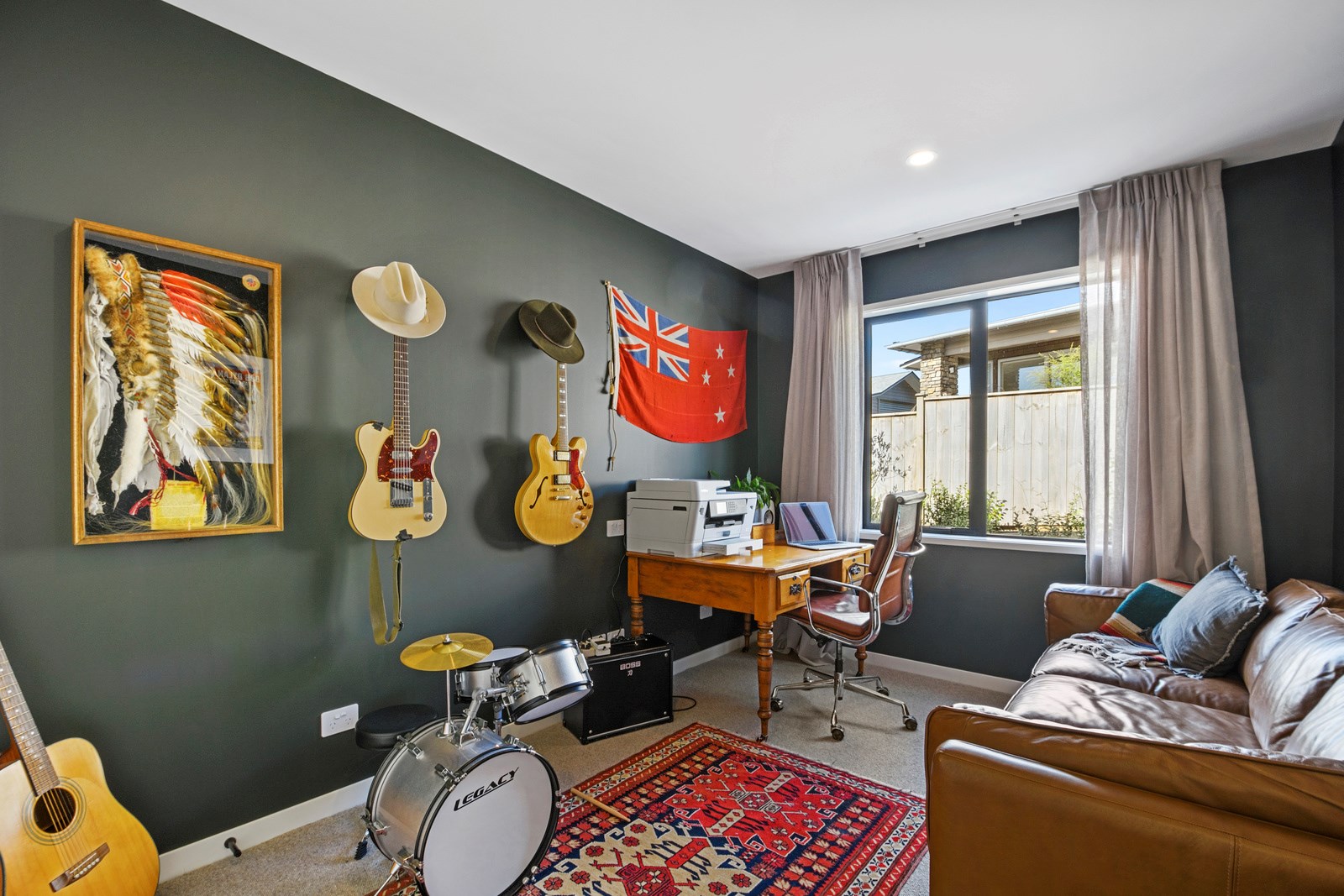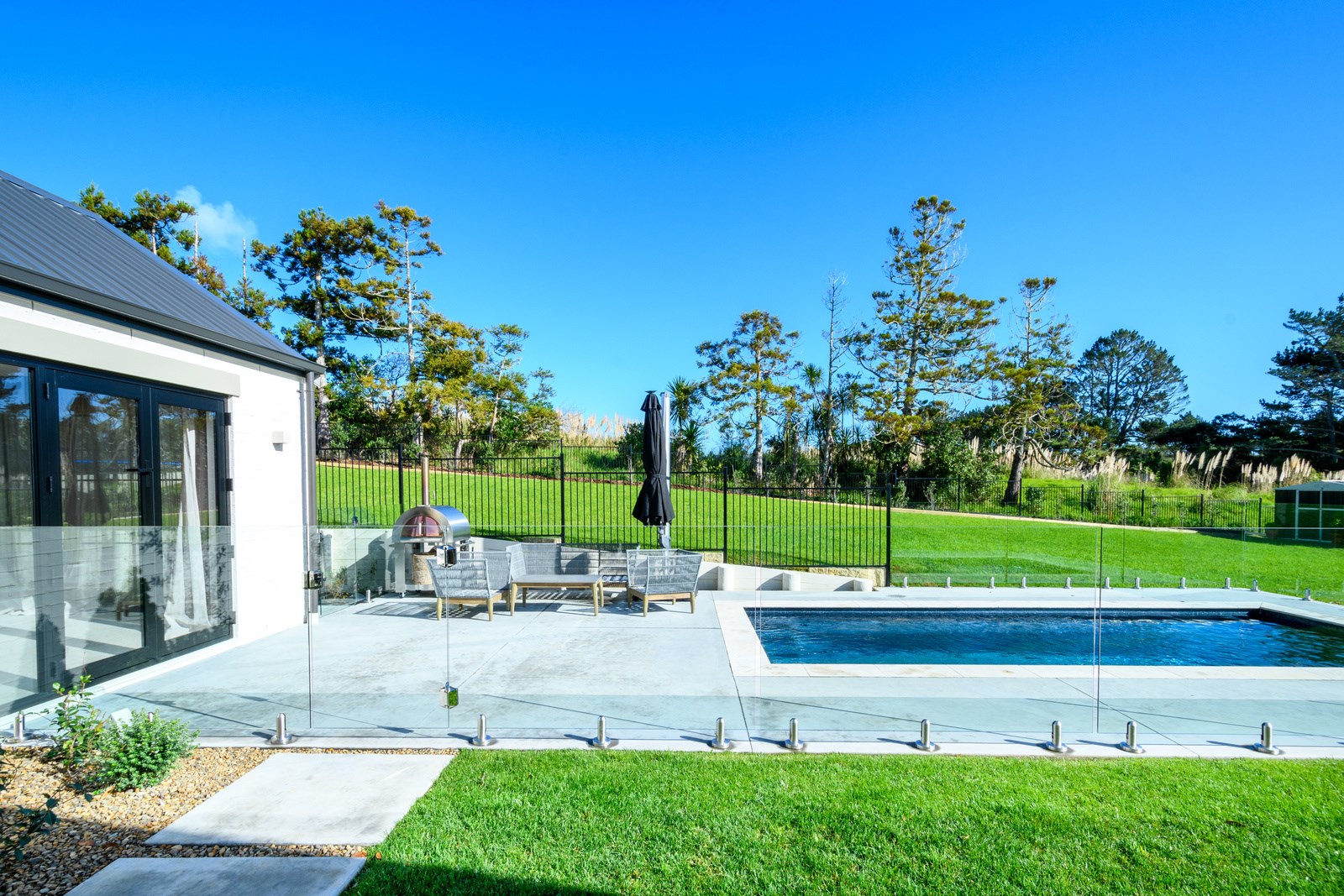 There’s something a little bit special about this 283sqm four-bedroom home that was built to maximise rolling views across the valley. The wow effect starts with the entry portico clad in split-faced Oamaru stone that surrounds the glass entry door and complements the adjacent wall of windows and contrasting textured-brick walls. This grand entry leads into the kitchen-living-dining area where cathedral ceilings make the room feel spacious, crafted timber slats screen the dining space and skylights brighten the well-appointed kitchen with its brass fixtures and marbled Dekton island bench. The living space is ideal for relaxing or entertaining. It has striking views, a fireplace with custom fluted stone and doors opening to a private, partially covered courtyard that leads to the pool and lawns beyond. An adjacent media room connects the two wings. The opposite wing is home to the main bedroom suite with walk-in wardrobe and ensuite, three further bedrooms (one decorated as an office), the family bathroom and a triple garage. The bathrooms feature in-wall toilet systems and stone basins along with brass and gunmetal fixtures that enhance the traditional aesthetic, as do the hardwood floors throughout.