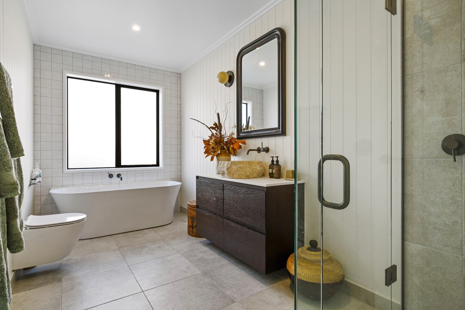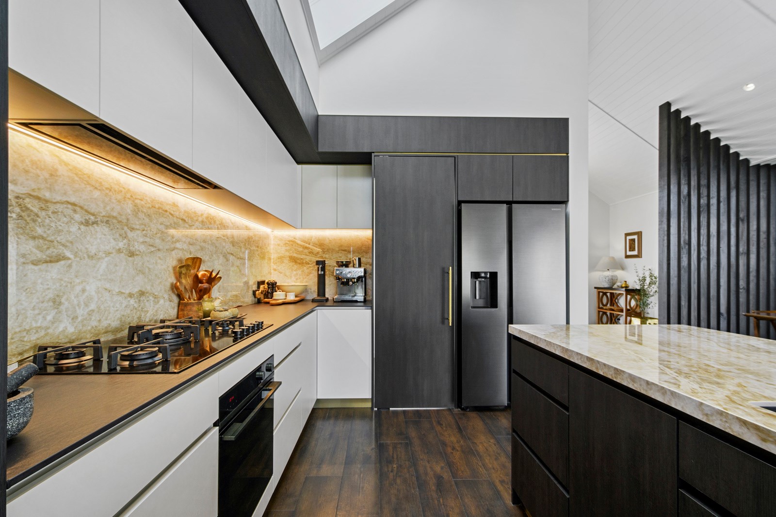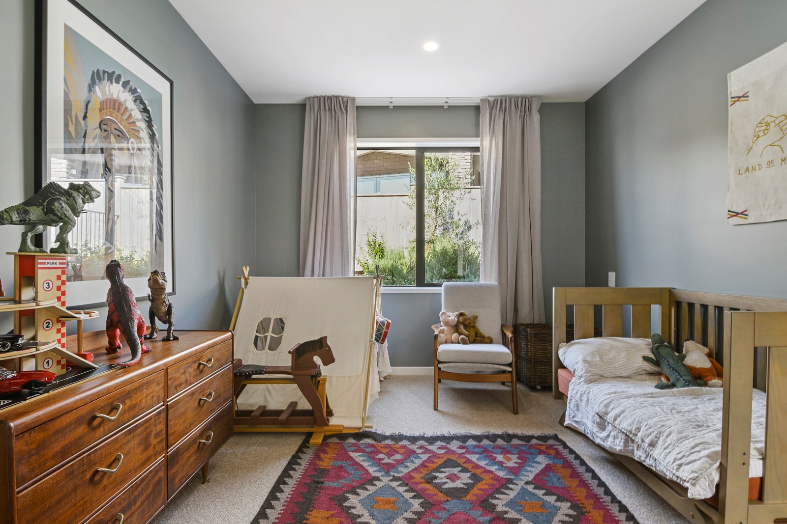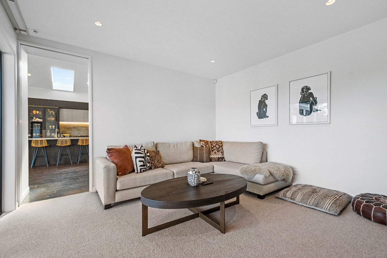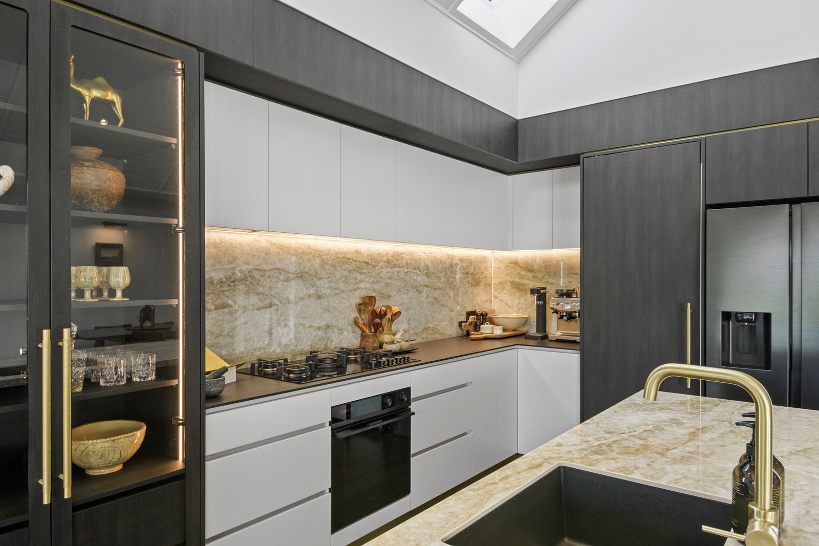 There’s something a little bit special about this 283sqm four-bedroom home that was built to maximise rolling views across the valley. The wow effect starts with the entry portico clad in split-faced Oamaru stone that surrounds the glass entry door and complements the adjacent wall of windows and contrasting textured-brick walls. This grand entry leads into the kitchen-living-dining area where cathedral ceilings make the room feel spacious, crafted timber slats screen the dining space and skylights brighten the well-appointed kitchen with its brass fixtures and marbled Dekton island bench. The living space is ideal for relaxing or entertaining. It has striking views, a fireplace with custom fluted stone and doors opening to a private, partially covered courtyard that leads to the pool and lawns beyond. An adjacent media room connects the two wings. The opposite wing is home to the main bedroom suite with walk-in wardrobe and ensuite, three further bedrooms (one decorated as an office), the family bathroom and a triple garage. The bathrooms feature in-wall toilet systems and stone basins along with brass and gunmetal fixtures that enhance the traditional aesthetic, as do the hardwood floors throughout.