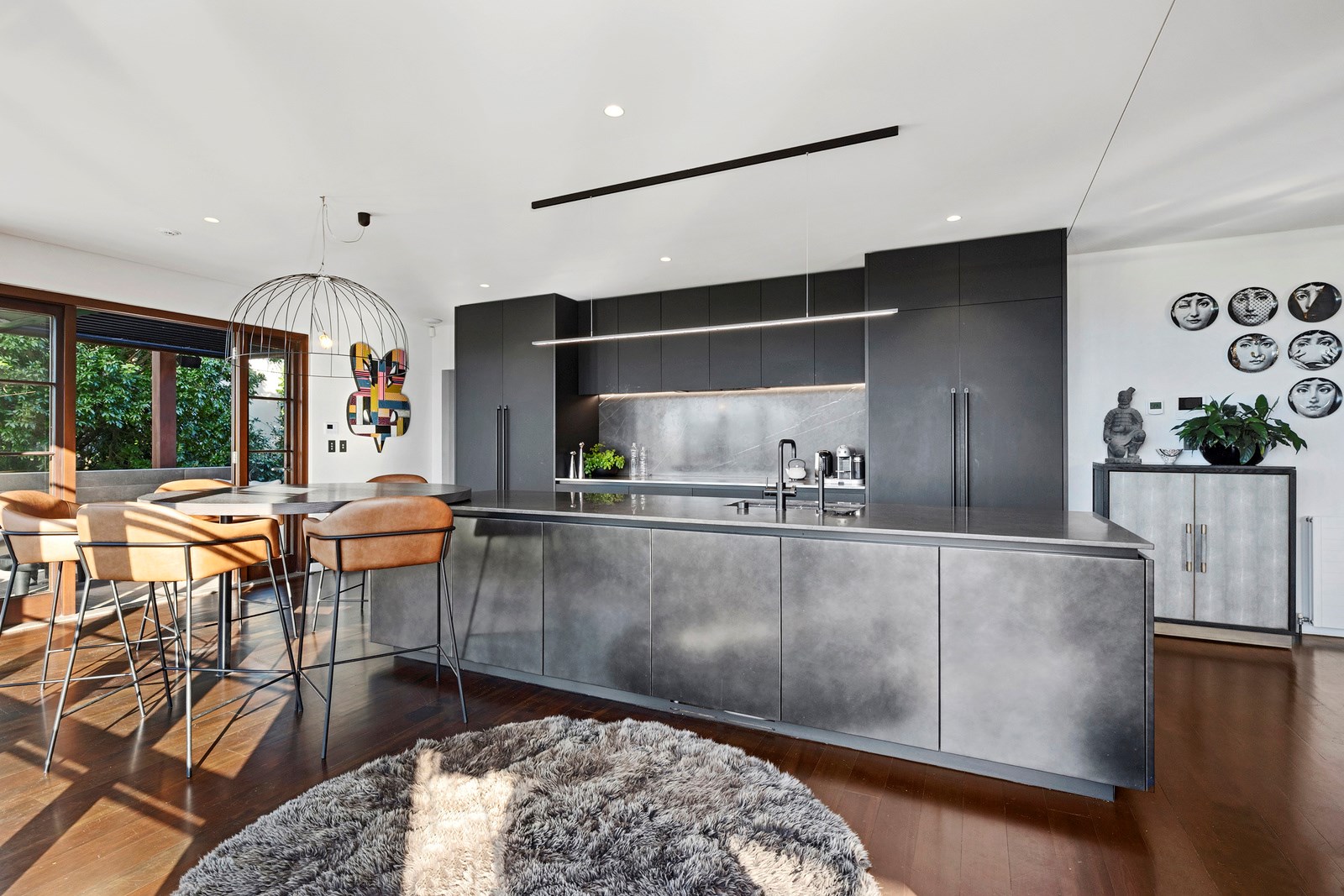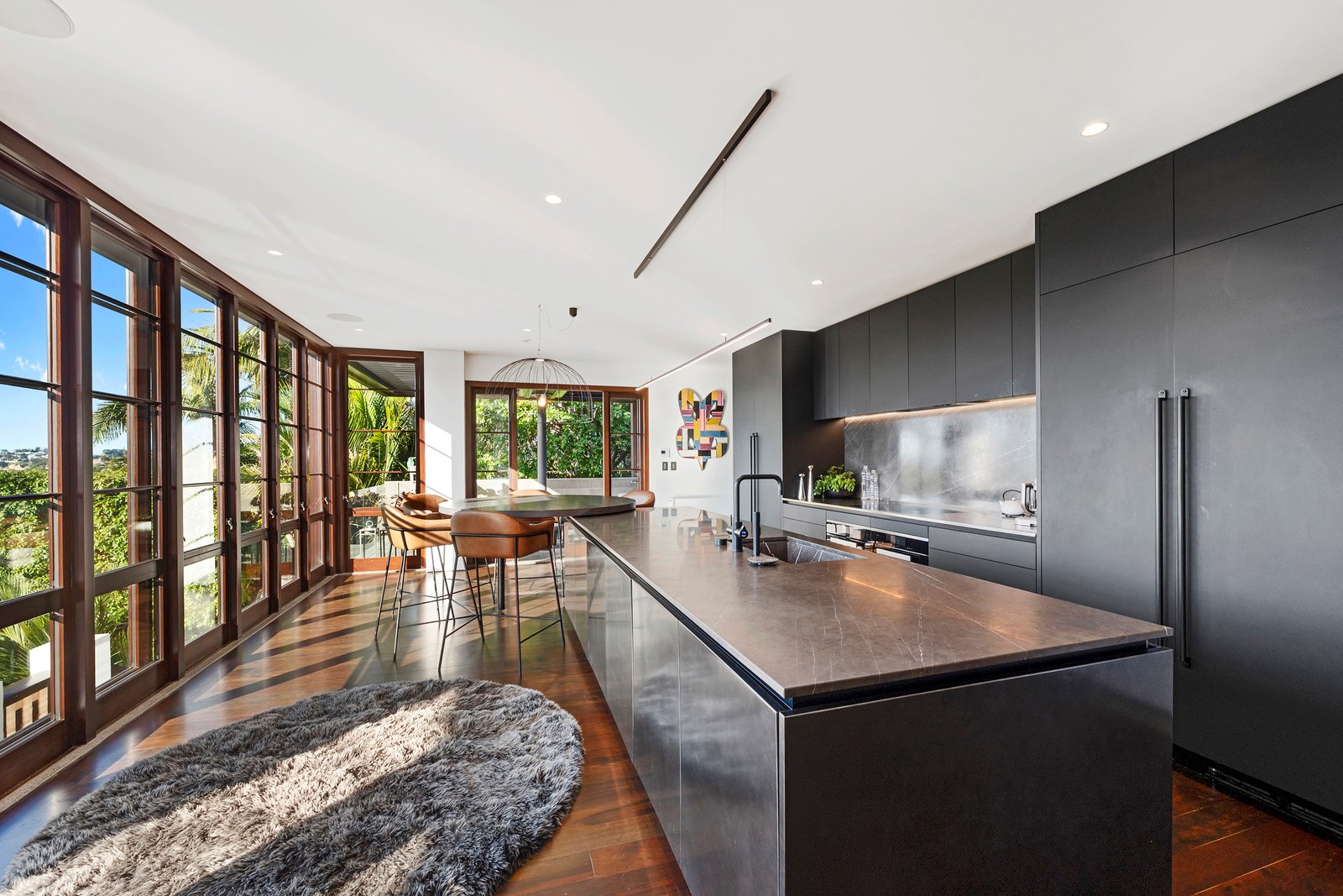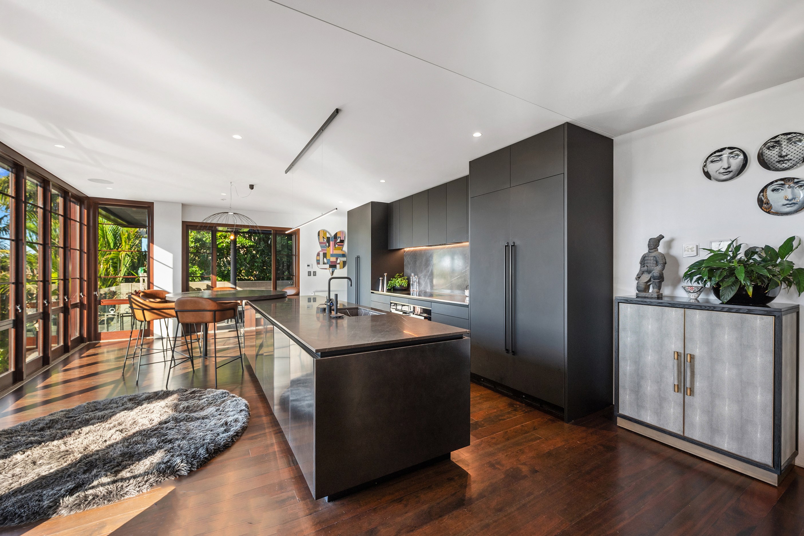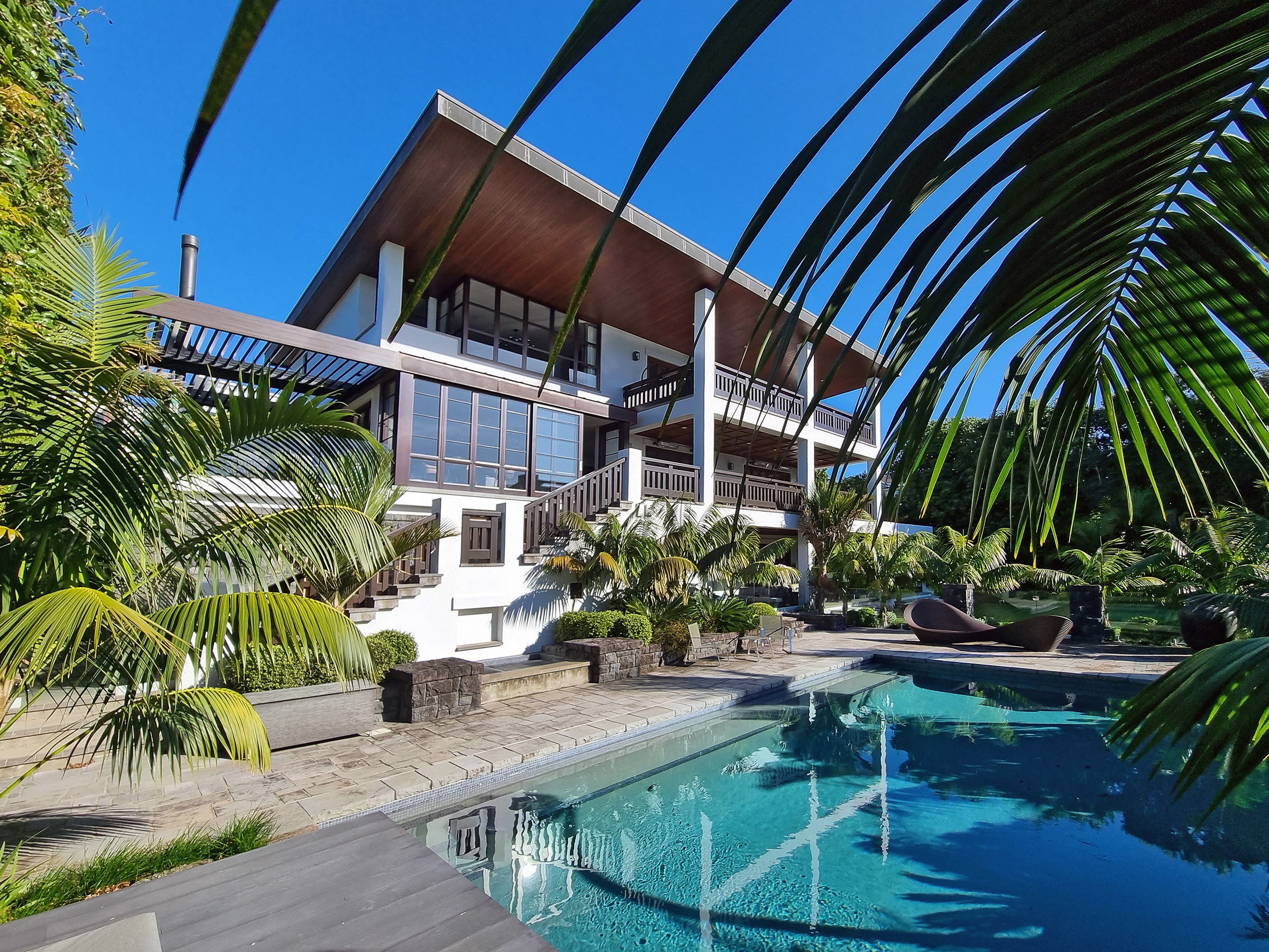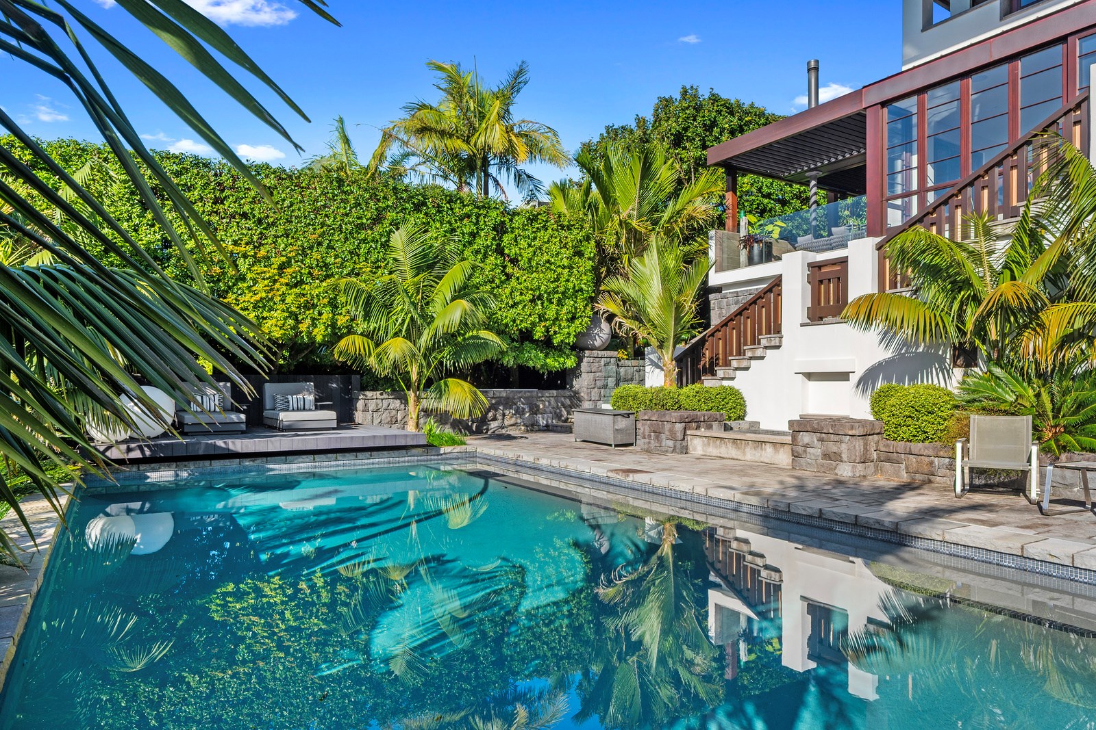 Arrive at this East Auckland property and you could be forgiven for thinking you’re in an exclusive tropical resort. It’s an oasis in the suburbs, a place where lush and luxury live together under palm trees and beside a swimming pool and tennis court. The 460sqm masonry house has undergone a complex renovation, not that you’d know it from the builders’ wide-ranging skills and attention to detail. The project entailed a 60sqm extension with a gym and an enlarged kitchen-dining area with a new European kitchen. New life was also breathed into the existing side patio, which was given a new timber-framed louvre roof and hanging fireplace. All three bathrooms received the luxe treatment with Venetian-style plaster render and top-of- the-range cabinetry and tapware. It’s all flawless and opulent now, but this was a highly technical project requiring a savvy, skilled team. Large masonry walls had to be removed and steel beams used to create openings. As a result, myriad intricate services needed to be rerouted. Given the calibre of the existing finishes in the four-bedroom home, attention was paid to every tiny detail, right down to the polished concrete sills and handrails. It shows: this is how to do a top-end, seamless renovation.