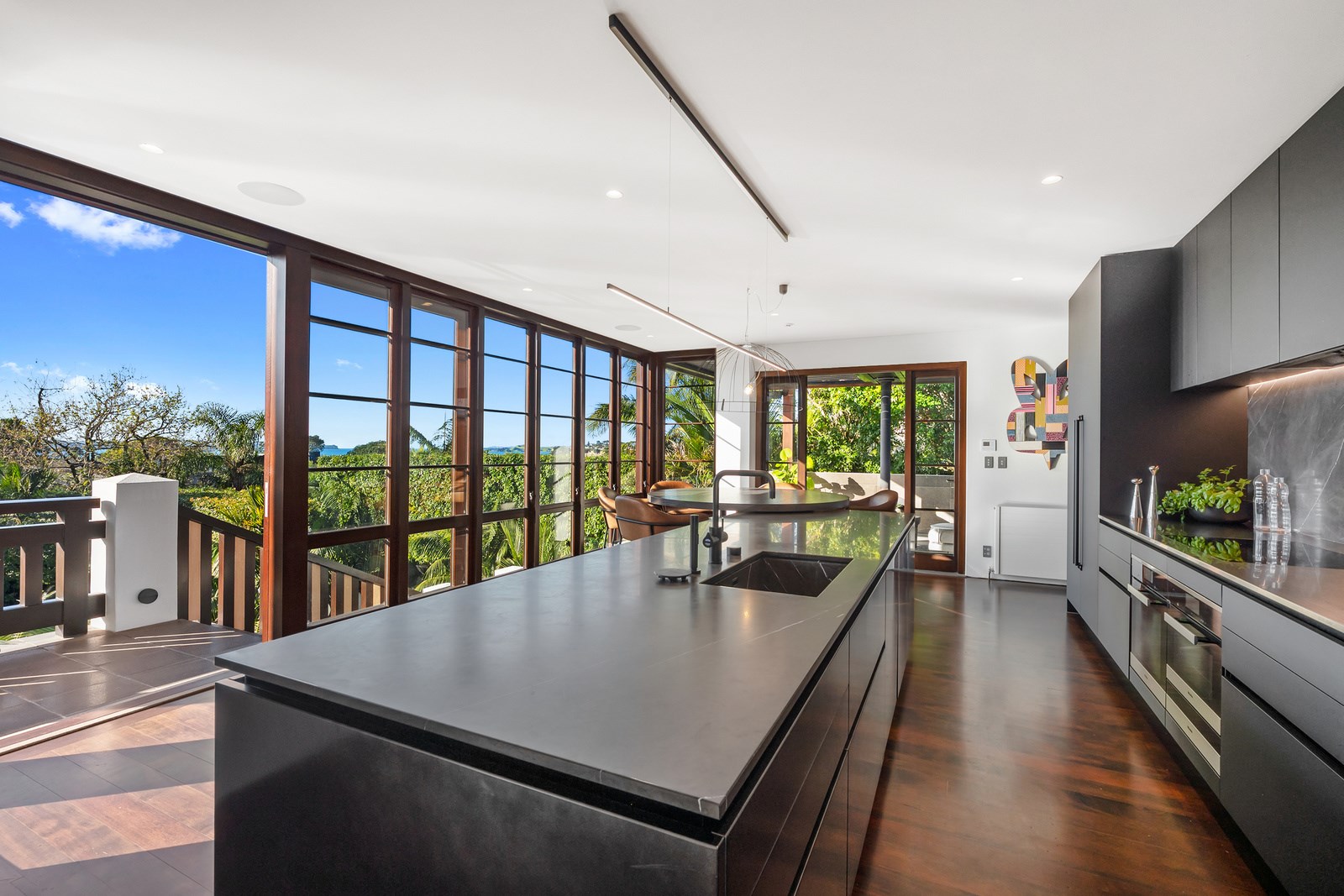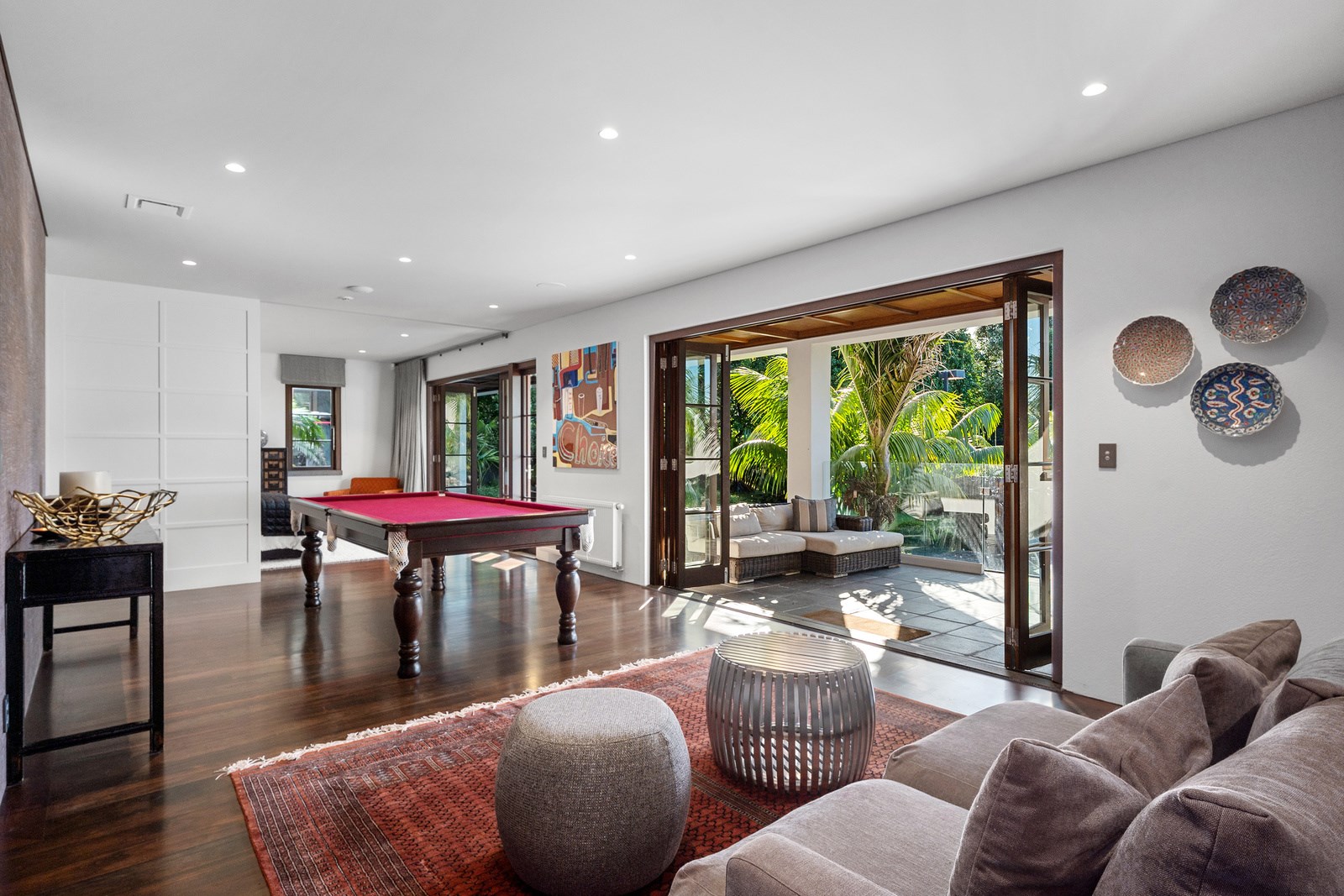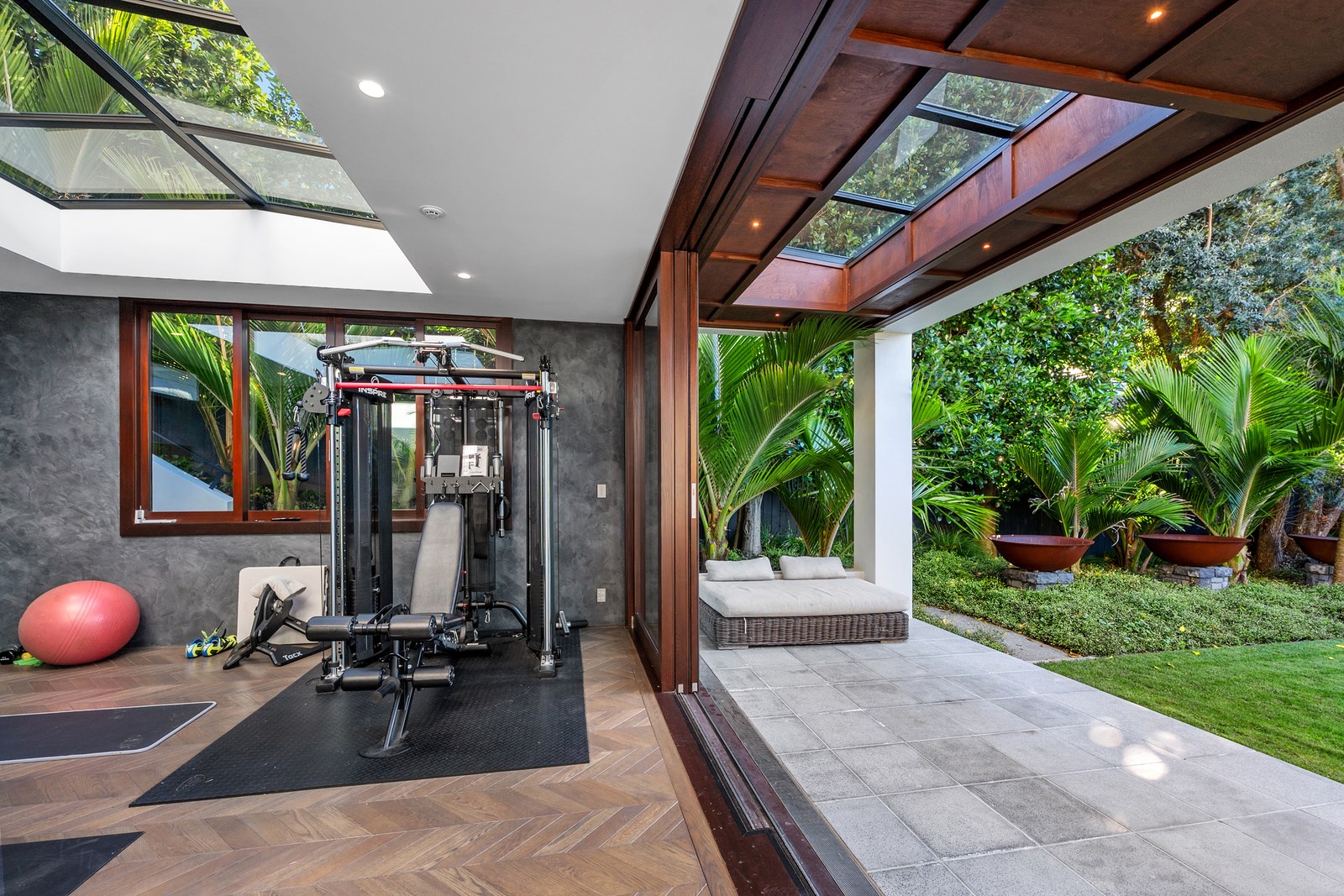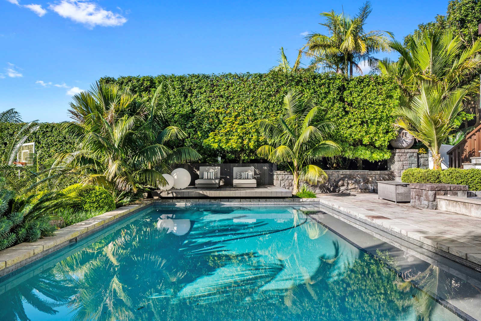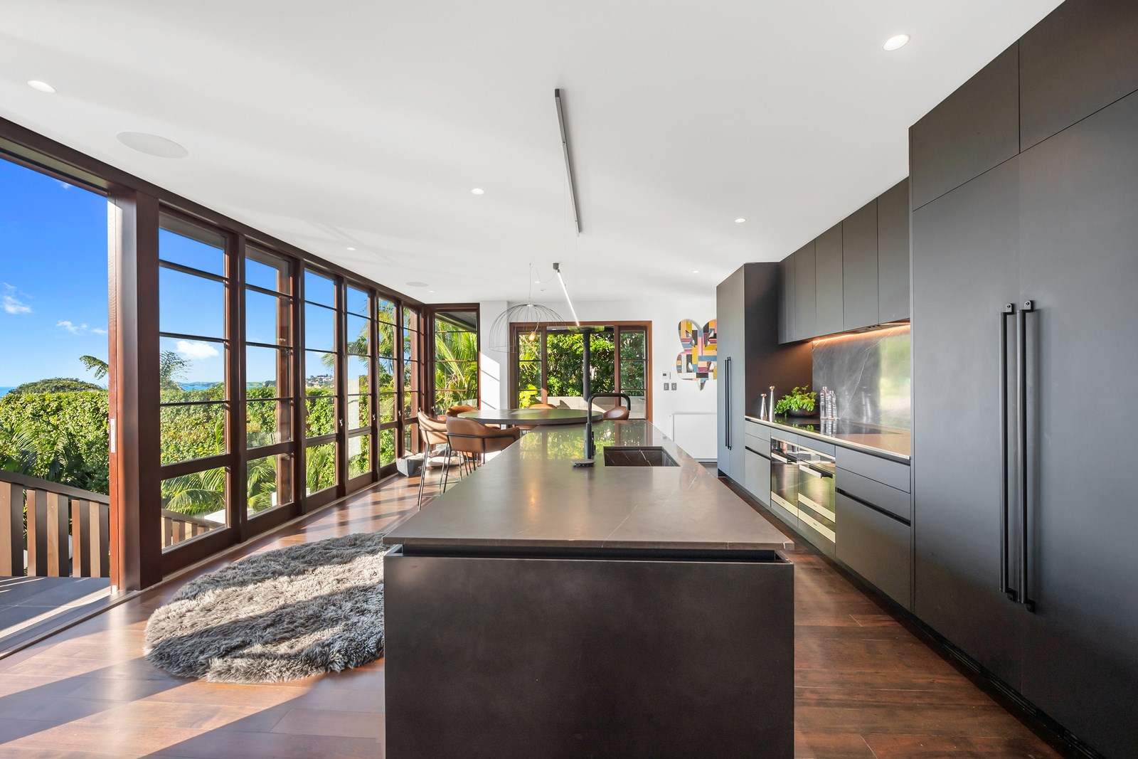 Arrive at this East Auckland property and you could be forgiven for thinking you’re in an exclusive tropical resort. It’s an oasis in the suburbs, a place where lush and luxury live together under palm trees and beside a swimming pool and tennis court. The 460sqm masonry house has undergone a complex renovation, not that you’d know it from the builders’ wide-ranging skills and attention to detail. The project entailed a 60sqm extension with a gym and an enlarged kitchen-dining area with a new European kitchen. New life was also breathed into the existing side patio, which was given a new timber-framed louvre roof and hanging fireplace. All three bathrooms received the luxe treatment with Venetian-style plaster render and top-of- the-range cabinetry and tapware. It’s all flawless and opulent now, but this was a highly technical project requiring a savvy, skilled team. Large masonry walls had to be removed and steel beams used to create openings. As a result, myriad intricate services needed to be rerouted. Given the calibre of the existing finishes in the four-bedroom home, attention was paid to every tiny detail, right down to the polished concrete sills and handrails. It shows: this is how to do a top-end, seamless renovation.