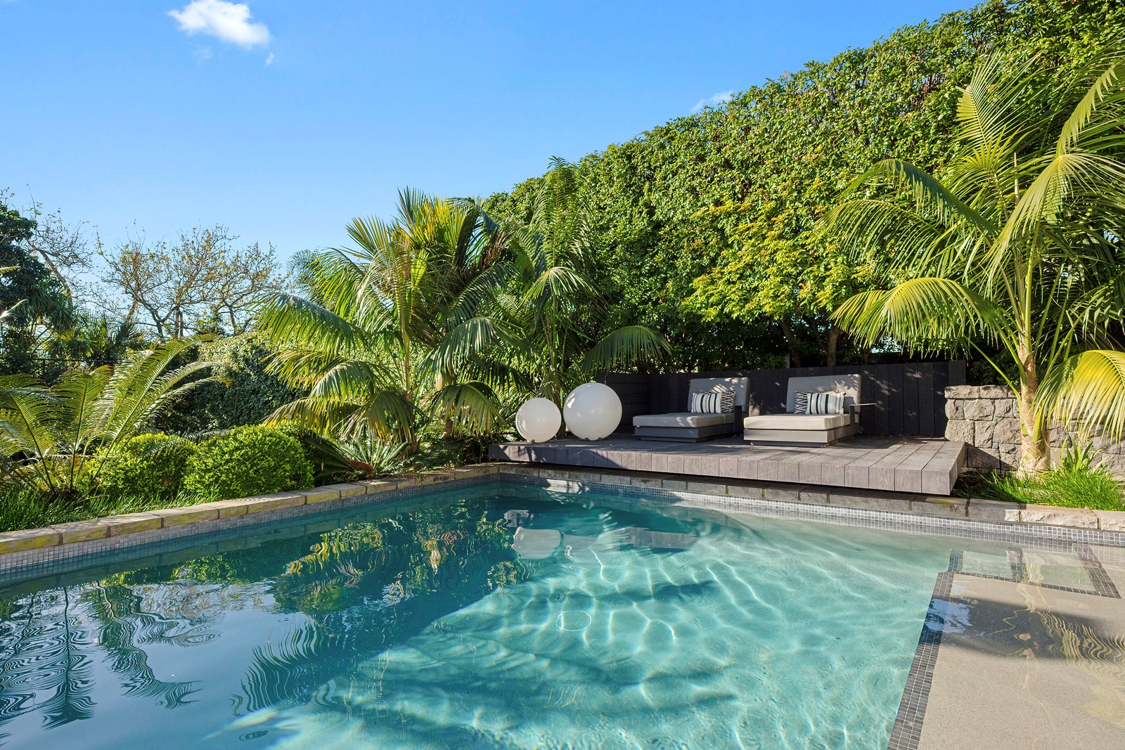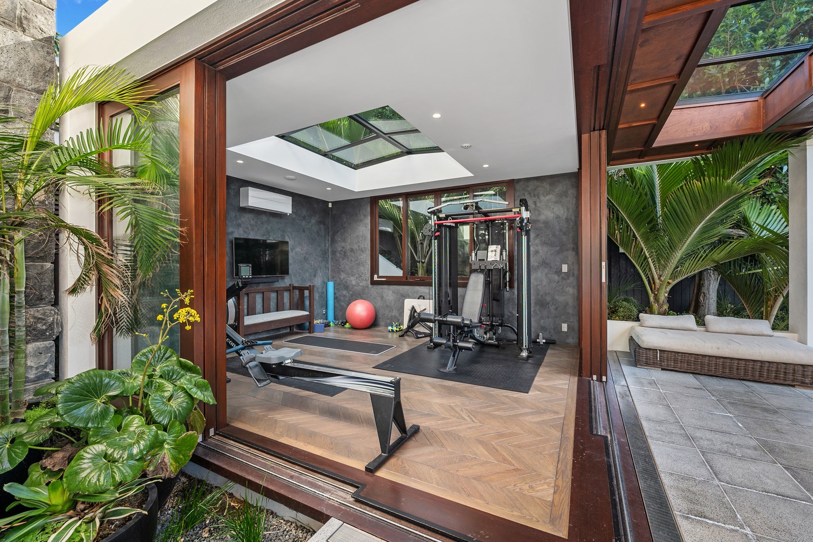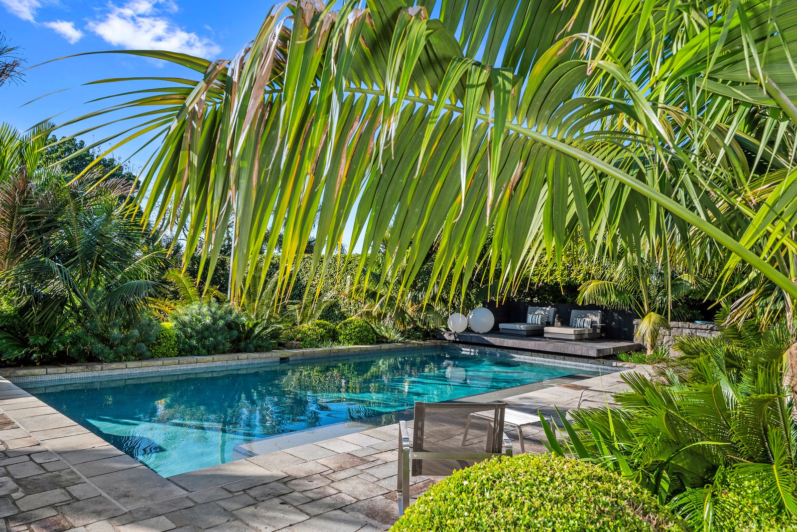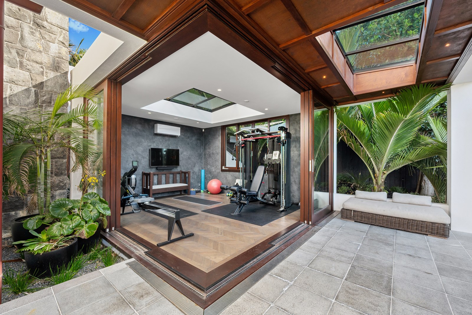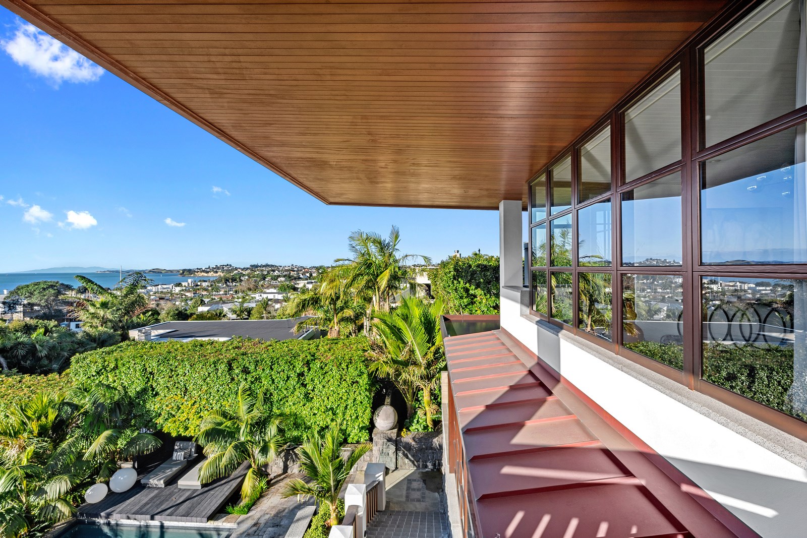Arrive at this East Auckland property and you could be forgiven for thinking you’re in an exclusive tropical resort. It’s an oasis in the suburbs, a place where lush and luxury live together under palm trees and beside a swimming pool and tennis court. The 460sqm masonry house has undergone a complex renovation, not that you’d know it from the builders’ wide-ranging skills and attention to detail. The project entailed a 60sqm extension with a gym and an enlarged kitchen-dining area with a new European kitchen. New life was also breathed into the existing side patio, which was given a new timber-framed louvre roof and hanging fireplace. All three bathrooms received the luxe treatment with Venetian-style plaster render and top-of- the-range cabinetry and tapware. It’s all flawless and opulent now, but this was a highly technical project requiring a savvy, skilled team. Large masonry walls had to be removed and steel beams used to create openings. As a result, myriad intricate services needed to be rerouted. Given the calibre of the existing finishes in the four-bedroom home, attention was paid to every tiny detail, right down to the polished concrete sills and handrails. It shows: this is how to do a top-end, seamless renovation.