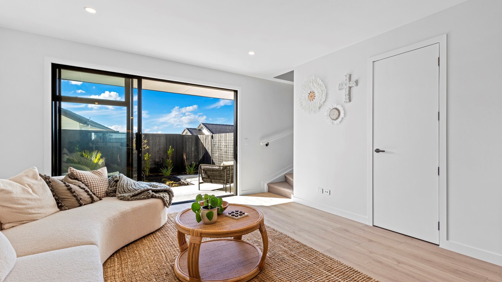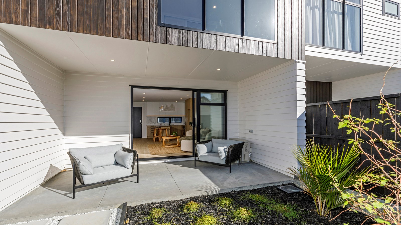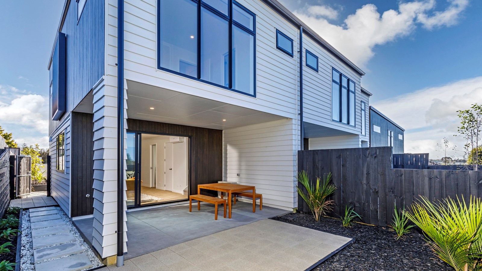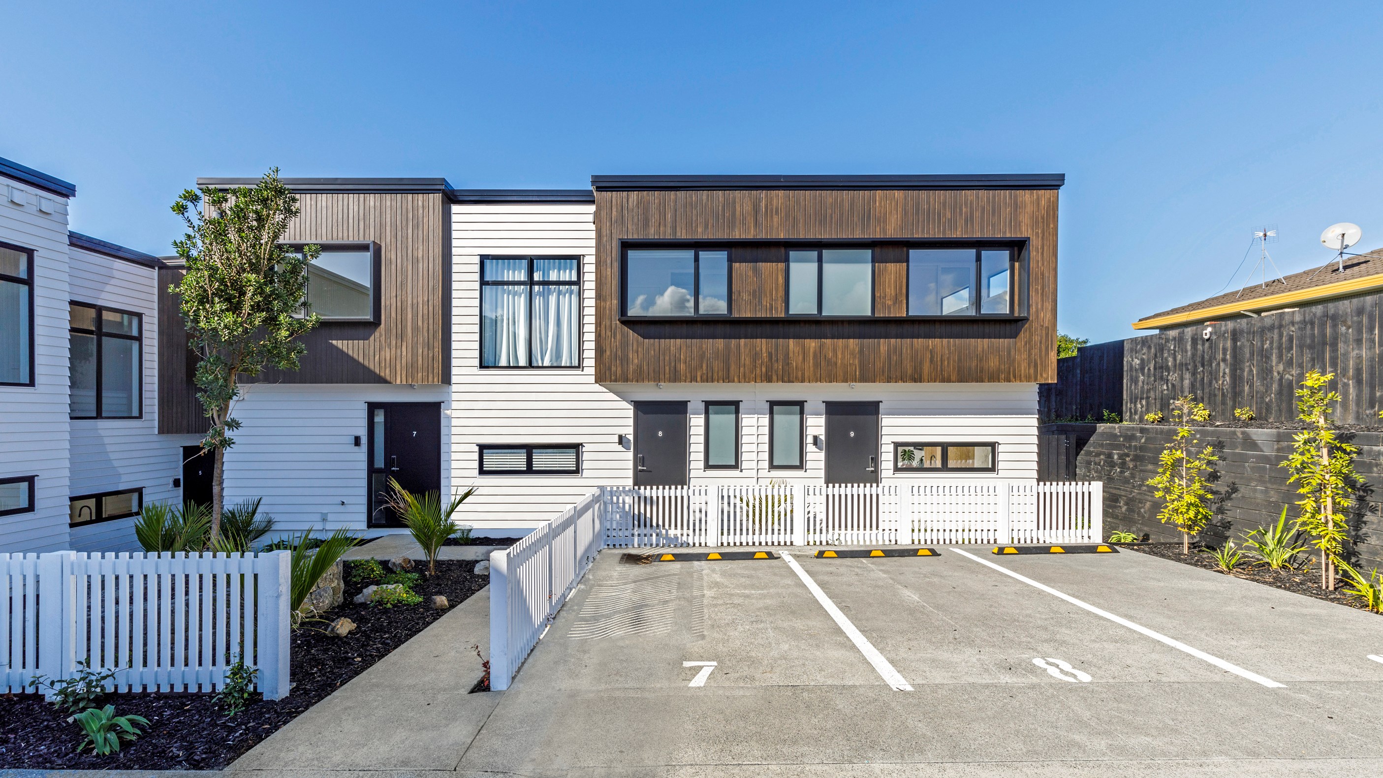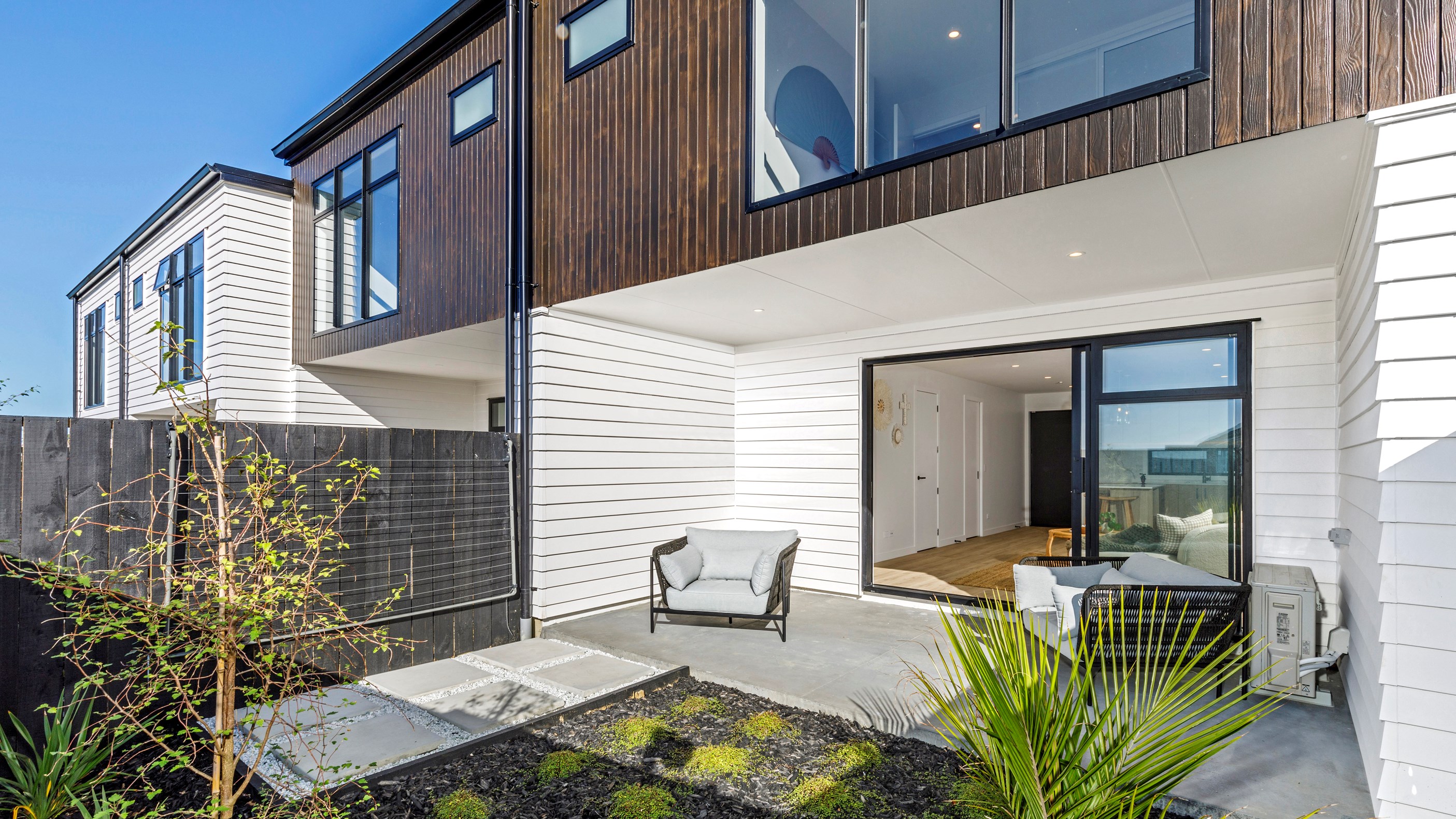 Here’s a little village within Auckland city that enjoys first-class design, privacy and an elevated outlook. At Eastwood Rise, you’ll find nine modern terrace homes, each with two or three bedrooms, two bathrooms and shared space. At the corner of the communal area where the two rows of terraces meet, there’s a garden with a pōhutukawa surrounded by nīkau palms and other natives. The private car park has electric vehicle charging. The homes have northerly and easterly coastal outlooks and are designed with cantilevers to shelter the front doors and rear patios. The exteriors look smart with lowmaintenance, cedar-look BCG fibre-cement cladding. Step inside and you’re in a sun-flooded, open-plan kitchen, dining and living area that takes up nearly the entire ground floor. White and timber tones are dotted with features such as designer pendant lights. Slide open the doors and the living room spills onto a patio and lovely landscaping. A powder room completes the floor. Take the stairs to the upper level to find the bedrooms, one with an ensuite, plus another bathroom. These units are designed to Homestar 6 standard, meaning they’re sustainable and energy efficient. They also deftly balance luxury and convenience.