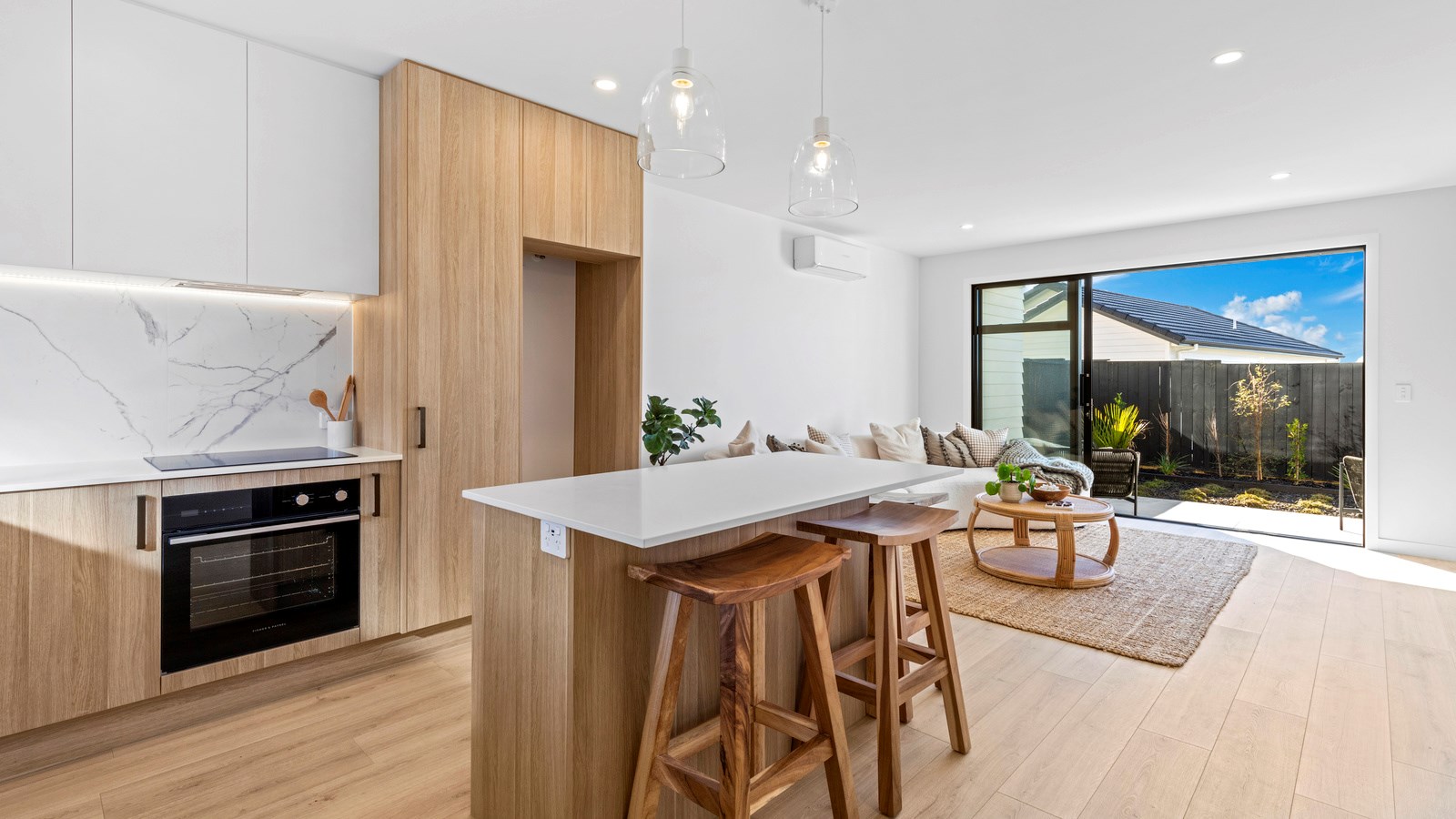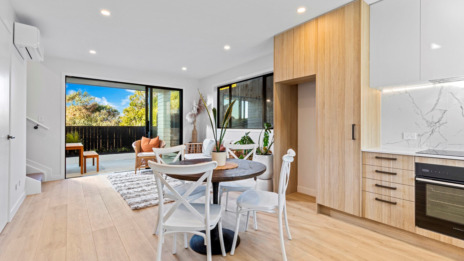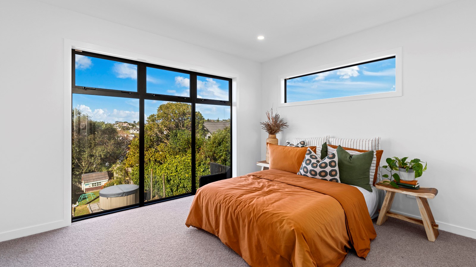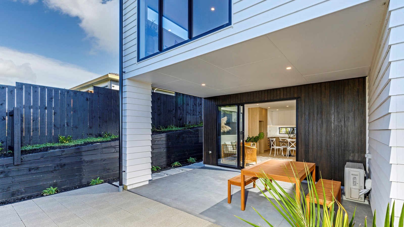 Here’s a little village within Auckland city that enjoys first-class design, privacy and an elevated outlook. At Eastwood Rise, you’ll find nine modern terrace homes, each with two or three bedrooms, two bathrooms and shared space. At the corner of the communal area where the two rows of terraces meet, there’s a garden with a pōhutukawa surrounded by nīkau palms and other natives. The private car park has electric vehicle charging. The homes have northerly and easterly coastal outlooks and are designed with cantilevers to shelter the front doors and rear patios. The exteriors look smart with lowmaintenance, cedar-look BCG fibre-cement cladding. Step inside and you’re in a sun-flooded, open-plan kitchen, dining and living area that takes up nearly the entire ground floor. White and timber tones are dotted with features such as designer pendant lights. Slide open the doors and the living room spills onto a patio and lovely landscaping. A powder room completes the floor. Take the stairs to the upper level to find the bedrooms, one with an ensuite, plus another bathroom. These units are designed to Homestar 6 standard, meaning they’re sustainable and energy efficient. They also deftly balance luxury and convenience.