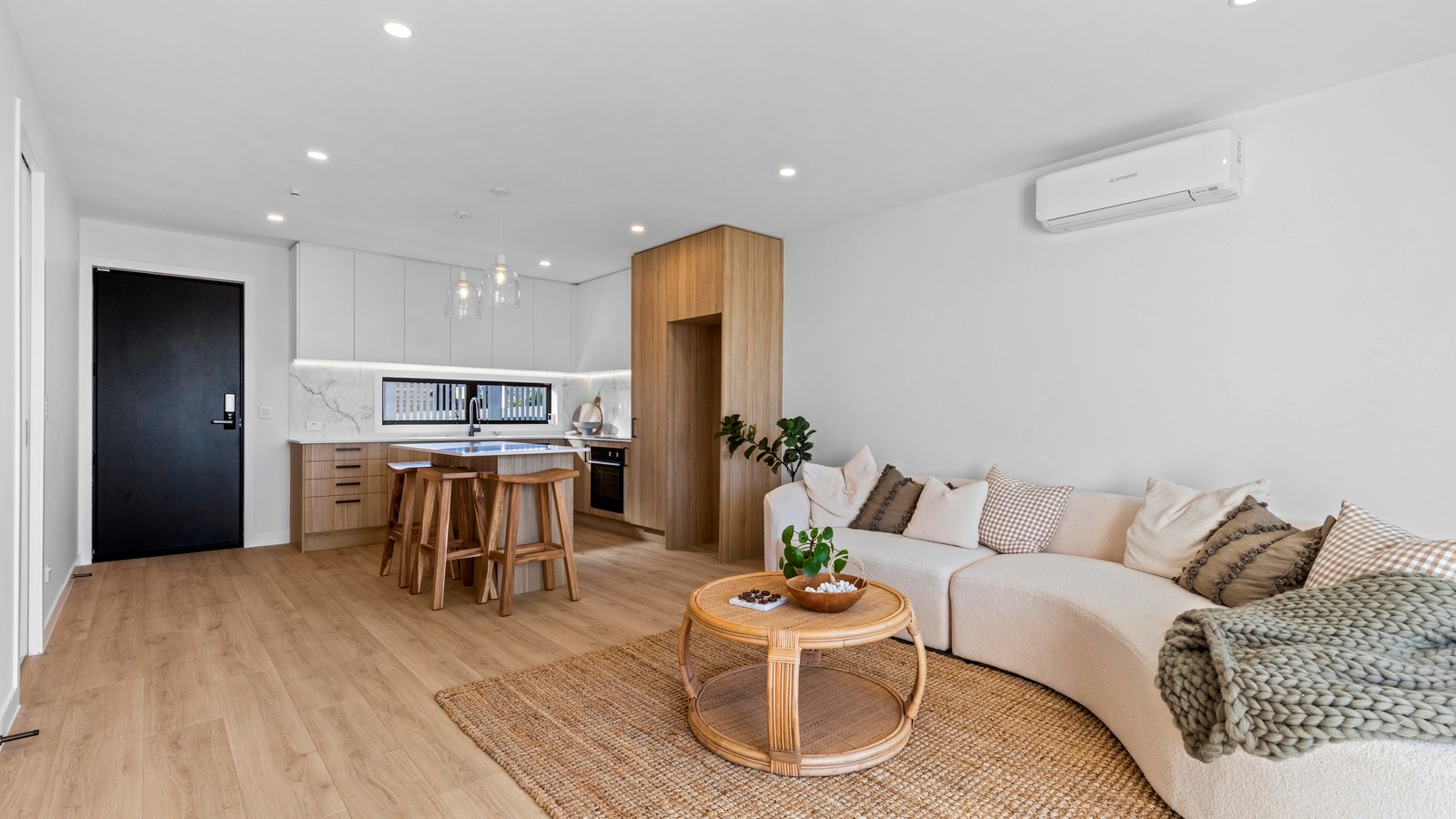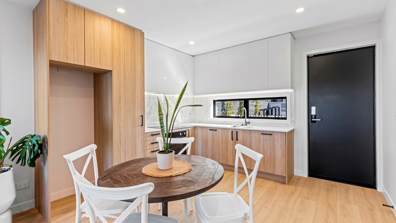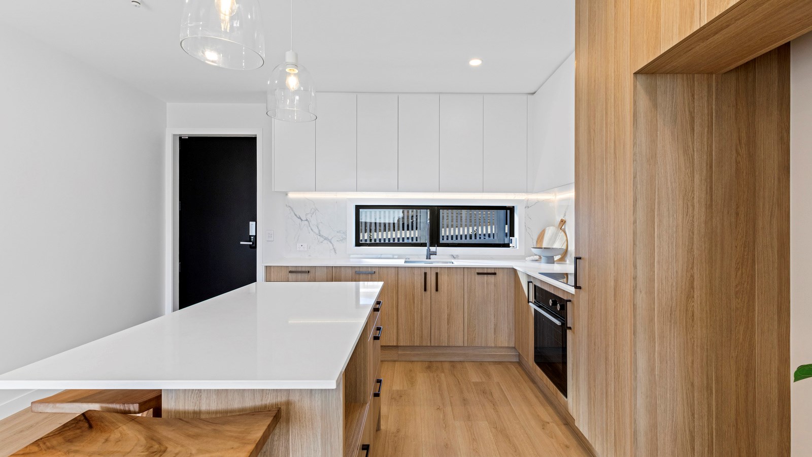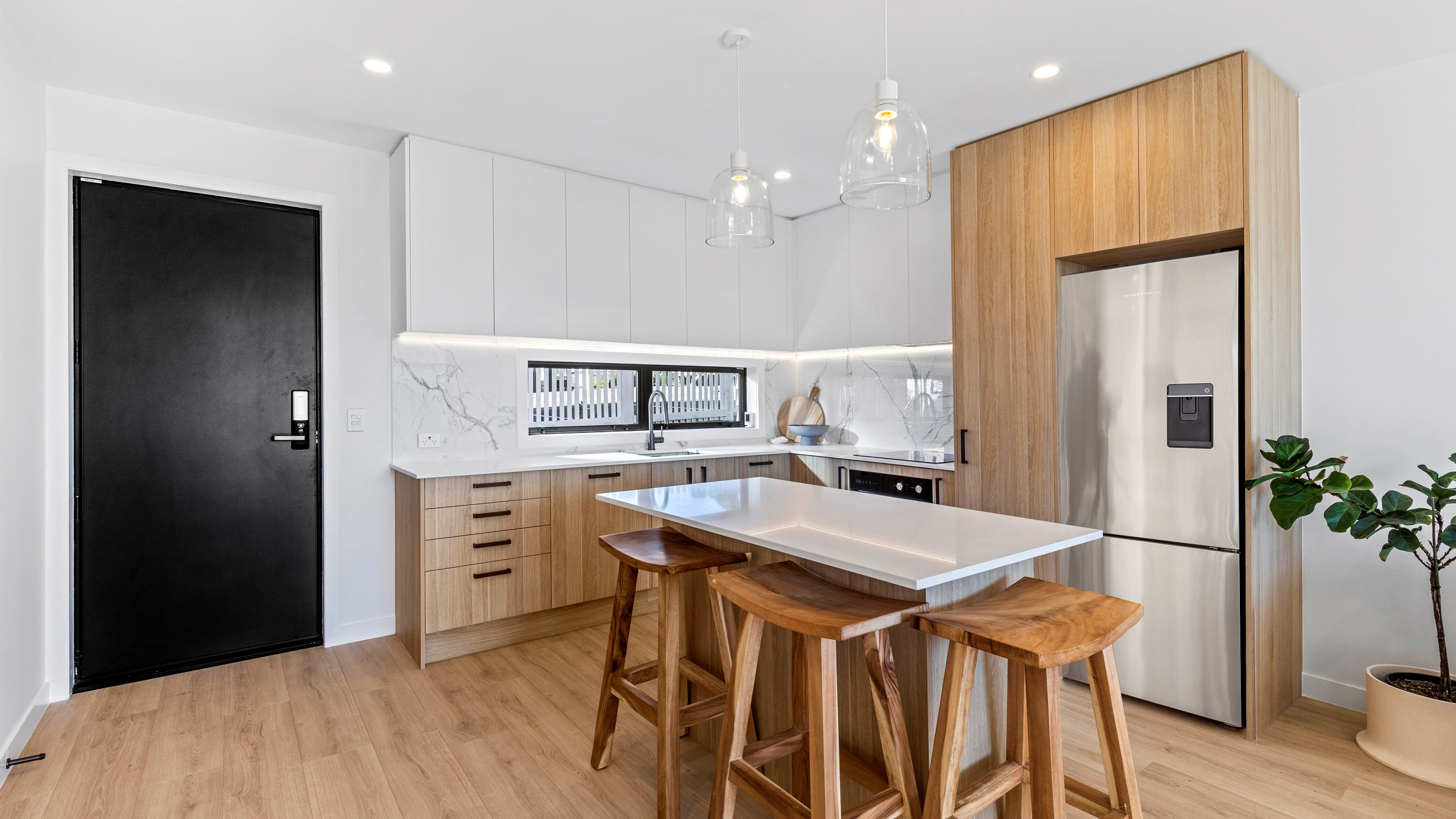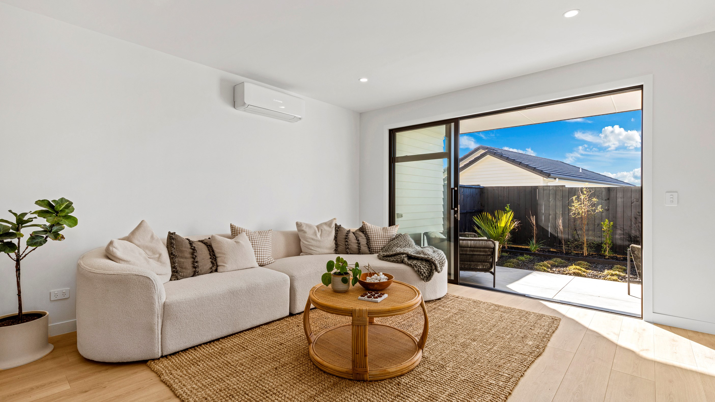 Here’s a little village within Auckland city that enjoys first-class design, privacy and an elevated outlook. At Eastwood Rise, you’ll find nine modern terrace homes, each with two or three bedrooms, two bathrooms and shared space. At the corner of the communal area where the two rows of terraces meet, there’s a garden with a pōhutukawa surrounded by nīkau palms and other natives. The private car park has electric vehicle charging. The homes have northerly and easterly coastal outlooks and are designed with cantilevers to shelter the front doors and rear patios. The exteriors look smart with lowmaintenance, cedar-look BCG fibre-cement cladding. Step inside and you’re in a sun-flooded, open-plan kitchen, dining and living area that takes up nearly the entire ground floor. White and timber tones are dotted with features such as designer pendant lights. Slide open the doors and the living room spills onto a patio and lovely landscaping. A powder room completes the floor. Take the stairs to the upper level to find the bedrooms, one with an ensuite, plus another bathroom. These units are designed to Homestar 6 standard, meaning they’re sustainable and energy efficient. They also deftly balance luxury and convenience.