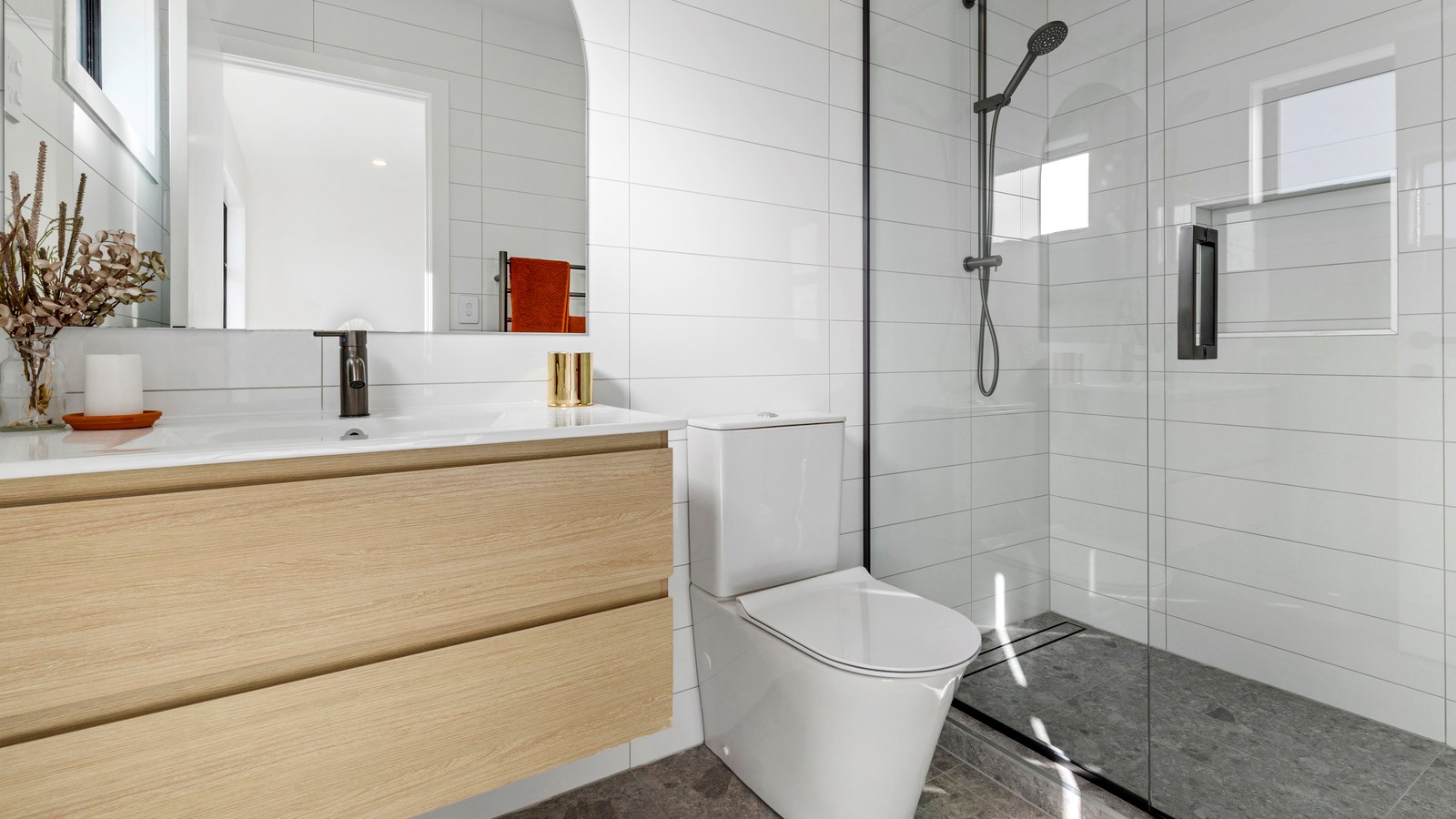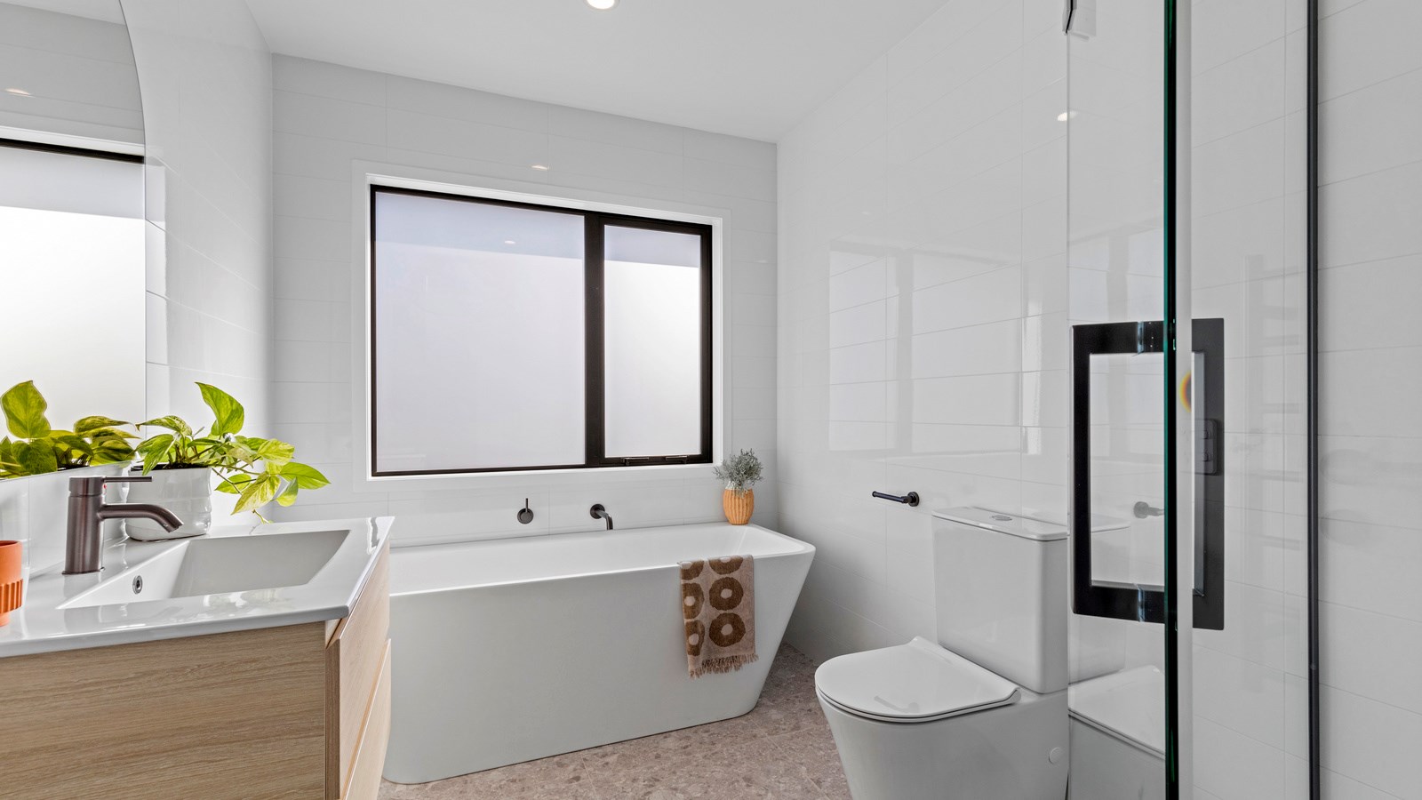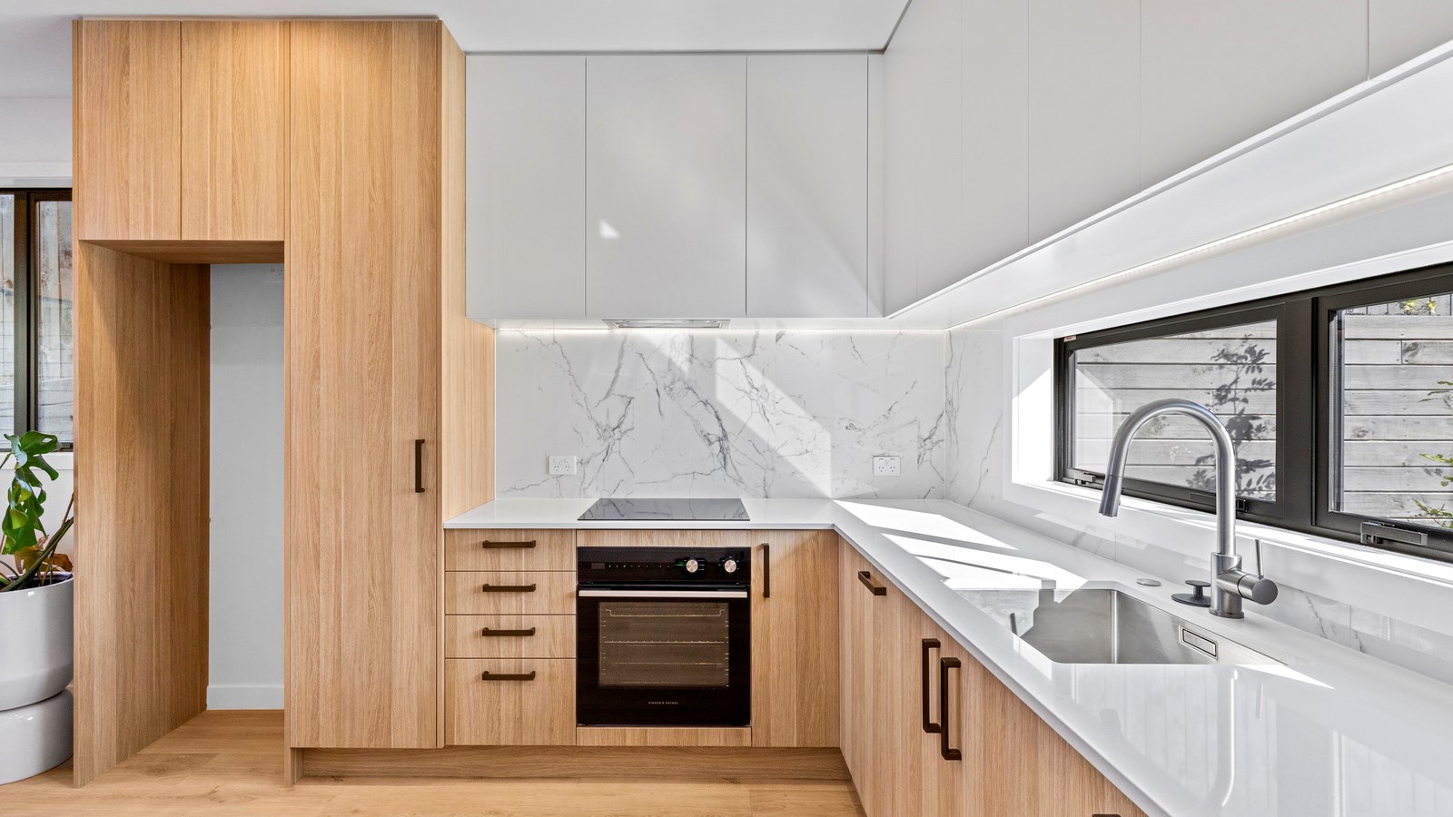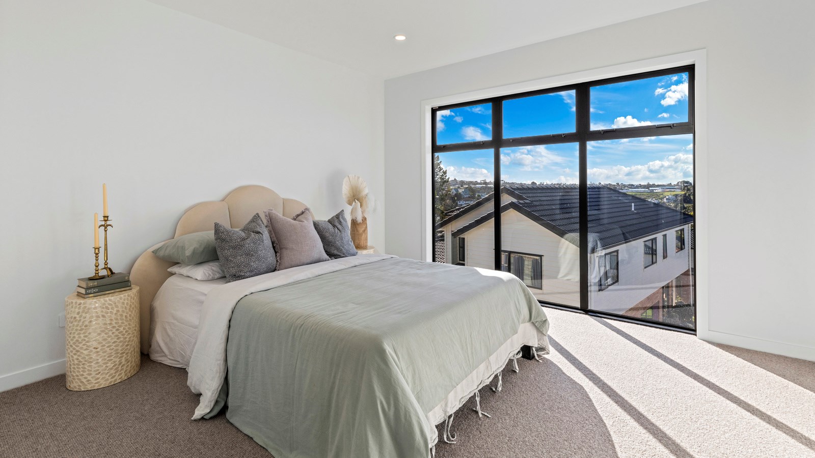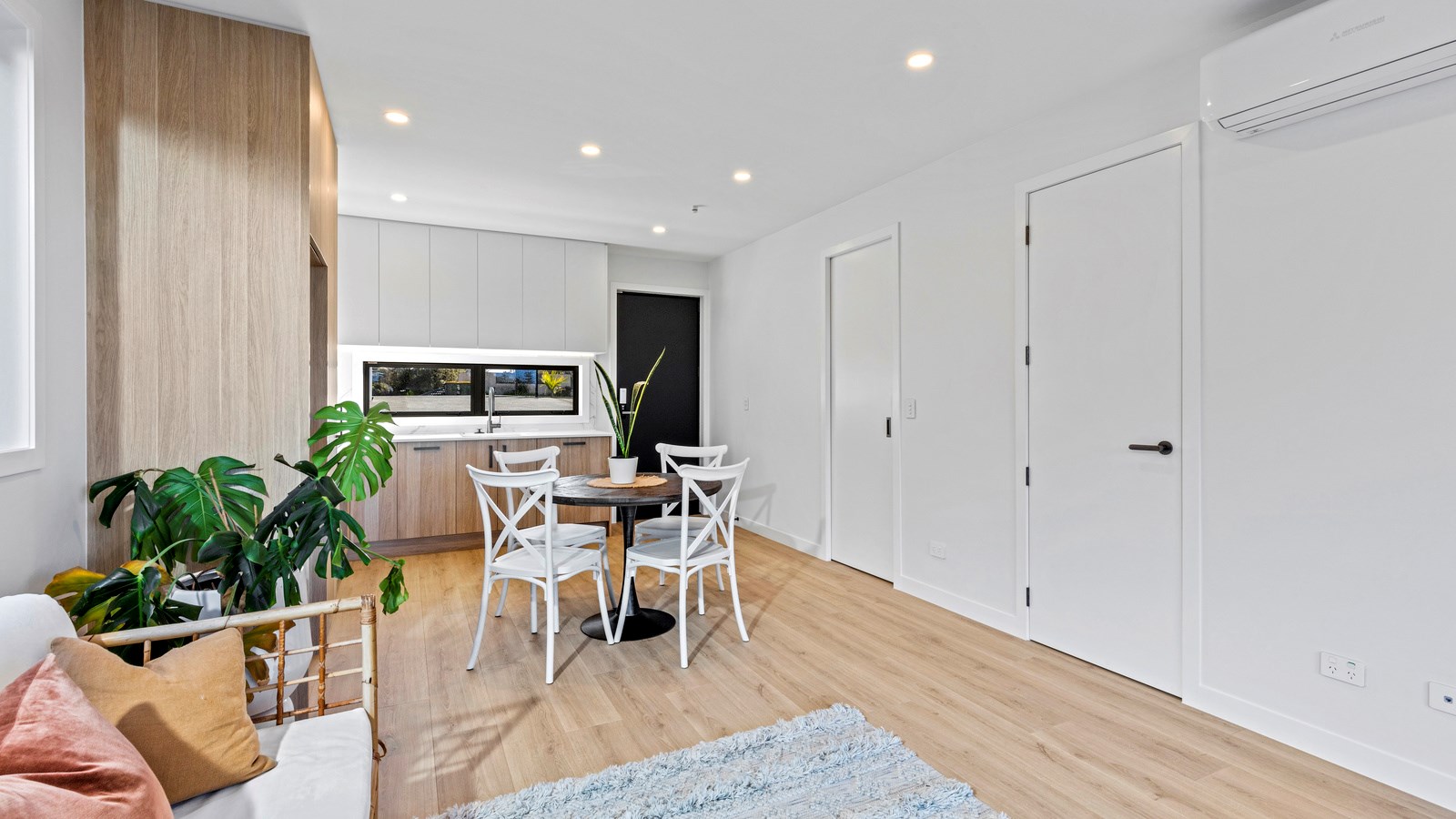 Here’s a little village within Auckland city that enjoys first-class design, privacy and an elevated outlook. At Eastwood Rise, you’ll find nine modern terrace homes, each with two or three bedrooms, two bathrooms and shared space. At the corner of the communal area where the two rows of terraces meet, there’s a garden with a pōhutukawa surrounded by nīkau palms and other natives. The private car park has electric vehicle charging. The homes have northerly and easterly coastal outlooks and are designed with cantilevers to shelter the front doors and rear patios. The exteriors look smart with lowmaintenance, cedar-look BCG fibre-cement cladding. Step inside and you’re in a sun-flooded, open-plan kitchen, dining and living area that takes up nearly the entire ground floor. White and timber tones are dotted with features such as designer pendant lights. Slide open the doors and the living room spills onto a patio and lovely landscaping. A powder room completes the floor. Take the stairs to the upper level to find the bedrooms, one with an ensuite, plus another bathroom. These units are designed to Homestar 6 standard, meaning they’re sustainable and energy efficient. They also deftly balance luxury and convenience.