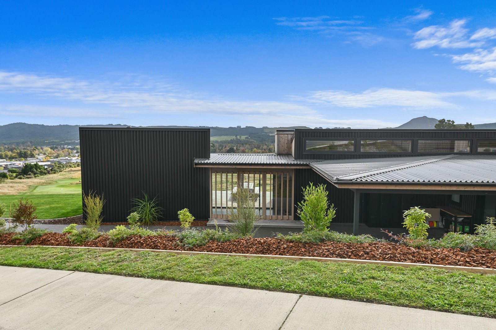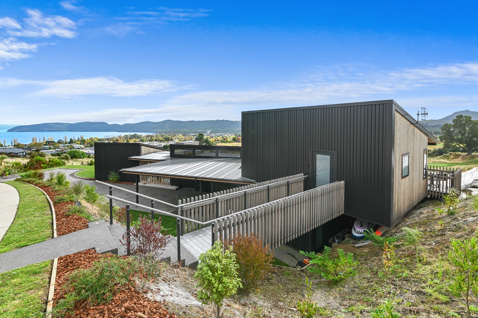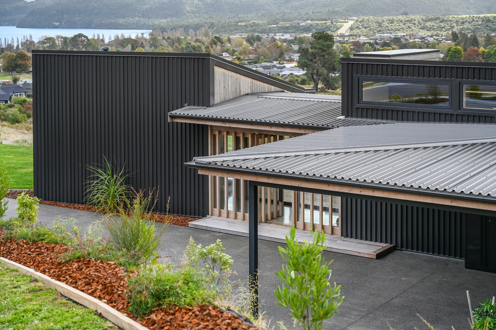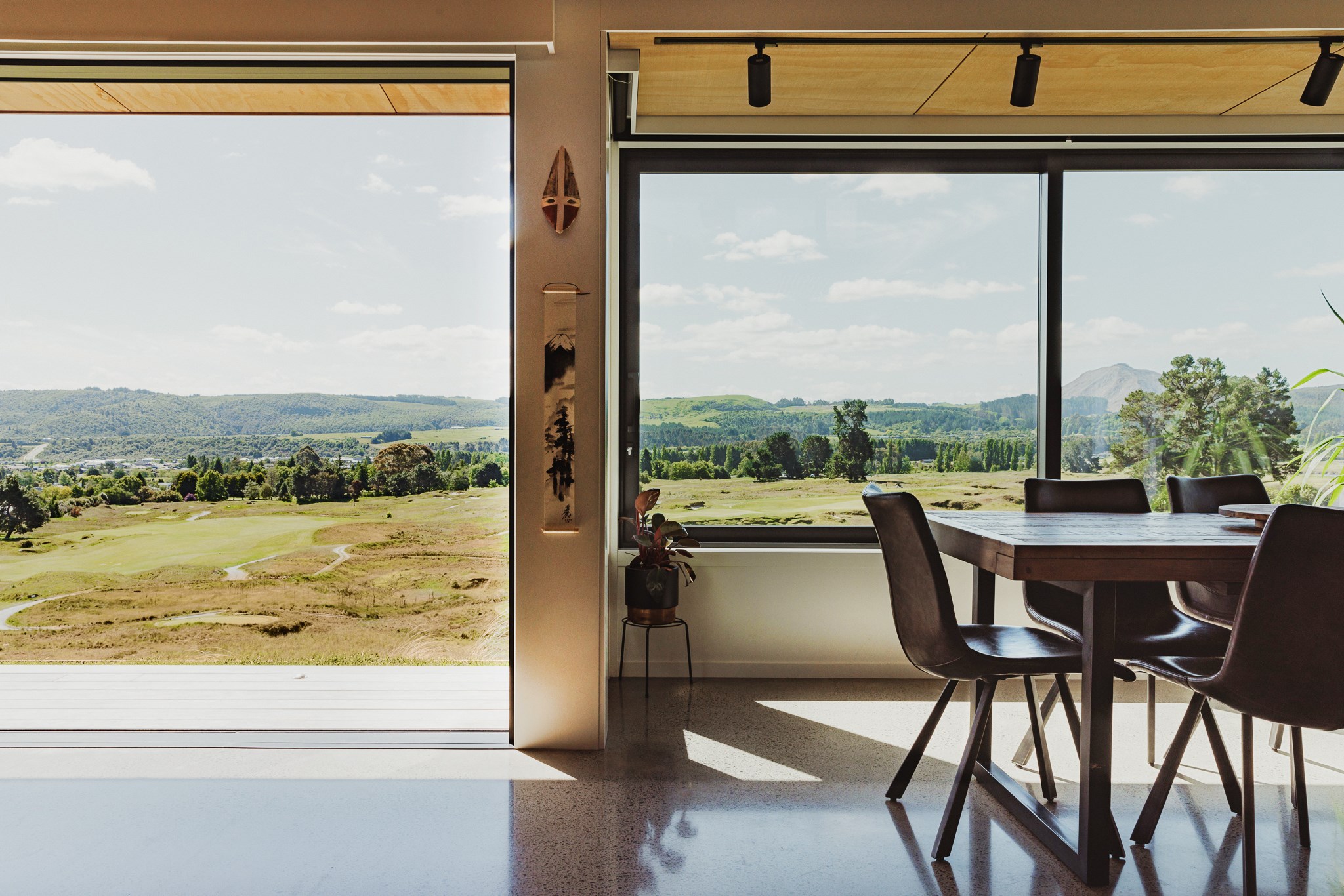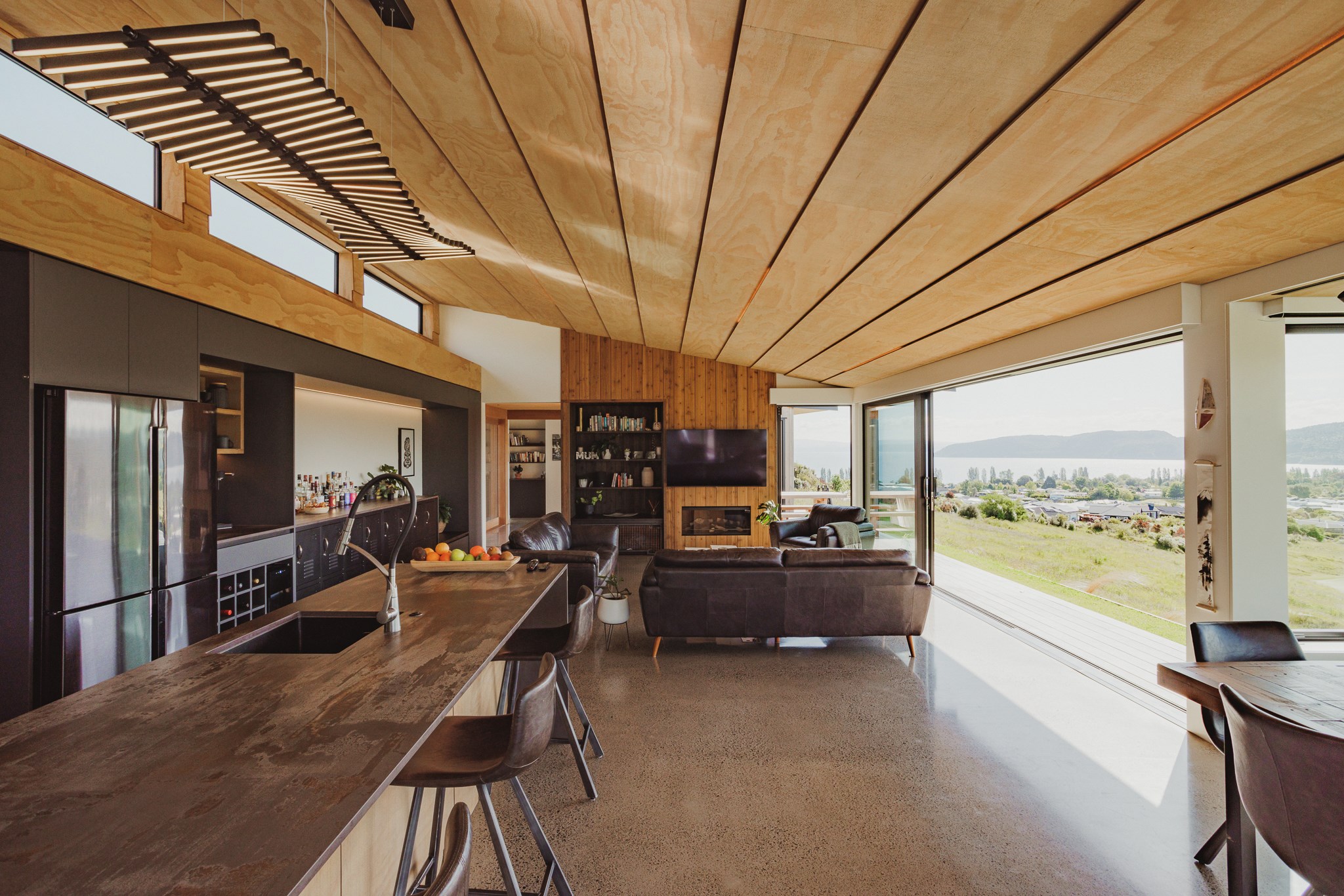 Situated on an angular site overlooking Jack Nicklaus Golf Course in Kinloch, this contemporary home reflects the natural tones of the surrounding landscape and blends gracefully into the hillside. Coloured steel and cedar cladding grounds the building, merging it into the terrain. Each room angles from the next, crafting a slightly different outlook in each space, taking advantage of the breathtaking views. The large entryway is concealed behind cedar battens to provide a level of privacy and focus. Exterior materials are brought inwards with large sliding doors separating the bedrooms from the living areas, which are contrasted by cedar interior walls. The upper level contains an apartment which is accessed via a cedar batten bridge, carrying through features from the main entrance creating continuity of style. The main bedroom captures views of Western Bays while expansive windows throughout the living and dining areas take in the evolving vista and seasonal changes. The kitchen has a discreet scullery accessed via a hidden door. Metal lockers form part of the kitchen, which add a playful yet practical aspect as a bespoke gin and whiskey bar. Cheers to that!