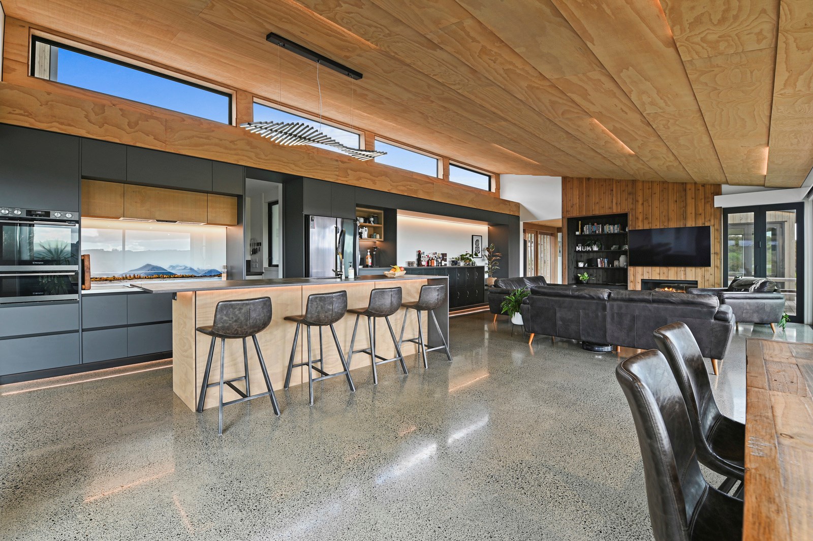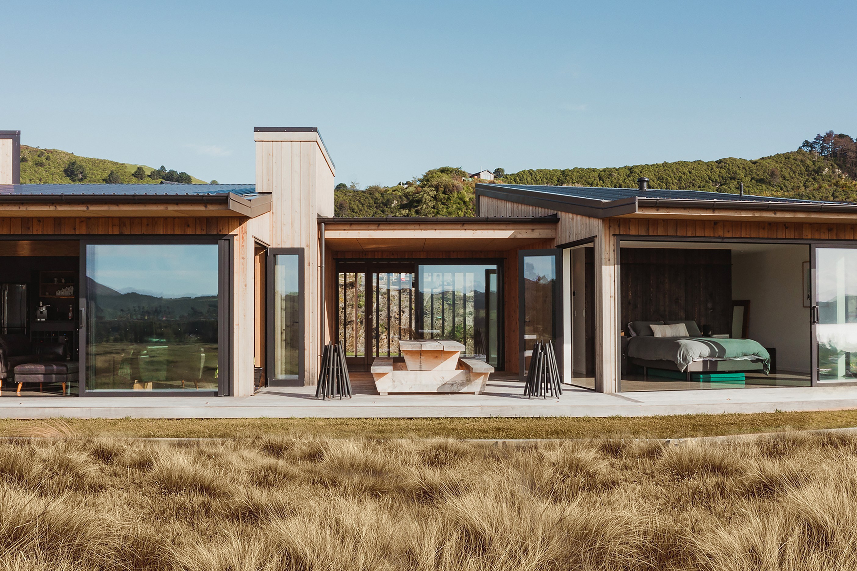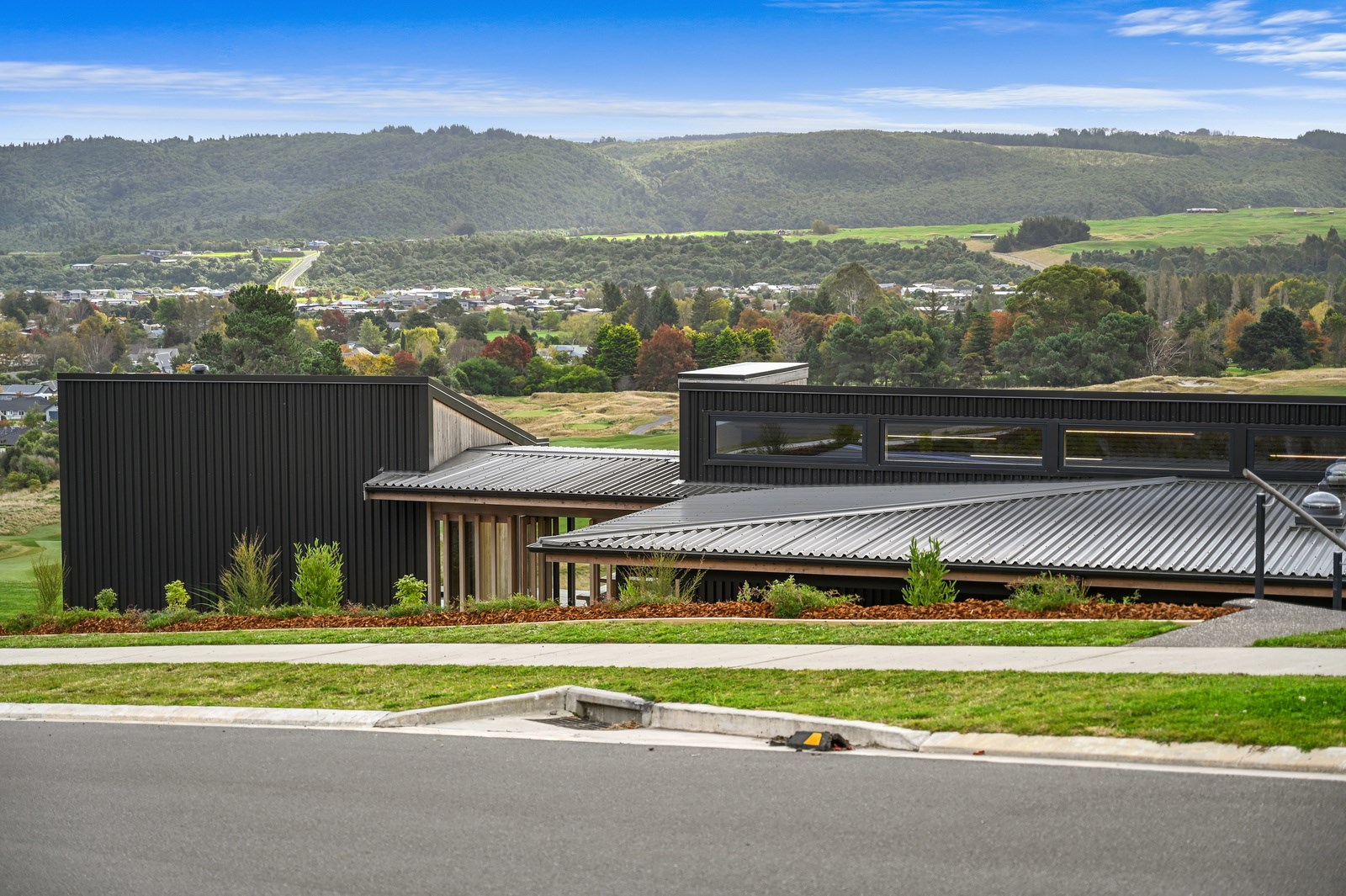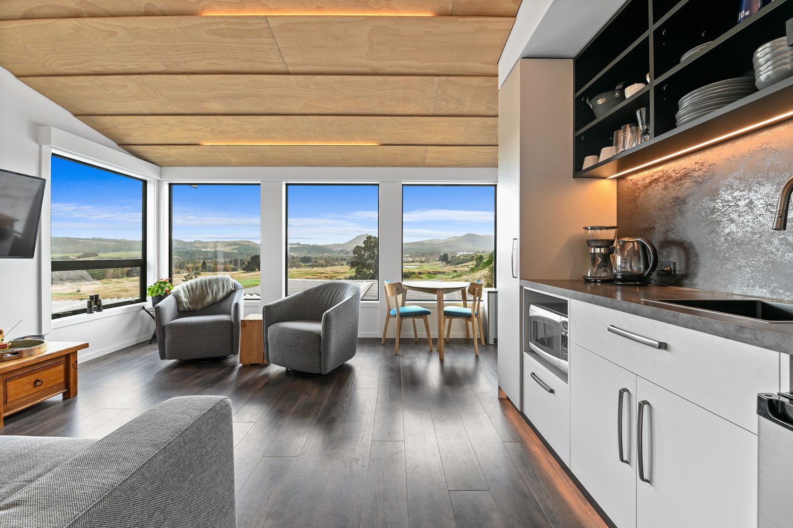 Situated on an angular site overlooking Jack Nicklaus Golf Course in Kinloch, this contemporary home reflects the natural tones of the surrounding landscape and blends gracefully into the hillside. Coloured steel and cedar cladding grounds the building, merging it into the terrain. Each room angles from the next, crafting a slightly different outlook in each space, taking advantage of the breathtaking views. The large entryway is concealed behind cedar battens to provide a level of privacy and focus. Exterior materials are brought inwards with large sliding doors separating the bedrooms from the living areas, which are contrasted by cedar interior walls. The upper level contains an apartment which is accessed via a cedar batten bridge, carrying through features from the main entrance creating continuity of style. The main bedroom captures views of Western Bays while expansive windows throughout the living and dining areas take in the evolving vista and seasonal changes. The kitchen has a discreet scullery accessed via a hidden door. Metal lockers form part of the kitchen, which add a playful yet practical aspect as a bespoke gin and whiskey bar. Cheers to that!