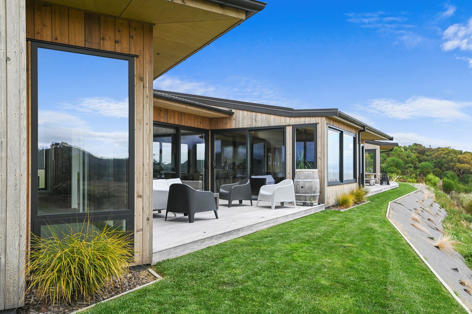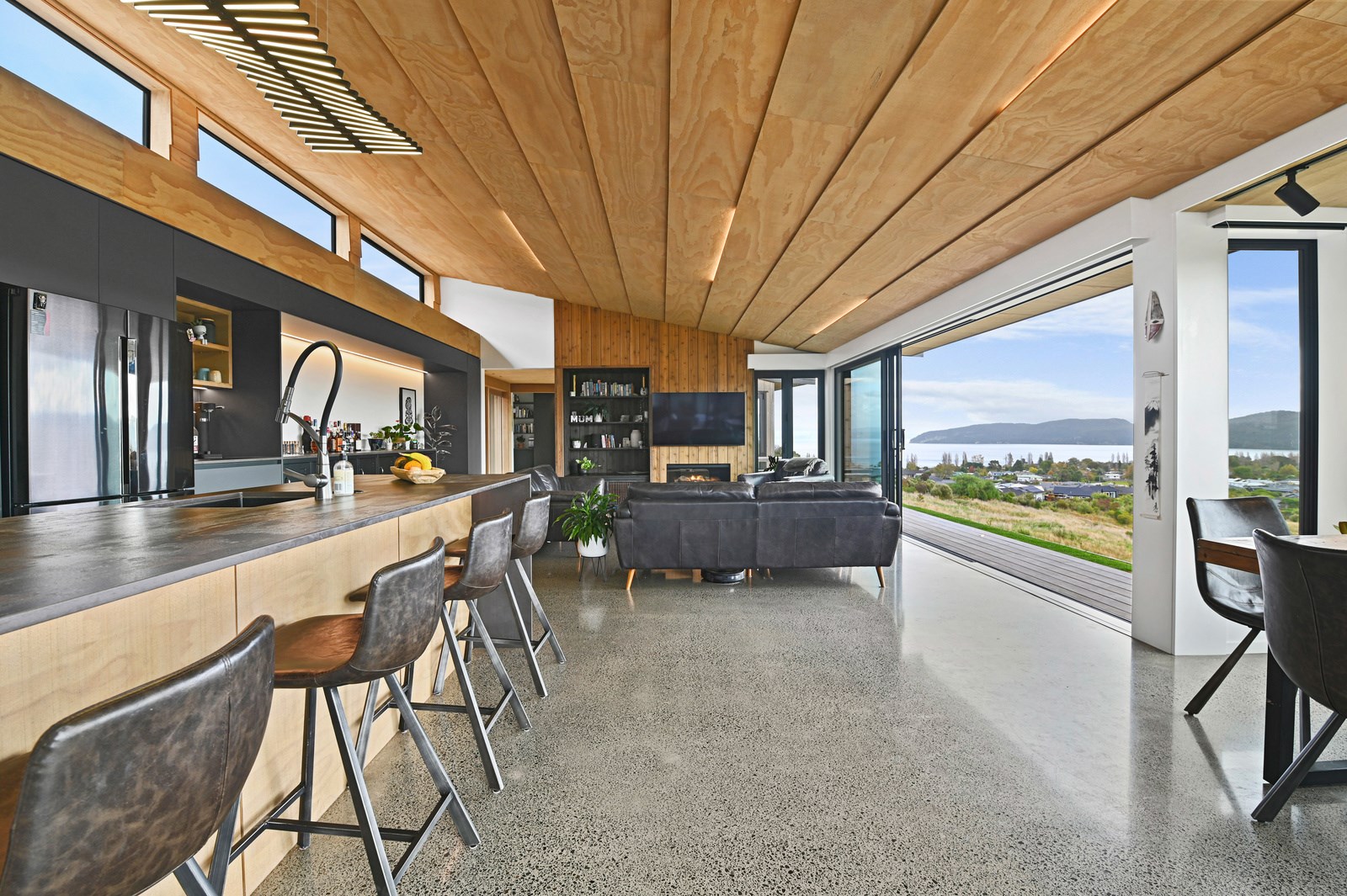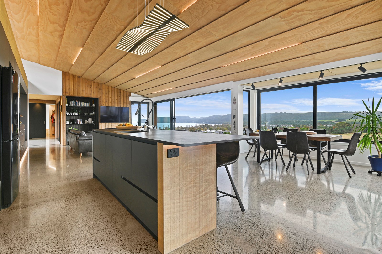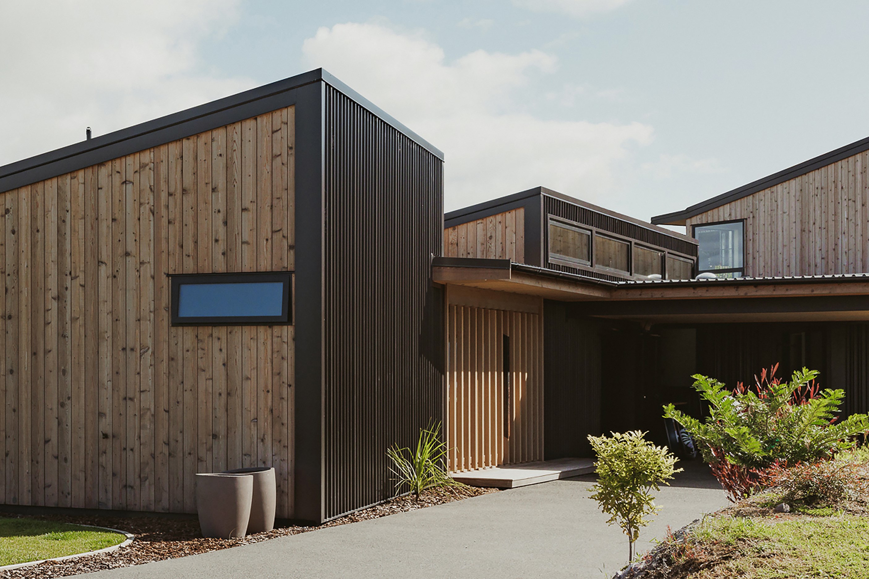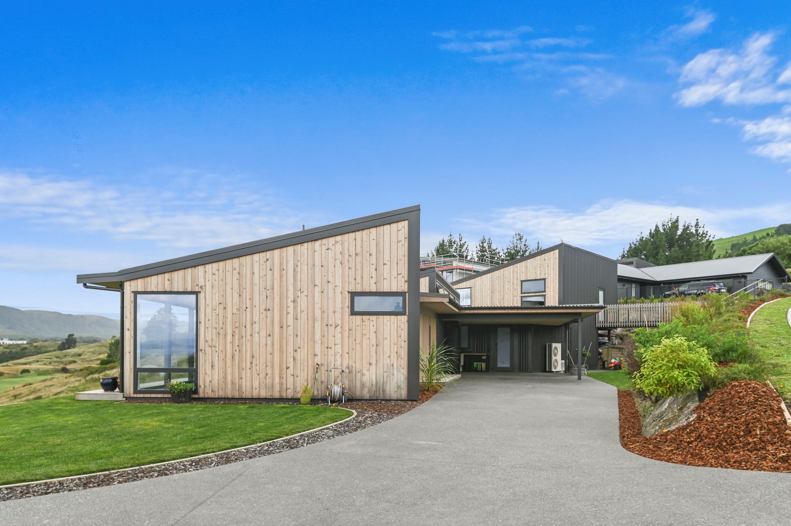 Situated on an angular site overlooking Jack Nicklaus Golf Course in Kinloch, this contemporary home reflects the natural tones of the surrounding landscape and blends gracefully into the hillside. Coloured steel and cedar cladding grounds the building, merging it into the terrain. Each room angles from the next, crafting a slightly different outlook in each space, taking advantage of the breathtaking views. The large entryway is concealed behind cedar battens to provide a level of privacy and focus. Exterior materials are brought inwards with large sliding doors separating the bedrooms from the living areas, which are contrasted by cedar interior walls. The upper level contains an apartment which is accessed via a cedar batten bridge, carrying through features from the main entrance creating continuity of style. The main bedroom captures views of Western Bays while expansive windows throughout the living and dining areas take in the evolving vista and seasonal changes. The kitchen has a discreet scullery accessed via a hidden door. Metal lockers form part of the kitchen, which add a playful yet practical aspect as a bespoke gin and whiskey bar. Cheers to that!