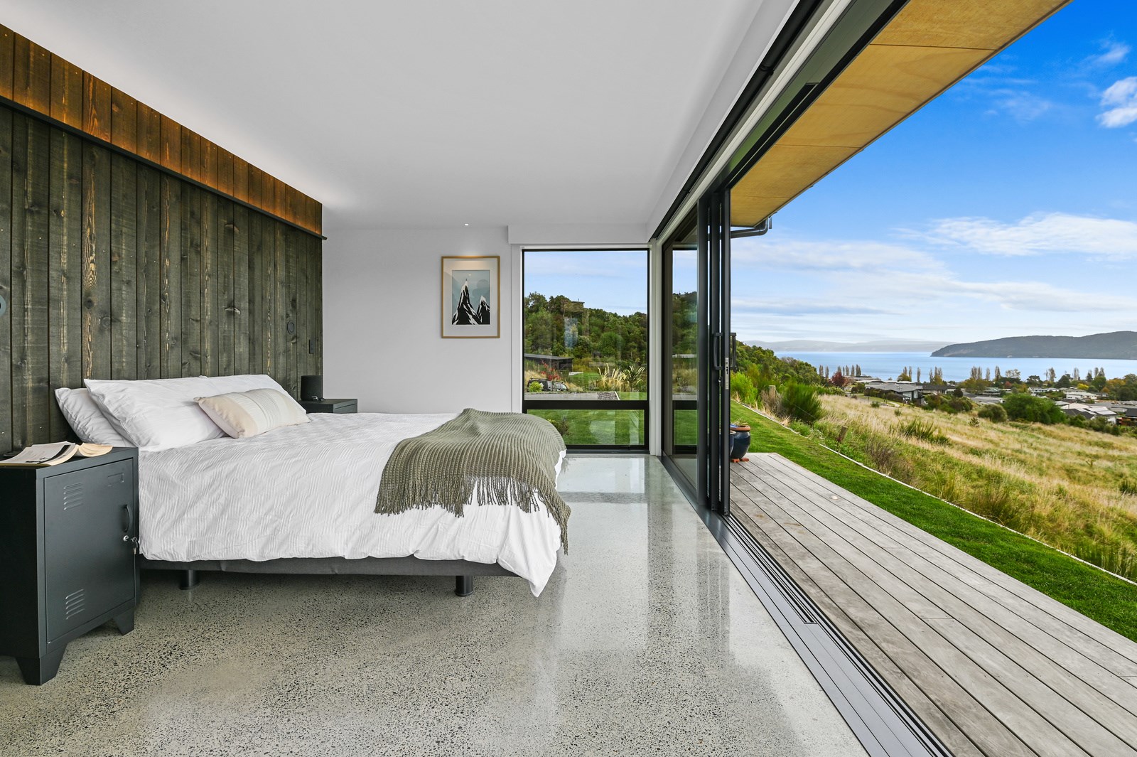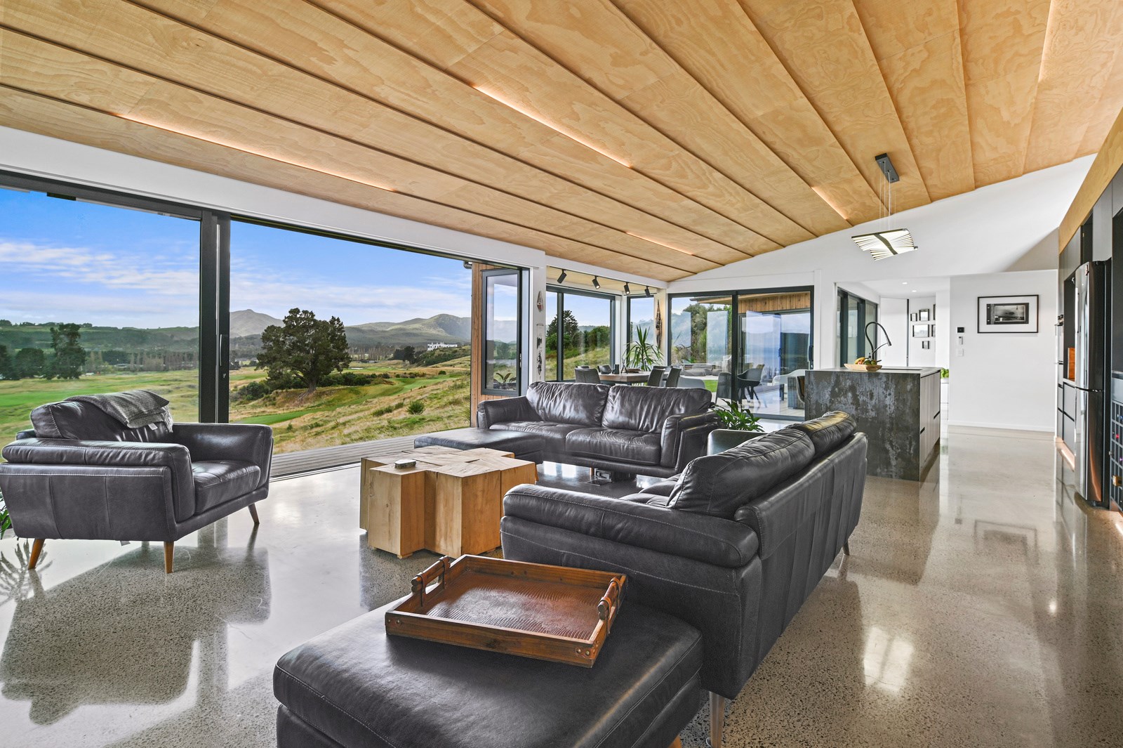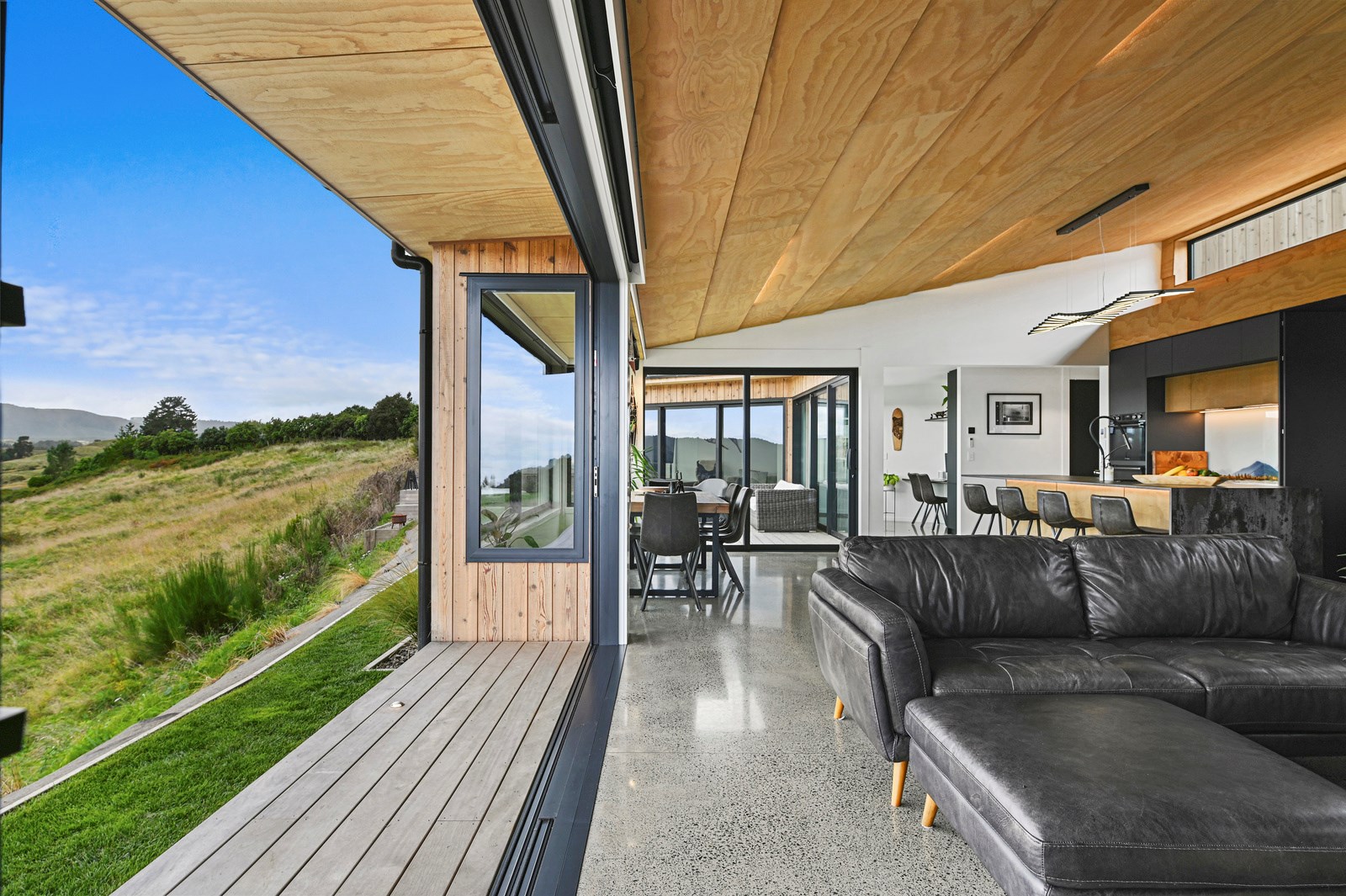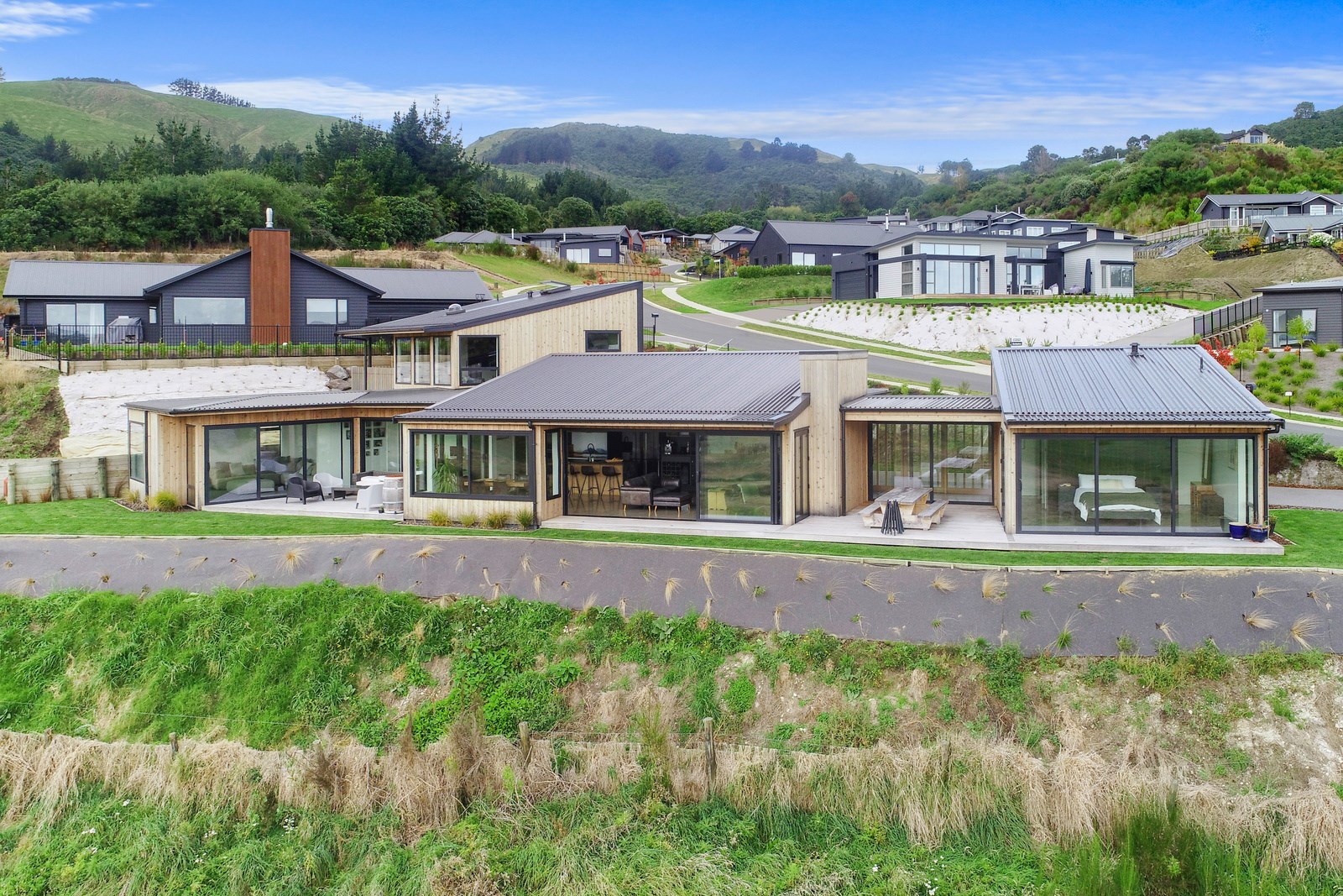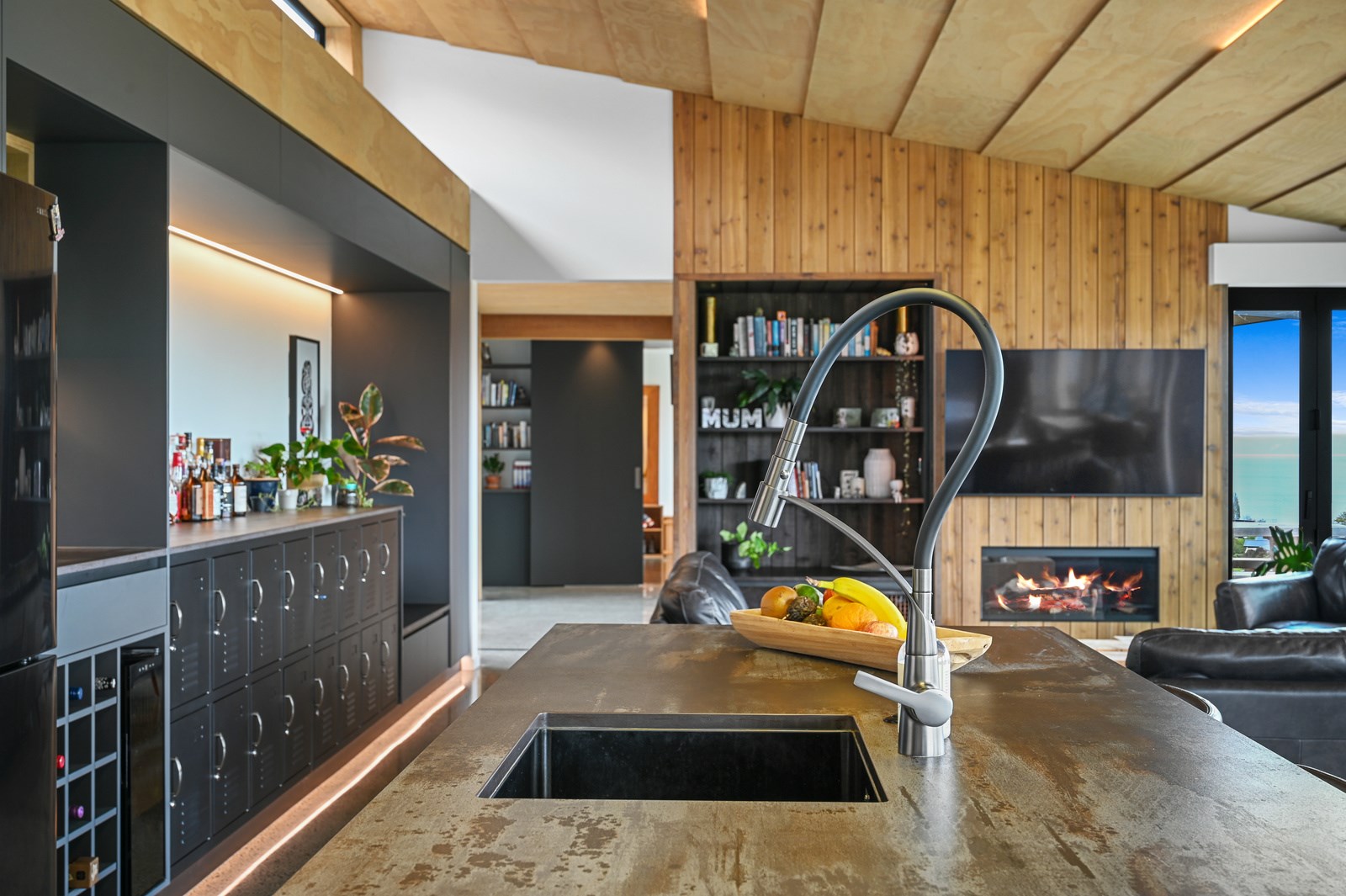 Situated on an angular site overlooking Jack Nicklaus Golf Course in Kinloch, this contemporary home reflects the natural tones of the surrounding landscape and blends gracefully into the hillside. Coloured steel and cedar cladding grounds the building, merging it into the terrain. Each room angles from the next, crafting a slightly different outlook in each space, taking advantage of the breathtaking views. The large entryway is concealed behind cedar battens to provide a level of privacy and focus. Exterior materials are brought inwards with large sliding doors separating the bedrooms from the living areas, which are contrasted by cedar interior walls. The upper level contains an apartment which is accessed via a cedar batten bridge, carrying through features from the main entrance creating continuity of style. The main bedroom captures views of Western Bays while expansive windows throughout the living and dining areas take in the evolving vista and seasonal changes. The kitchen has a discreet scullery accessed via a hidden door. Metal lockers form part of the kitchen, which add a playful yet practical aspect as a bespoke gin and whiskey bar. Cheers to that!