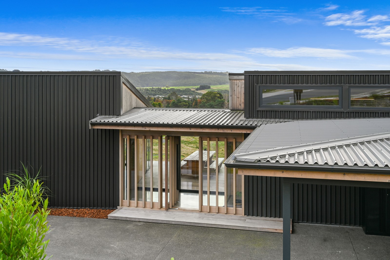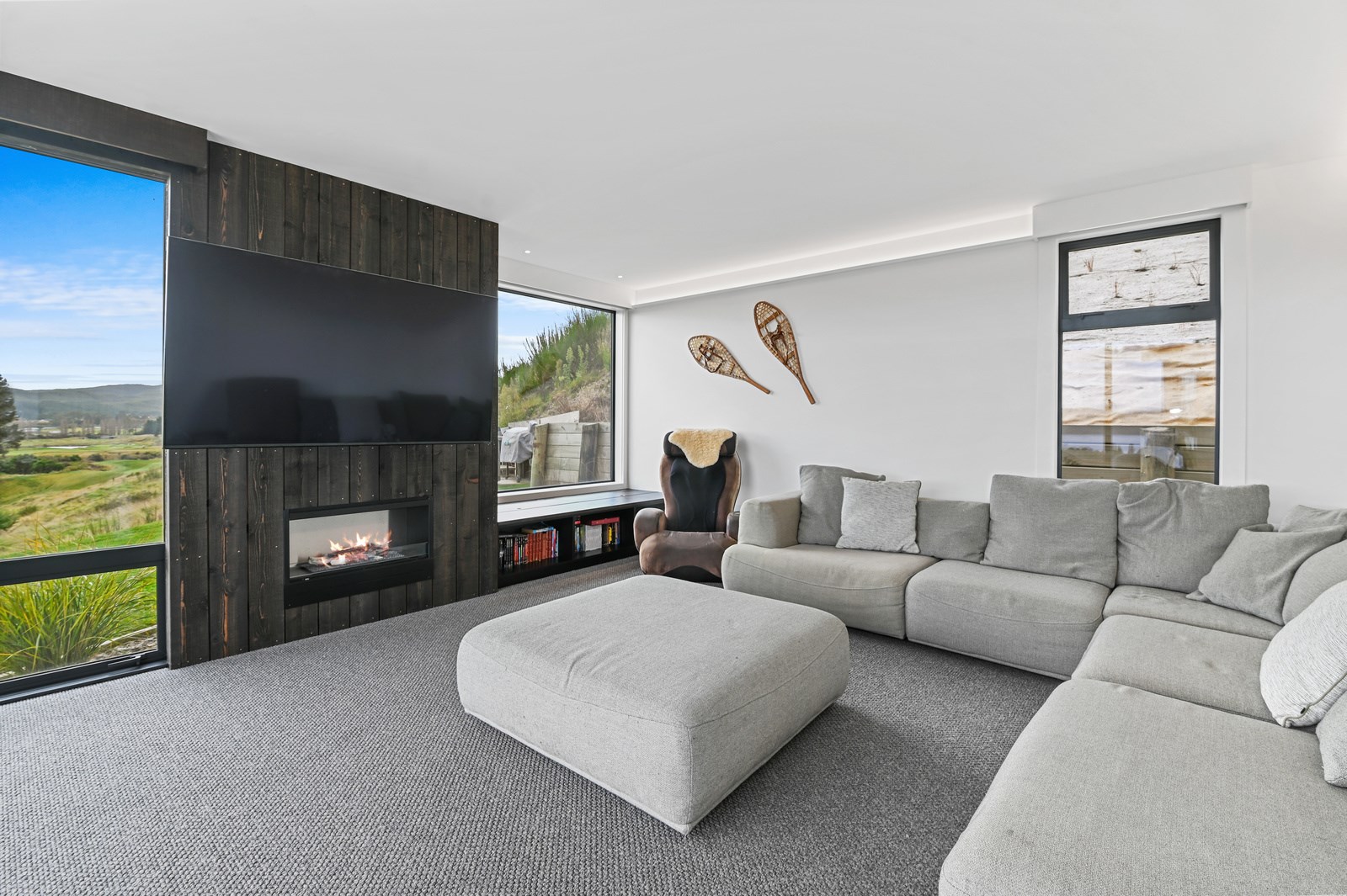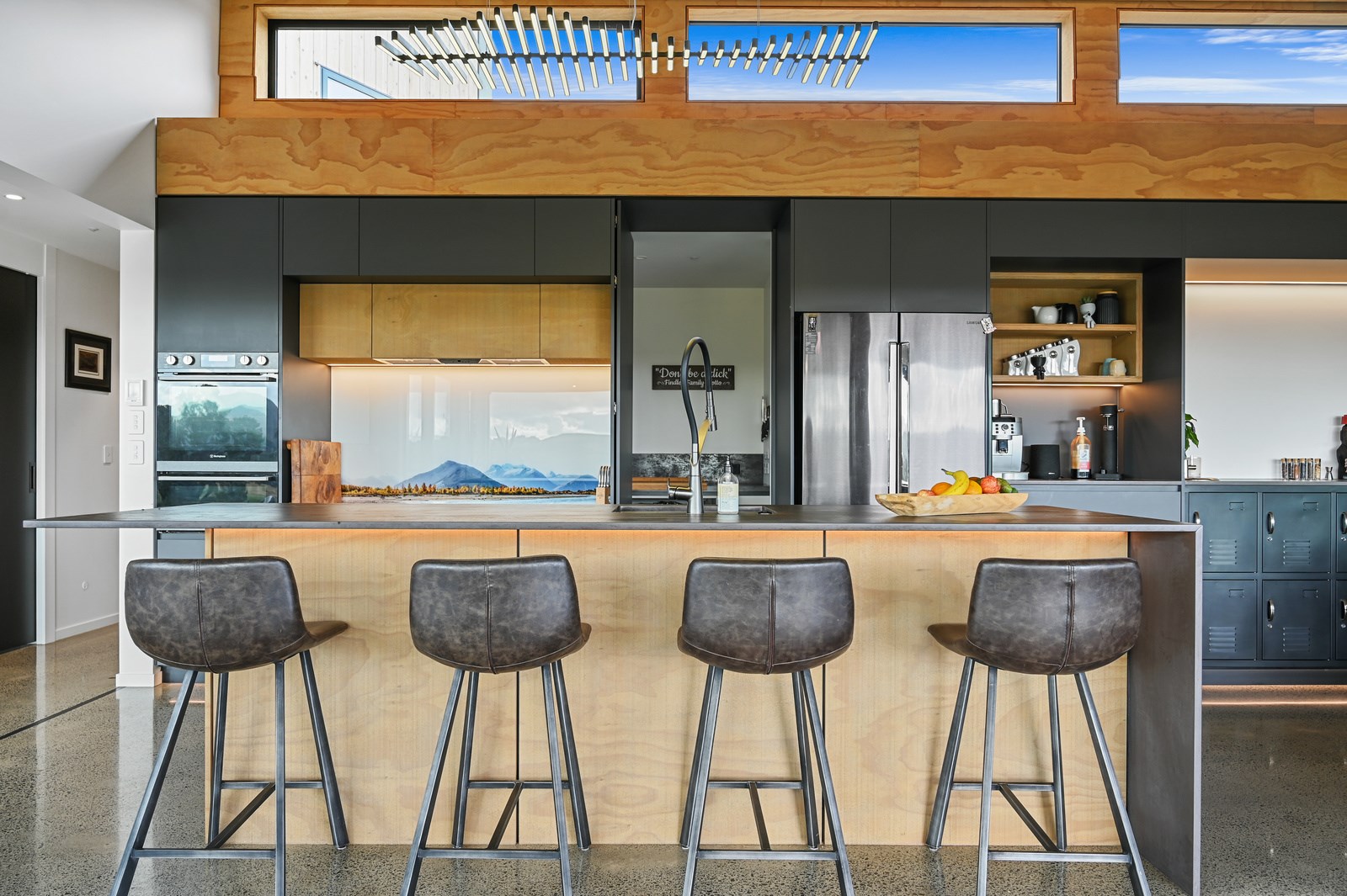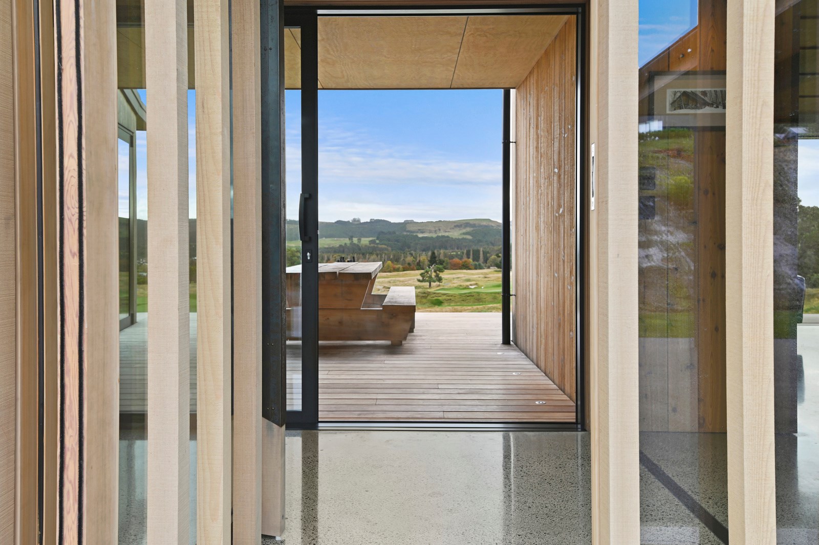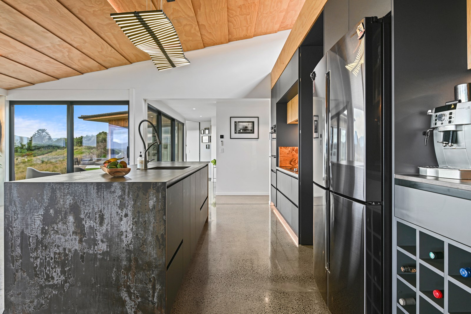 Situated on an angular site overlooking Jack Nicklaus Golf Course in Kinloch, this contemporary home reflects the natural tones of the surrounding landscape and blends gracefully into the hillside. Coloured steel and cedar cladding grounds the building, merging it into the terrain. Each room angles from the next, crafting a slightly different outlook in each space, taking advantage of the breathtaking views. The large entryway is concealed behind cedar battens to provide a level of privacy and focus. Exterior materials are brought inwards with large sliding doors separating the bedrooms from the living areas, which are contrasted by cedar interior walls. The upper level contains an apartment which is accessed via a cedar batten bridge, carrying through features from the main entrance creating continuity of style. The main bedroom captures views of Western Bays while expansive windows throughout the living and dining areas take in the evolving vista and seasonal changes. The kitchen has a discreet scullery accessed via a hidden door. Metal lockers form part of the kitchen, which add a playful yet practical aspect as a bespoke gin and whiskey bar. Cheers to that!