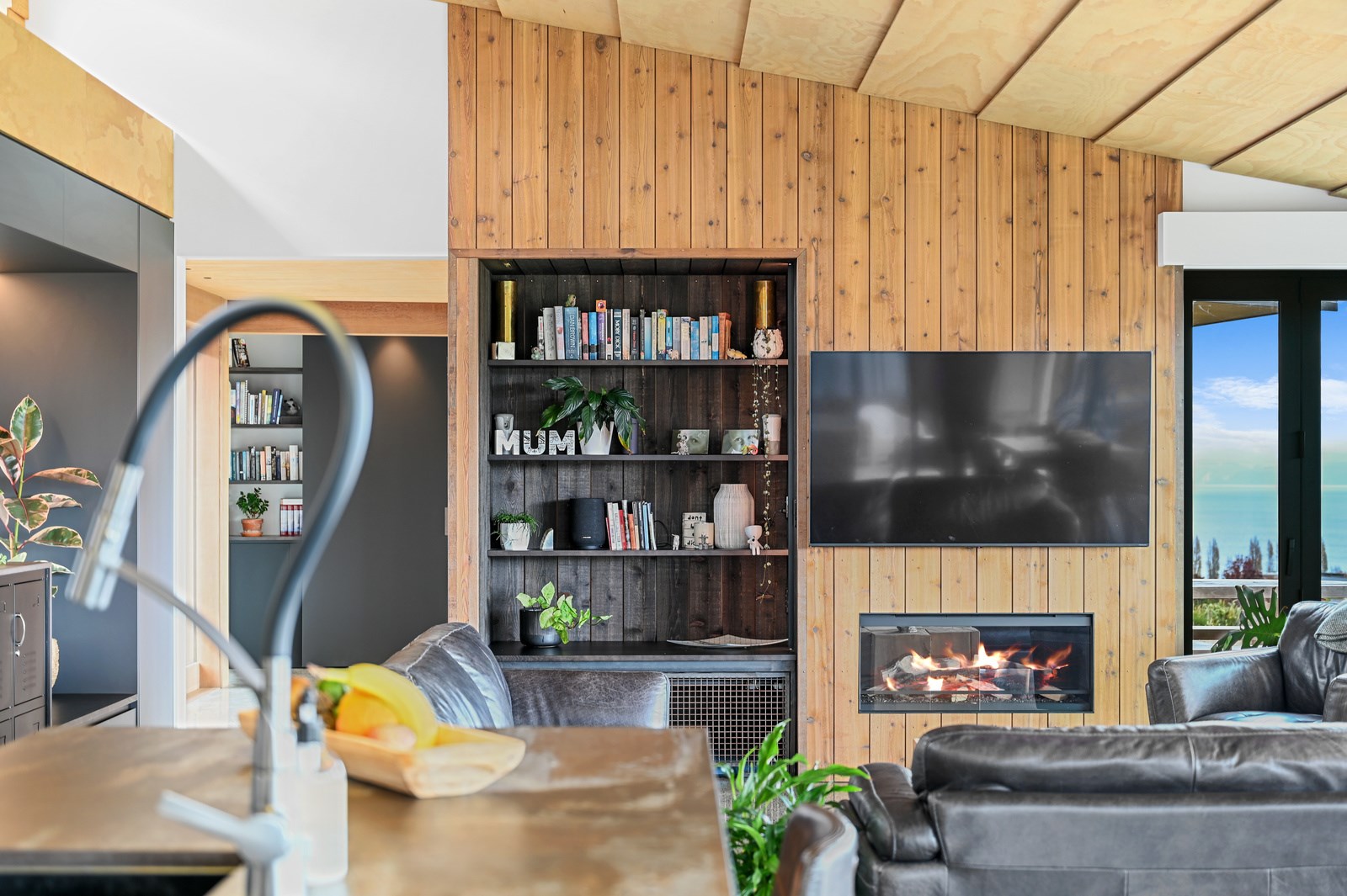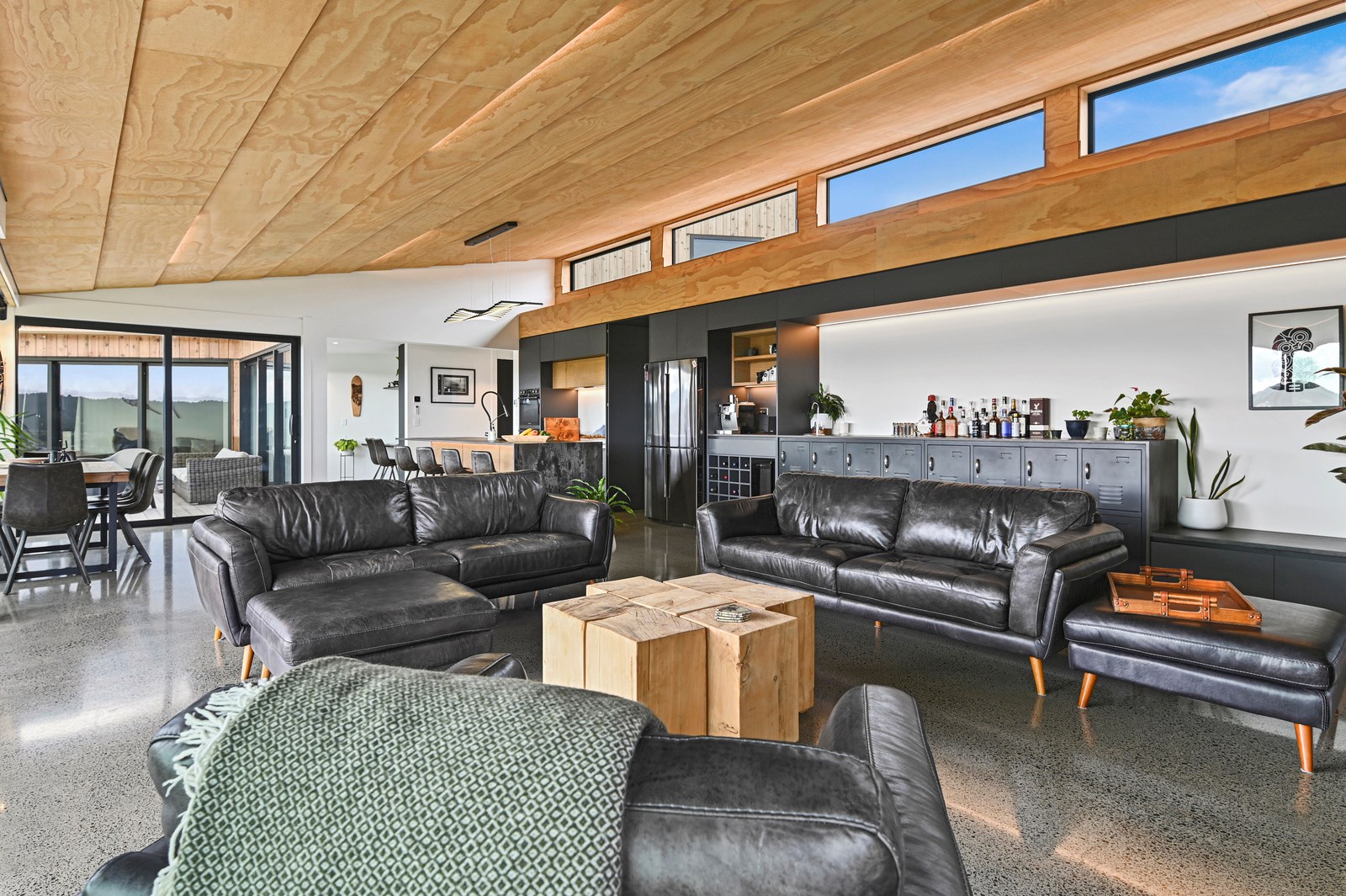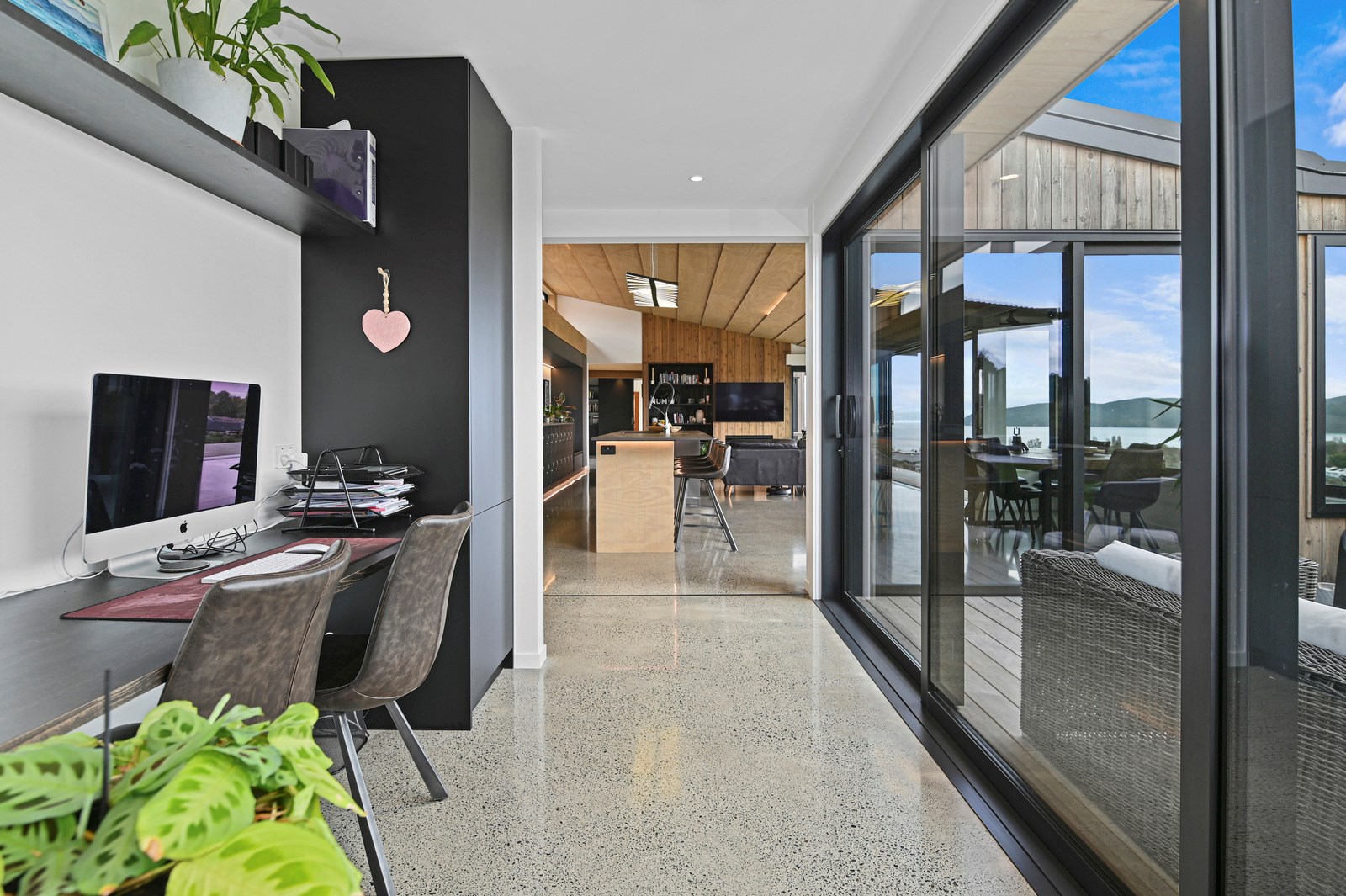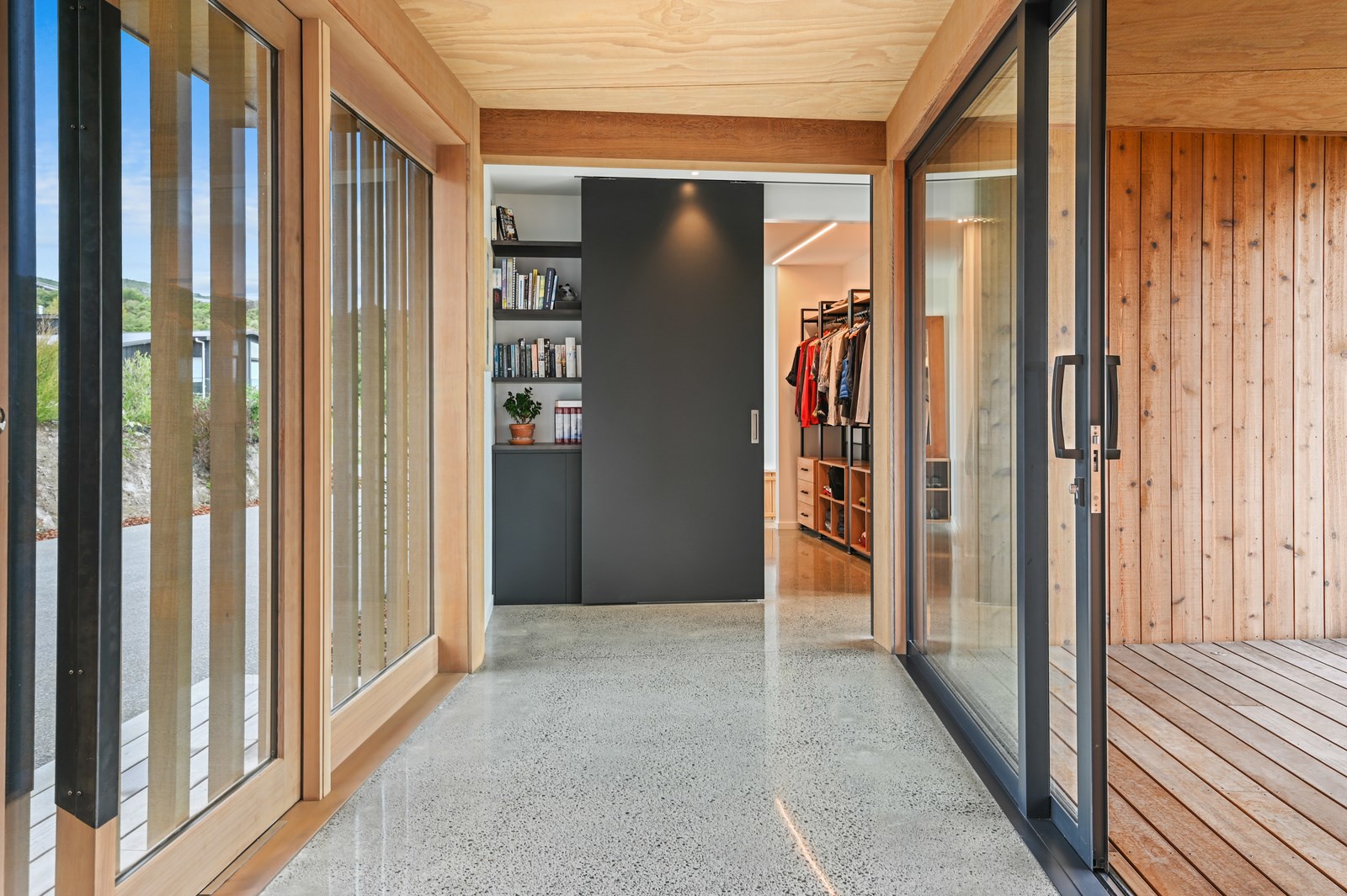 Situated on an angular site overlooking Jack Nicklaus Golf Course in Kinloch, this contemporary home reflects the natural tones of the surrounding landscape and blends gracefully into the hillside. Coloured steel and cedar cladding grounds the building, merging it into the terrain. Each room angles from the next, crafting a slightly different outlook in each space, taking advantage of the breathtaking views. The large entryway is concealed behind cedar battens to provide a level of privacy and focus. Exterior materials are brought inwards with large sliding doors separating the bedrooms from the living areas, which are contrasted by cedar interior walls. The upper level contains an apartment which is accessed via a cedar batten bridge, carrying through features from the main entrance creating continuity of style. The main bedroom captures views of Western Bays while expansive windows throughout the living and dining areas take in the evolving vista and seasonal changes. The kitchen has a discreet scullery accessed via a hidden door. Metal lockers form part of the kitchen, which add a playful yet practical aspect as a bespoke gin and whiskey bar. Cheers to that!