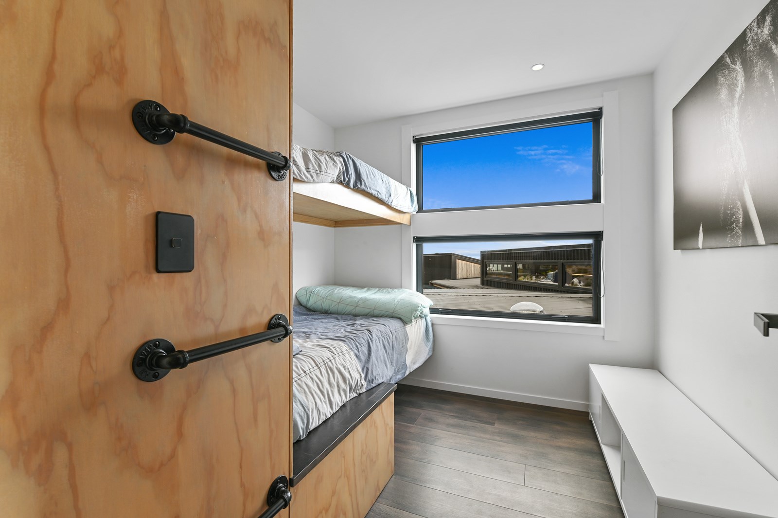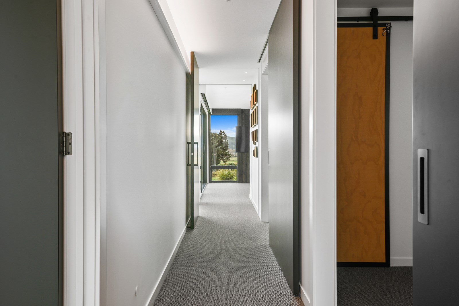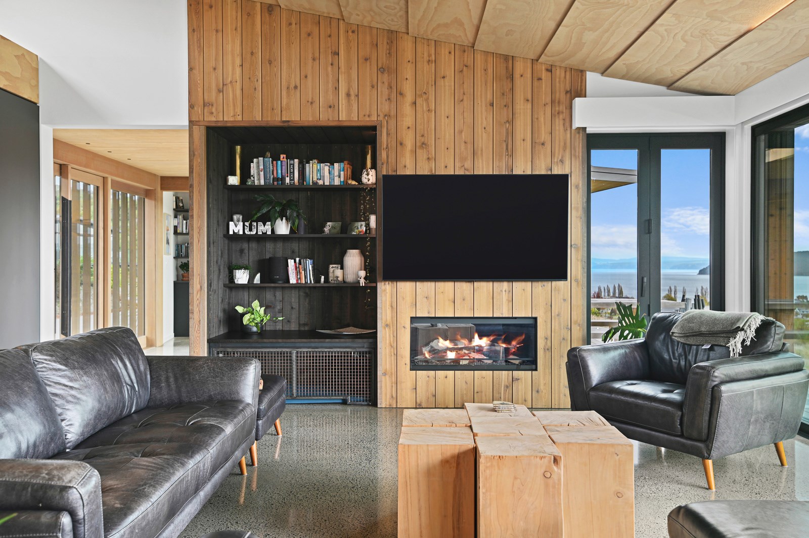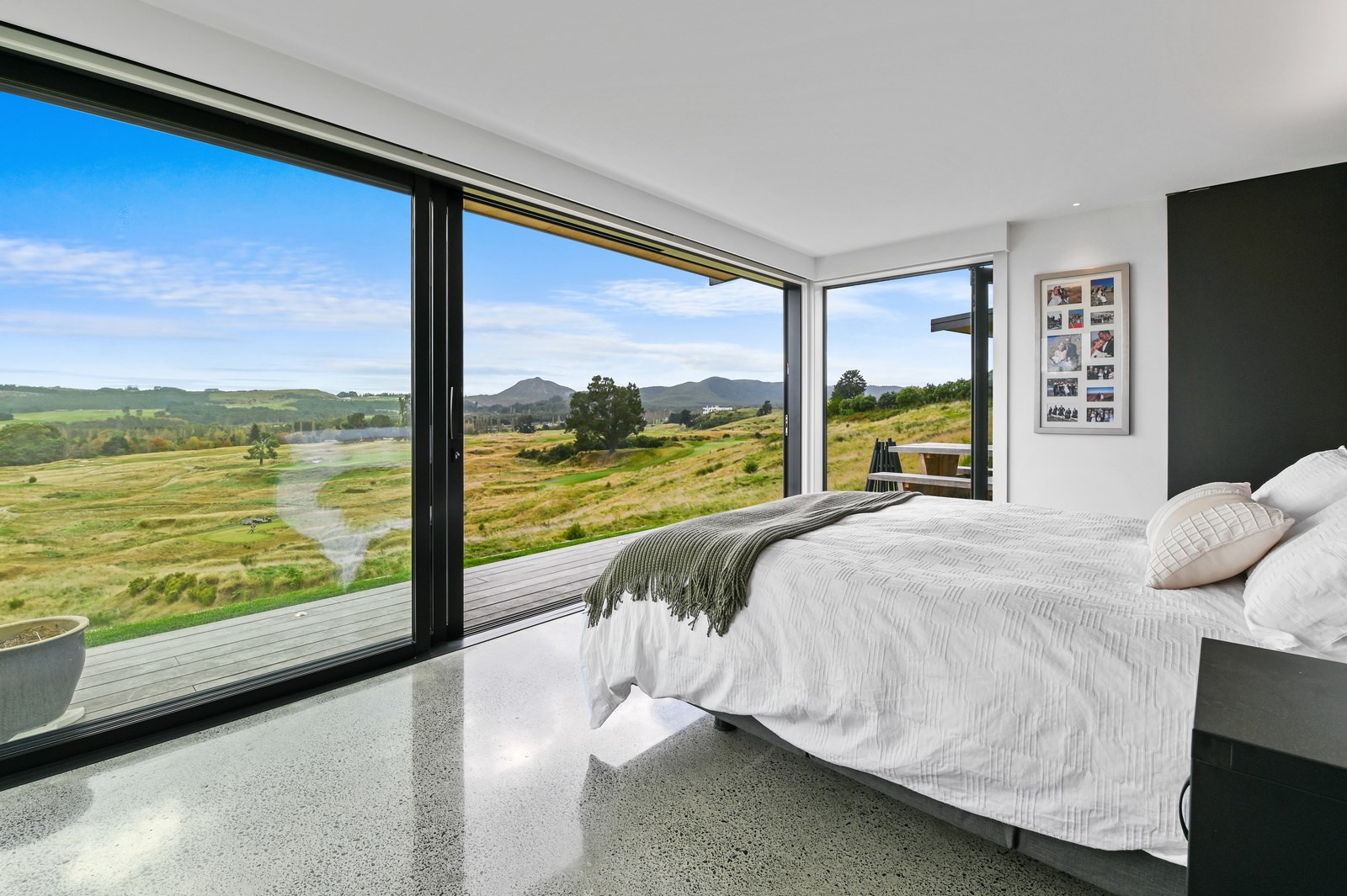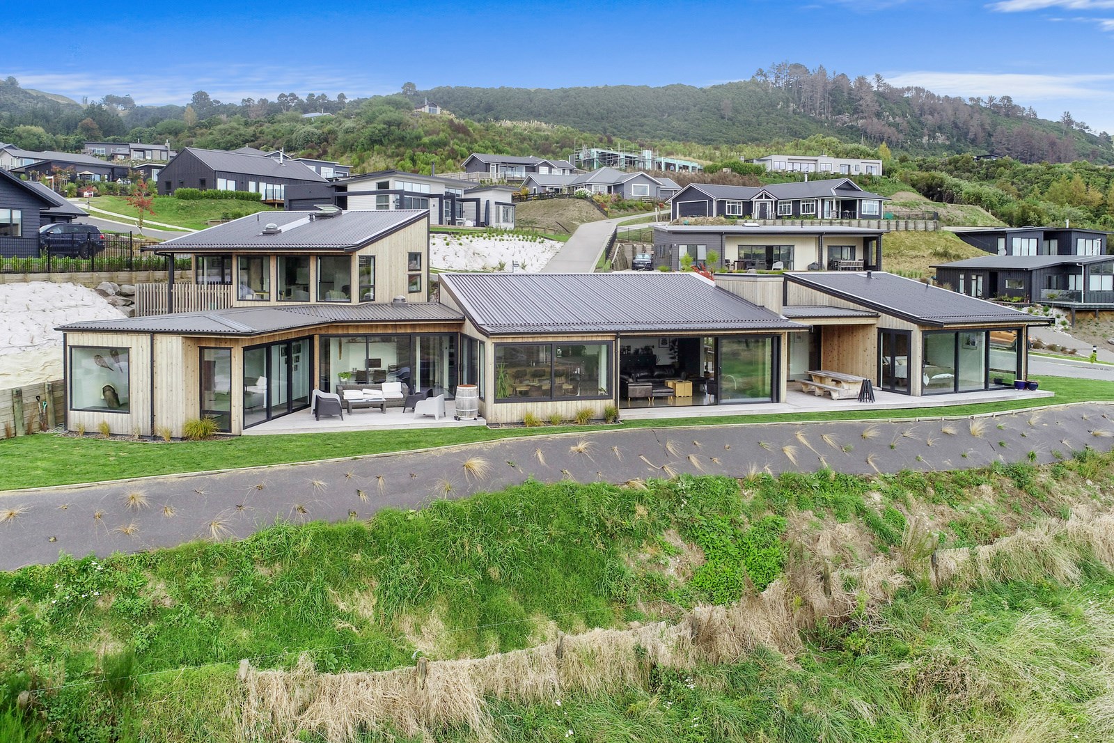 Situated on an angular site overlooking Jack Nicklaus Golf Course in Kinloch, this contemporary home reflects the natural tones of the surrounding landscape and blends gracefully into the hillside. Coloured steel and cedar cladding grounds the building, merging it into the terrain. Each room angles from the next, crafting a slightly different outlook in each space, taking advantage of the breathtaking views. The large entryway is concealed behind cedar battens to provide a level of privacy and focus. Exterior materials are brought inwards with large sliding doors separating the bedrooms from the living areas, which are contrasted by cedar interior walls. The upper level contains an apartment which is accessed via a cedar batten bridge, carrying through features from the main entrance creating continuity of style. The main bedroom captures views of Western Bays while expansive windows throughout the living and dining areas take in the evolving vista and seasonal changes. The kitchen has a discreet scullery accessed via a hidden door. Metal lockers form part of the kitchen, which add a playful yet practical aspect as a bespoke gin and whiskey bar. Cheers to that!