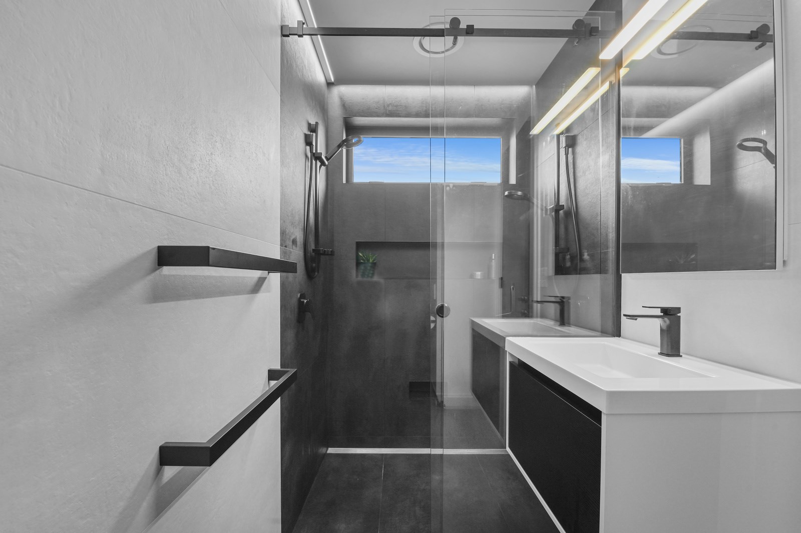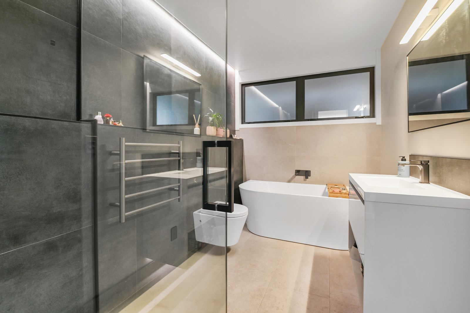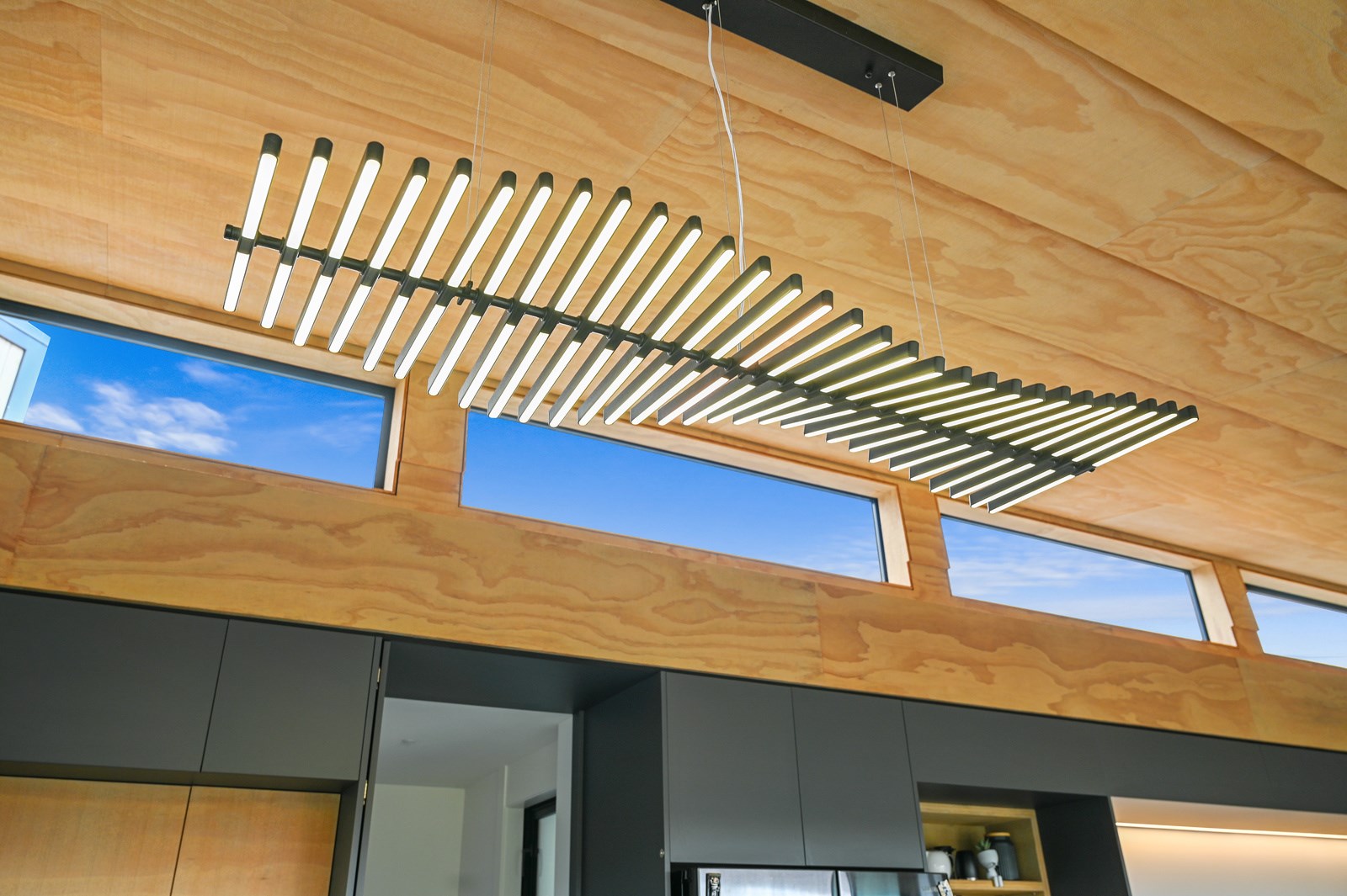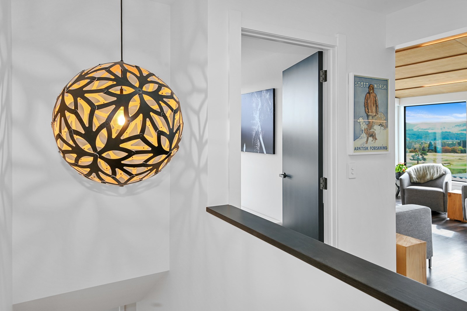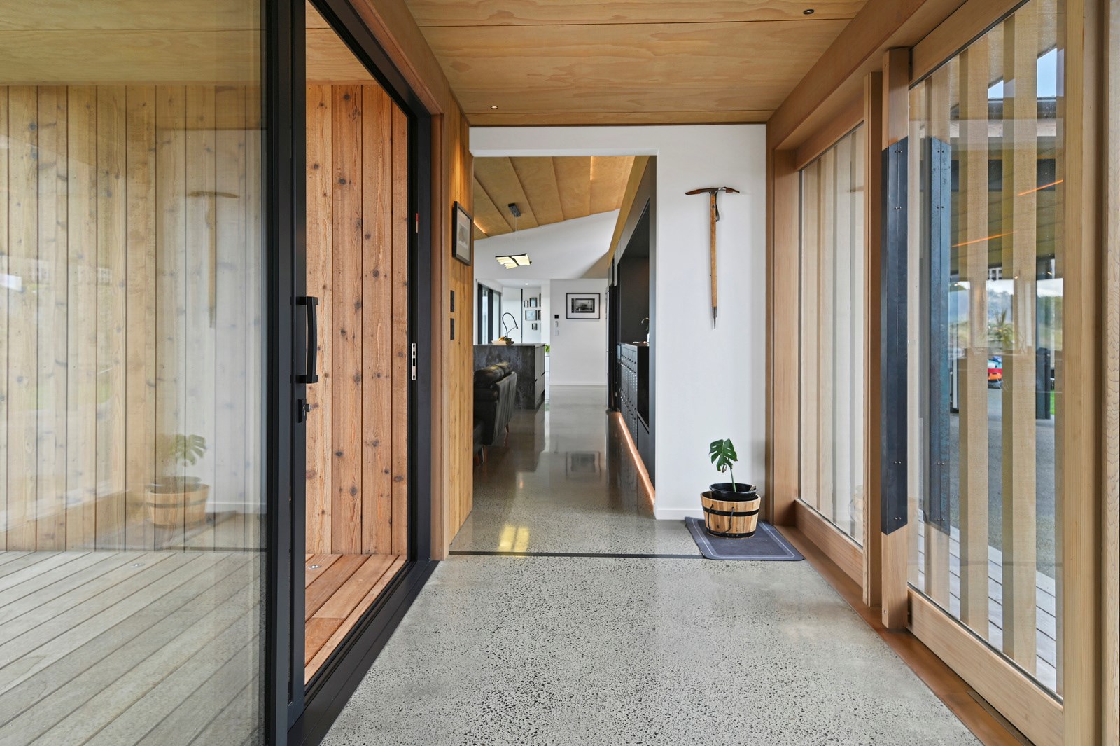Situated on an angular site overlooking Jack Nicklaus Golf Course in Kinloch, this contemporary home reflects the natural tones of the surrounding landscape and blends gracefully into the hillside. Coloured steel and cedar cladding grounds the building, merging it into the terrain. Each room angles from the next, crafting a slightly different outlook in each space, taking advantage of the breathtaking views. The large entryway is concealed behind cedar battens to provide a level of privacy and focus. Exterior materials are brought inwards with large sliding doors separating the bedrooms from the living areas, which are contrasted by cedar interior walls. The upper level contains an apartment which is accessed via a cedar batten bridge, carrying through features from the main entrance creating continuity of style. The main bedroom captures views of Western Bays while expansive windows throughout the living and dining areas take in the evolving vista and seasonal changes. The kitchen has a discreet scullery accessed via a hidden door. Metal lockers form part of the kitchen, which add a playful yet practical aspect as a bespoke gin and whiskey bar. Cheers to that!