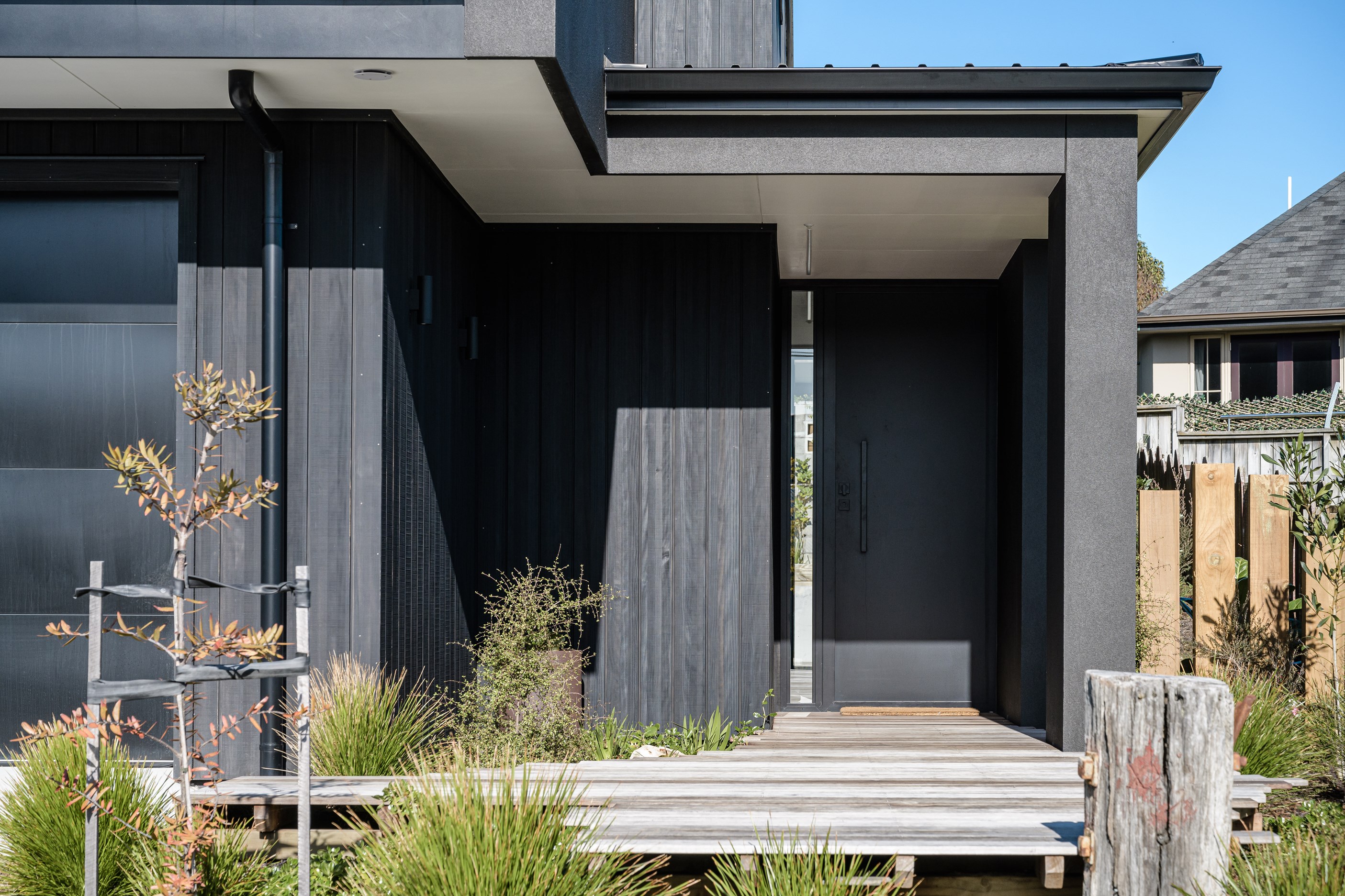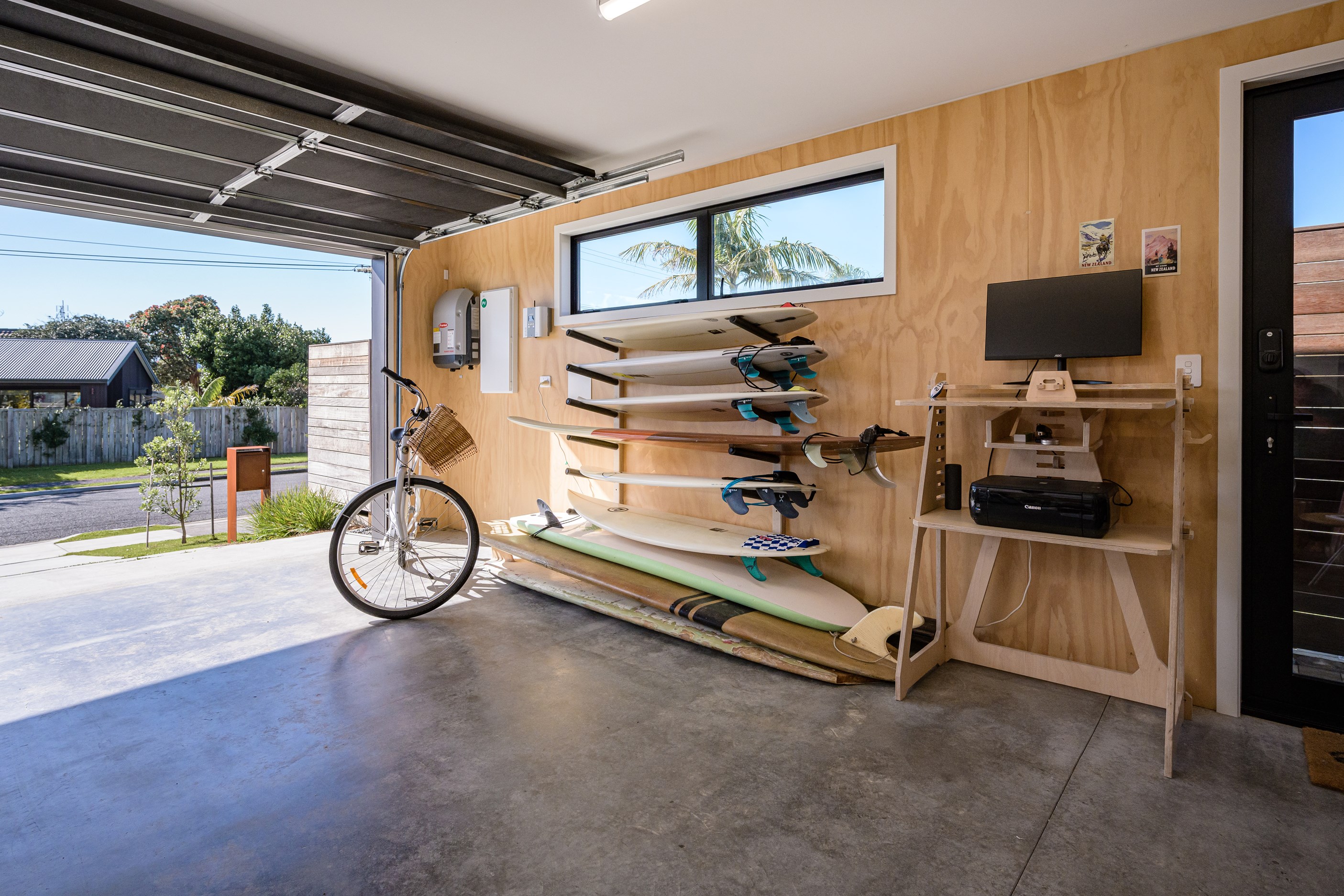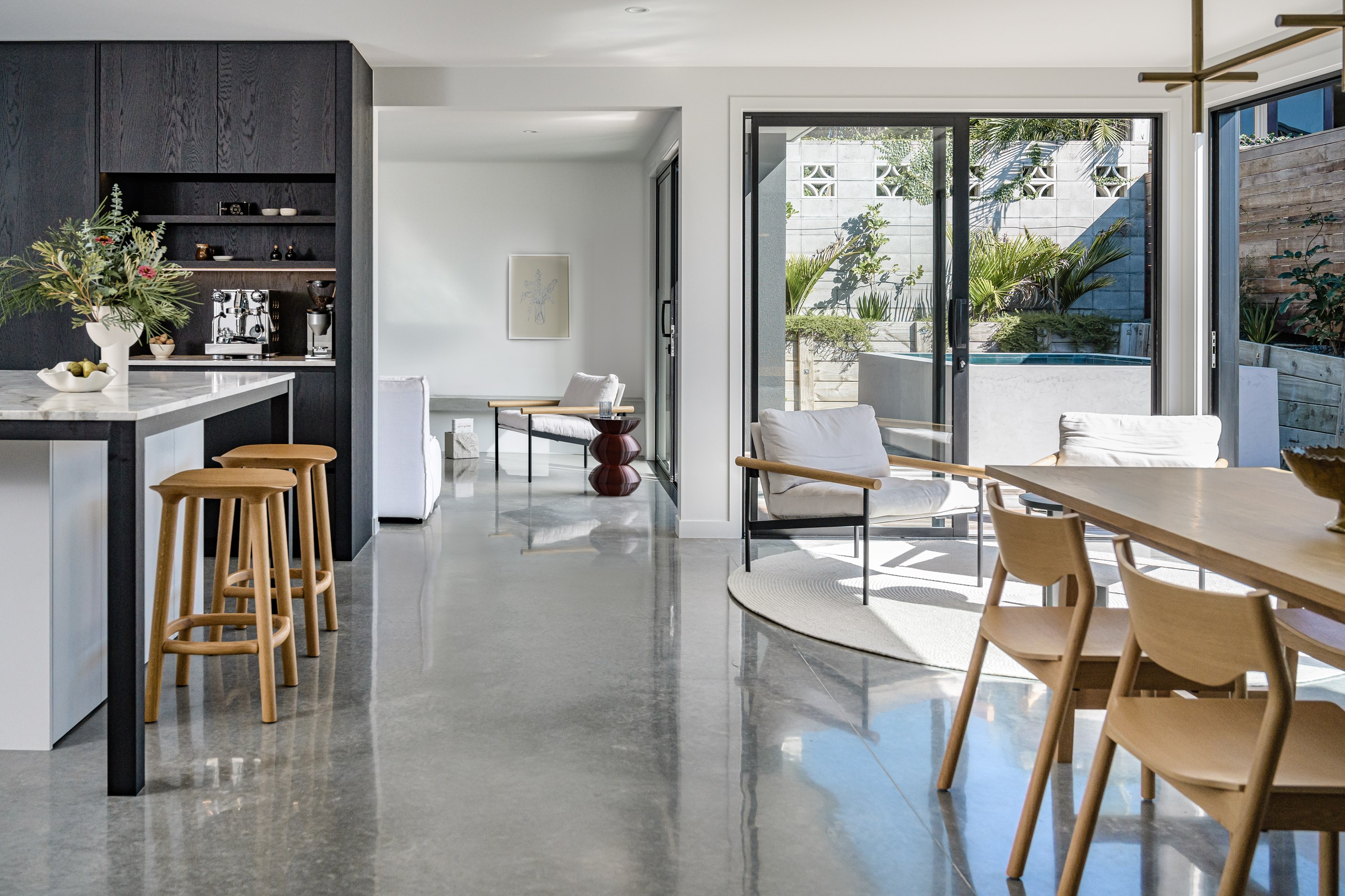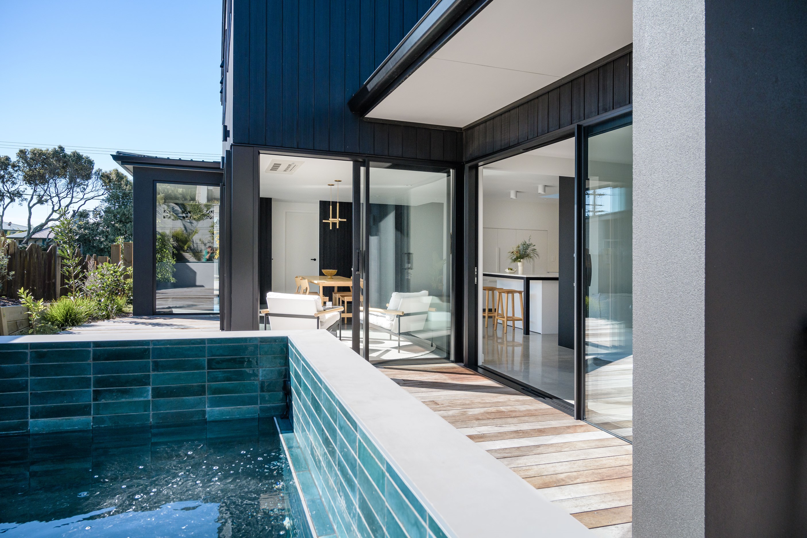 A small site needn’t be a barrier to big style and this beach beauty proves the point. The two-storey house sits on a section that’s just 322sqm, but has everything the owners need, plus luxury extras such as a plunge pool. It doesn’t hurt that the house, clad in vertical timber and plastered concrete panels, is just two blocks away from the white-sand beach and that the bedrooms enjoy glimpses of the region’s landmark peak, Mauao. The 208sqm design makes best use of the space available. Relaxed communal downstairs living dovetails with decking, and the plywood-lined double garage has plenty of room for storing surfboards, bikes and other toys. Polished concrete floors are practical and beachy. Upstairs are the bedrooms, with the main suite encompassing a tiled ensuite, dressing room and a private balcony. Off the hall are two more bedrooms, a bathroom and study. An important part of the brief was sustainability, as evidenced by waffle foundation, recycled plastic wall and ceiling insulation, and thermally modified cladding. Other features include solar power with battery storage, skylights for ventilation, a heat-pump hot-water cylinder and provision for an EV charger. With its big-picture design, this house on a compact site is set up for years to come.