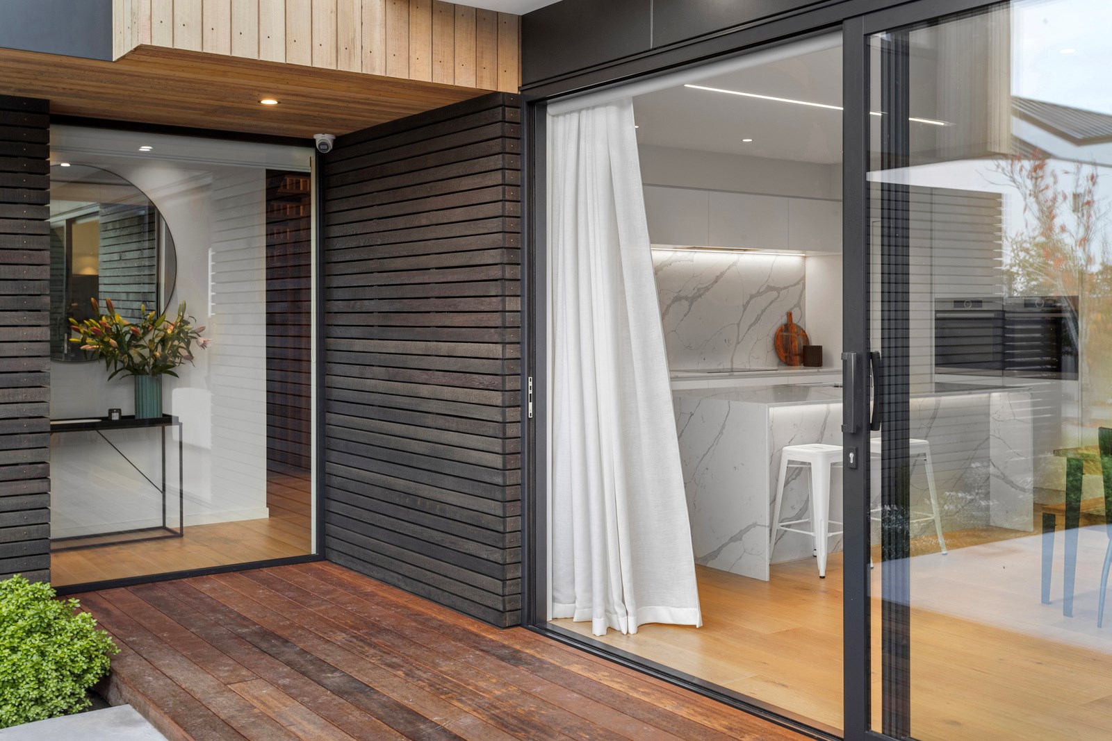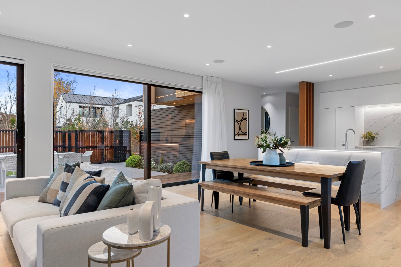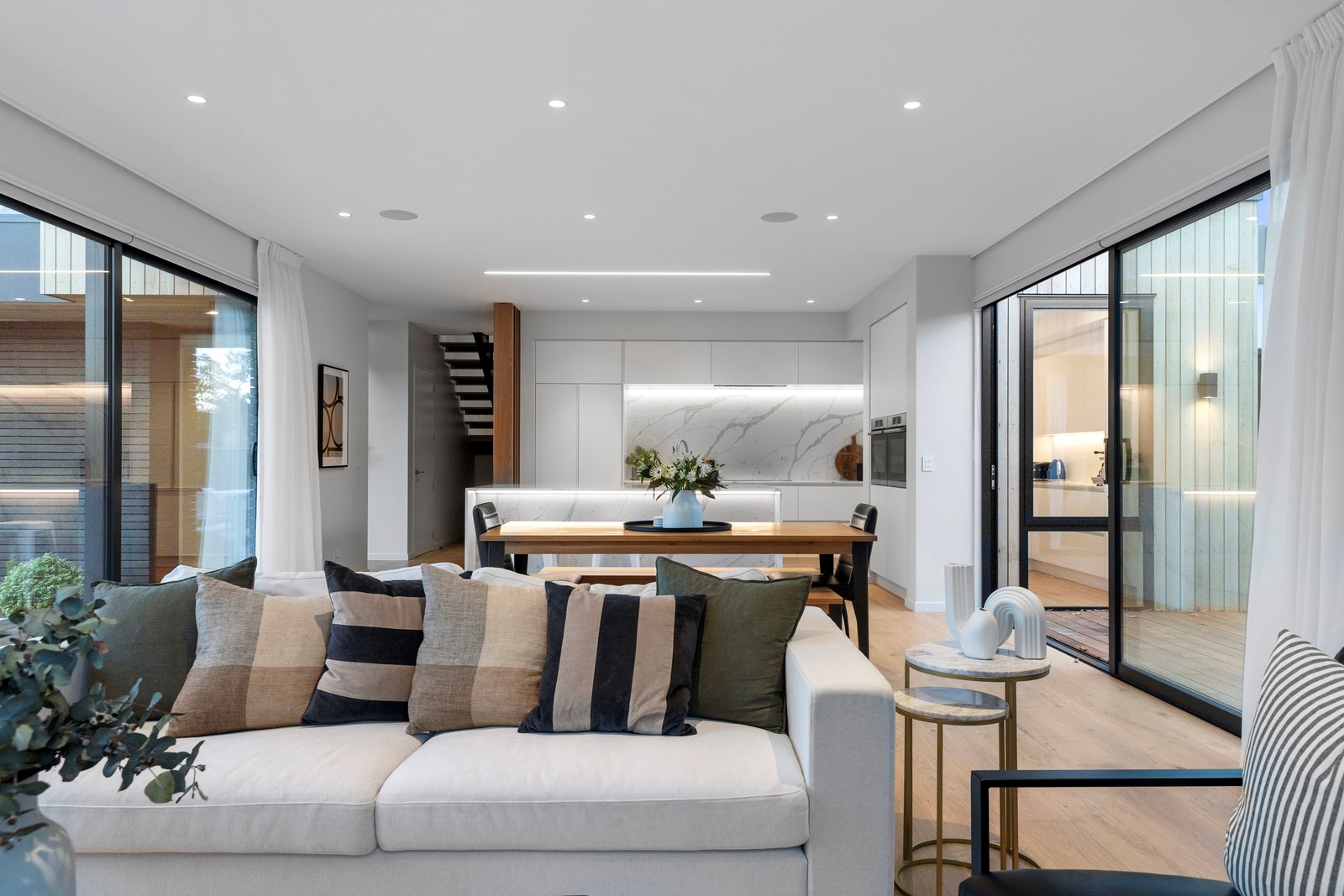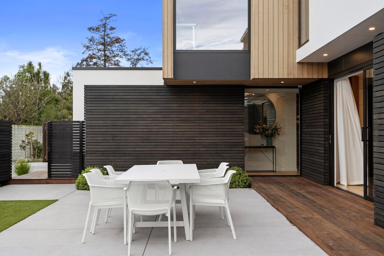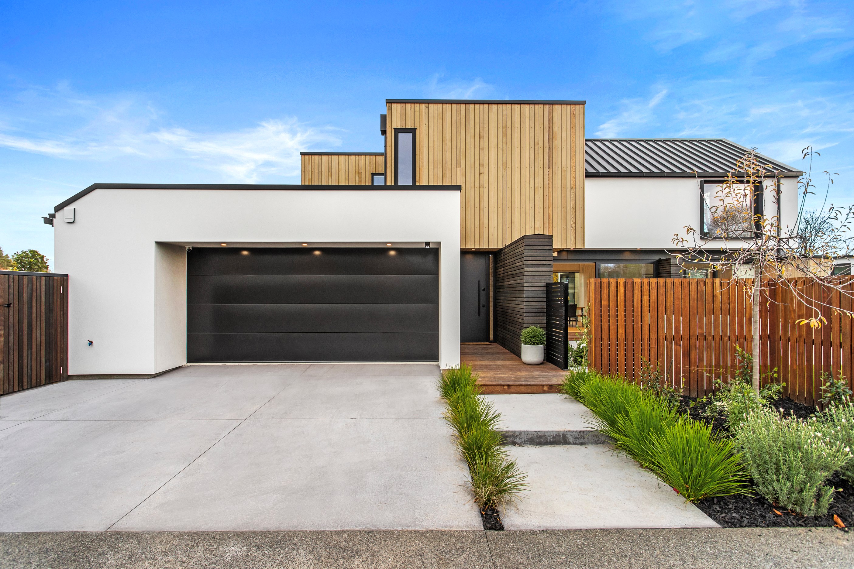 With its clever structural lines and earthy palette this architecturally designed home exudes modern elegance. The Rockcote, cedar and James Hardie Matrix exterior with Espan roof gives this home sharp style and street appeal. Enter through the front door and the open riser staircase with timber feature wall provides a warm welcome, and there are many more beautiful features to behold in this four-bedroom, three-bathroom home. The kitchen island with its sleek lines and dramatic veined white finishes makes the space perfect for entertaining. It connects seamlessly with the open dining and family areas. There’s a carpeted secondary area off the main living room for those in need of a quiet space, plus a powder room and private guest bedroom with ensuite. Upstairs, attention to detail is clear in the bathroom and ensuite off the main bedroom, with rain showers and luxe brushed metal tapware. Floor-to-ceiling glazing connects the home to the outdoor room, which features cedar walls. Further outdoors, a separate enclosed concreted barbecue space is framed with manicured lawns and timber screens, ready for parties and celebrations.