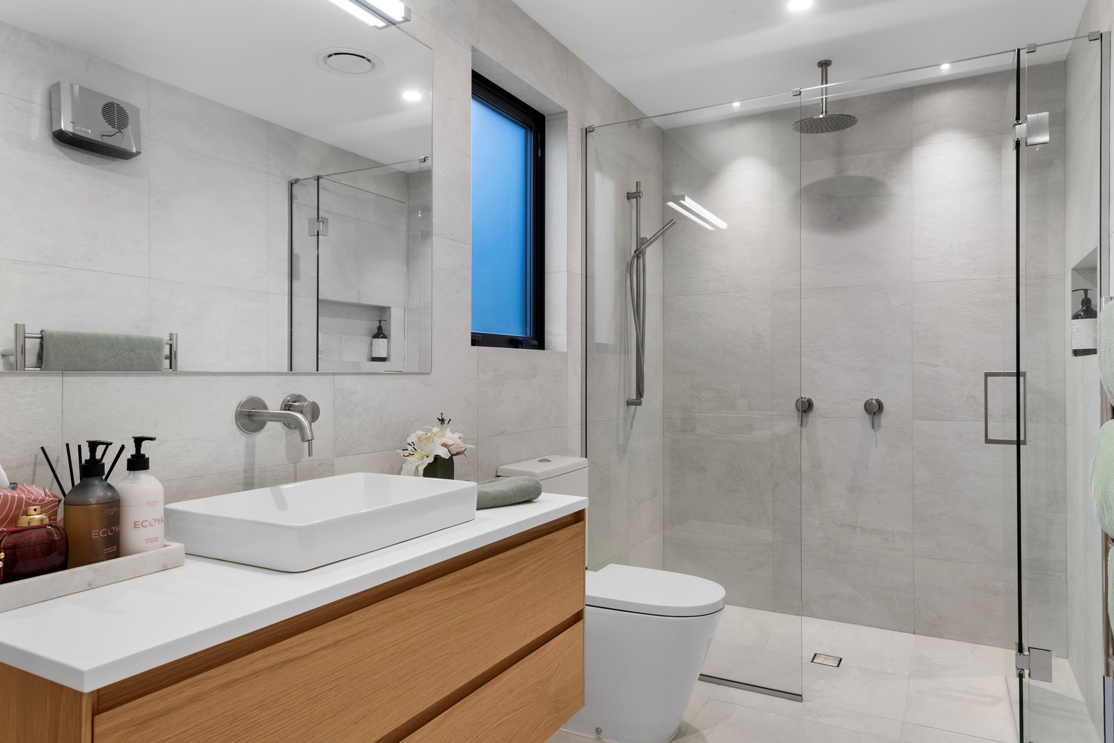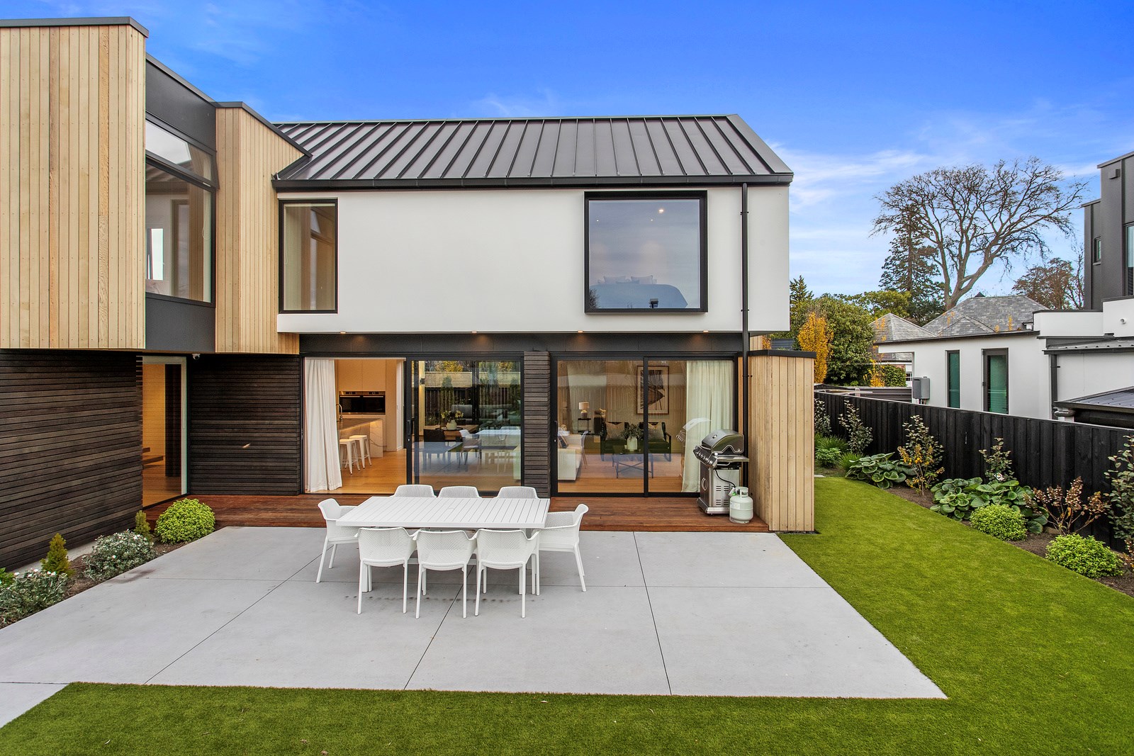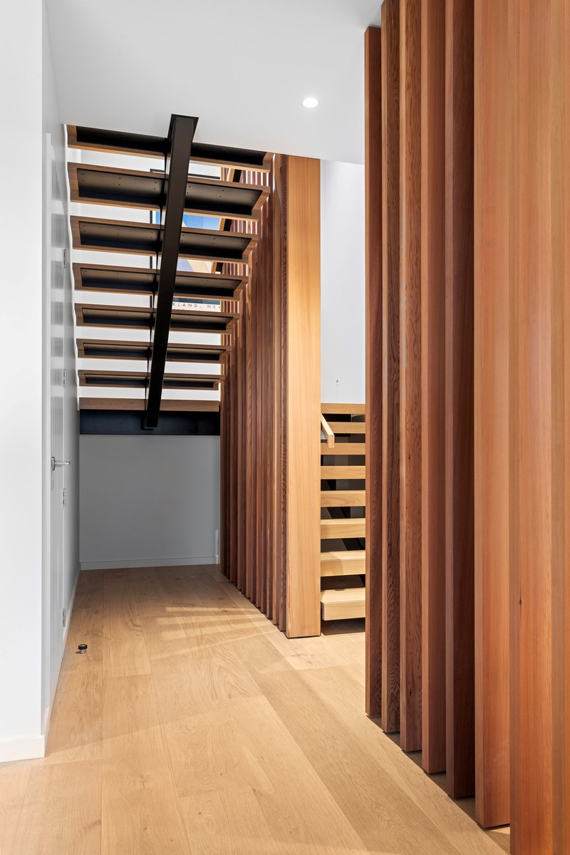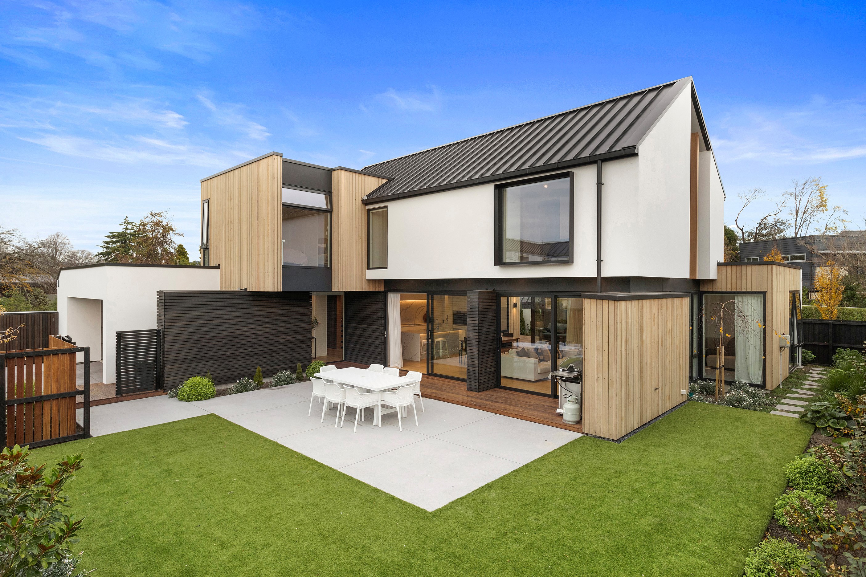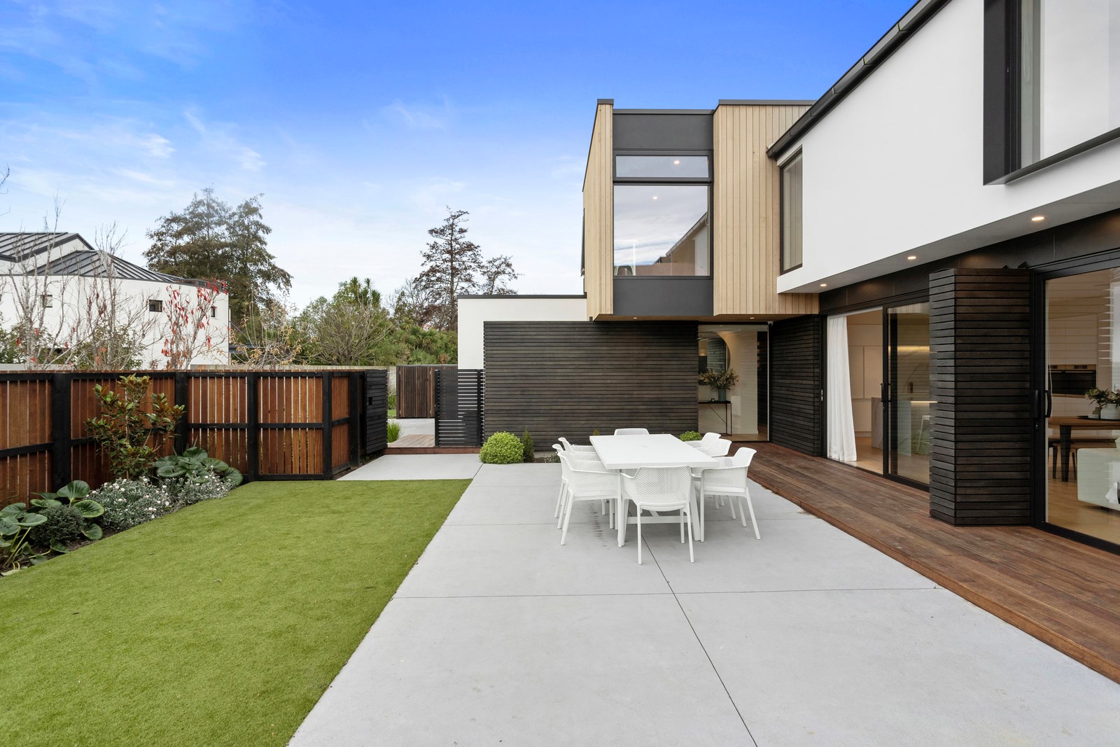 With its clever structural lines and earthy palette this architecturally designed home exudes modern elegance. The Rockcote, cedar and James Hardie Matrix exterior with Espan roof gives this home sharp style and street appeal. Enter through the front door and the open riser staircase with timber feature wall provides a warm welcome, and there are many more beautiful features to behold in this four-bedroom, three-bathroom home. The kitchen island with its sleek lines and dramatic veined white finishes makes the space perfect for entertaining. It connects seamlessly with the open dining and family areas. There’s a carpeted secondary area off the main living room for those in need of a quiet space, plus a powder room and private guest bedroom with ensuite. Upstairs, attention to detail is clear in the bathroom and ensuite off the main bedroom, with rain showers and luxe brushed metal tapware. Floor-to-ceiling glazing connects the home to the outdoor room, which features cedar walls. Further outdoors, a separate enclosed concreted barbecue space is framed with manicured lawns and timber screens, ready for parties and celebrations.
