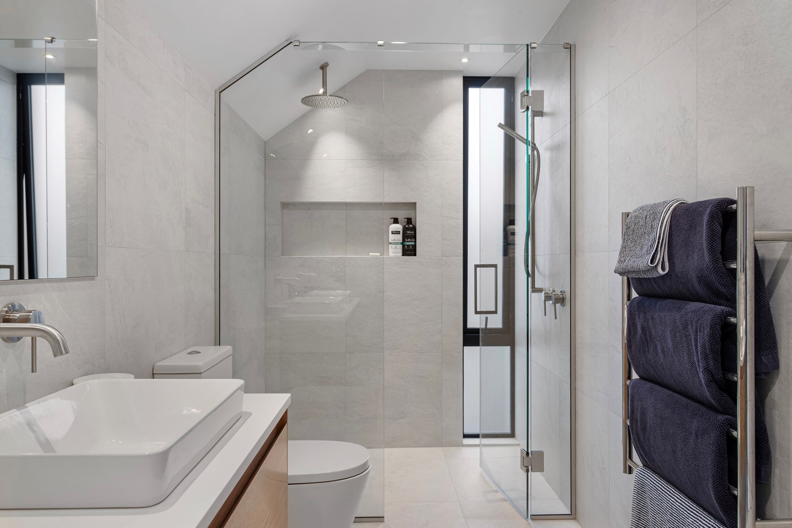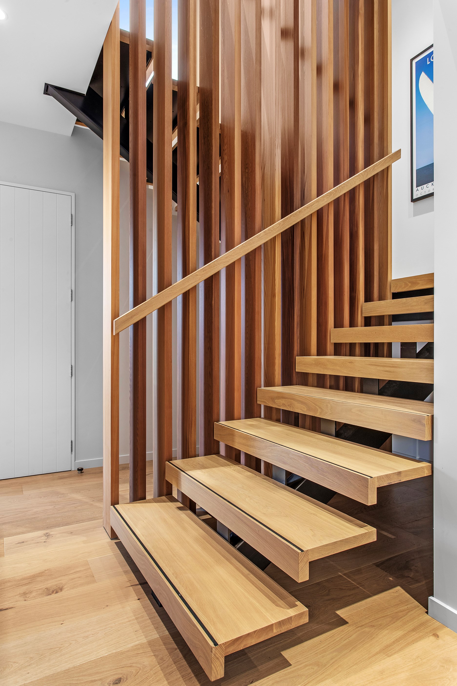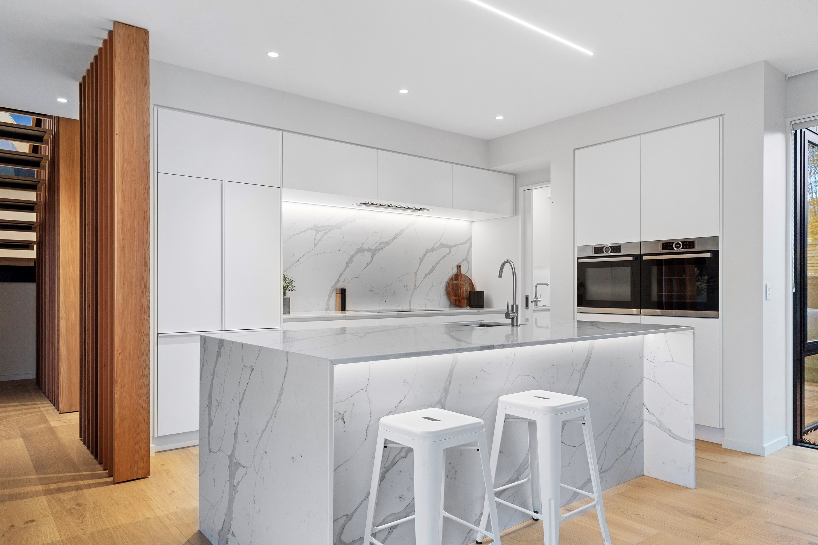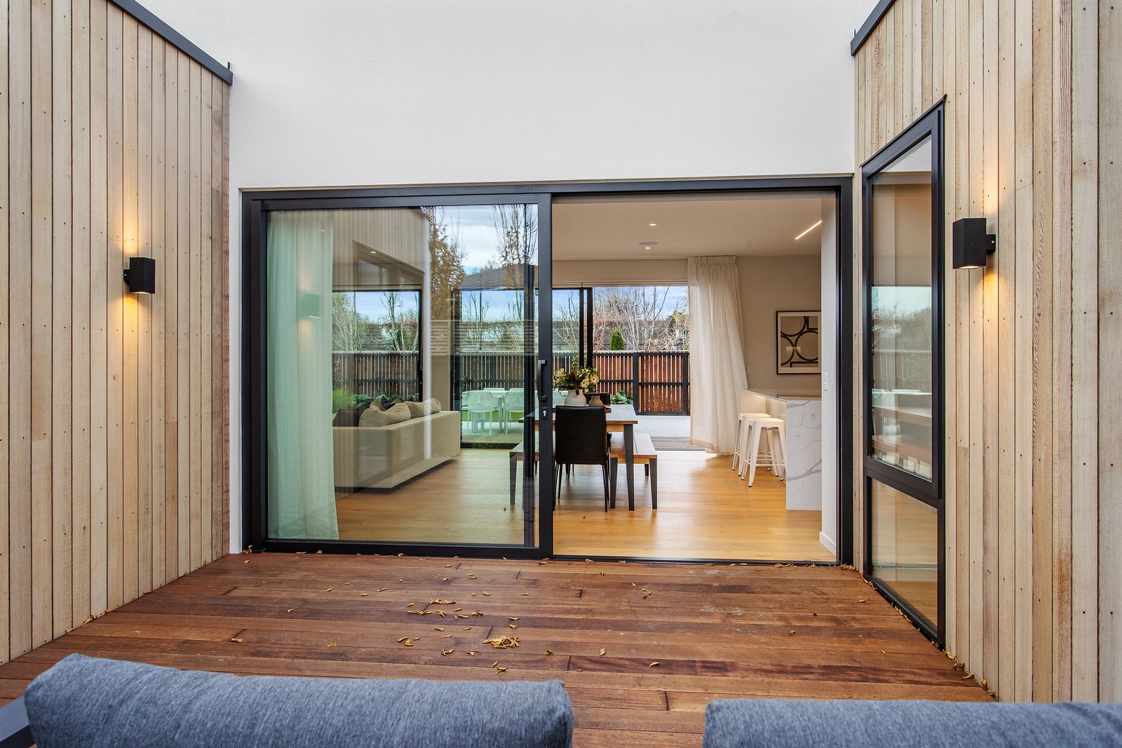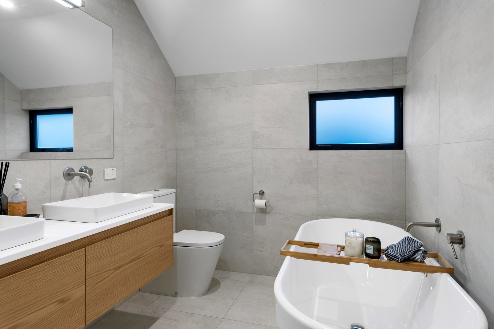With its clever structural lines and earthy palette this architecturally designed home exudes modern elegance. The Rockcote, cedar and James Hardie Matrix exterior with Espan roof gives this home sharp style and street appeal. Enter through the front door and the open riser staircase with timber feature wall provides a warm welcome, and there are many more beautiful features to behold in this four-bedroom, three-bathroom home. The kitchen island with its sleek lines and dramatic veined white finishes makes the space perfect for entertaining. It connects seamlessly with the open dining and family areas. There’s a carpeted secondary area off the main living room for those in need of a quiet space, plus a powder room and private guest bedroom with ensuite. Upstairs, attention to detail is clear in the bathroom and ensuite off the main bedroom, with rain showers and luxe brushed metal tapware. Floor-to-ceiling glazing connects the home to the outdoor room, which features cedar walls. Further outdoors, a separate enclosed concreted barbecue space is framed with manicured lawns and timber screens, ready for parties and celebrations.