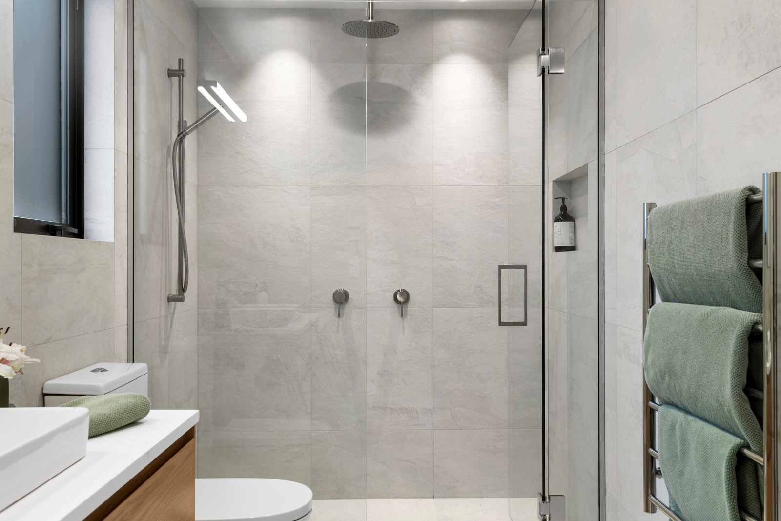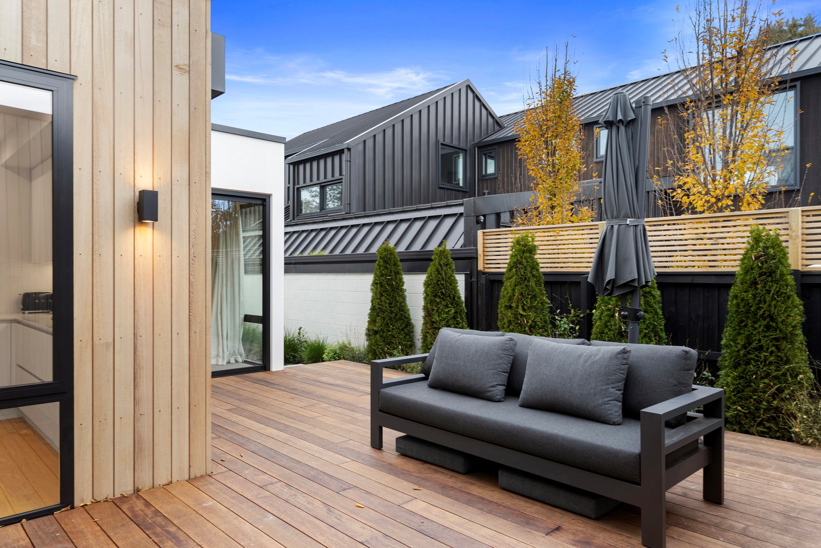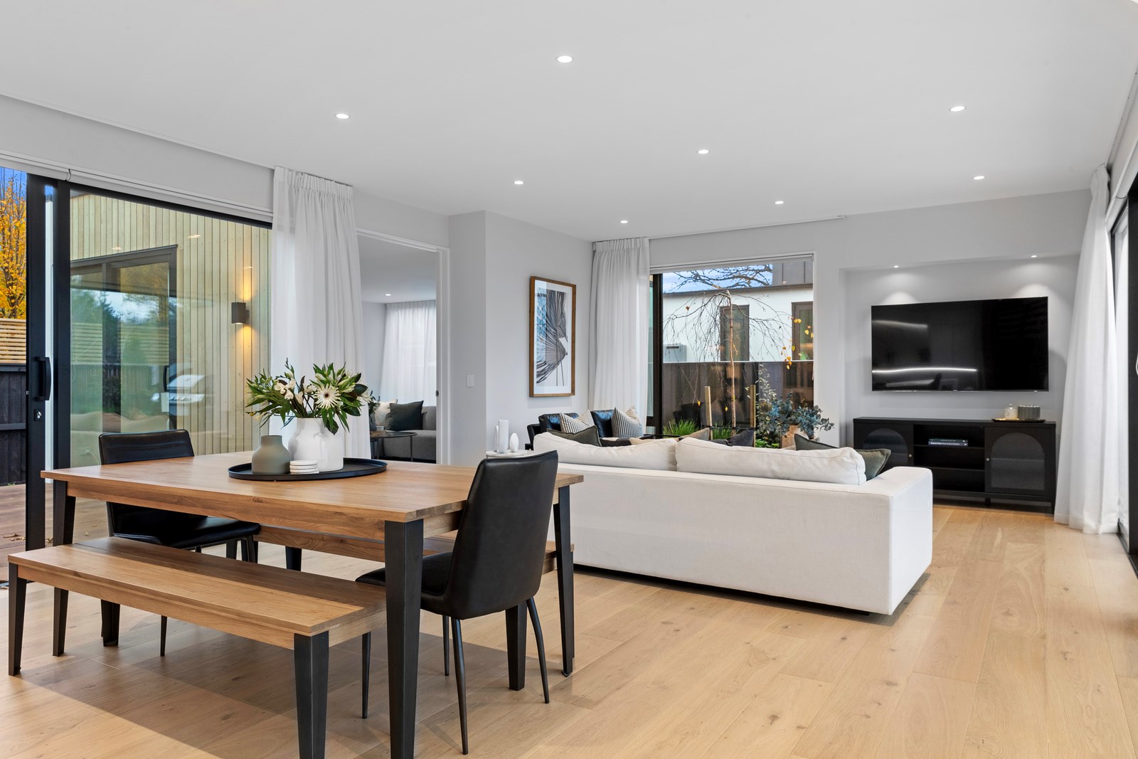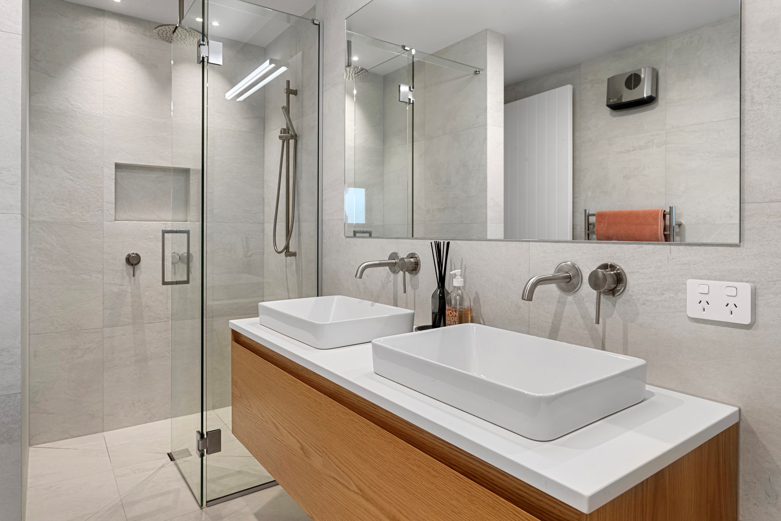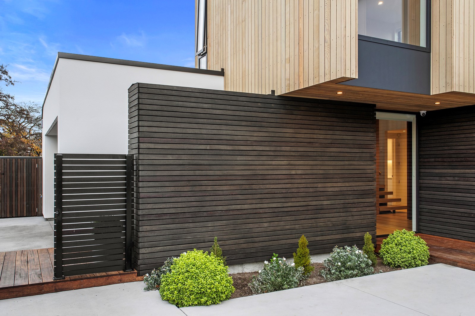 With its clever structural lines and earthy palette this architecturally designed home exudes modern elegance. The Rockcote, cedar and James Hardie Matrix exterior with Espan roof gives this home sharp style and street appeal. Enter through the front door and the open riser staircase with timber feature wall provides a warm welcome, and there are many more beautiful features to behold in this four-bedroom, three-bathroom home. The kitchen island with its sleek lines and dramatic veined white finishes makes the space perfect for entertaining. It connects seamlessly with the open dining and family areas. There’s a carpeted secondary area off the main living room for those in need of a quiet space, plus a powder room and private guest bedroom with ensuite. Upstairs, attention to detail is clear in the bathroom and ensuite off the main bedroom, with rain showers and luxe brushed metal tapware. Floor-to-ceiling glazing connects the home to the outdoor room, which features cedar walls. Further outdoors, a separate enclosed concreted barbecue space is framed with manicured lawns and timber screens, ready for parties and celebrations.