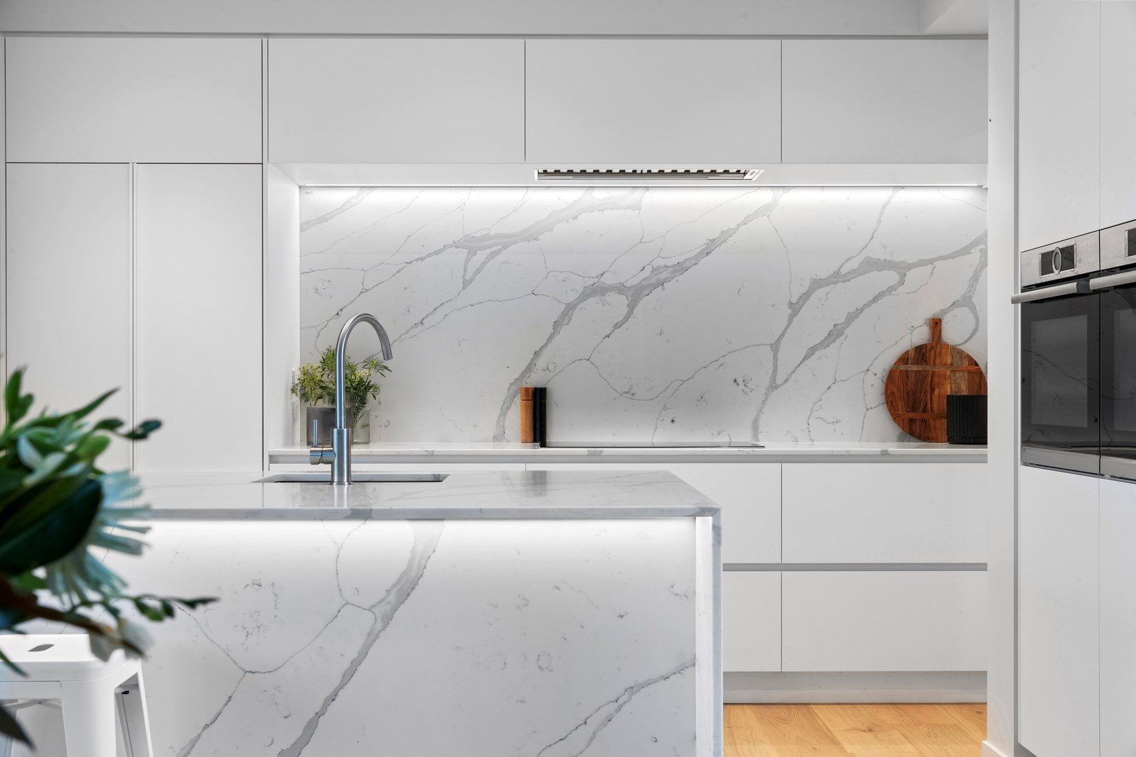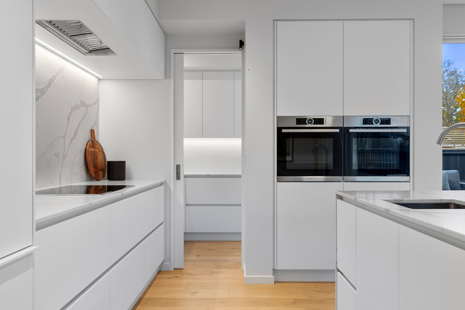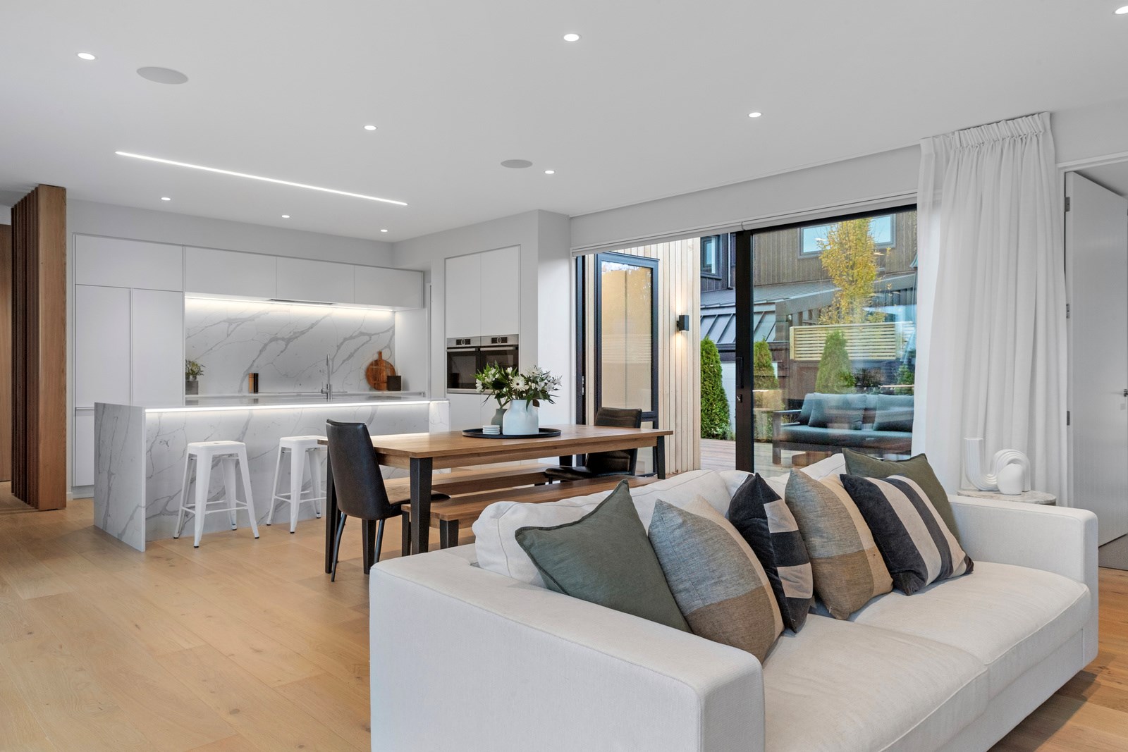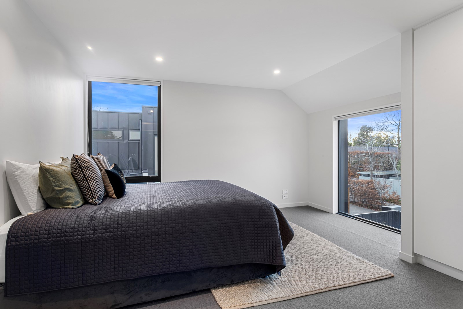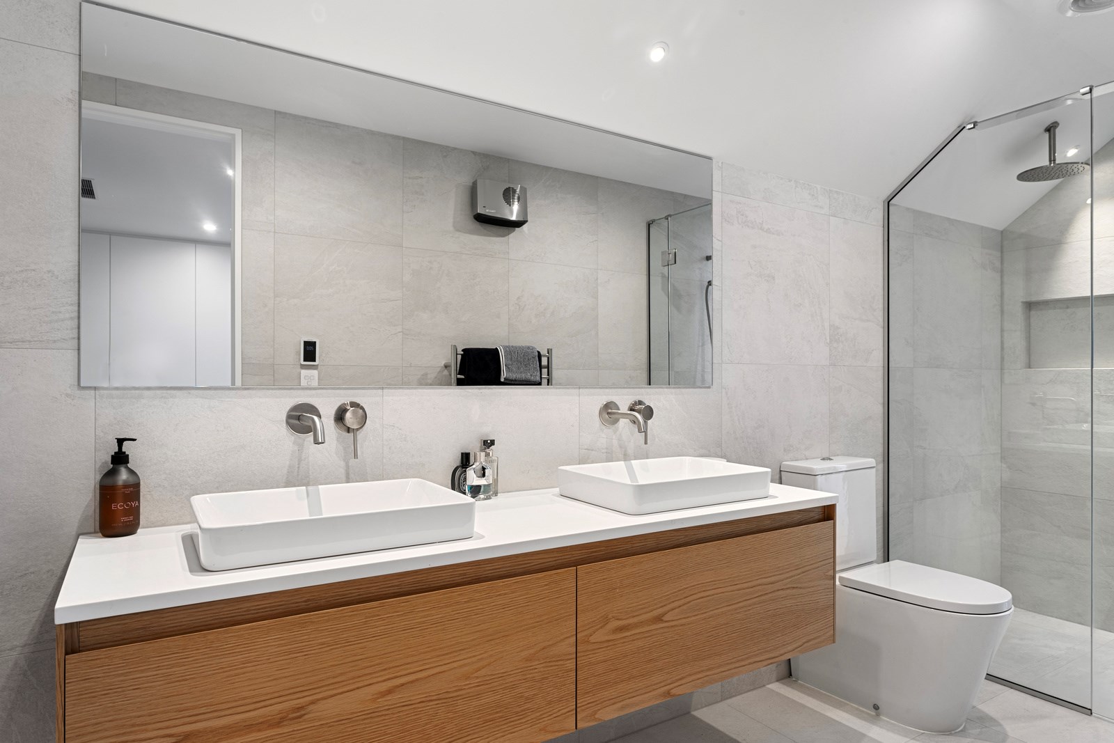 With its clever structural lines and earthy palette this architecturally designed home exudes modern elegance. The Rockcote, cedar and James Hardie Matrix exterior with Espan roof gives this home sharp style and street appeal. Enter through the front door and the open riser staircase with timber feature wall provides a warm welcome, and there are many more beautiful features to behold in this four-bedroom, three-bathroom home. The kitchen island with its sleek lines and dramatic veined white finishes makes the space perfect for entertaining. It connects seamlessly with the open dining and family areas. There’s a carpeted secondary area off the main living room for those in need of a quiet space, plus a powder room and private guest bedroom with ensuite. Upstairs, attention to detail is clear in the bathroom and ensuite off the main bedroom, with rain showers and luxe brushed metal tapware. Floor-to-ceiling glazing connects the home to the outdoor room, which features cedar walls. Further outdoors, a separate enclosed concreted barbecue space is framed with manicured lawns and timber screens, ready for parties and celebrations.