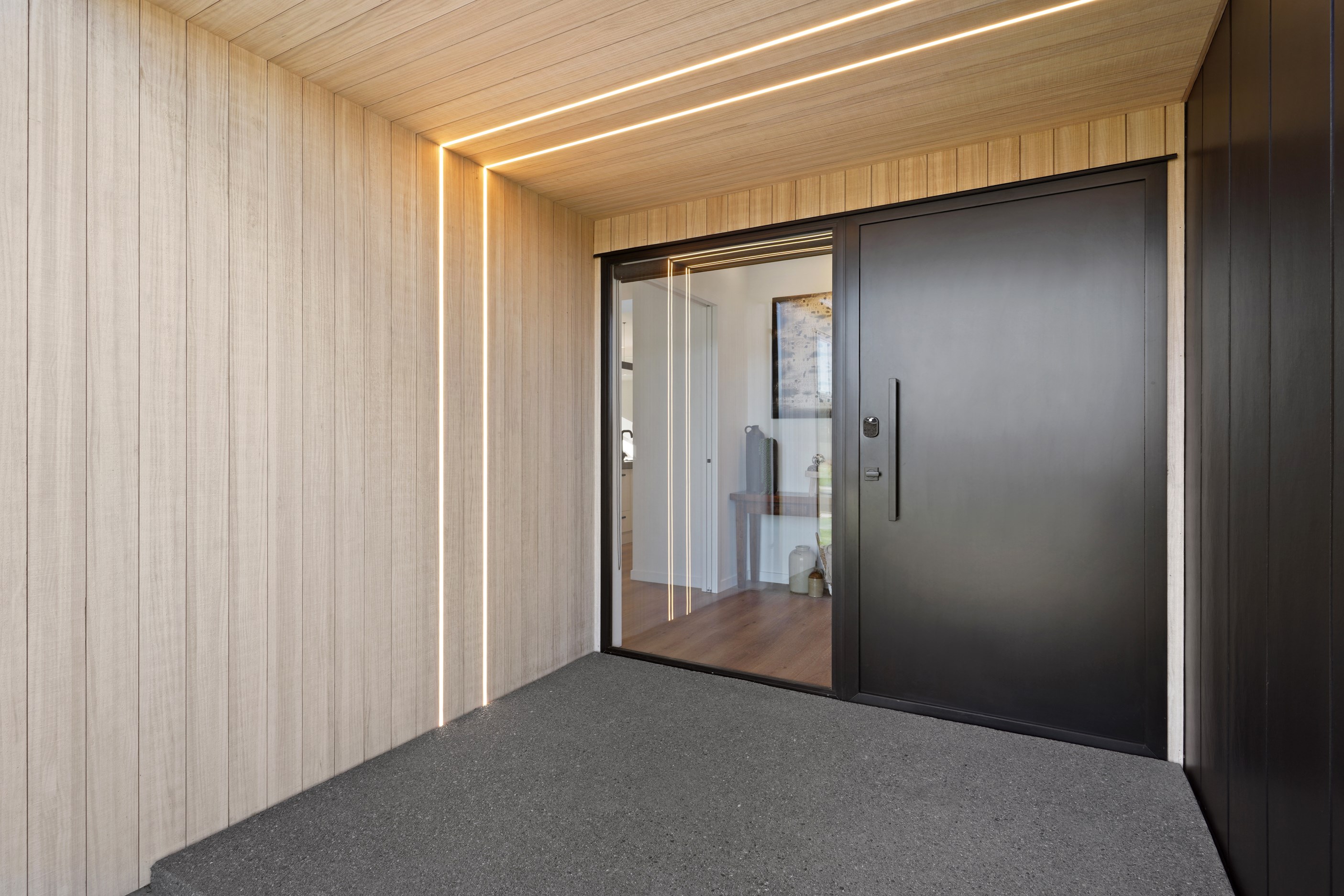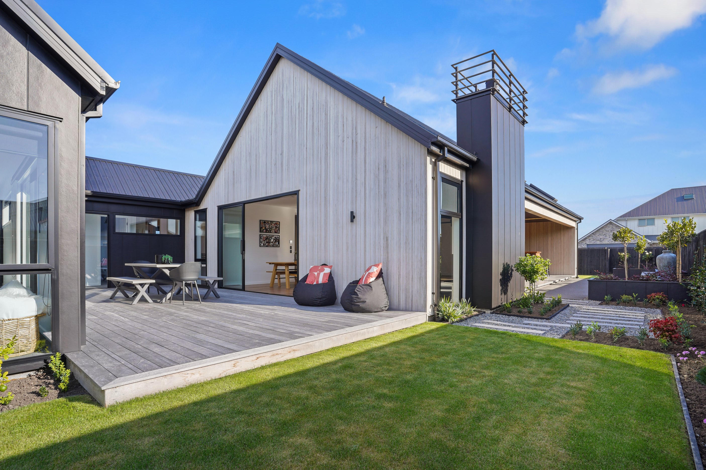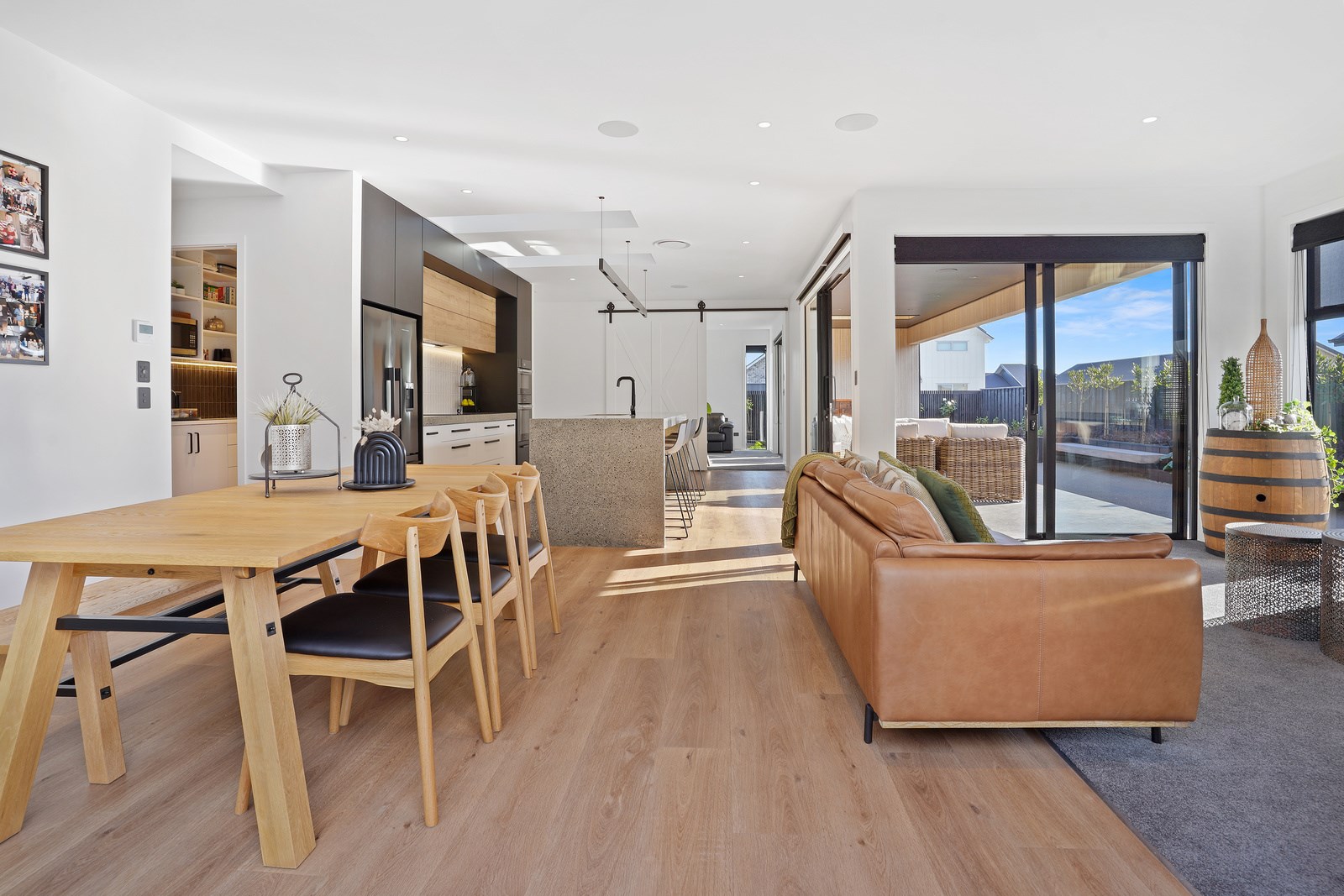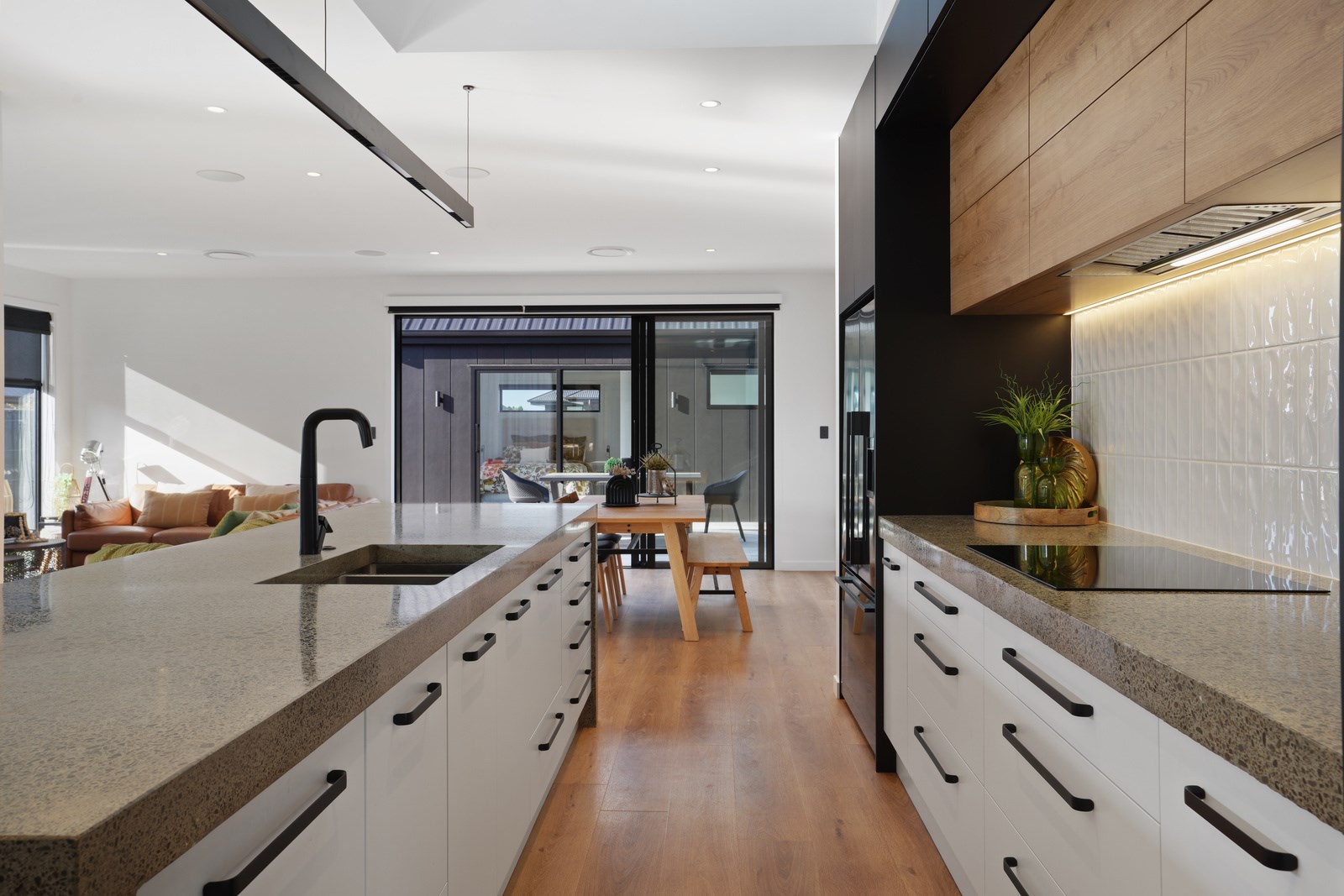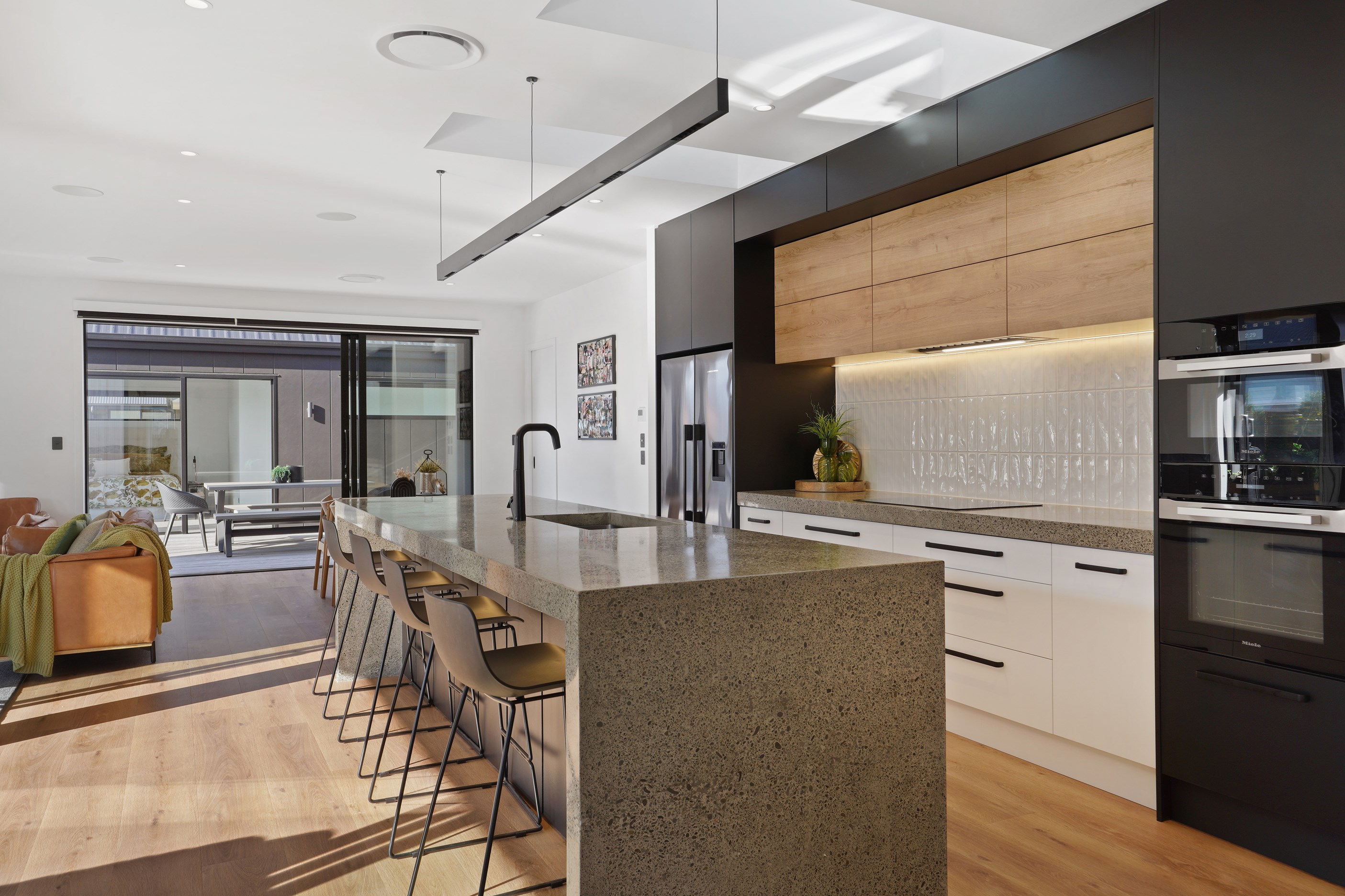 The contrast and symmetry on the exterior of this 292sqm pavilion-style home indicate that something special is in store. With shades of dark and light cladding, side-by-side gables and stylishly lit central entranceway, it’s sleek and unique. Light and space were clearly top of mind in this three-bedroom, two-bathroom home, featuring overheight ceilings, generous windows and skylights used to their best advantage. The living area is all about home comforts with poured and placed polished concrete benches, a long galley pantry and a built-in beverage centre — cheers to that! A large barn slider leads to a separate lounge providing private space, if needed. A gas fire, two ducted heat pumps and under-tile heating keep the entire area warm and cosy on cold winter nights. All the details have been thought through. The bathrooms are well appointed with smart tiles and recessed shelves, and an extra-large garage with attic storage will help keep this home clean and clear. Three sets of sliding doors open onto the covered 27sqm outdoor room ideal for watching the kids or unwinding with a refreshment.