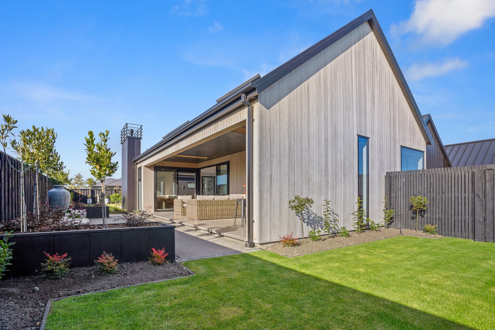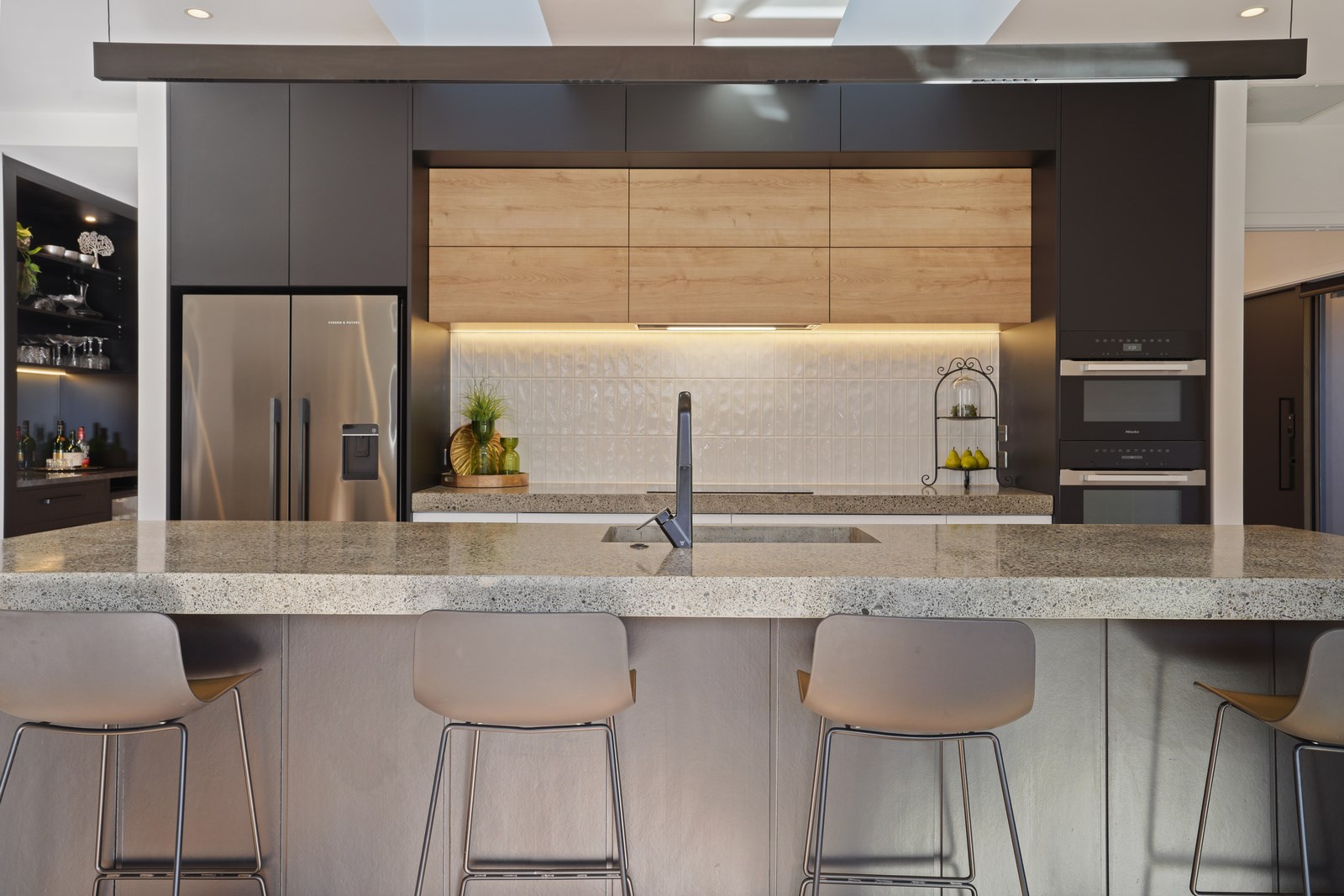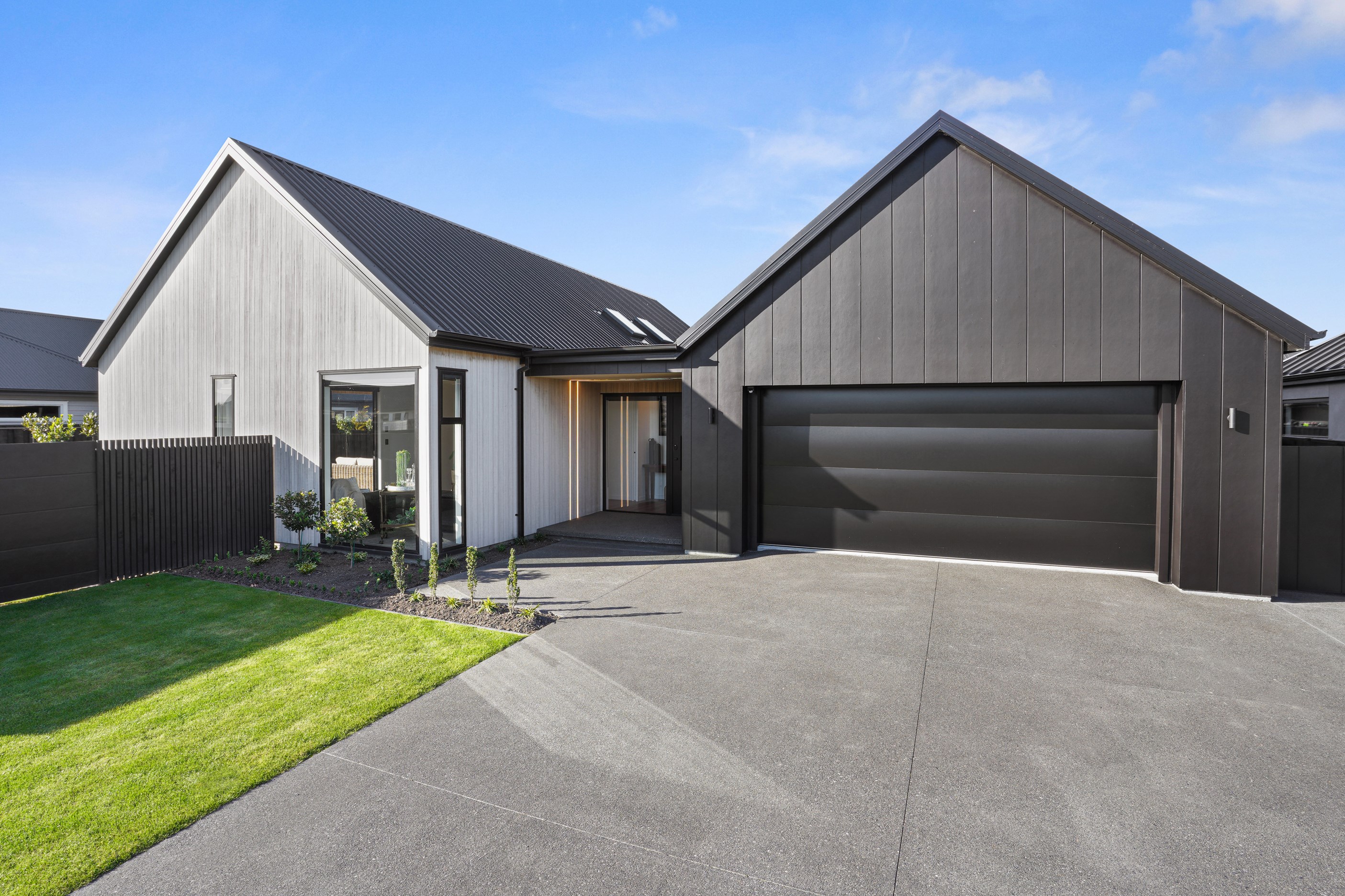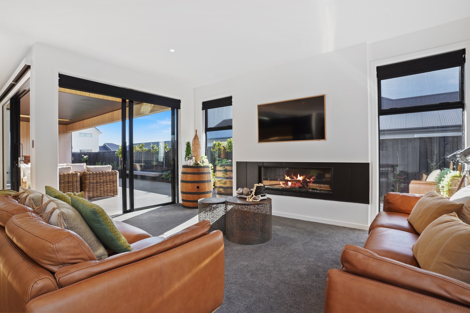 The contrast and symmetry on the exterior of this 292sqm pavilion-style home indicate that something special is in store. With shades of dark and light cladding, side-by-side gables and stylishly lit central entranceway, it’s sleek and unique. Light and space were clearly top of mind in this three-bedroom, two-bathroom home, featuring overheight ceilings, generous windows and skylights used to their best advantage. The living area is all about home comforts with poured and placed polished concrete benches, a long galley pantry and a built-in beverage centre — cheers to that! A large barn slider leads to a separate lounge providing private space, if needed. A gas fire, two ducted heat pumps and under-tile heating keep the entire area warm and cosy on cold winter nights. All the details have been thought through. The bathrooms are well appointed with smart tiles and recessed shelves, and an extra-large garage with attic storage will help keep this home clean and clear. Three sets of sliding doors open onto the covered 27sqm outdoor room ideal for watching the kids or unwinding with a refreshment.