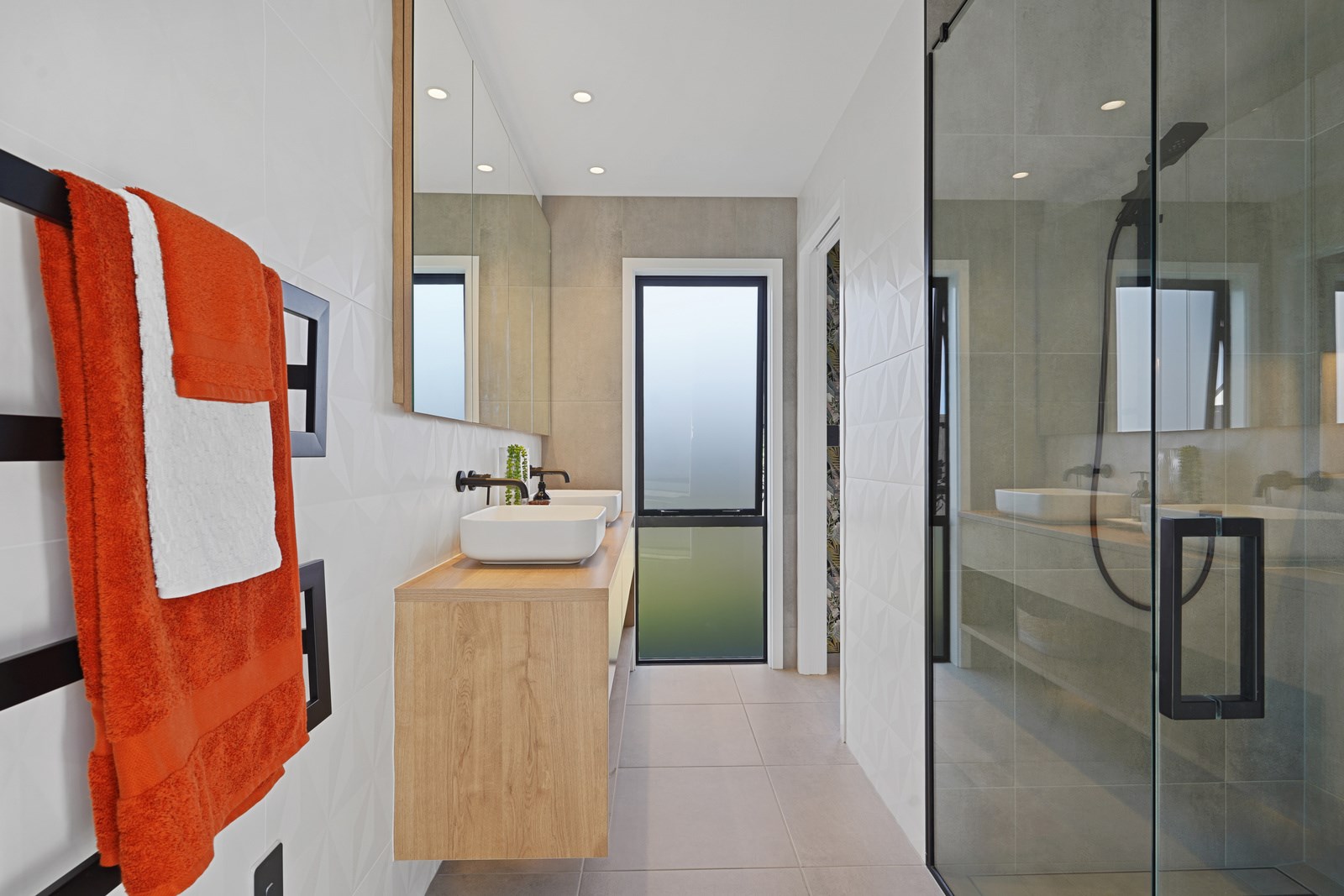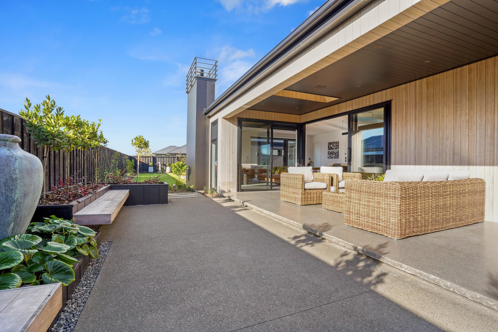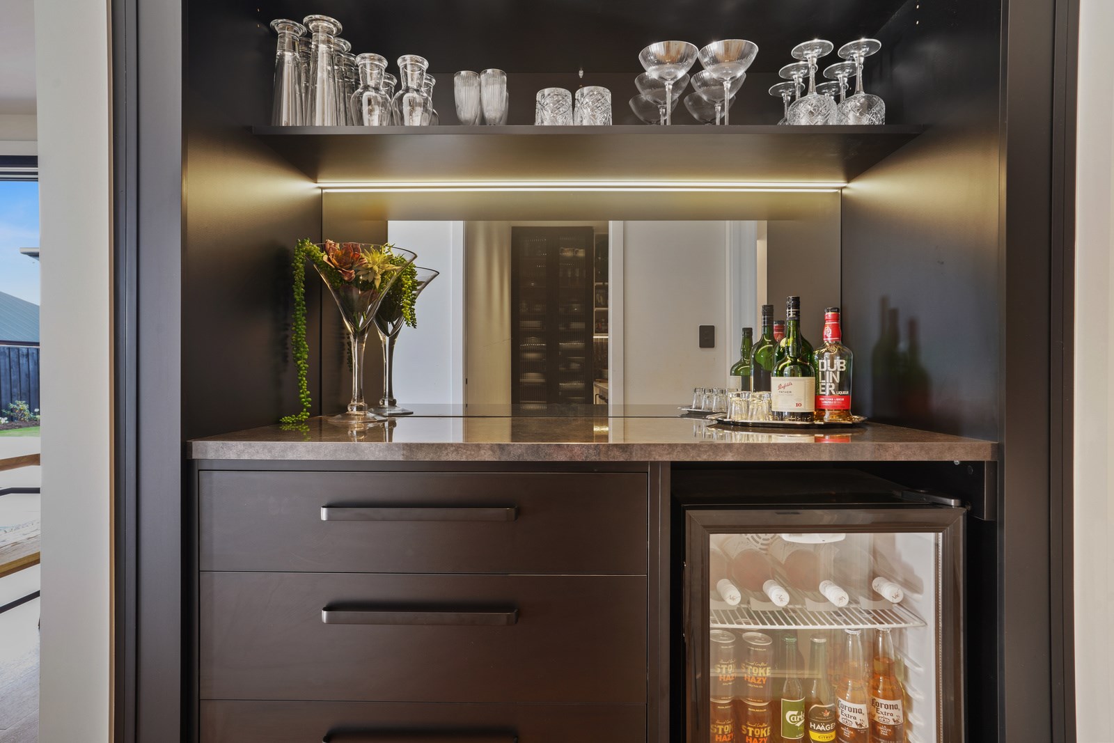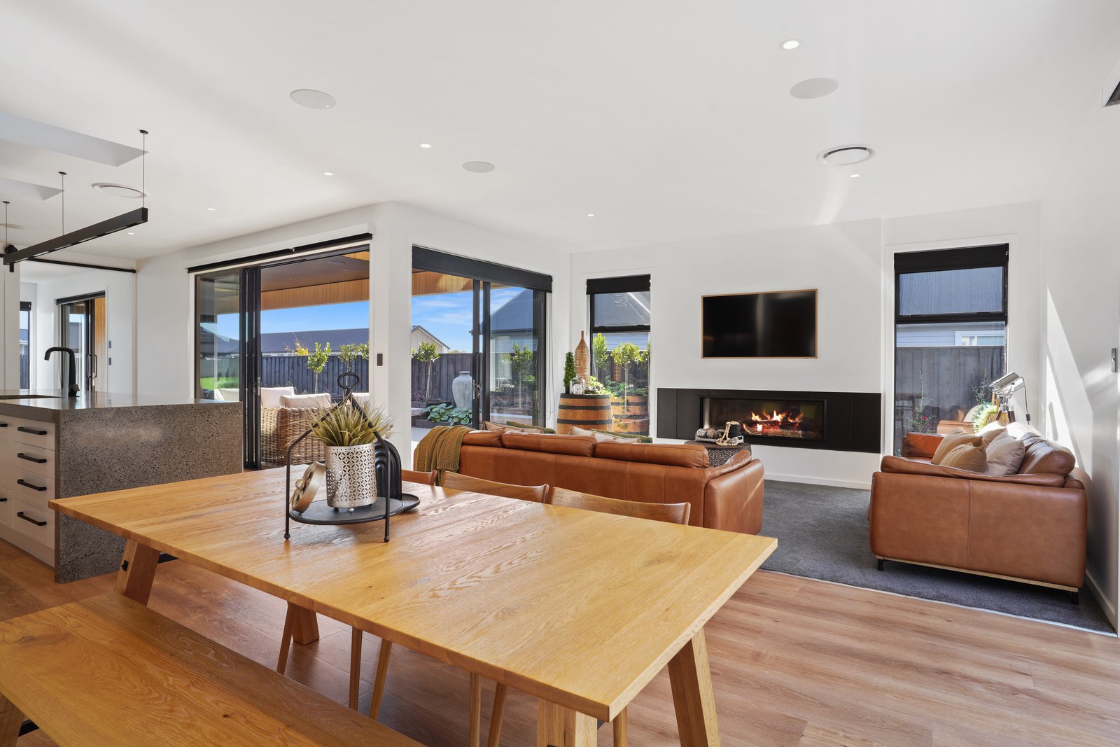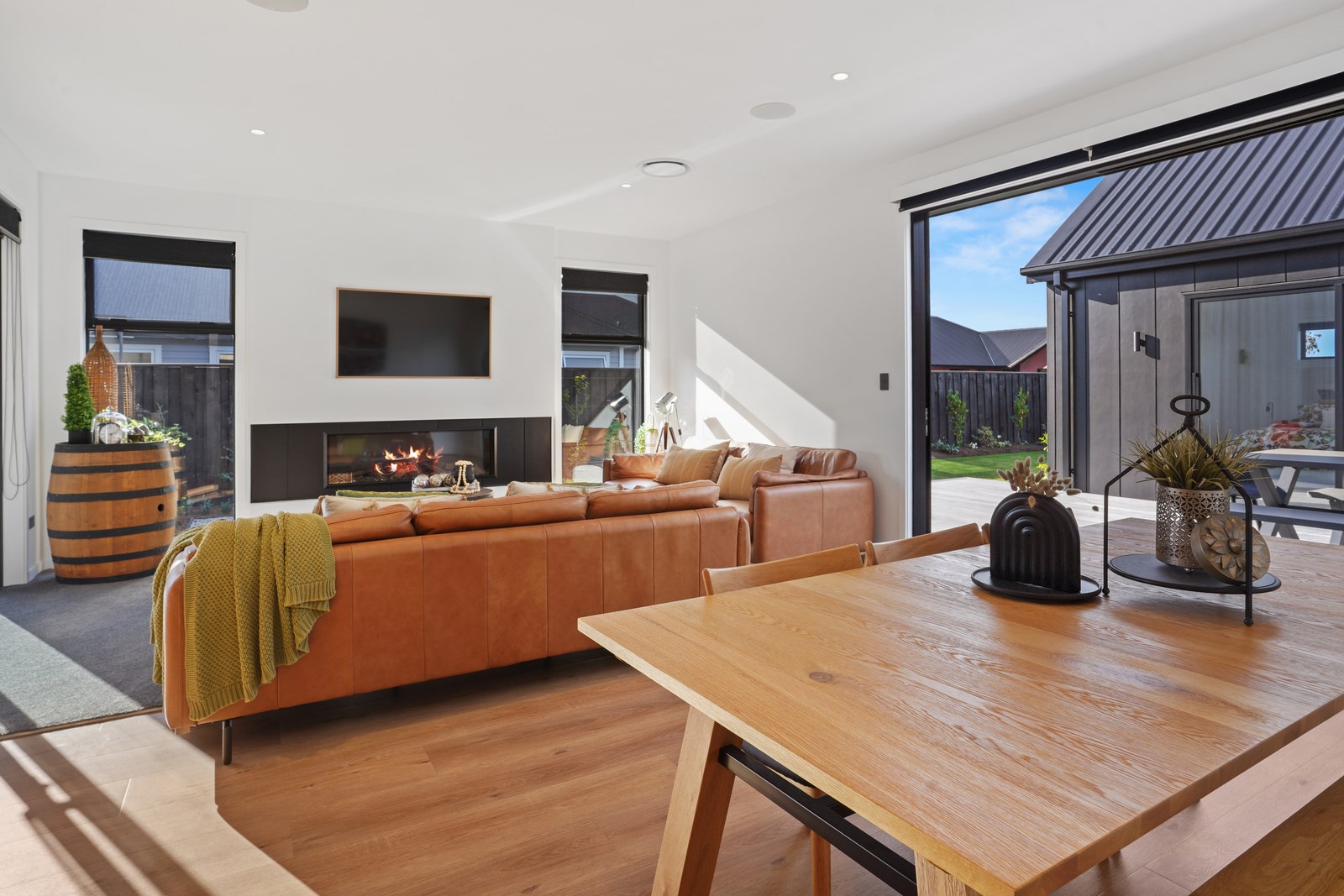 The contrast and symmetry on the exterior of this 292sqm pavilion-style home indicate that something special is in store. With shades of dark and light cladding, side-by-side gables and stylishly lit central entranceway, it’s sleek and unique. Light and space were clearly top of mind in this three-bedroom, two-bathroom home, featuring overheight ceilings, generous windows and skylights used to their best advantage. The living area is all about home comforts with poured and placed polished concrete benches, a long galley pantry and a built-in beverage centre — cheers to that! A large barn slider leads to a separate lounge providing private space, if needed. A gas fire, two ducted heat pumps and under-tile heating keep the entire area warm and cosy on cold winter nights. All the details have been thought through. The bathrooms are well appointed with smart tiles and recessed shelves, and an extra-large garage with attic storage will help keep this home clean and clear. Three sets of sliding doors open onto the covered 27sqm outdoor room ideal for watching the kids or unwinding with a refreshment.