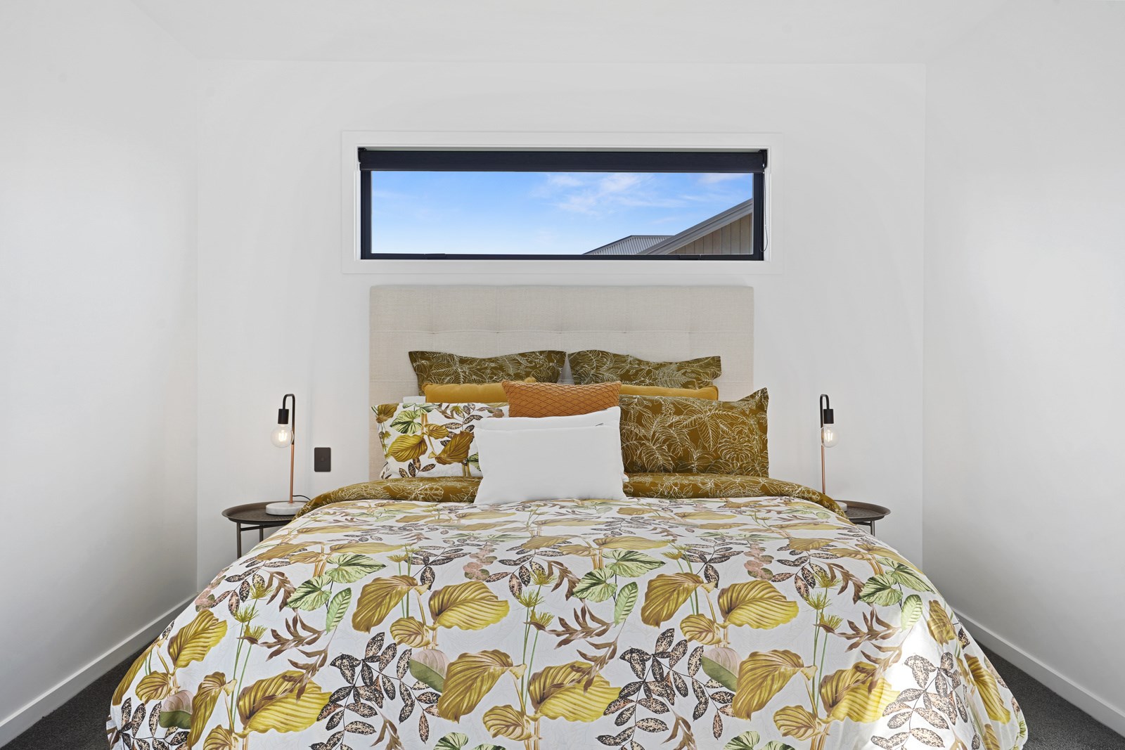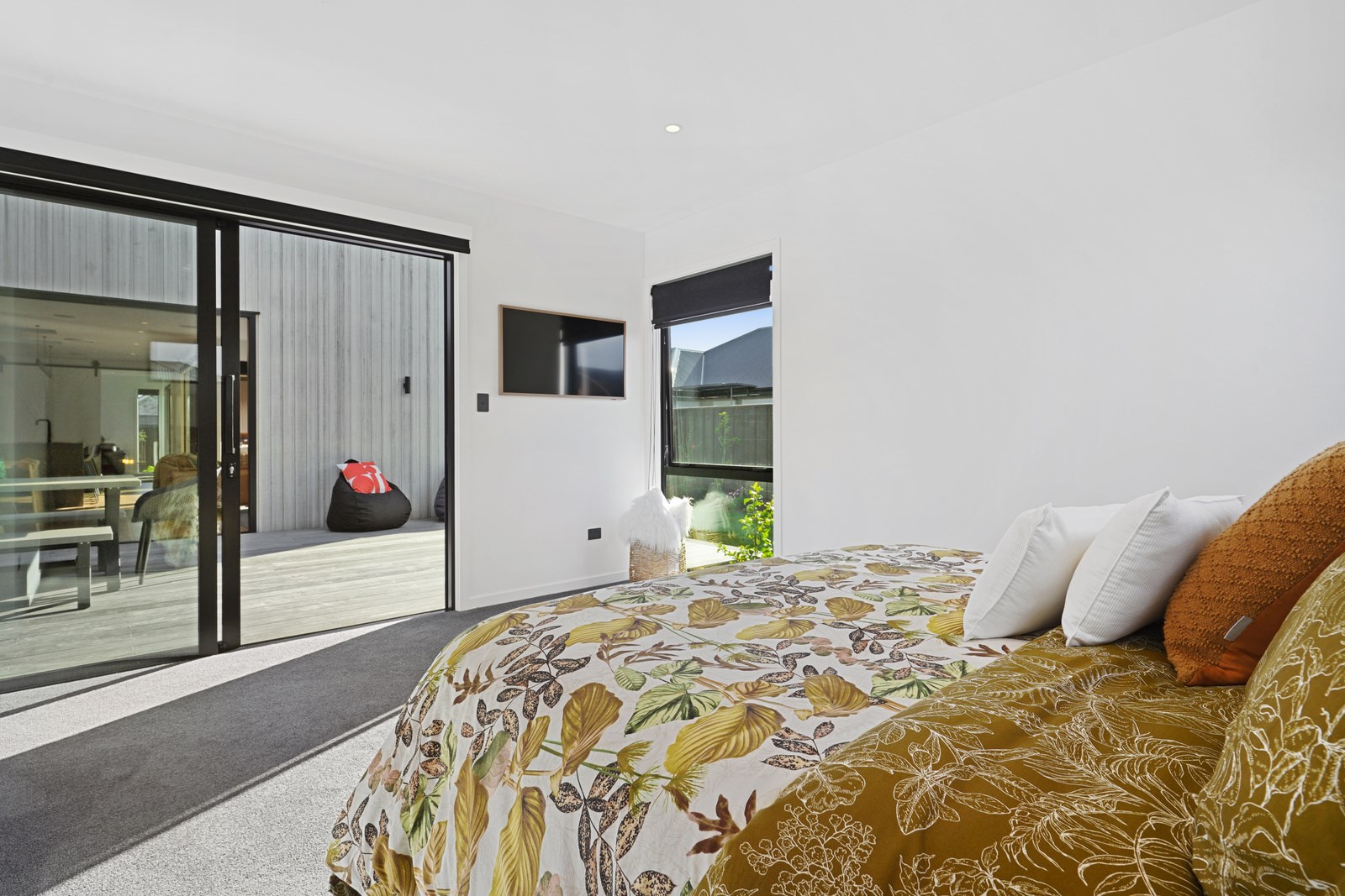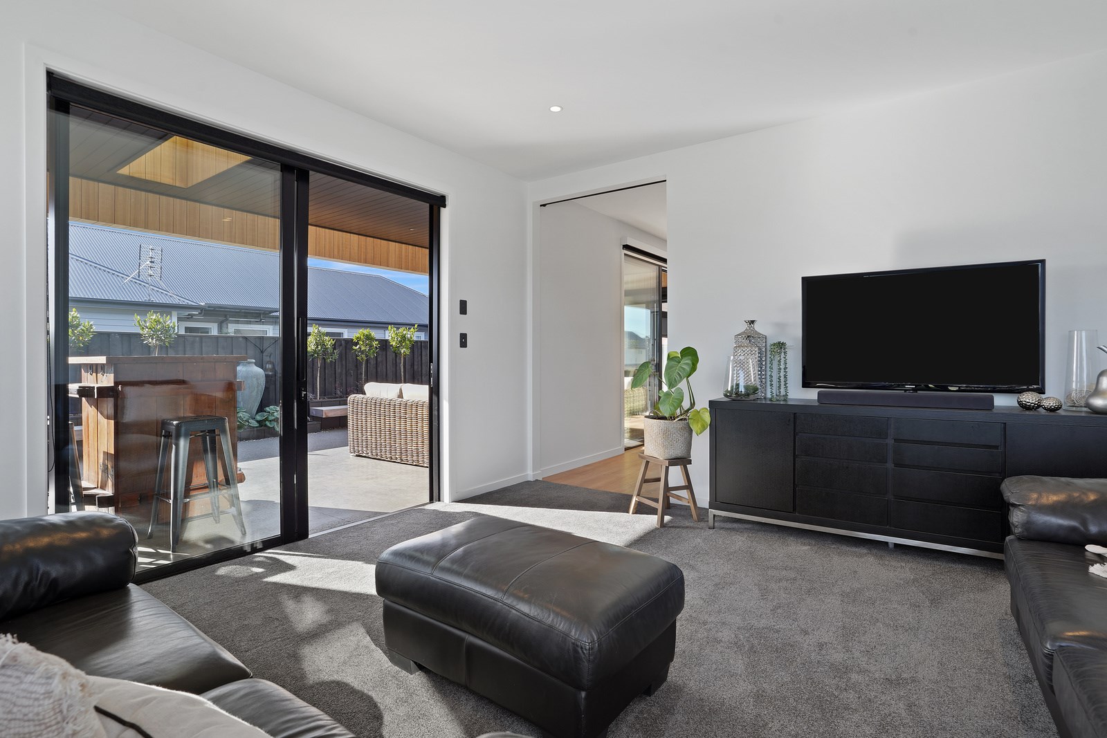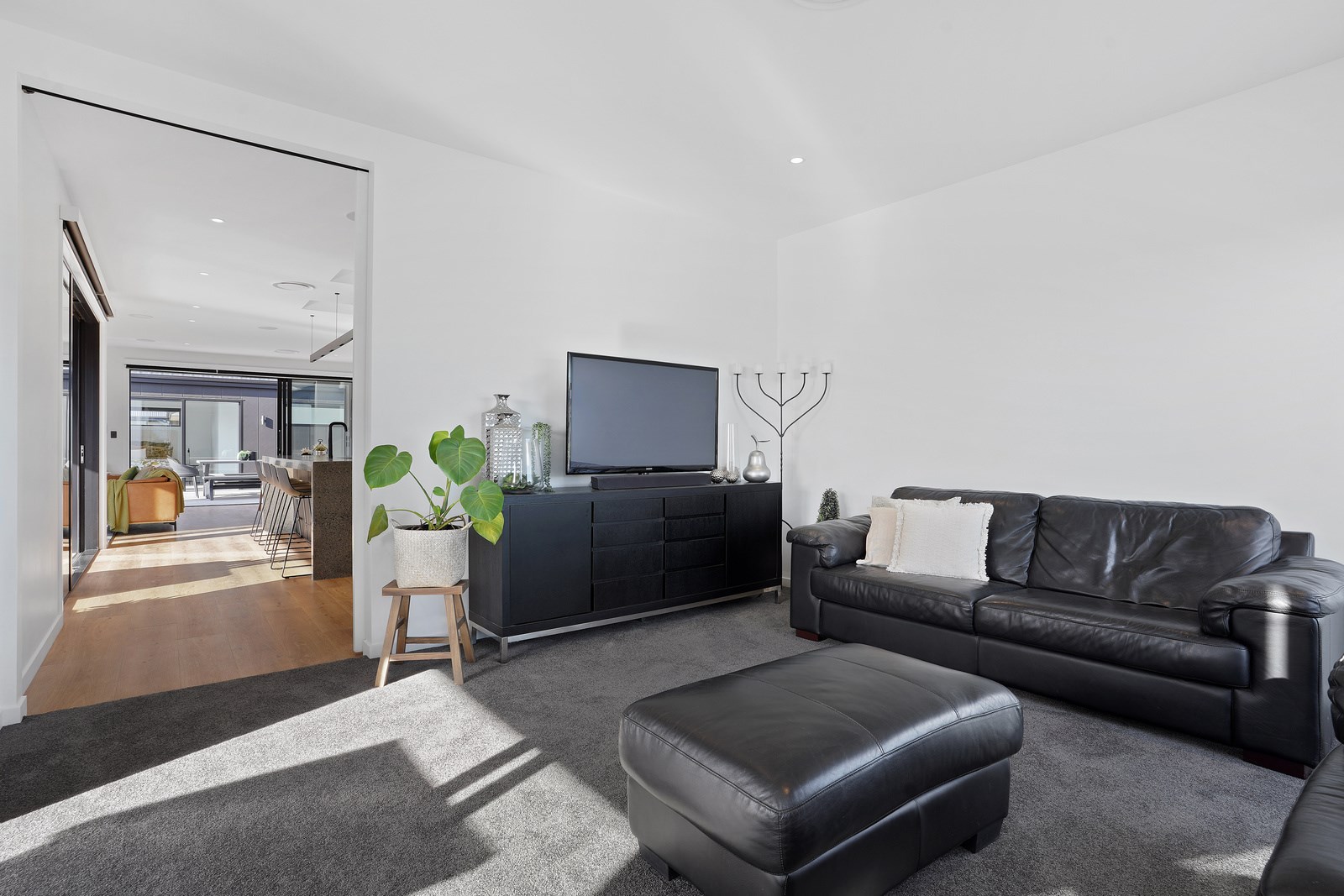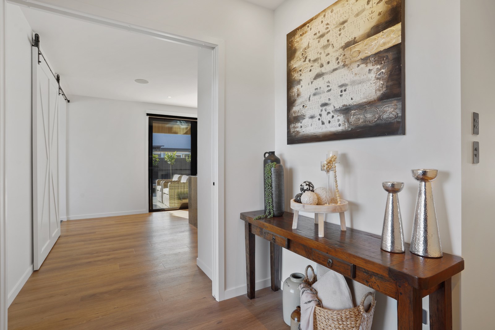 The contrast and symmetry on the exterior of this 292sqm pavilion-style home indicate that something special is in store. With shades of dark and light cladding, side-by-side gables and stylishly lit central entranceway, it’s sleek and unique. Light and space were clearly top of mind in this three-bedroom, two-bathroom home, featuring overheight ceilings, generous windows and skylights used to their best advantage. The living area is all about home comforts with poured and placed polished concrete benches, a long galley pantry and a built-in beverage centre — cheers to that! A large barn slider leads to a separate lounge providing private space, if needed. A gas fire, two ducted heat pumps and under-tile heating keep the entire area warm and cosy on cold winter nights. All the details have been thought through. The bathrooms are well appointed with smart tiles and recessed shelves, and an extra-large garage with attic storage will help keep this home clean and clear. Three sets of sliding doors open onto the covered 27sqm outdoor room ideal for watching the kids or unwinding with a refreshment.