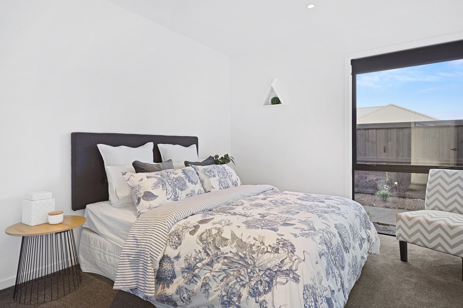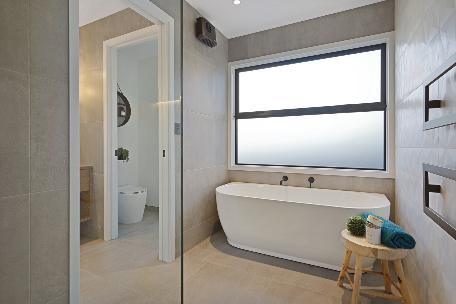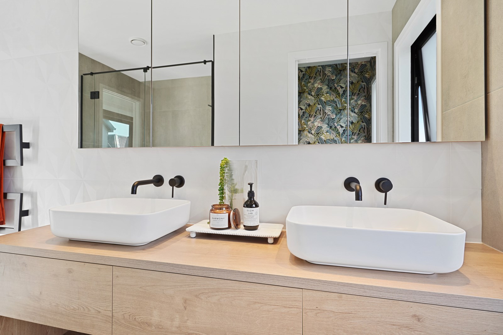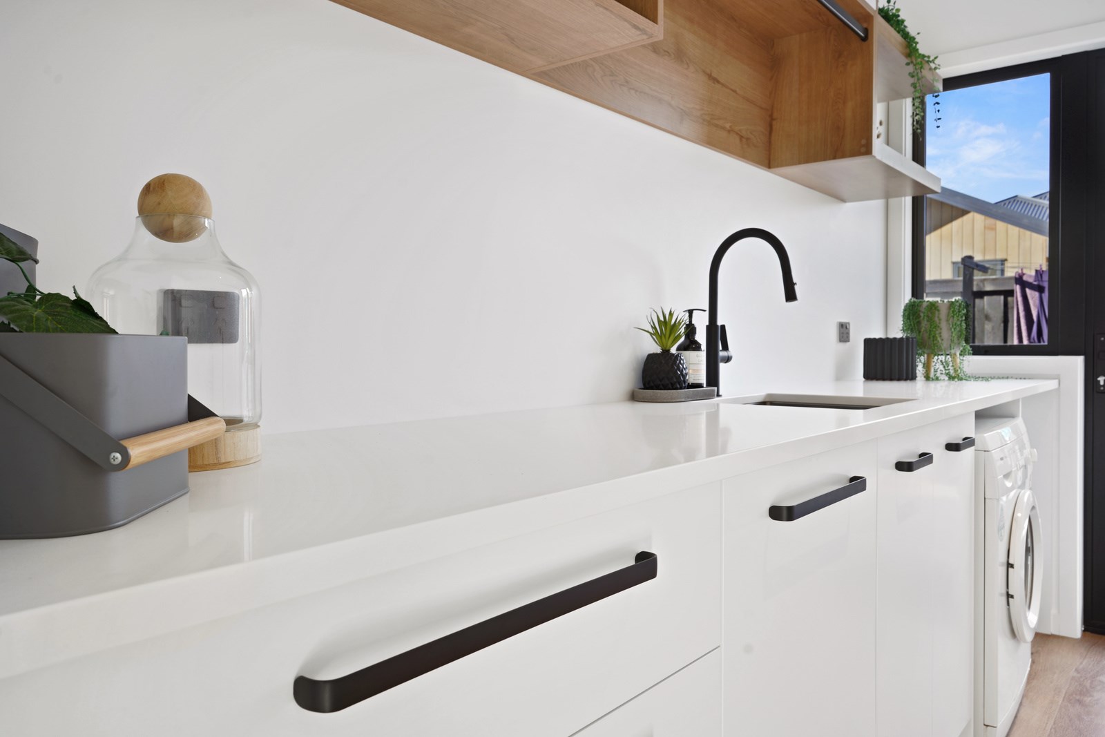 The contrast and symmetry on the exterior of this 292sqm pavilion-style home indicate that something special is in store. With shades of dark and light cladding, side-by-side gables and stylishly lit central entranceway, it’s sleek and unique. Light and space were clearly top of mind in this three-bedroom, two-bathroom home, featuring overheight ceilings, generous windows and skylights used to their best advantage. The living area is all about home comforts with poured and placed polished concrete benches, a long galley pantry and a built-in beverage centre — cheers to that! A large barn slider leads to a separate lounge providing private space, if needed. A gas fire, two ducted heat pumps and under-tile heating keep the entire area warm and cosy on cold winter nights. All the details have been thought through. The bathrooms are well appointed with smart tiles and recessed shelves, and an extra-large garage with attic storage will help keep this home clean and clear. Three sets of sliding doors open onto the covered 27sqm outdoor room ideal for watching the kids or unwinding with a refreshment.