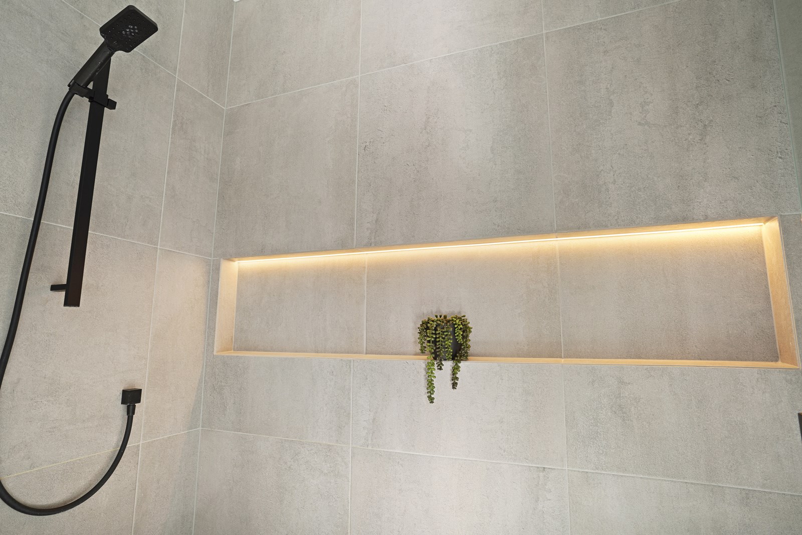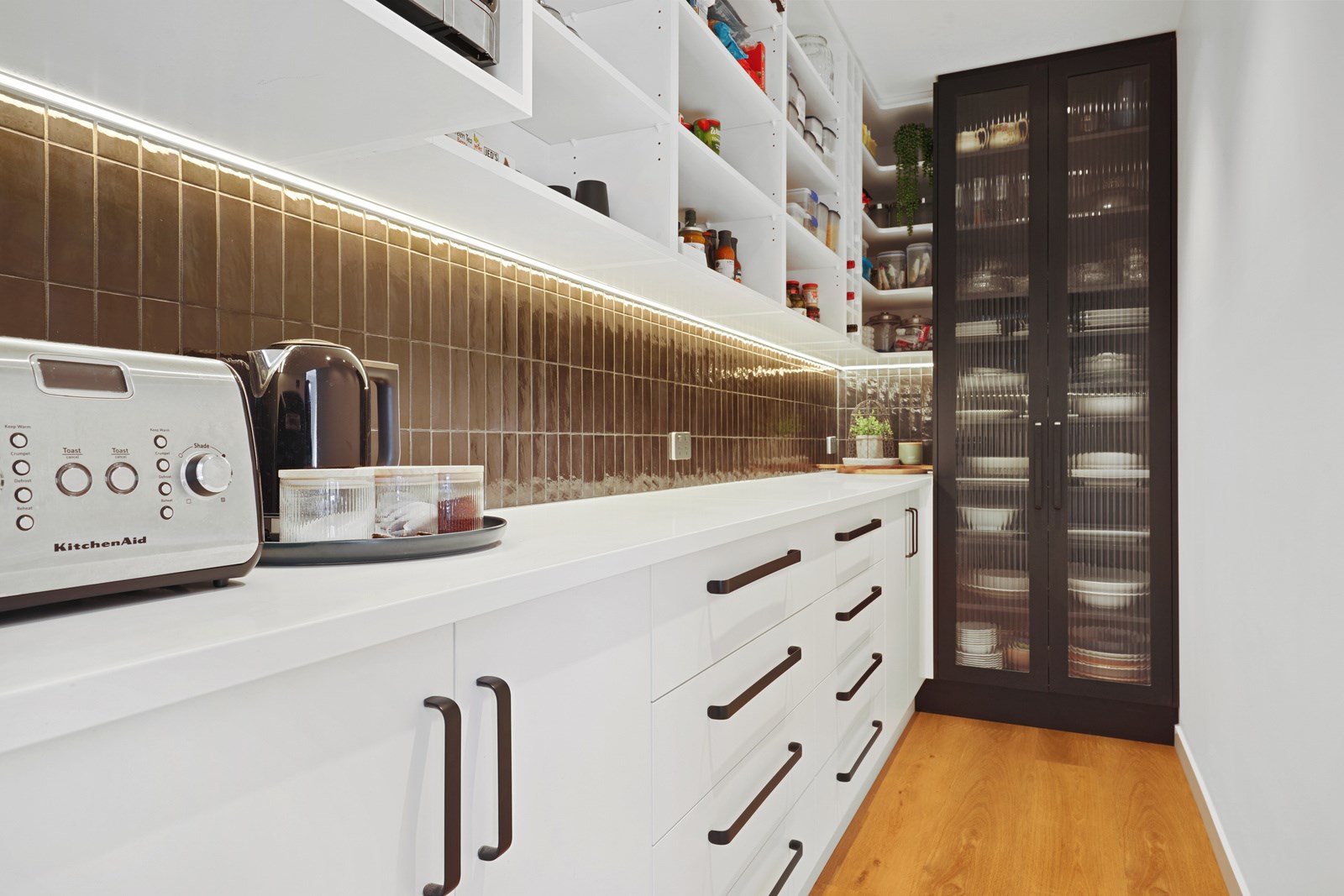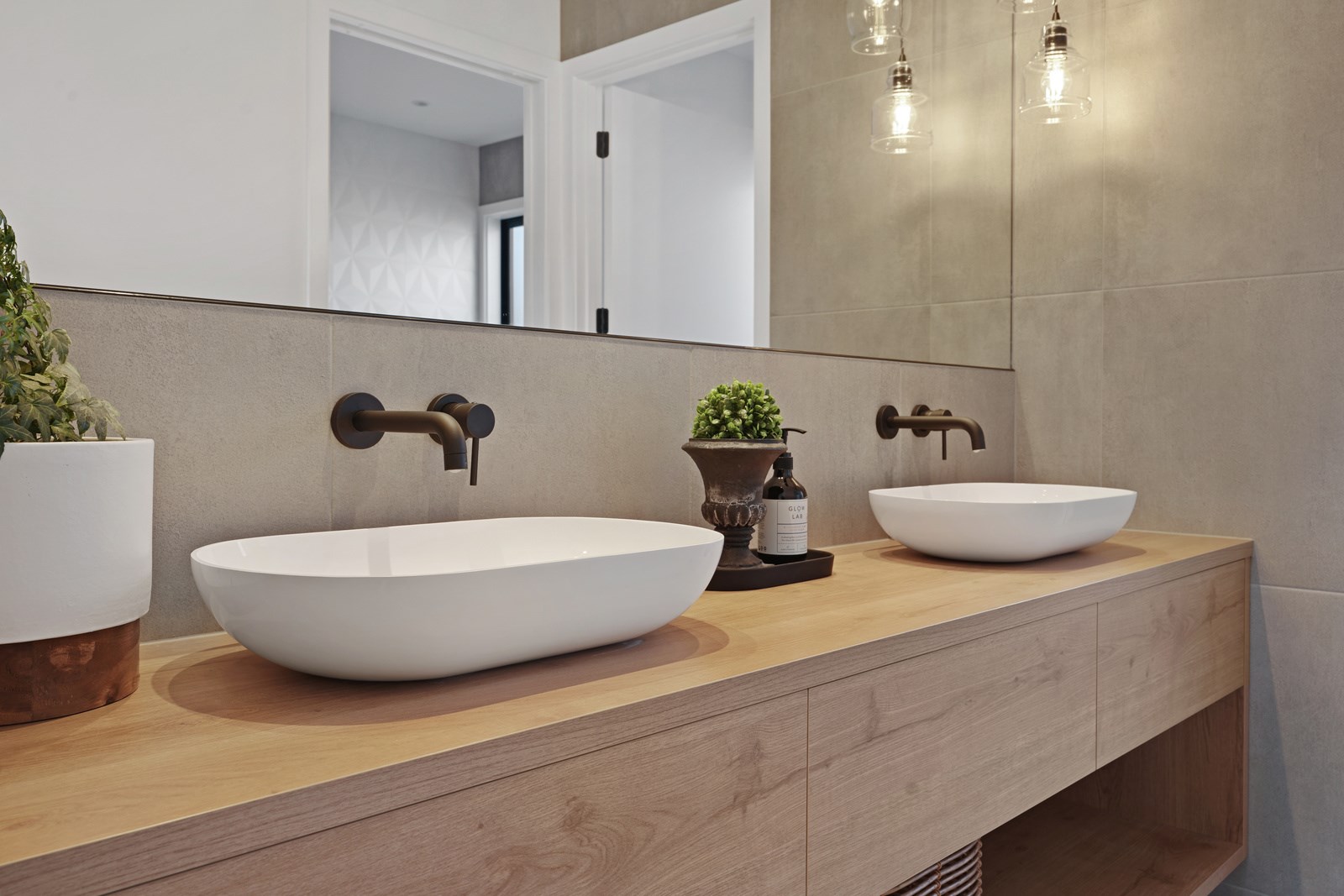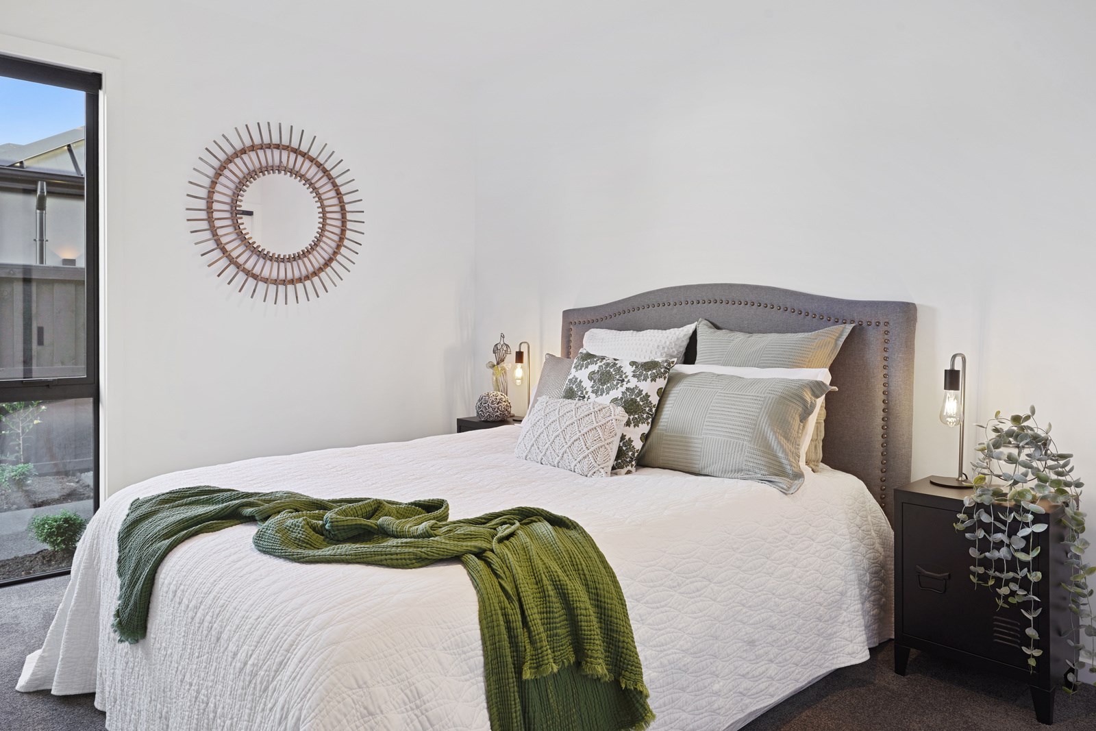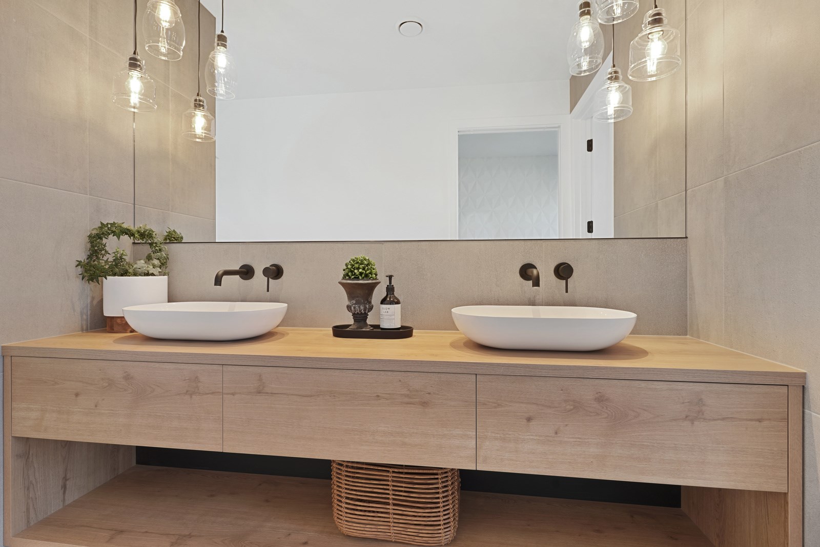 The contrast and symmetry on the exterior of this 292sqm pavilion-style home indicate that something special is in store. With shades of dark and light cladding, side-by-side gables and stylishly lit central entranceway, it’s sleek and unique. Light and space were clearly top of mind in this three-bedroom, two-bathroom home, featuring overheight ceilings, generous windows and skylights used to their best advantage. The living area is all about home comforts with poured and placed polished concrete benches, a long galley pantry and a built-in beverage centre — cheers to that! A large barn slider leads to a separate lounge providing private space, if needed. A gas fire, two ducted heat pumps and under-tile heating keep the entire area warm and cosy on cold winter nights. All the details have been thought through. The bathrooms are well appointed with smart tiles and recessed shelves, and an extra-large garage with attic storage will help keep this home clean and clear. Three sets of sliding doors open onto the covered 27sqm outdoor room ideal for watching the kids or unwinding with a refreshment.