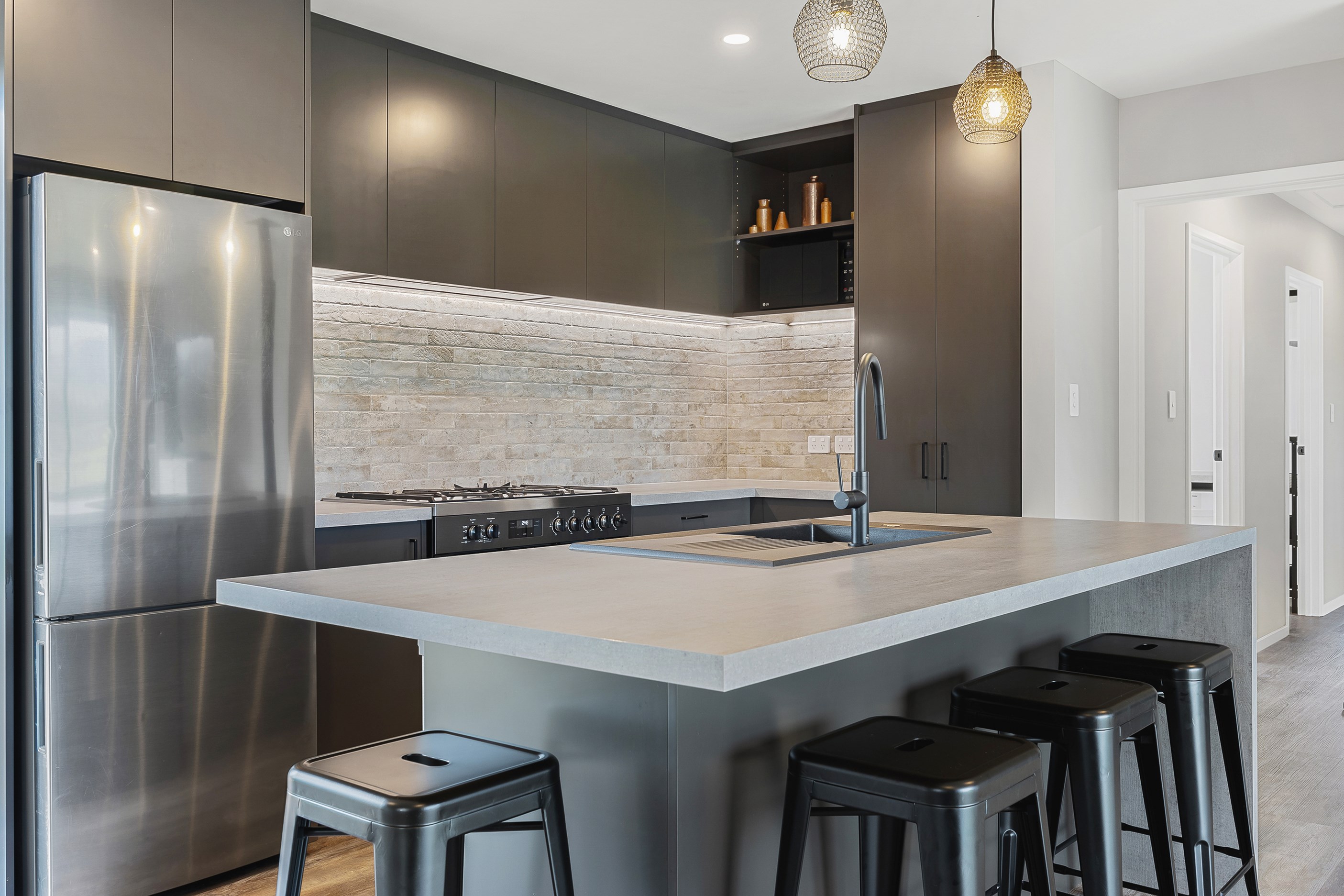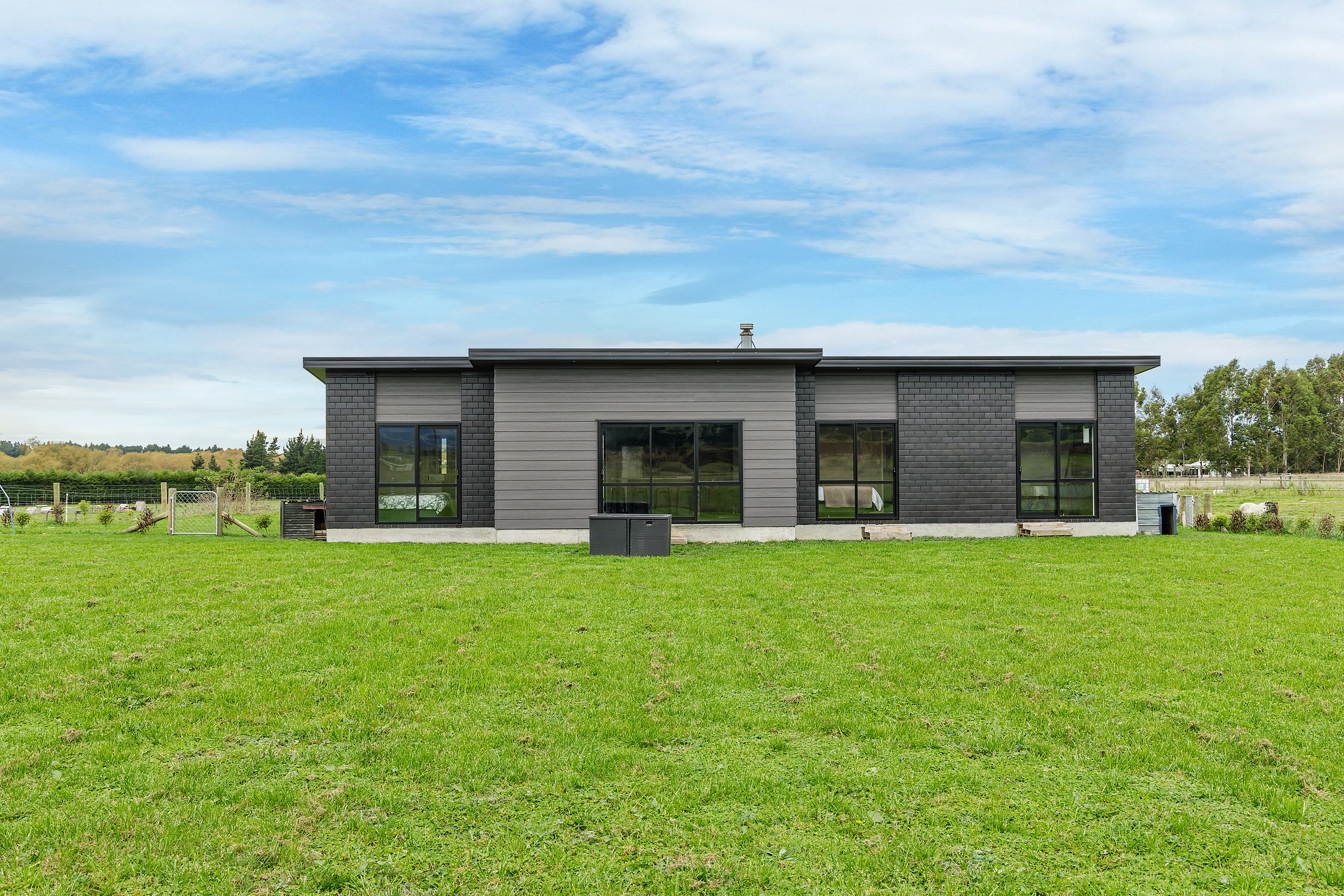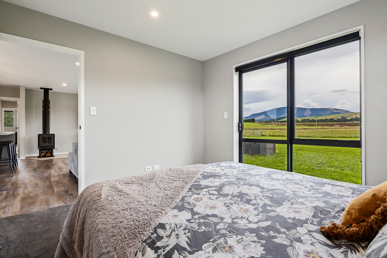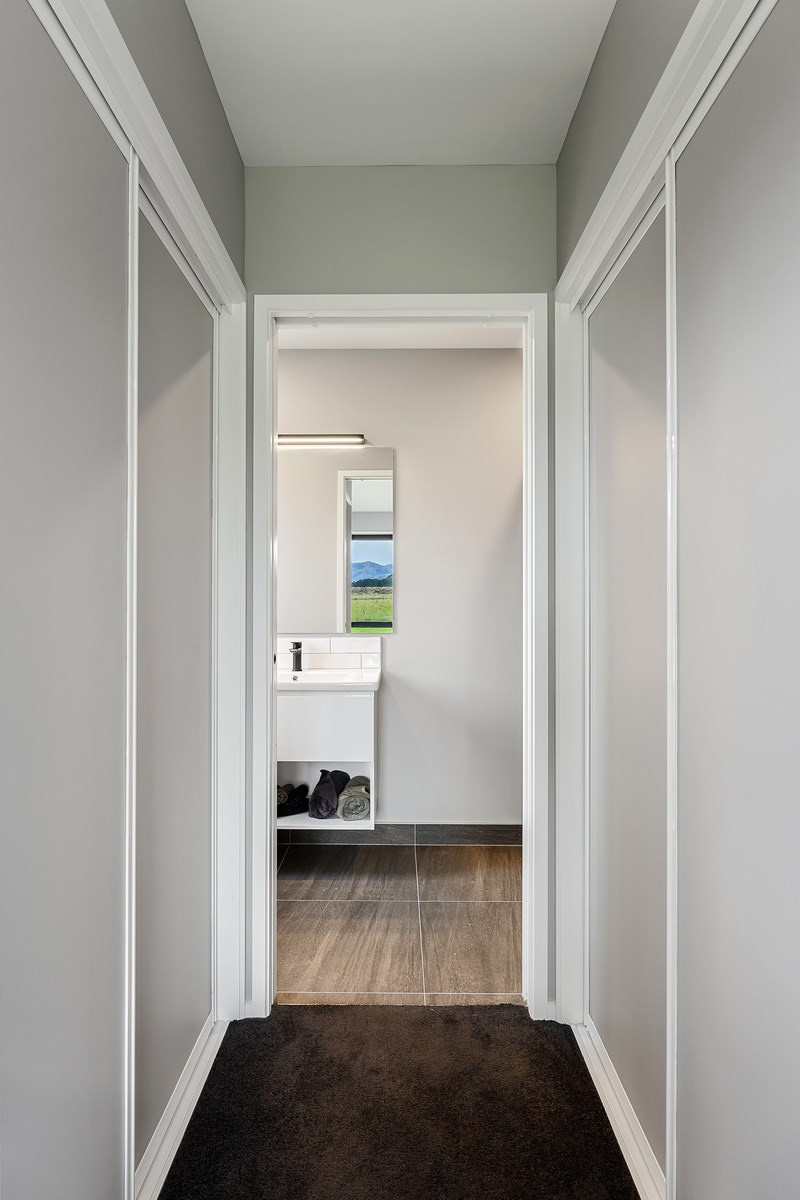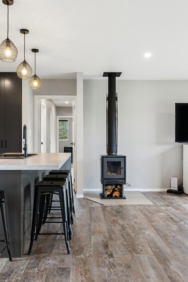The budget was tight, but the ambition was big. This four-bedroom, two-bathroom, single-storey home in the North Canterbury farming community of Okuku is a stylish starter home set away from the crowds. The 117sqm dwelling had to punch above its weight, providing the comforts of modern living — without the price tag. Stroud Homes rose to the challenge, and more. Clad in brick veneer and sustainably manufactured Magnum Board, and featuring Altherm aluminium window joinery, this home stands strong in its country setting overlooking Mt Thomas. Indoors, chocolate-coloured timber flooring in the main living areas imbue the spaces with cosiness. The functional layout is key: in the open-plan living area, the kitchen is well placed near the dining. A six-hob gas cooktop sits among sleek, dark cabinetry, and there’s a concrete-style island with a waterfall end. On chilly nights, a log burner keeps things toasty. While the budget didn’t stretch to building an outdoor area this time around, this home is ready for improvements down the track. Glass sliding doors from the lounge and all the bedrooms will one day open onto the sunny decks. The future is bright.