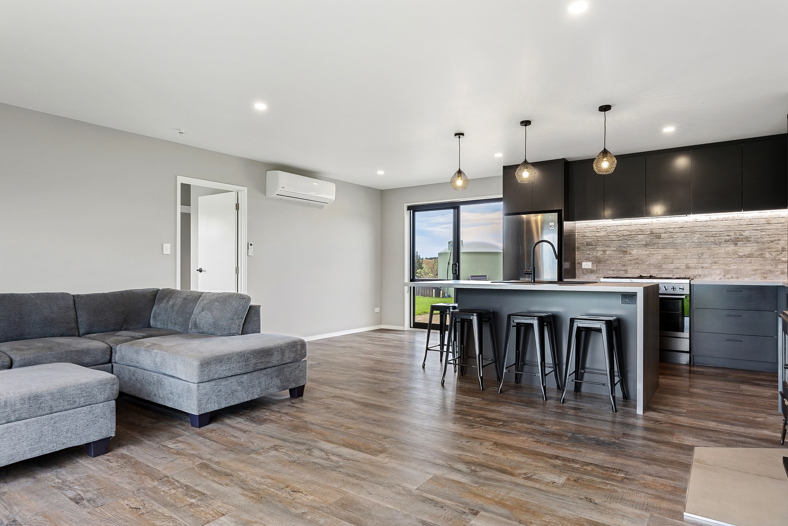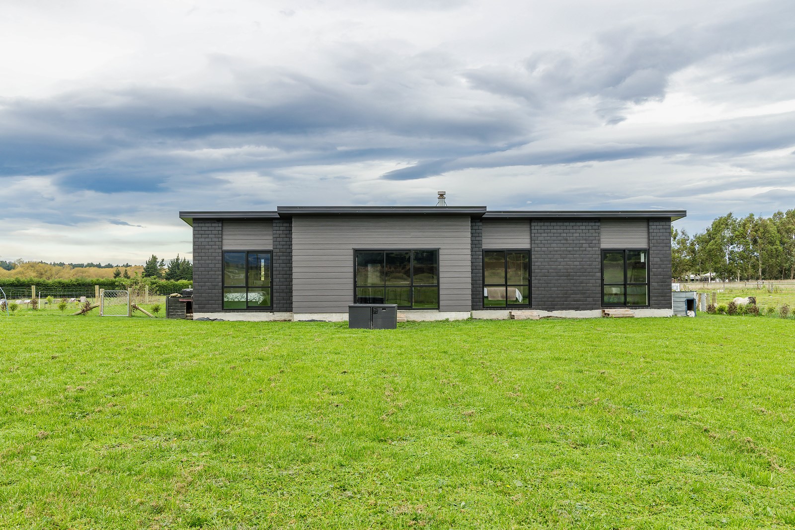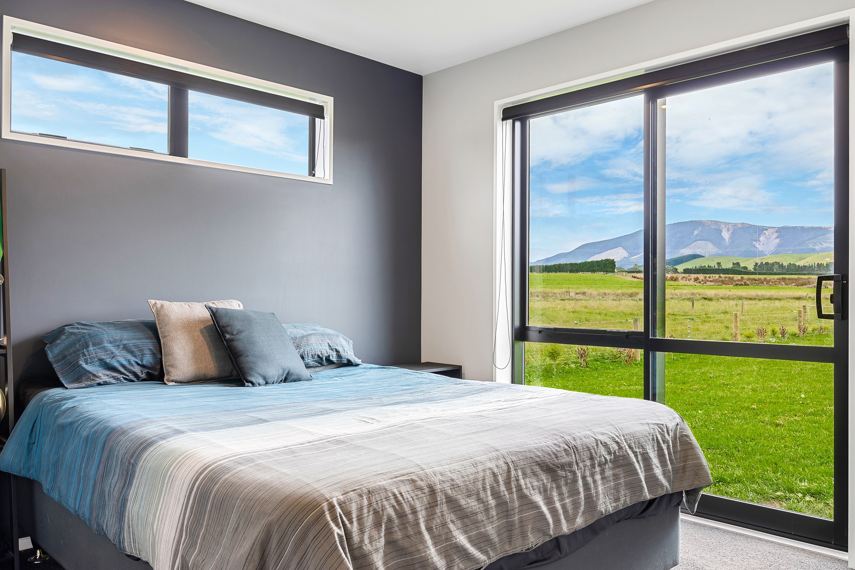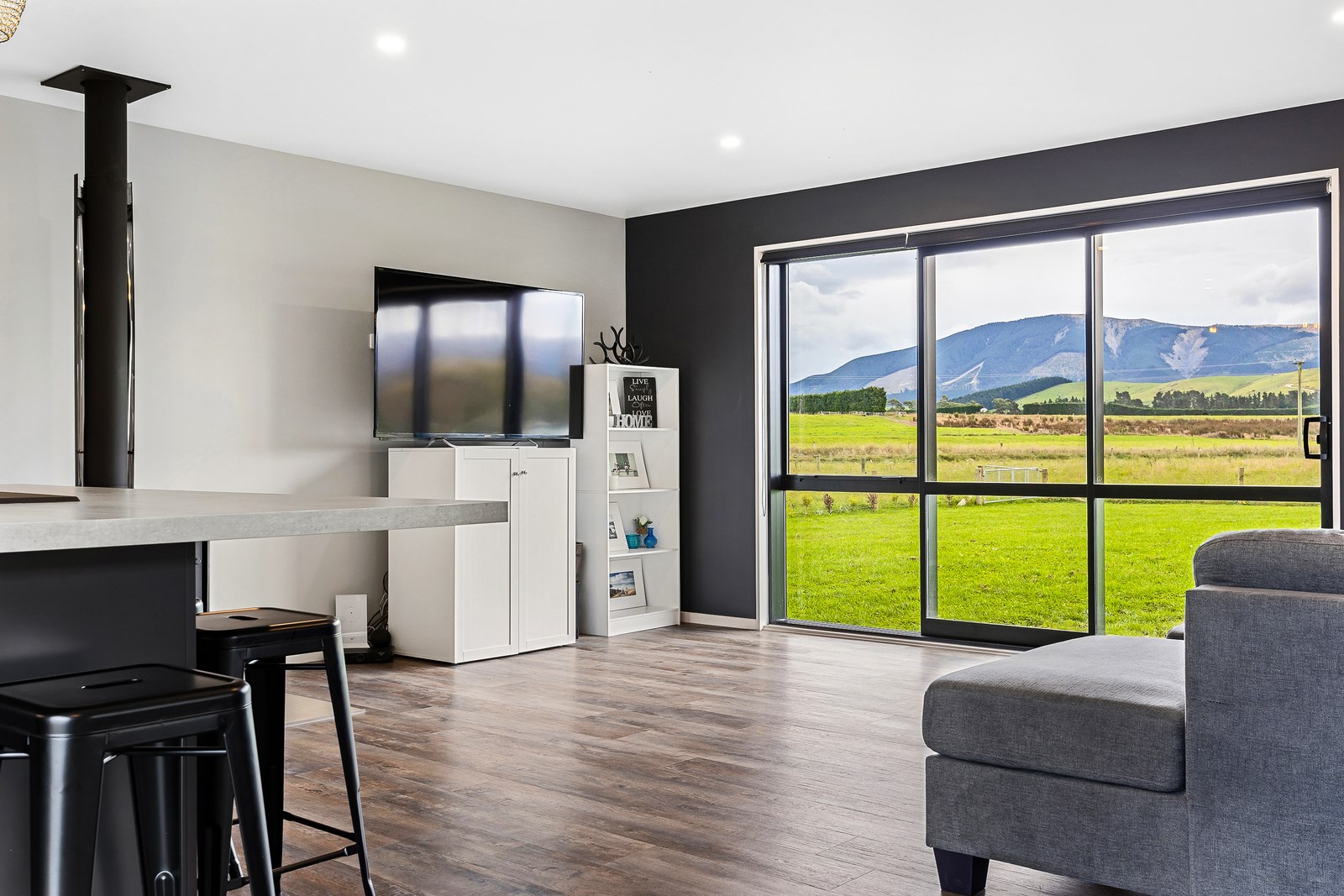 The budget was tight, but the ambition was big. This four-bedroom, two-bathroom, single-storey home in the North Canterbury farming community of Okuku is a stylish starter home set away from the crowds. The 117sqm dwelling had to punch above its weight, providing the comforts of modern living — without the price tag. Stroud Homes rose to the challenge, and more. Clad in brick veneer and sustainably manufactured Magnum Board, and featuring Altherm aluminium window joinery, this home stands strong in its country setting overlooking Mt Thomas. Indoors, chocolate-coloured timber flooring in the main living areas imbue the spaces with cosiness. The functional layout is key: in the open-plan living area, the kitchen is well placed near the dining. A six-hob gas cooktop sits among sleek, dark cabinetry, and there’s a concrete-style island with a waterfall end. On chilly nights, a log burner keeps things toasty. While the budget didn’t stretch to building an outdoor area this time around, this home is ready for improvements down the track. Glass sliding doors from the lounge and all the bedrooms will one day open onto the sunny decks. The future is bright.