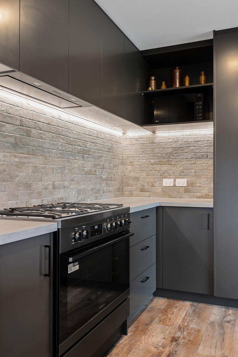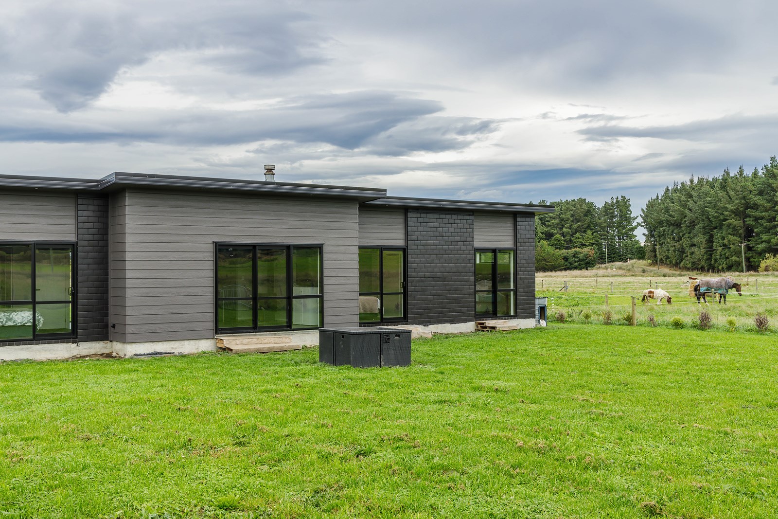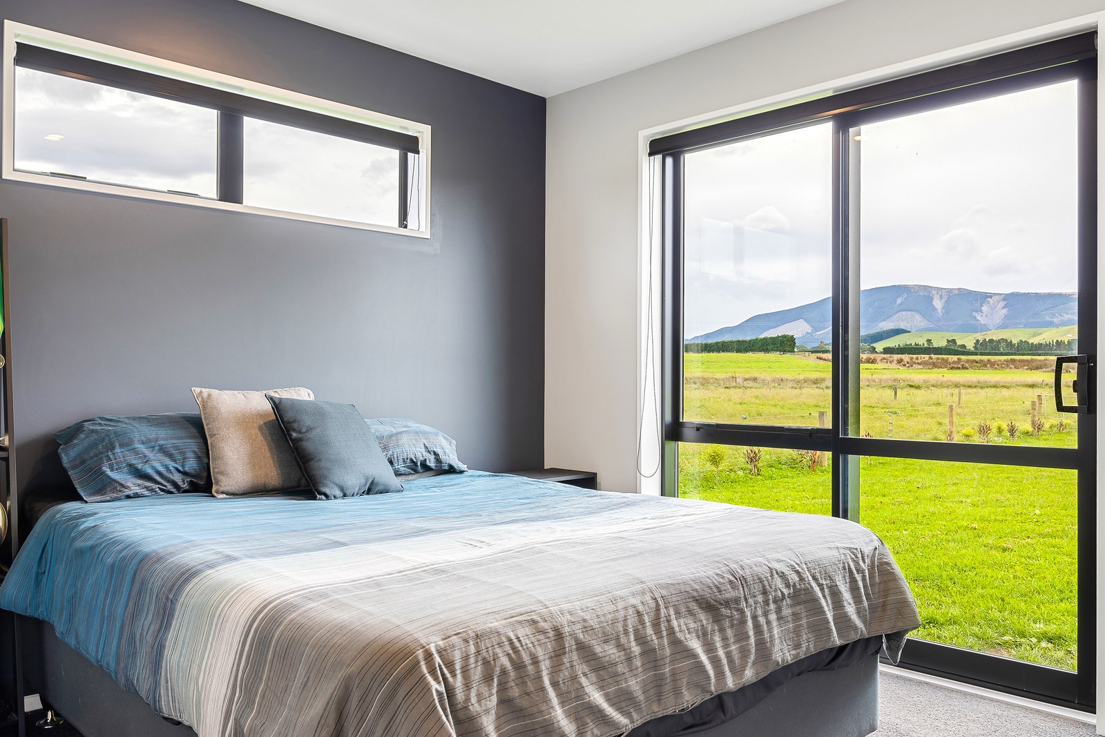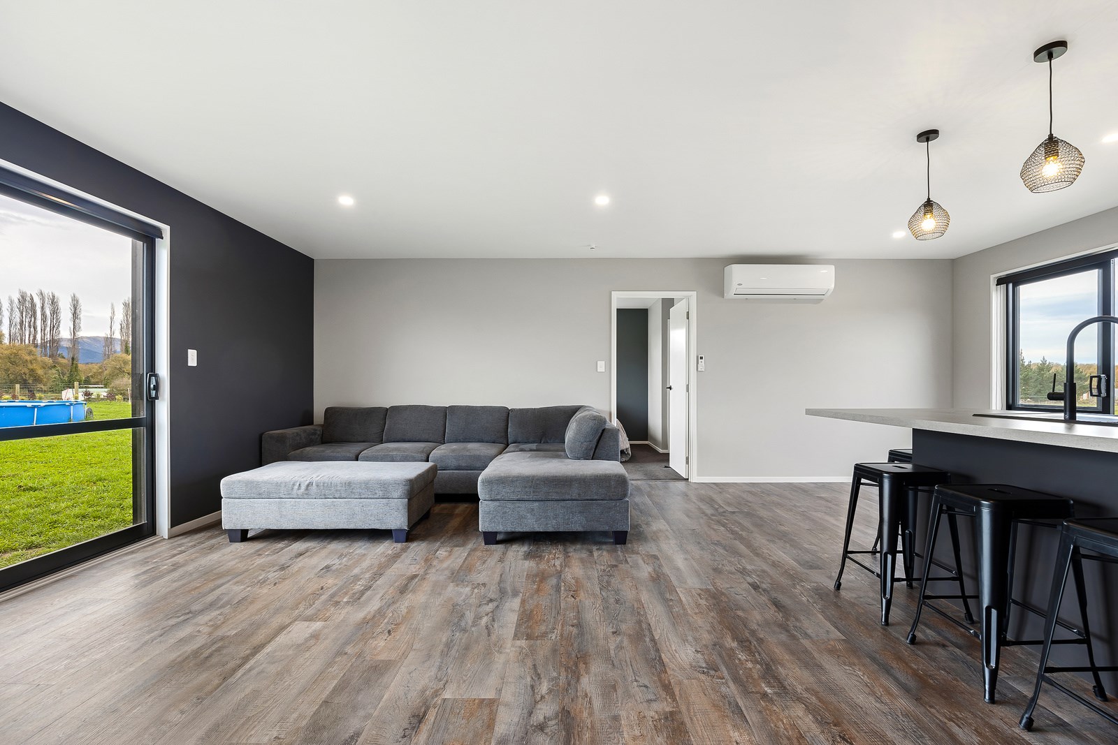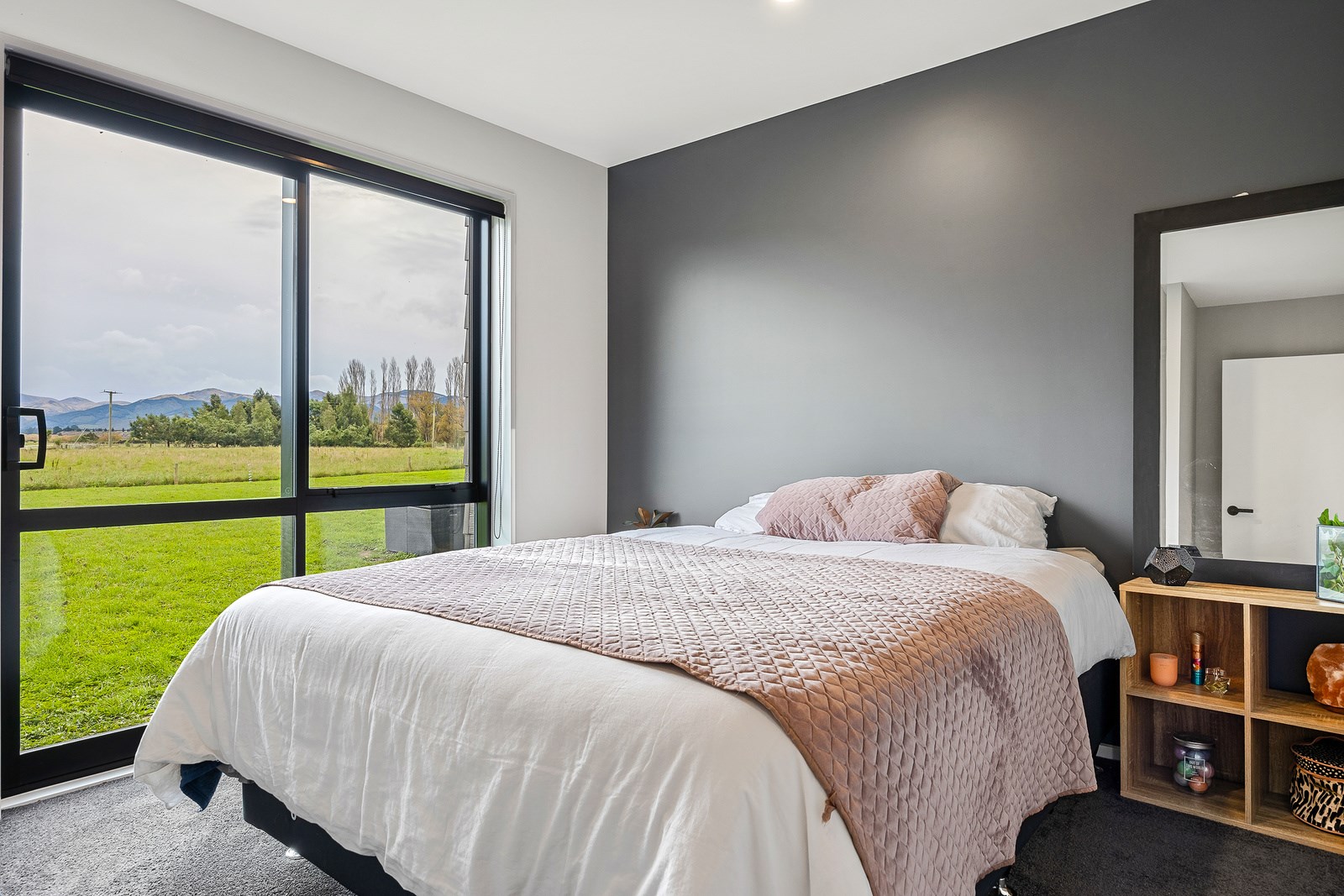 The budget was tight, but the ambition was big. This four-bedroom, two-bathroom, single-storey home in the North Canterbury farming community of Okuku is a stylish starter home set away from the crowds. The 117sqm dwelling had to punch above its weight, providing the comforts of modern living — without the price tag. Stroud Homes rose to the challenge, and more. Clad in brick veneer and sustainably manufactured Magnum Board, and featuring Altherm aluminium window joinery, this home stands strong in its country setting overlooking Mt Thomas. Indoors, chocolate-coloured timber flooring in the main living areas imbue the spaces with cosiness. The functional layout is key: in the open-plan living area, the kitchen is well placed near the dining. A six-hob gas cooktop sits among sleek, dark cabinetry, and there’s a concrete-style island with a waterfall end. On chilly nights, a log burner keeps things toasty. While the budget didn’t stretch to building an outdoor area this time around, this home is ready for improvements down the track. Glass sliding doors from the lounge and all the bedrooms will one day open onto the sunny decks. The future is bright.