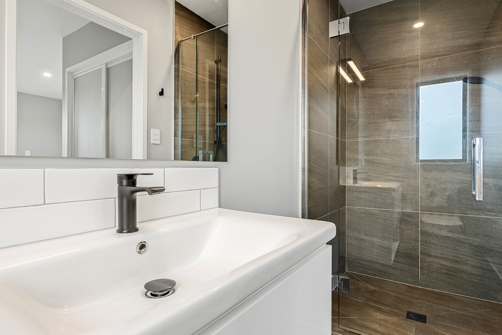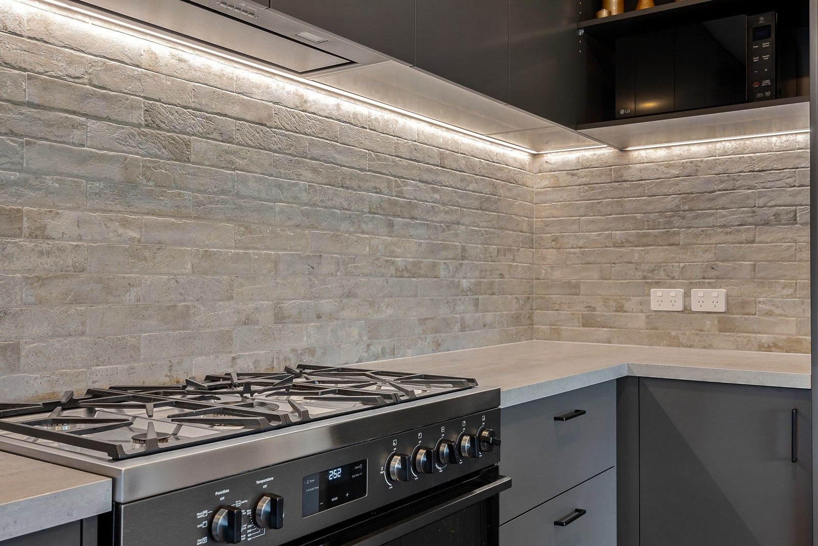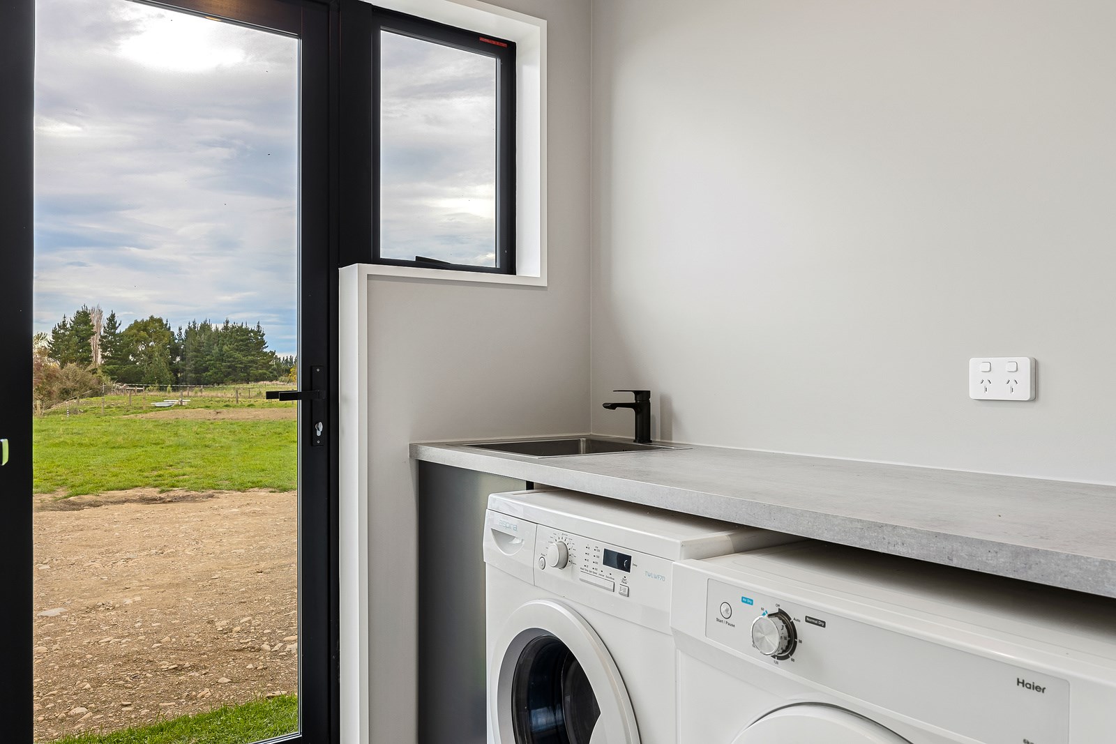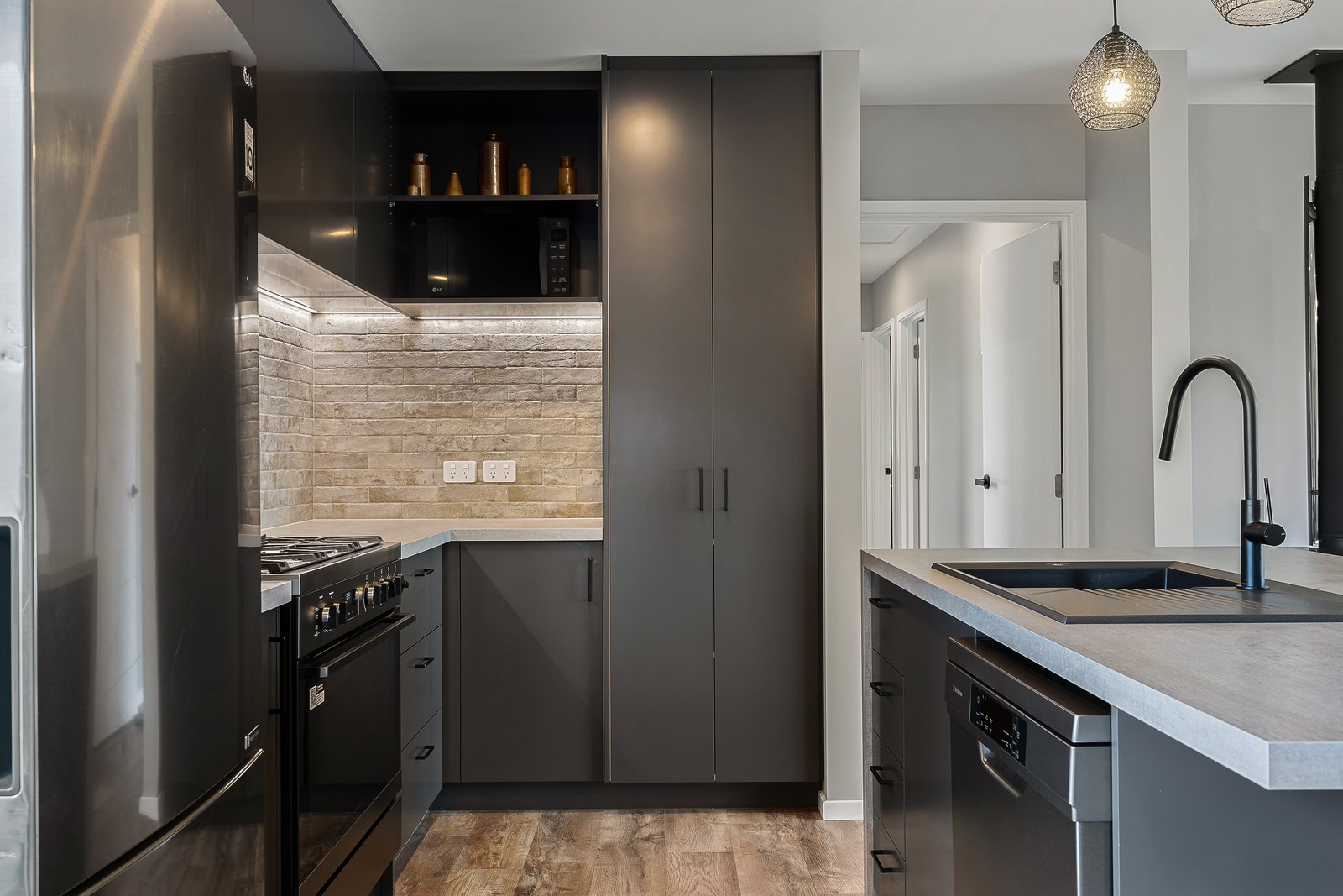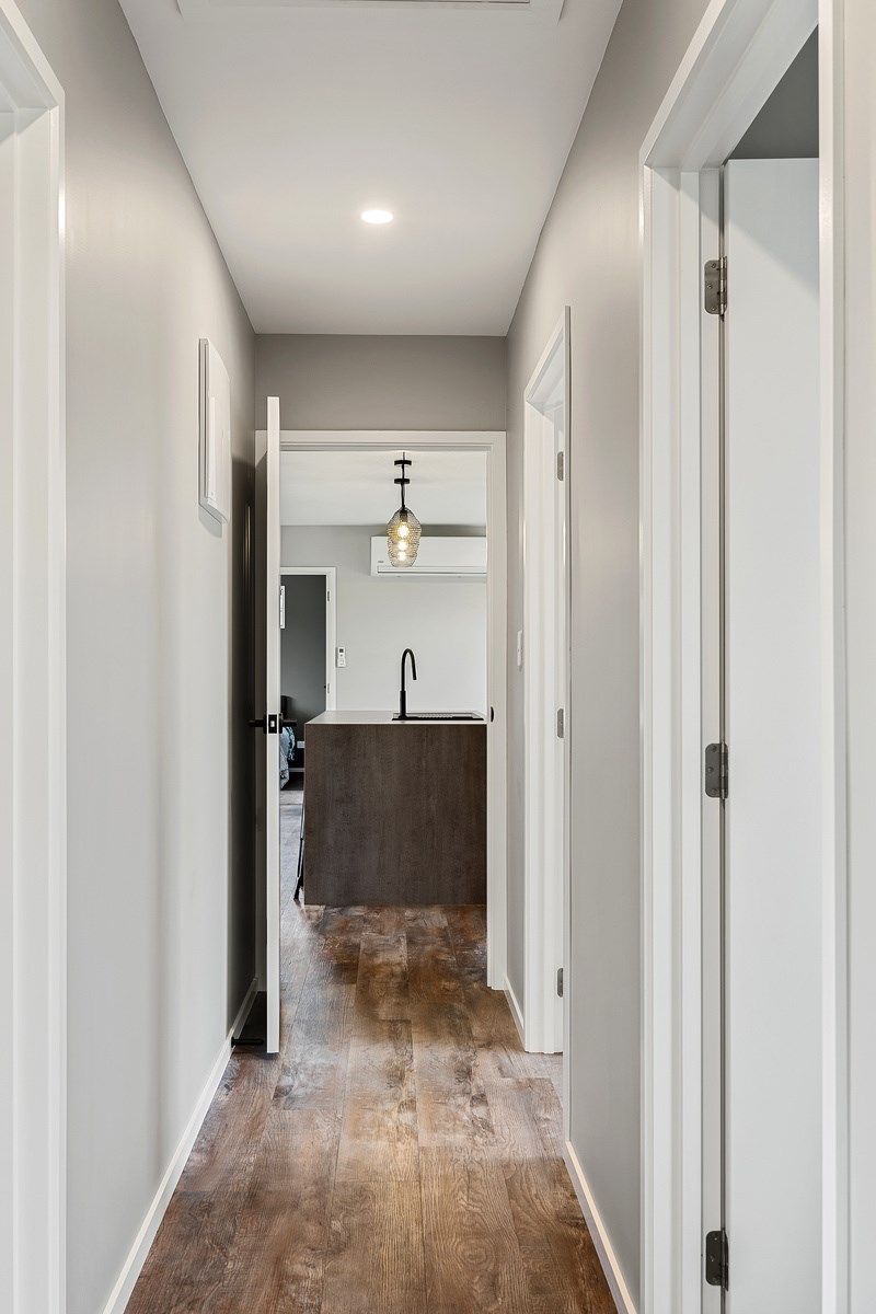 The budget was tight, but the ambition was big. This four-bedroom, two-bathroom, single-storey home in the North Canterbury farming community of Okuku is a stylish starter home set away from the crowds. The 117sqm dwelling had to punch above its weight, providing the comforts of modern living — without the price tag. Stroud Homes rose to the challenge, and more. Clad in brick veneer and sustainably manufactured Magnum Board, and featuring Altherm aluminium window joinery, this home stands strong in its country setting overlooking Mt Thomas. Indoors, chocolate-coloured timber flooring in the main living areas imbue the spaces with cosiness. The functional layout is key: in the open-plan living area, the kitchen is well placed near the dining. A six-hob gas cooktop sits among sleek, dark cabinetry, and there’s a concrete-style island with a waterfall end. On chilly nights, a log burner keeps things toasty. While the budget didn’t stretch to building an outdoor area this time around, this home is ready for improvements down the track. Glass sliding doors from the lounge and all the bedrooms will one day open onto the sunny decks. The future is bright.