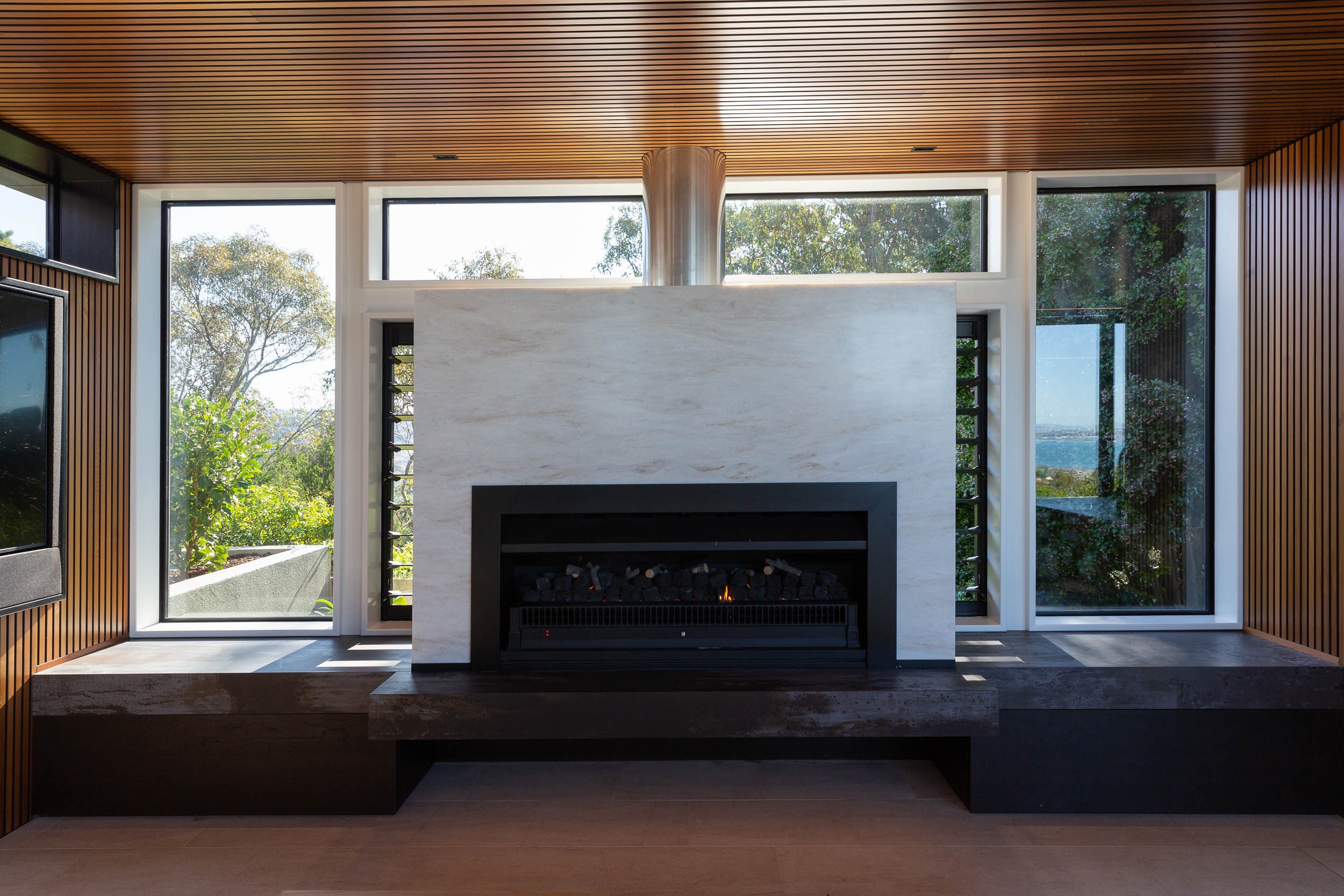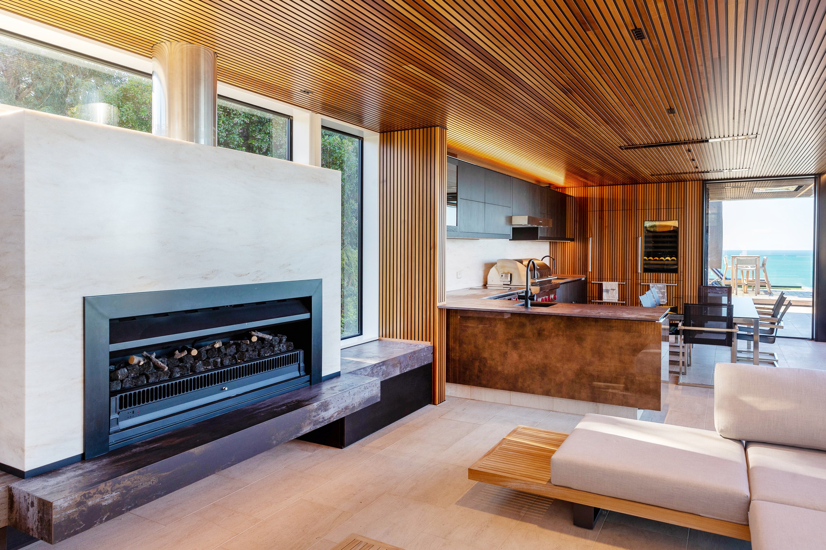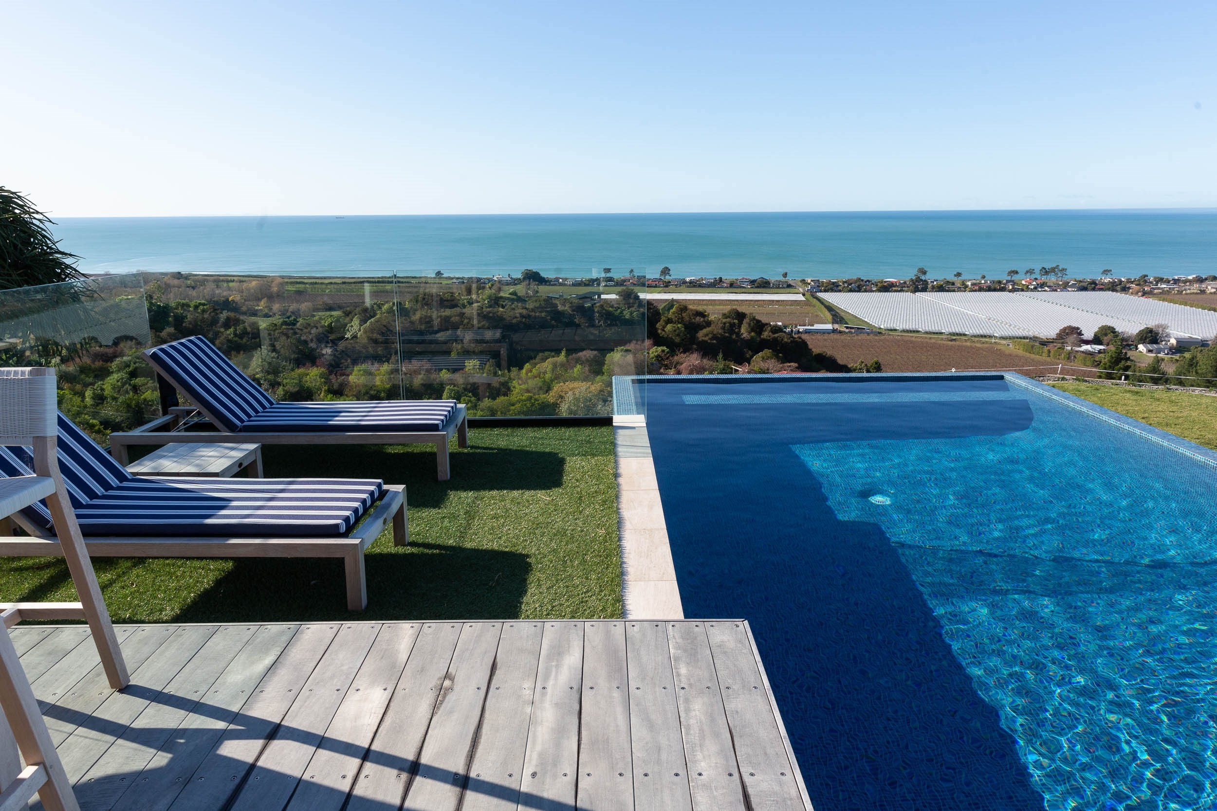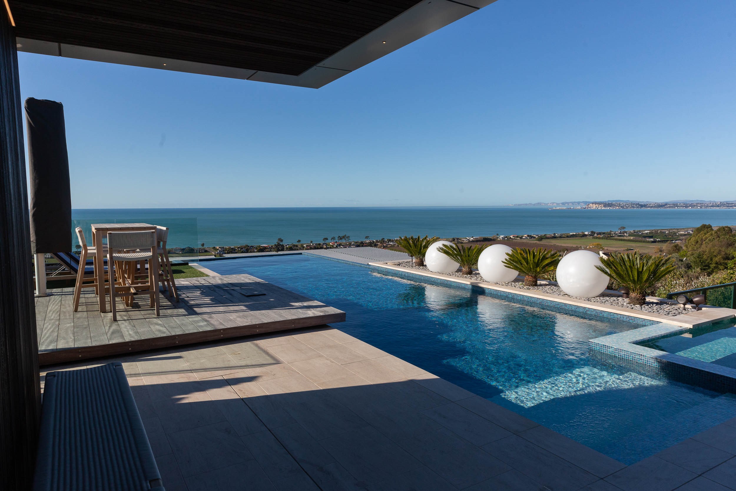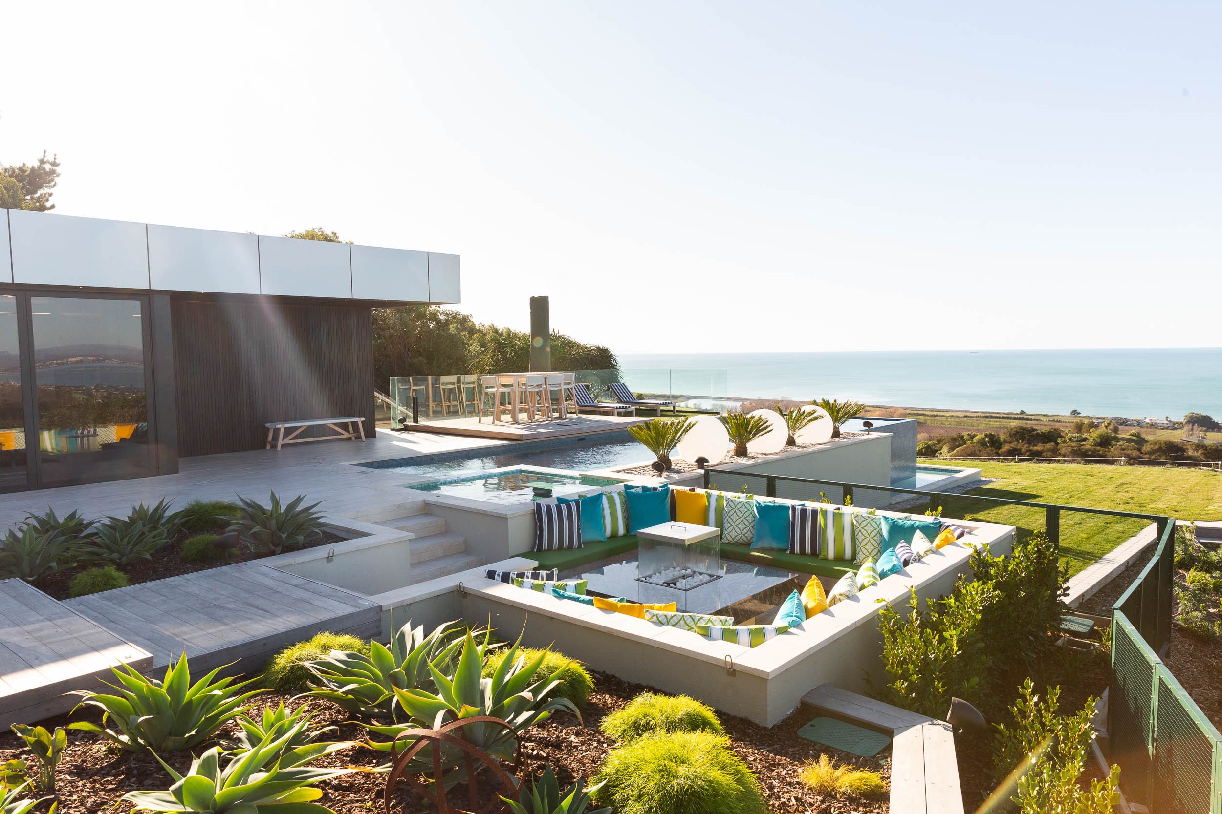 Now here’s a renovation with true star power. This contemporary Hawke’s Bay home received a moviestar-worthy upgrade with a new cabana area that capitalises on the hillside setting and Pacific Ocean views. An expansive multi-level outdoor area required significant earthworks to accommodate an infinity pool, spa, courtyard and conversation pit with a dazzling glass-encased fire. There’s also a second alfresco seating area in front of an Escea fireplace. The 70sqm cedar and aluminium-clad pool pavilion offers more luxury and examples of exemplary craftsmanship. Inside, the tongue-and-groove cedar walls in the living areas along with a negative-detailed ceiling and hidden bathroom wall showcase the skills of the building and design teams. Infrared heaters are recessed into the ceiling and LED lights makes the timber shine. In the kitchen, the refrigerator and wine chiller are tucked away behind more of that beautiful cedar. There’s all the mod cons, including an indoor barbecue. The adjoining living room comes equipped with a recessed television and a statement gas fire for chilly nights. Steel pivoted, double-glazed glass doors grant unfettered access to the pool and those incredible views.