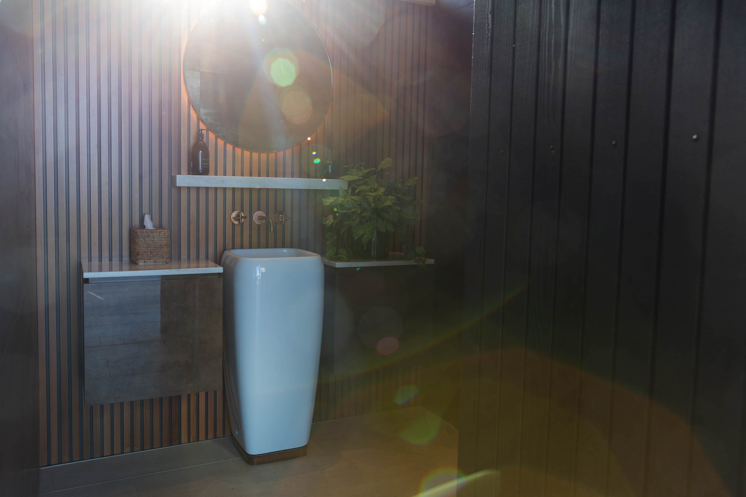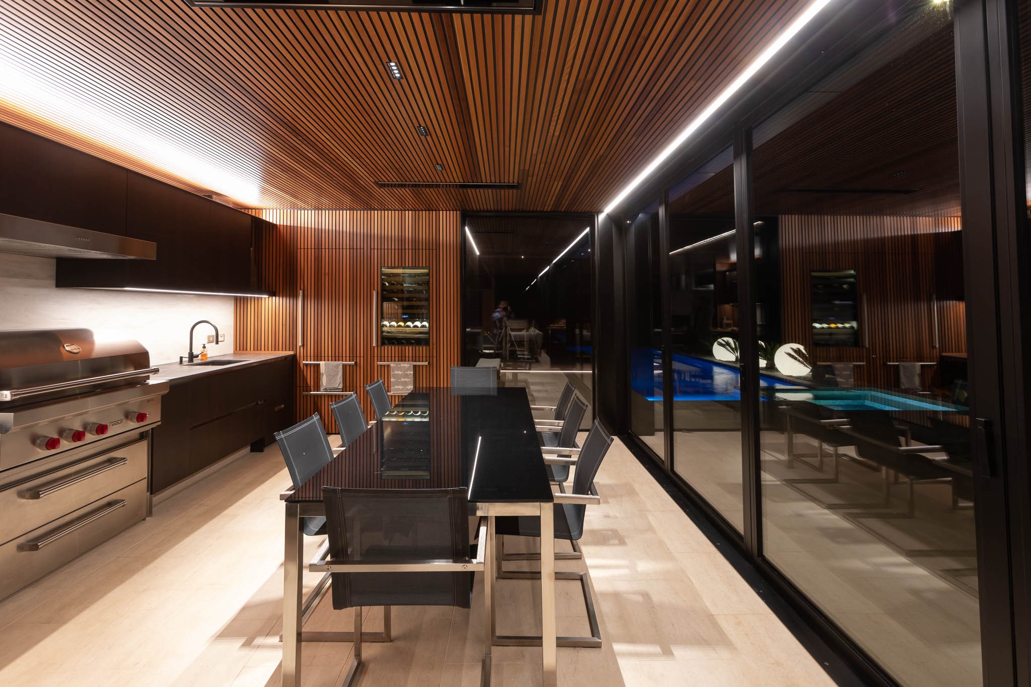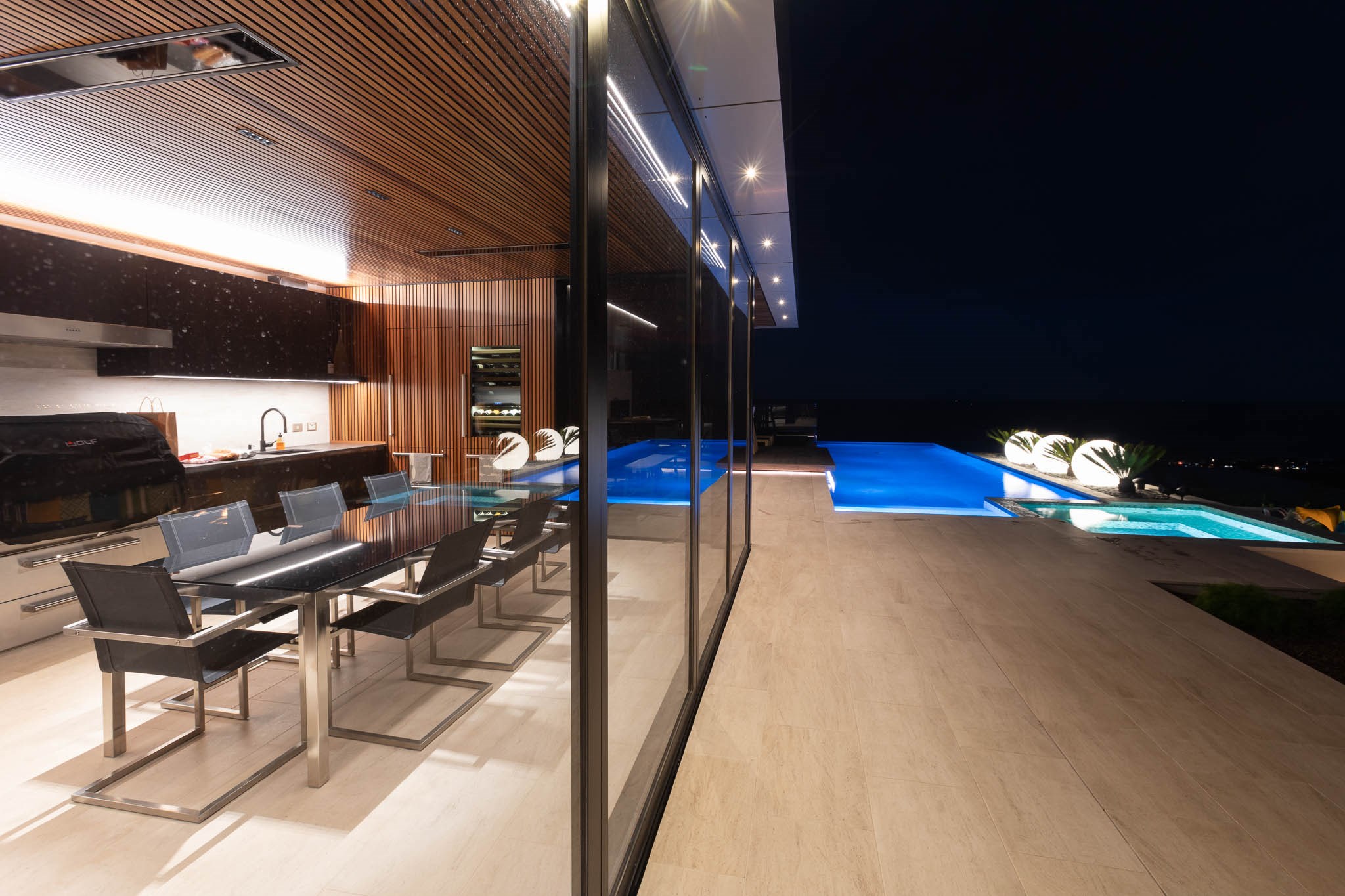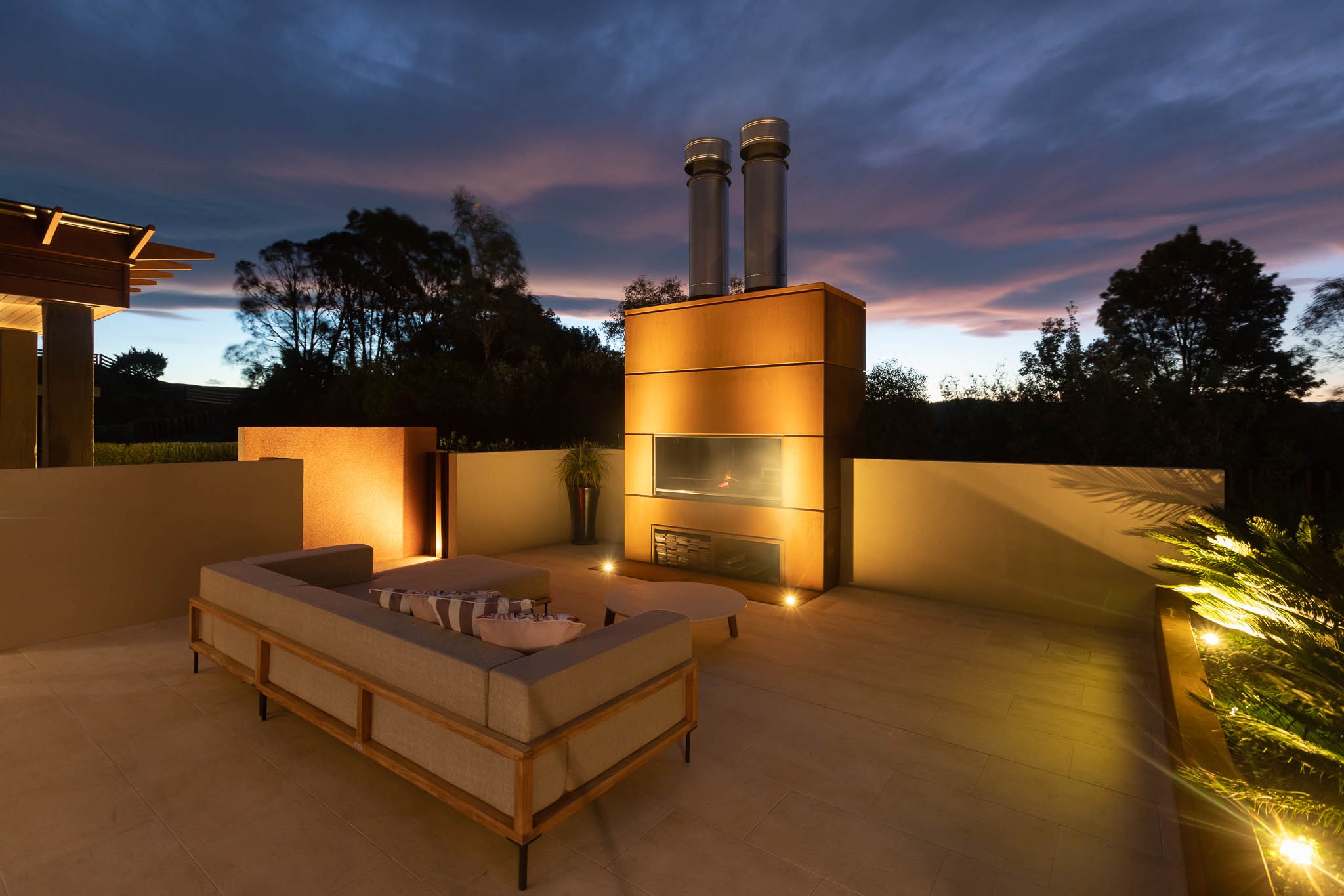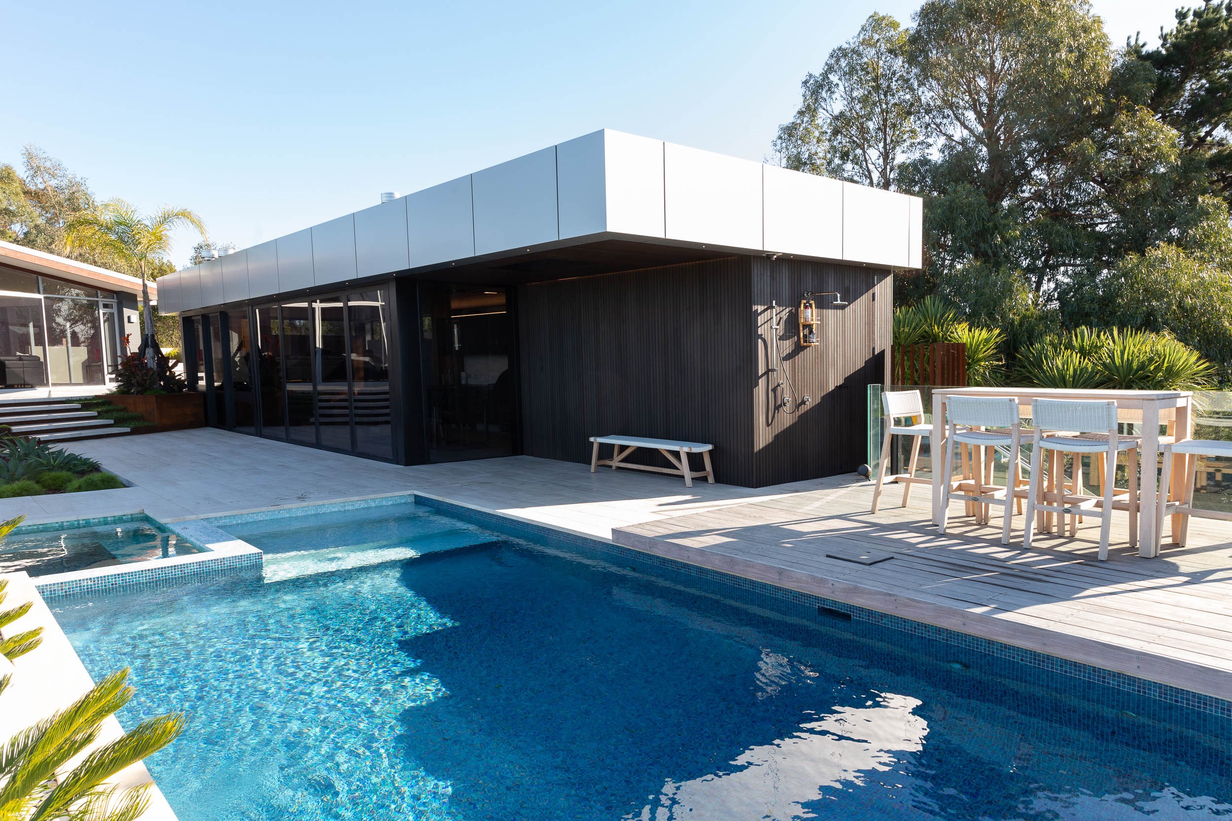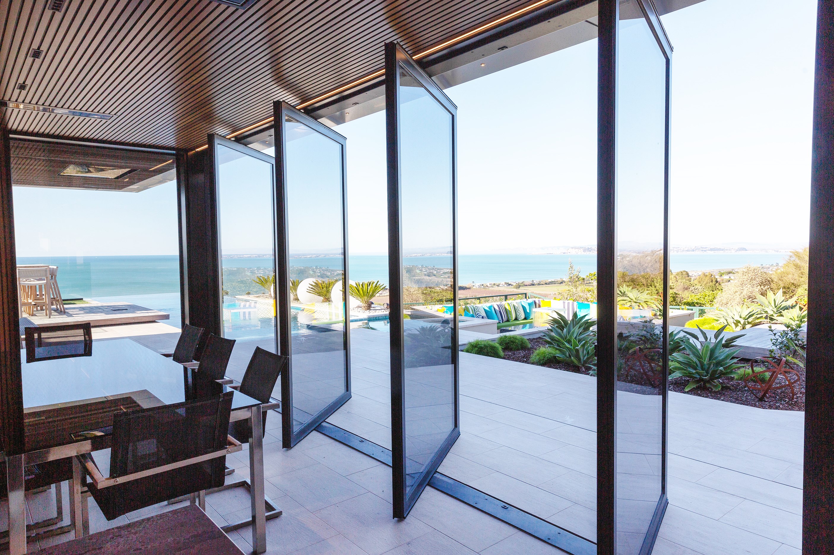 Now here’s a renovation with true star power. This contemporary Hawke’s Bay home received a moviestar-worthy upgrade with a new cabana area that capitalises on the hillside setting and Pacific Ocean views. An expansive multi-level outdoor area required significant earthworks to accommodate an infinity pool, spa, courtyard and conversation pit with a dazzling glass-encased fire. There’s also a second alfresco seating area in front of an Escea fireplace. The 70sqm cedar and aluminium-clad pool pavilion offers more luxury and examples of exemplary craftsmanship. Inside, the tongue-and-groove cedar walls in the living areas along with a negative-detailed ceiling and hidden bathroom wall showcase the skills of the building and design teams. Infrared heaters are recessed into the ceiling and LED lights makes the timber shine. In the kitchen, the refrigerator and wine chiller are tucked away behind more of that beautiful cedar. There’s all the mod cons, including an indoor barbecue. The adjoining living room comes equipped with a recessed television and a statement gas fire for chilly nights. Steel pivoted, double-glazed glass doors grant unfettered access to the pool and those incredible views.