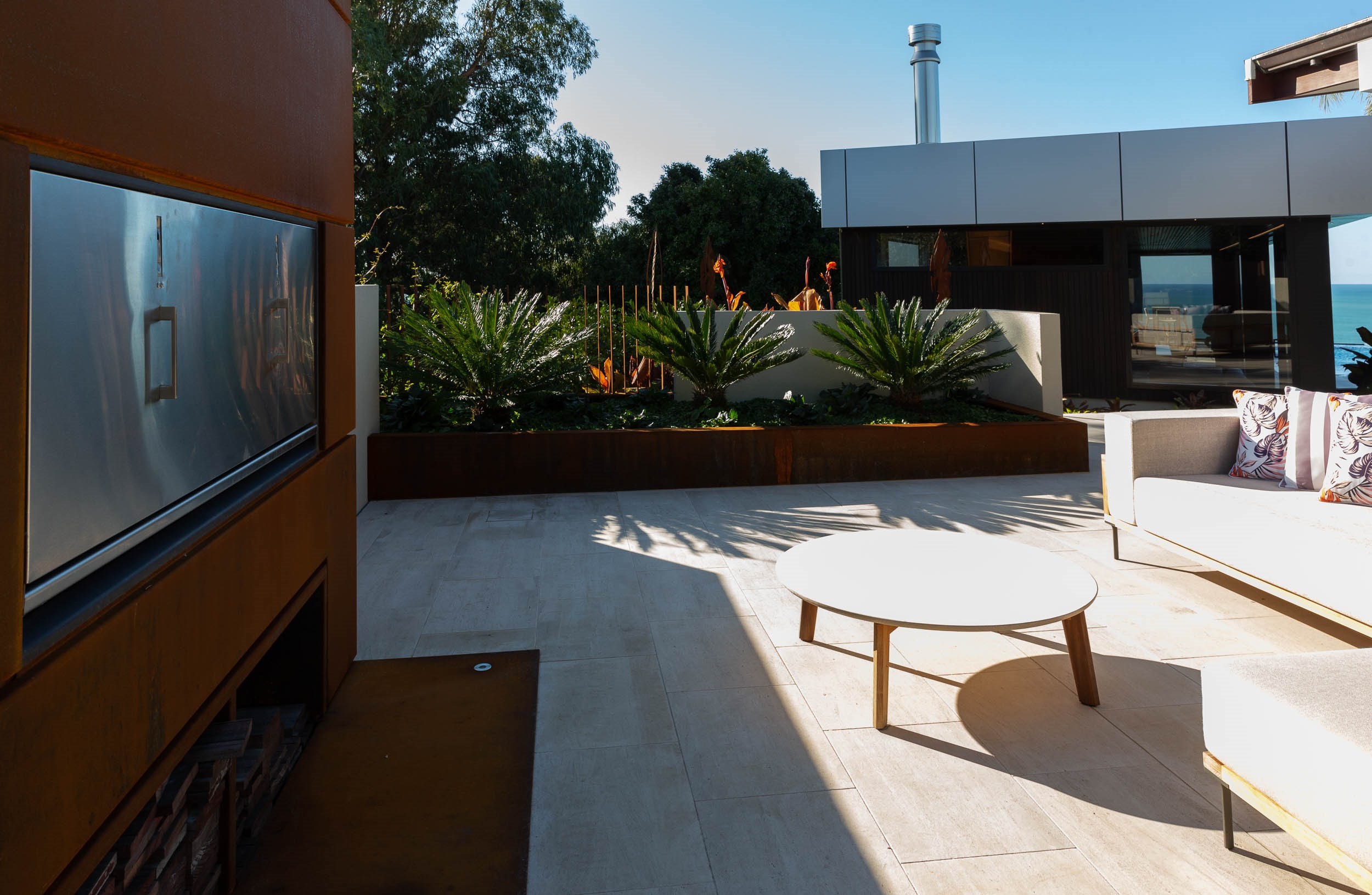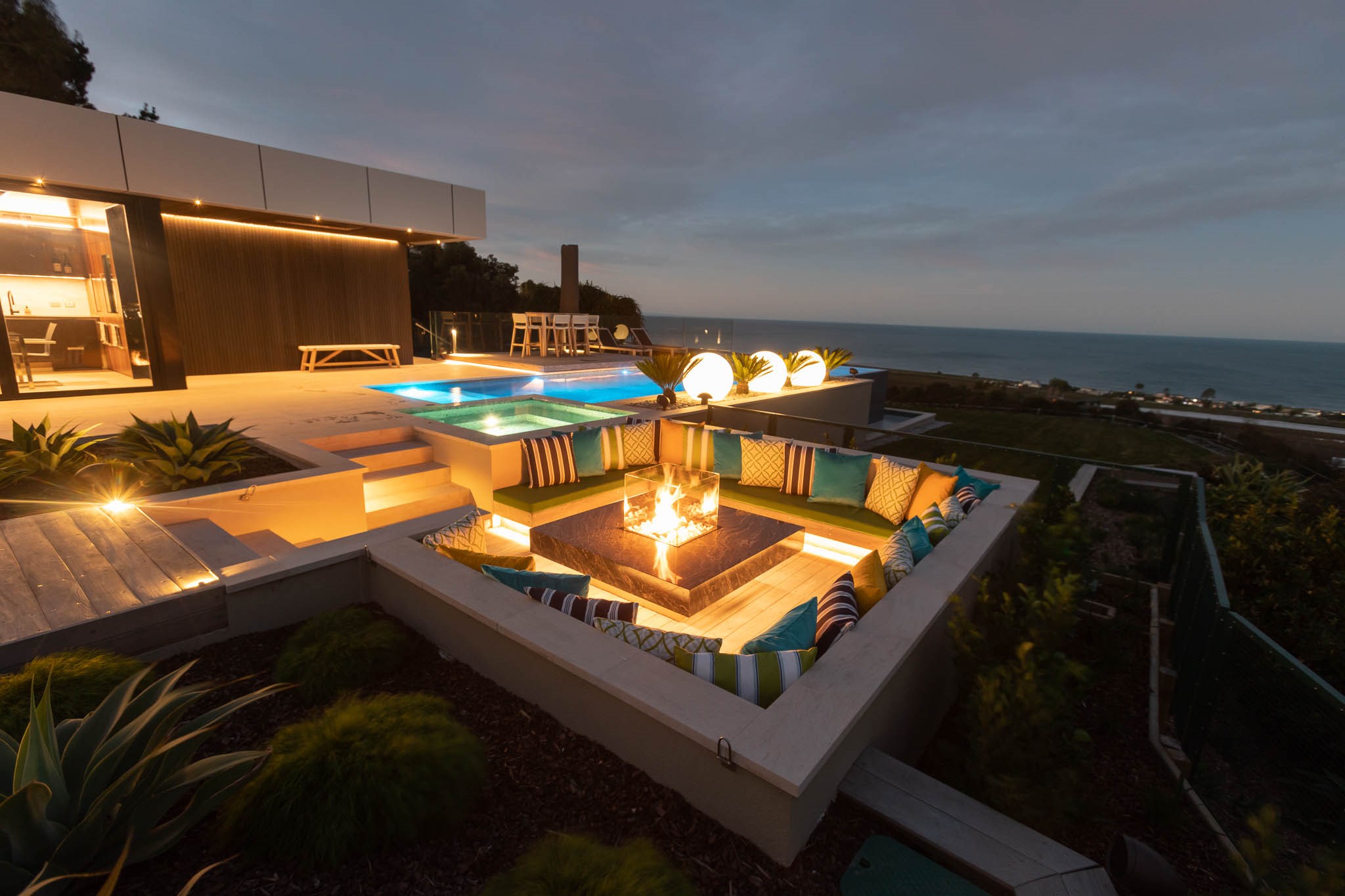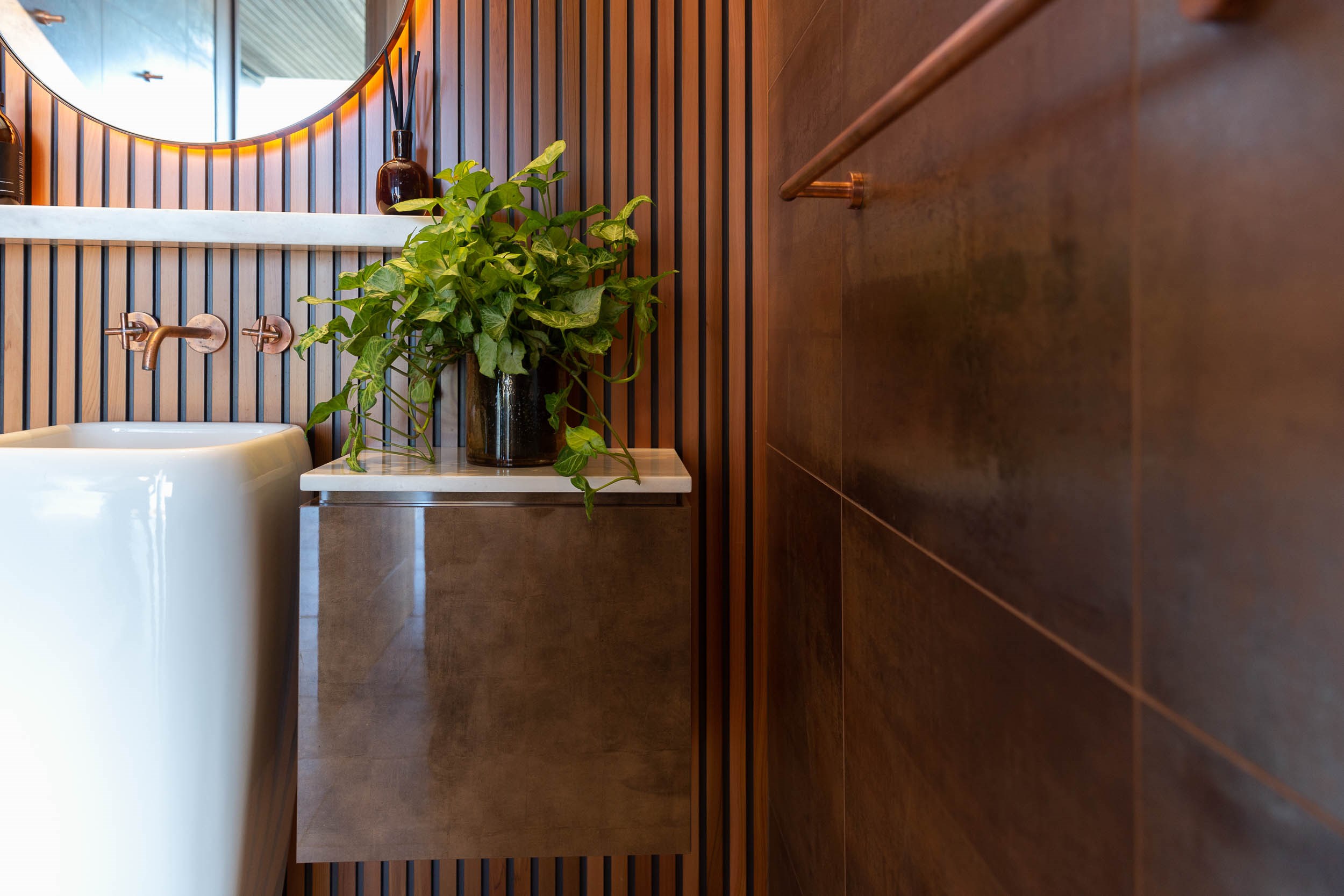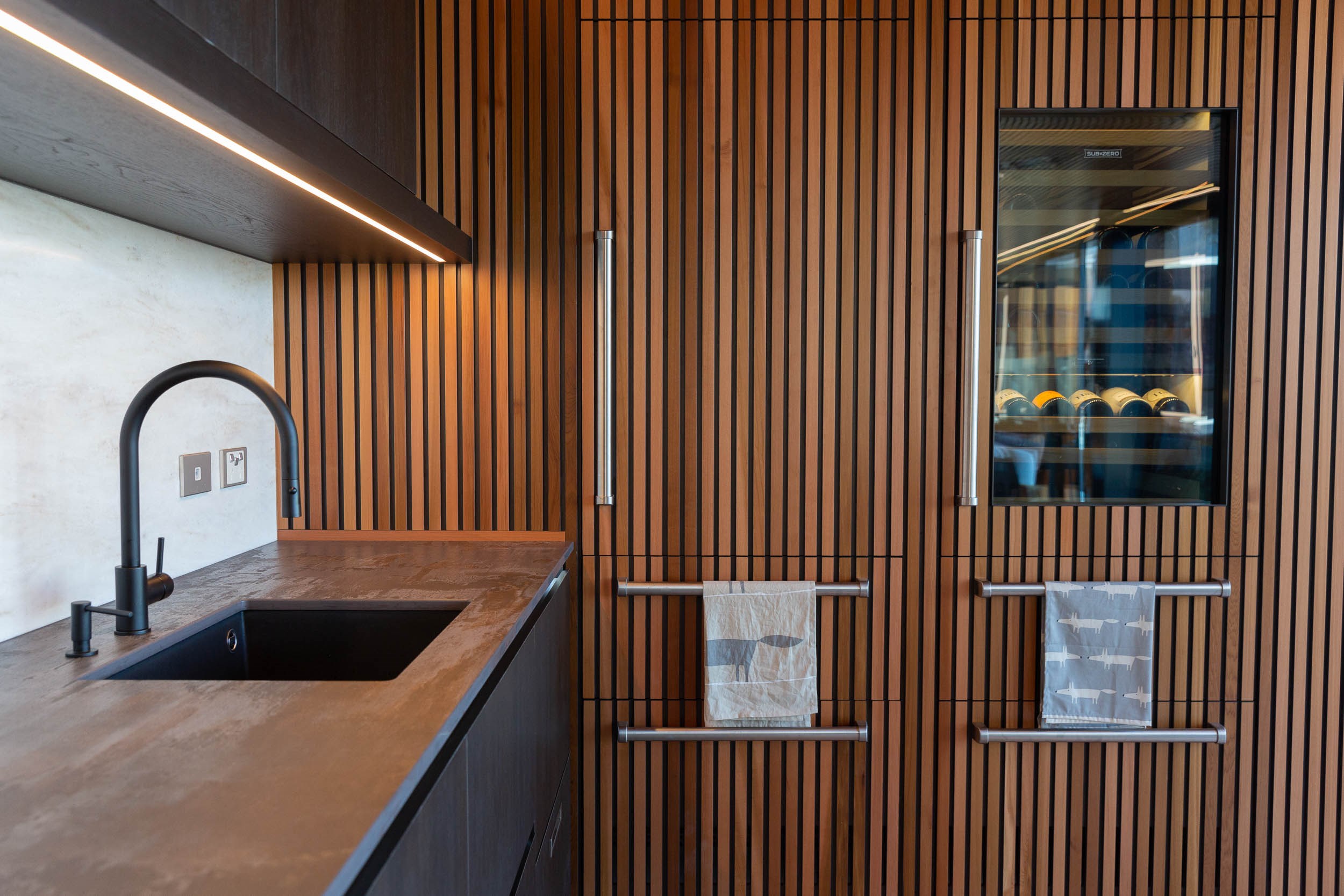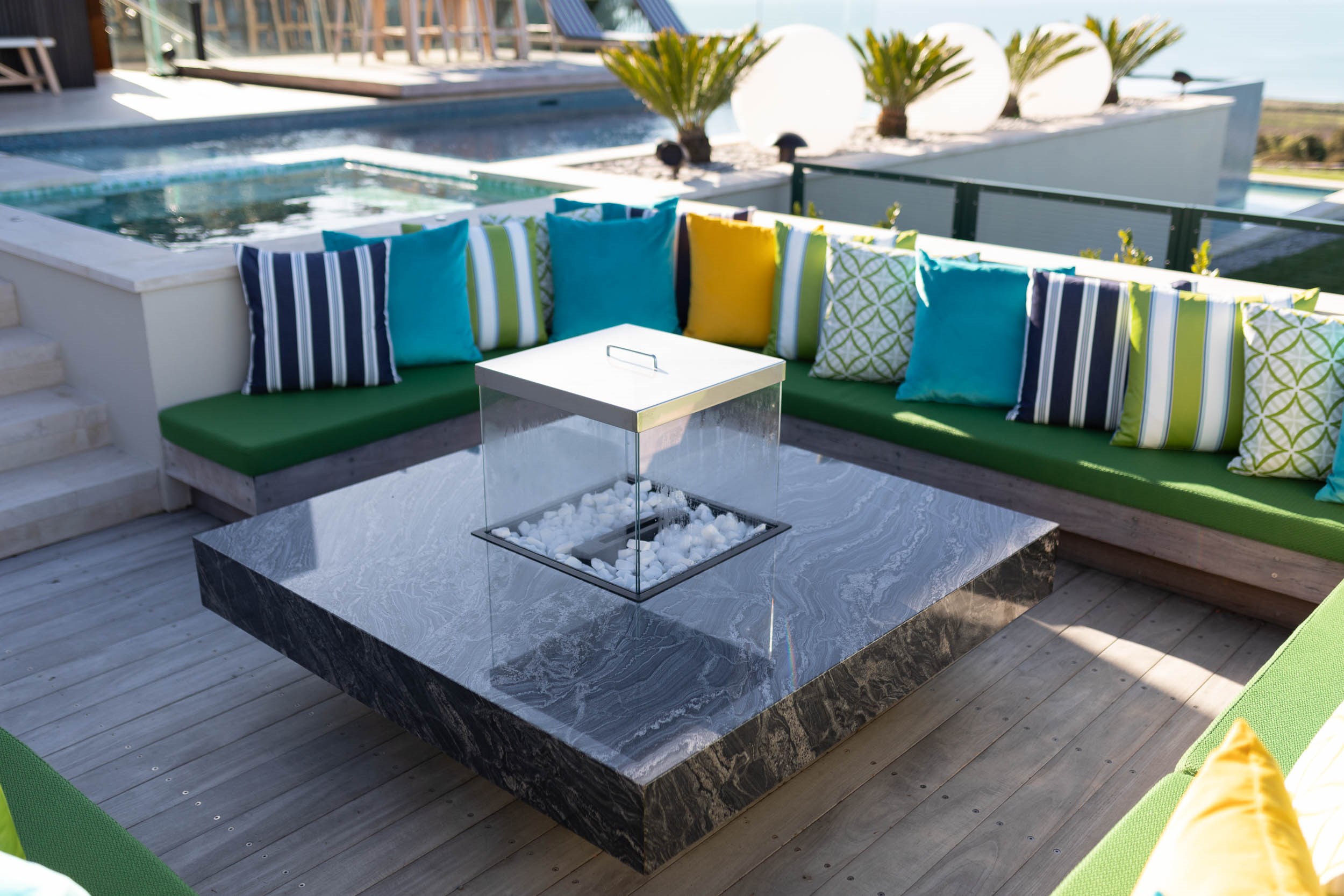 Now here’s a renovation with true star power. This contemporary Hawke’s Bay home received a moviestar-worthy upgrade with a new cabana area that capitalises on the hillside setting and Pacific Ocean views. An expansive multi-level outdoor area required significant earthworks to accommodate an infinity pool, spa, courtyard and conversation pit with a dazzling glass-encased fire. There’s also a second alfresco seating area in front of an Escea fireplace. The 70sqm cedar and aluminium-clad pool pavilion offers more luxury and examples of exemplary craftsmanship. Inside, the tongue-and-groove cedar walls in the living areas along with a negative-detailed ceiling and hidden bathroom wall showcase the skills of the building and design teams. Infrared heaters are recessed into the ceiling and LED lights makes the timber shine. In the kitchen, the refrigerator and wine chiller are tucked away behind more of that beautiful cedar. There’s all the mod cons, including an indoor barbecue. The adjoining living room comes equipped with a recessed television and a statement gas fire for chilly nights. Steel pivoted, double-glazed glass doors grant unfettered access to the pool and those incredible views.