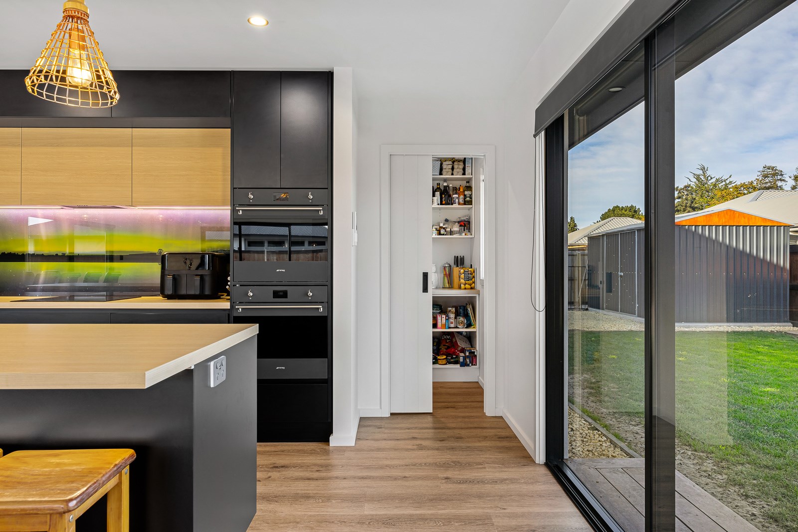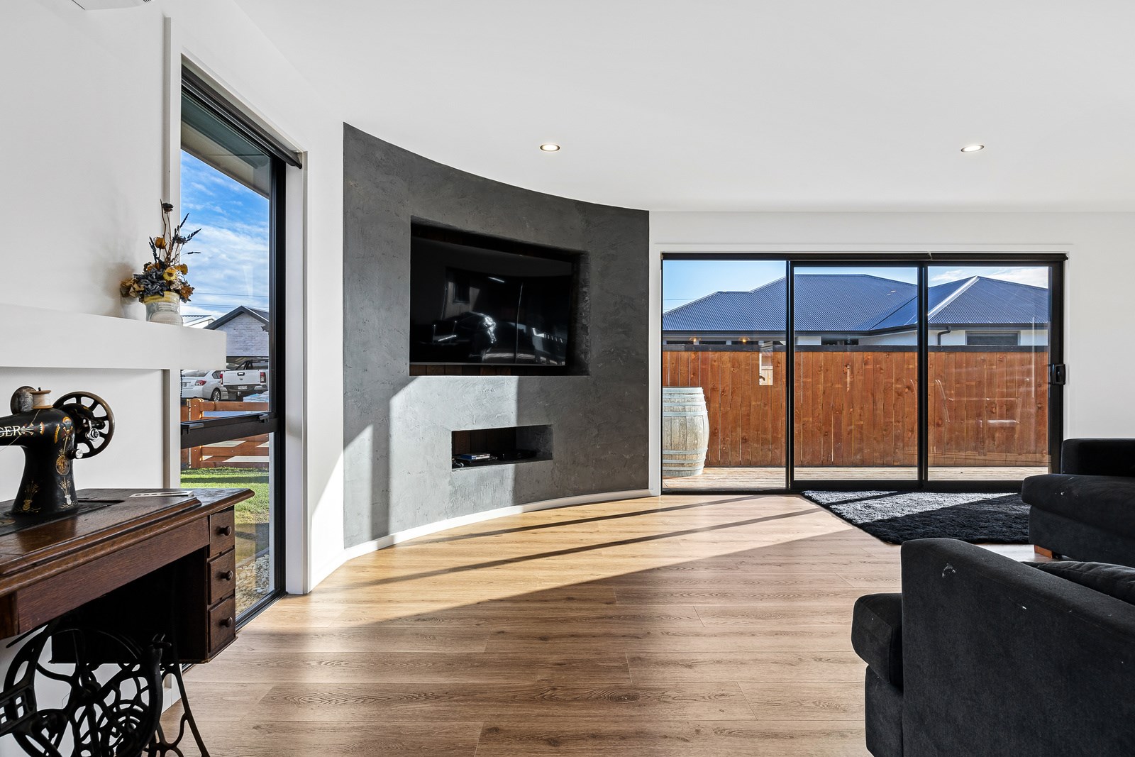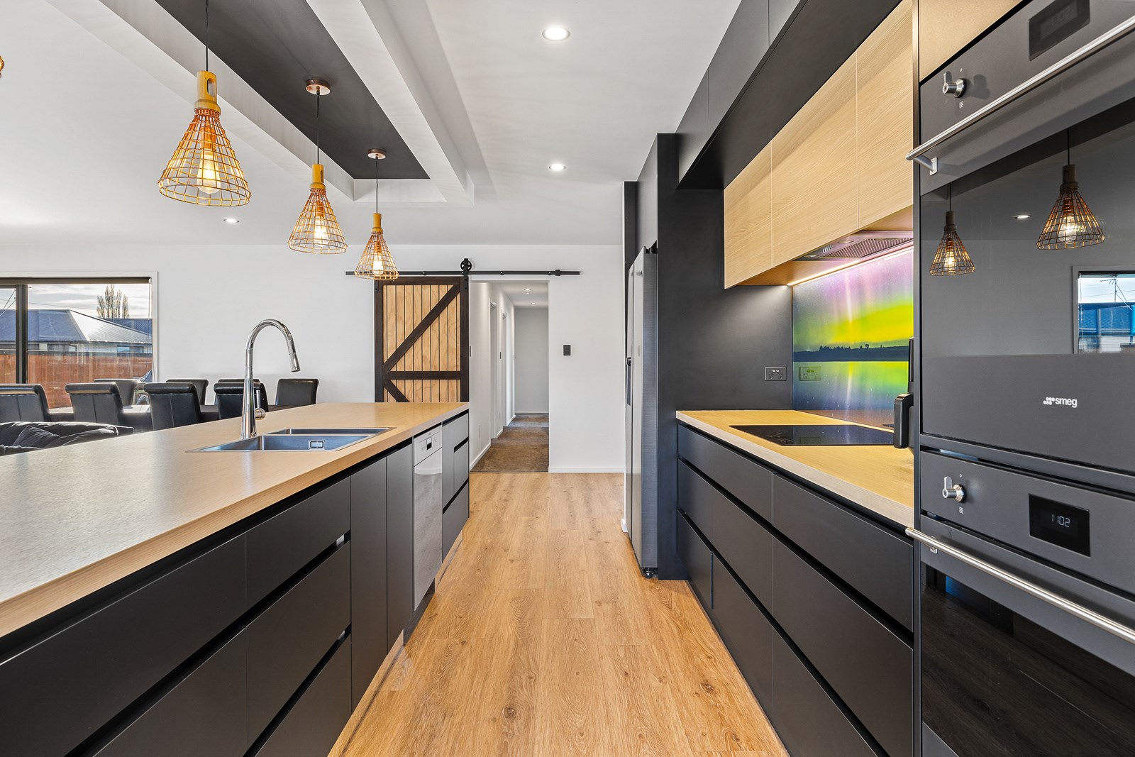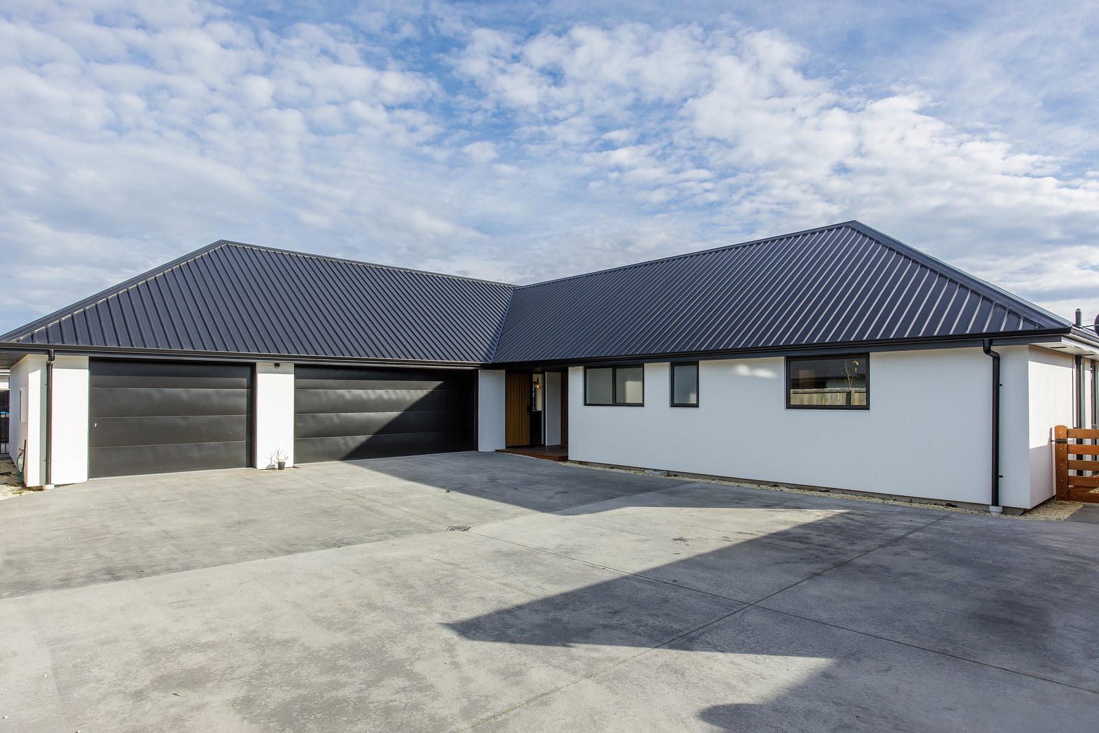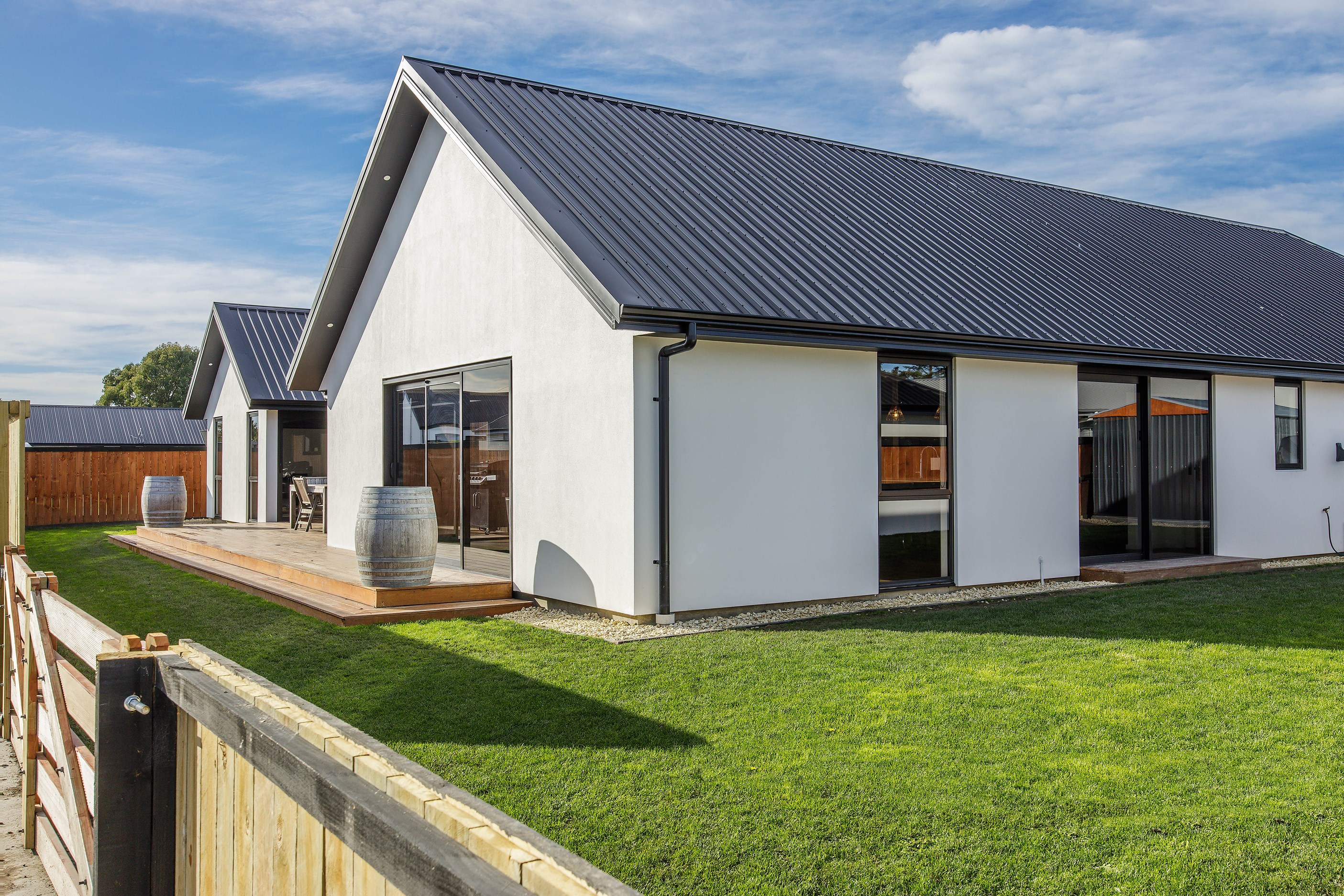 On the outskirts of Ashburton you’ll find this twin-gabled home resplendent in crisp white plaster accented with dark joinery and roofing, and vertical shiplap. It’s a study in strong, simple lines. It’s also a house that has every family want and need covered: four bedrooms, two bathrooms, a three-car garage with a workshop and attic storage, and plenty of other bells and whistles. The 243sqm floorplan is arranged in two wings with a link between. In the longer of the two, you’ll find the dark grey and timber-toned executive kitchen, which has flush cabinetry, feature splashback, sliding barn-style door and walk-in pantry. Radiating from this hub is the living zone with a statement curved fireplace and TV surround. The laundry and garage with internal access are also in this part of the house. In the other wing, you’ll find two bedrooms, including the main suite with tiled ensuite, walk-in wardrobe and underfloor heating for frosty days. The link that joins them has two more bedrooms, a family bathroom and separate toilet. Also connecting the pavilions, and making the most of the space between and beyond, is a timber deck. In summer, this is alfresco dining central. A flat, fenced section just steps away is the icing on this family-sized cake.