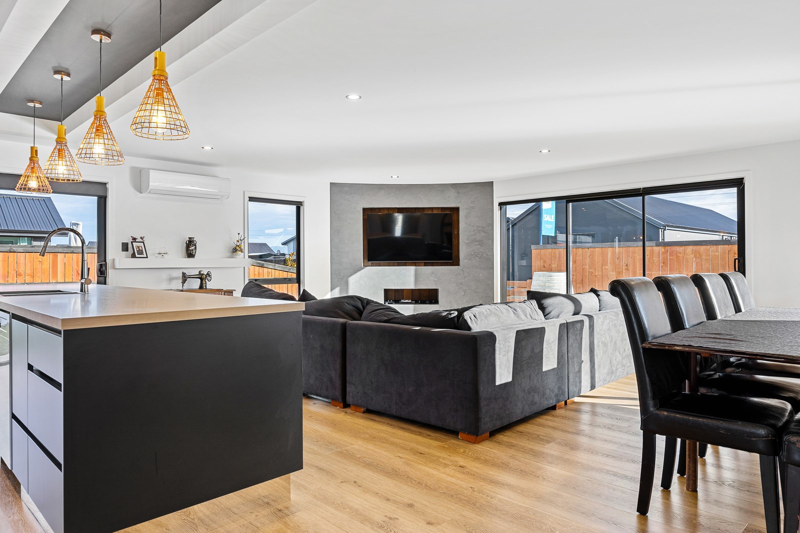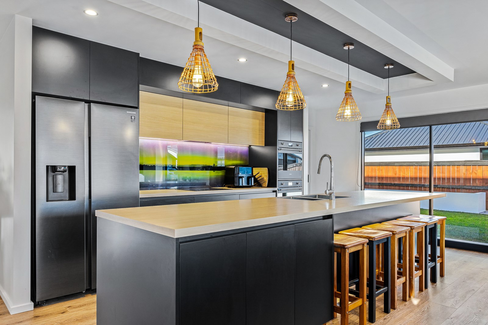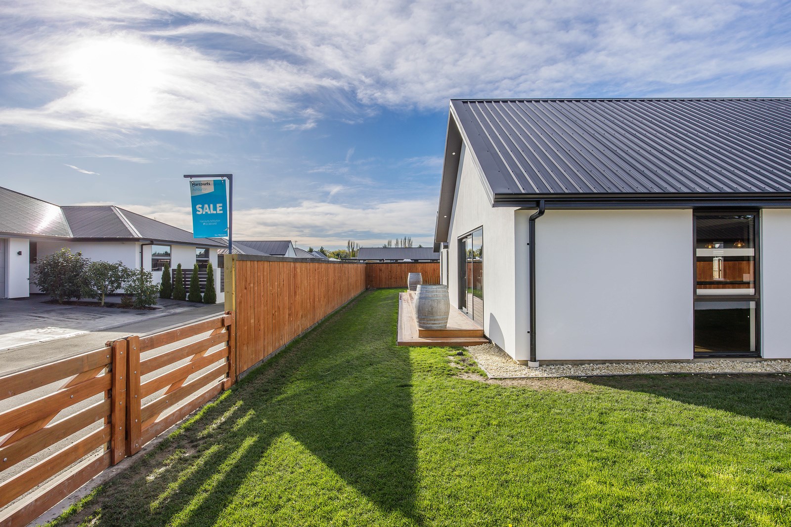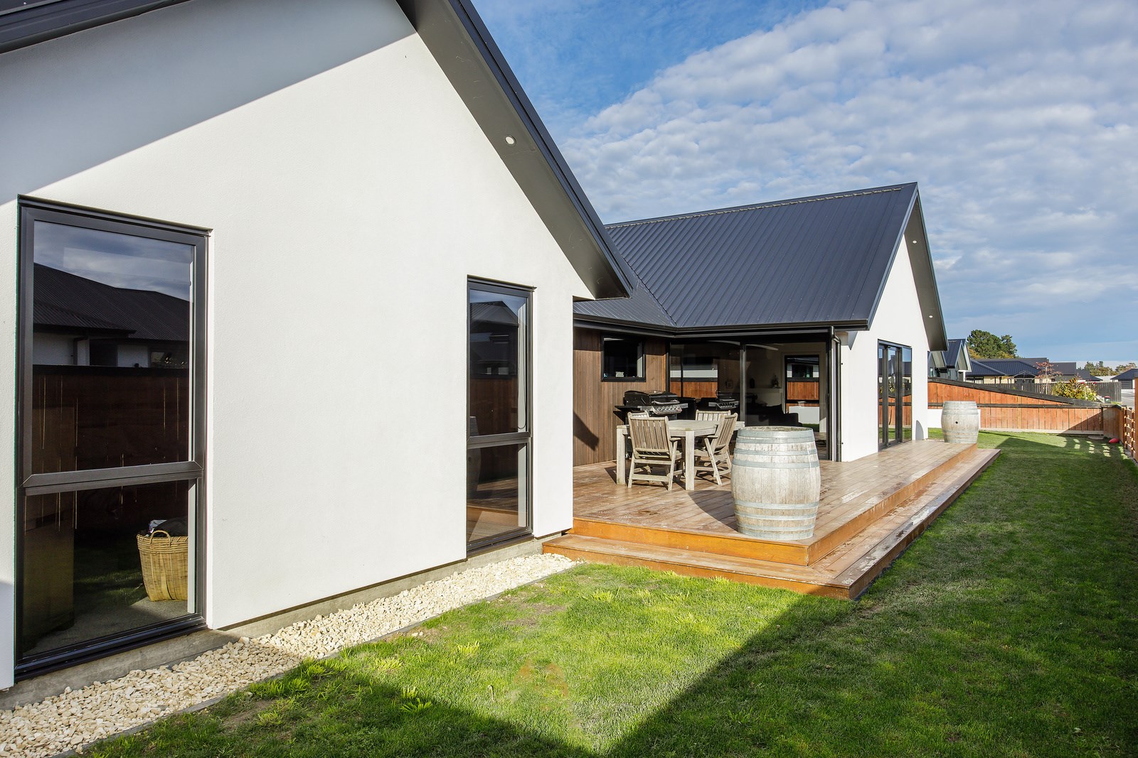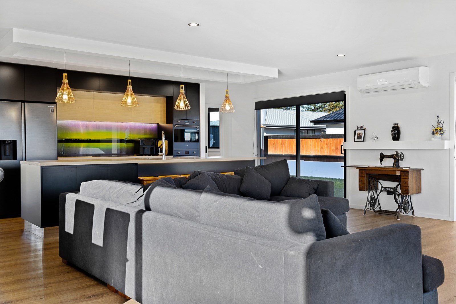 On the outskirts of Ashburton you’ll find this twin-gabled home resplendent in crisp white plaster accented with dark joinery and roofing, and vertical shiplap. It’s a study in strong, simple lines. It’s also a house that has every family want and need covered: four bedrooms, two bathrooms, a three-car garage with a workshop and attic storage, and plenty of other bells and whistles. The 243sqm floorplan is arranged in two wings with a link between. In the longer of the two, you’ll find the dark grey and timber-toned executive kitchen, which has flush cabinetry, feature splashback, sliding barn-style door and walk-in pantry. Radiating from this hub is the living zone with a statement curved fireplace and TV surround. The laundry and garage with internal access are also in this part of the house. In the other wing, you’ll find two bedrooms, including the main suite with tiled ensuite, walk-in wardrobe and underfloor heating for frosty days. The link that joins them has two more bedrooms, a family bathroom and separate toilet. Also connecting the pavilions, and making the most of the space between and beyond, is a timber deck. In summer, this is alfresco dining central. A flat, fenced section just steps away is the icing on this family-sized cake.