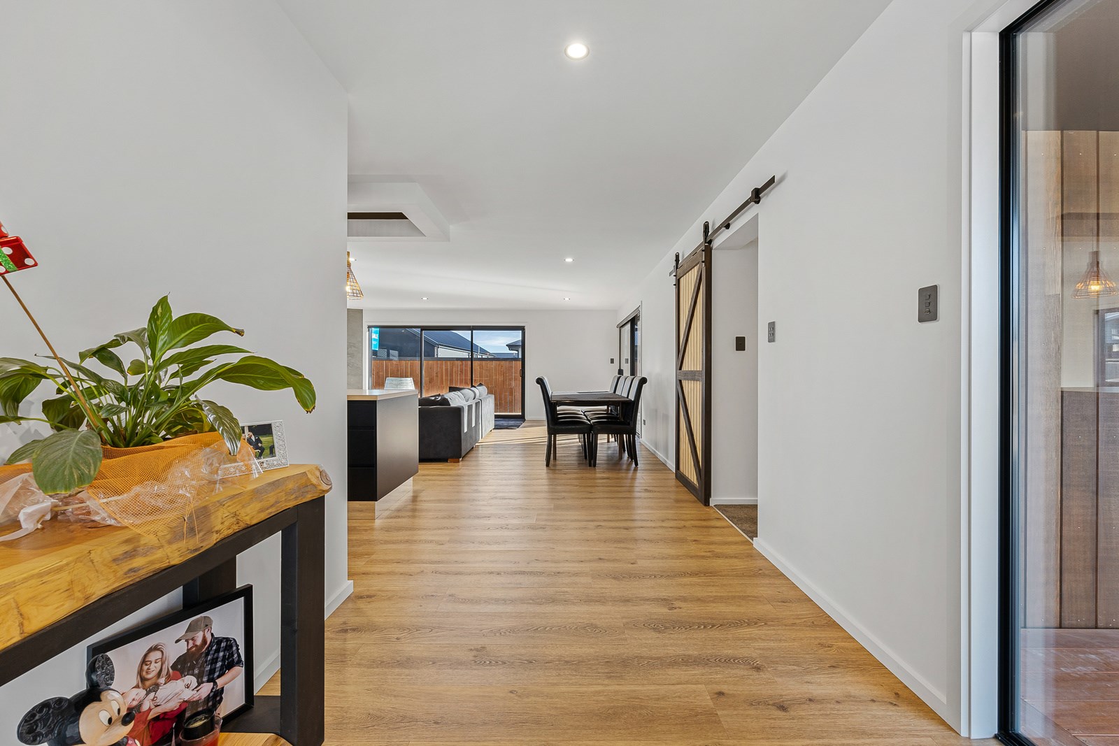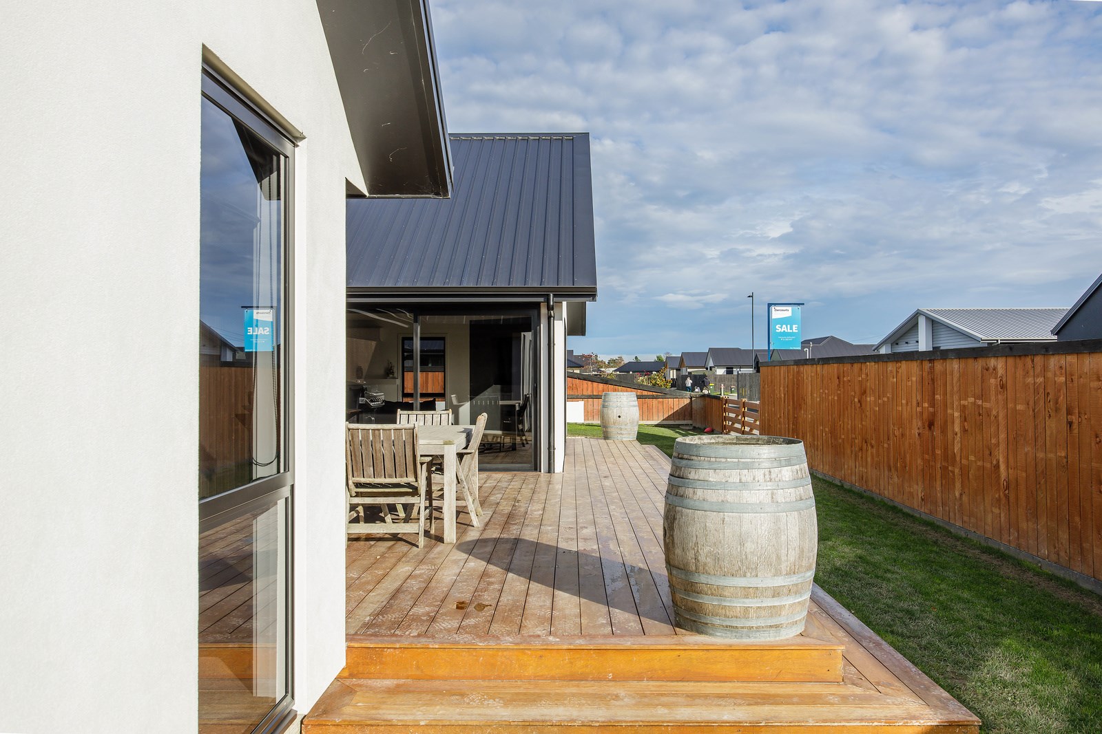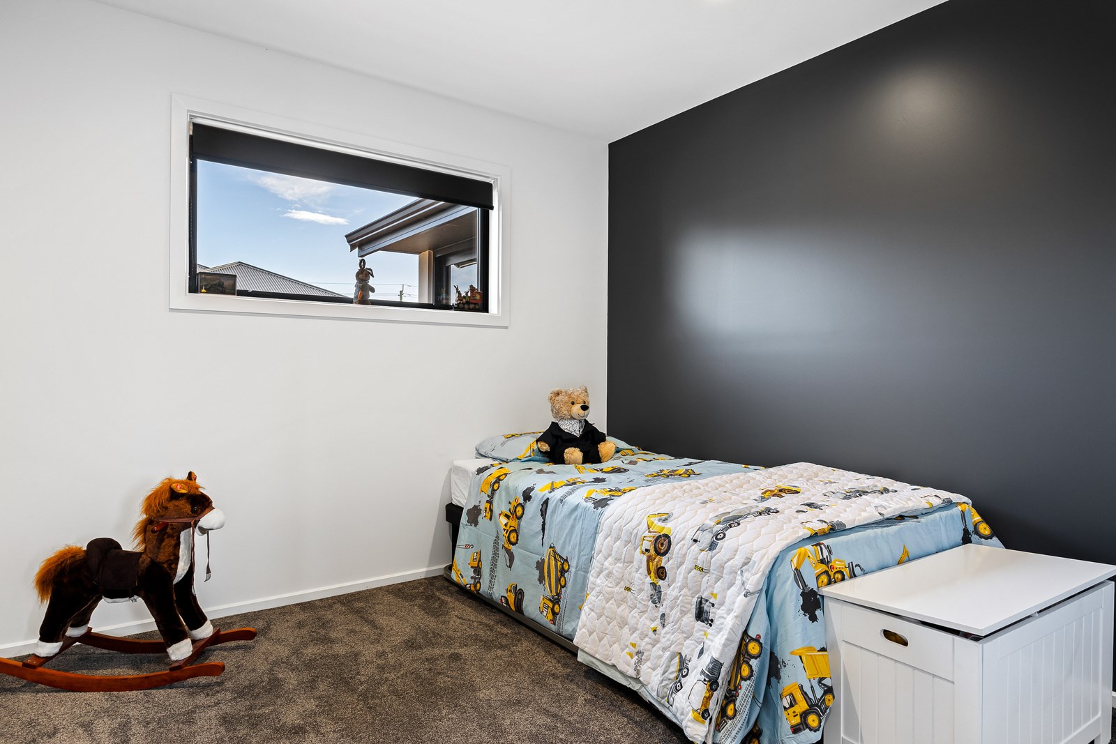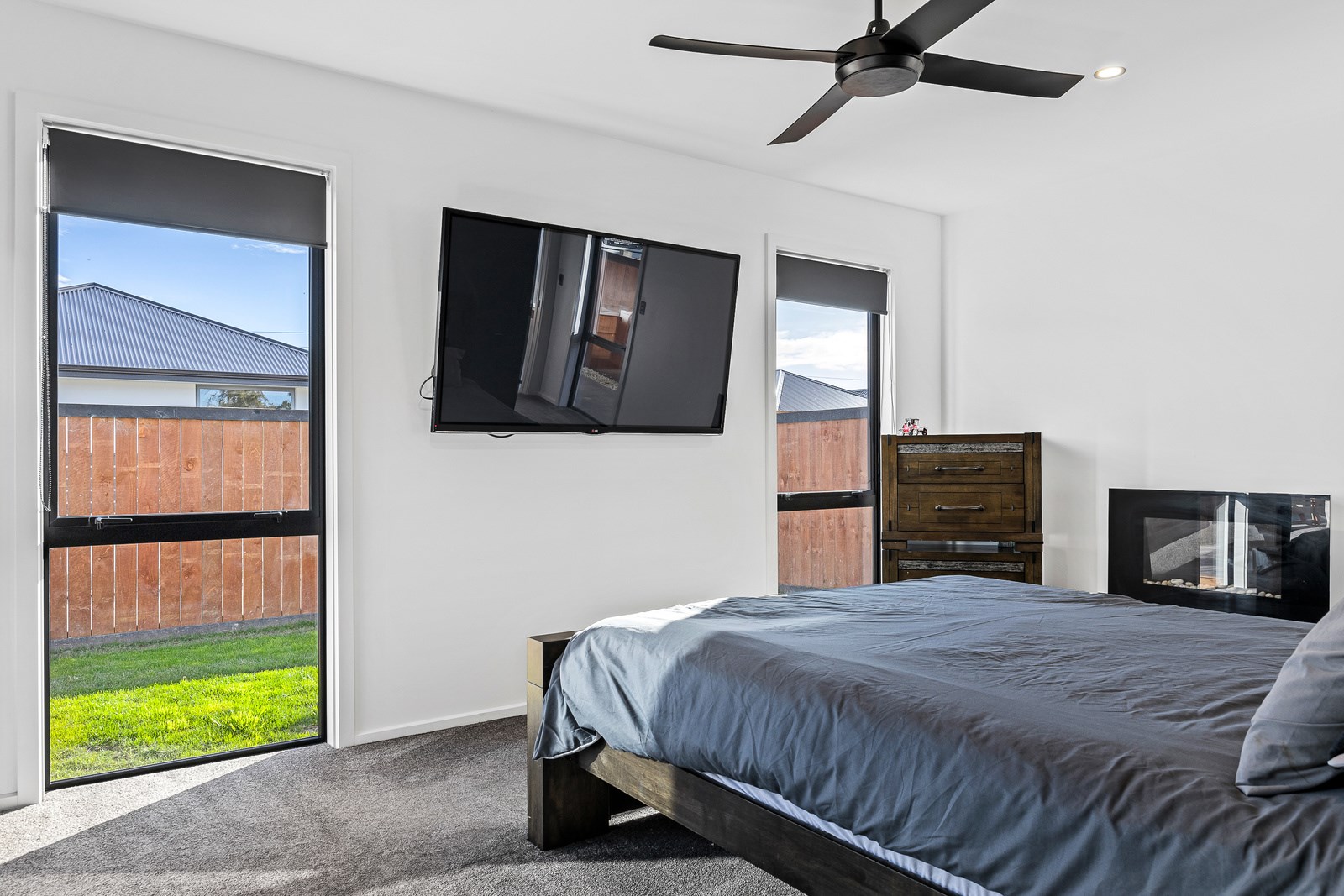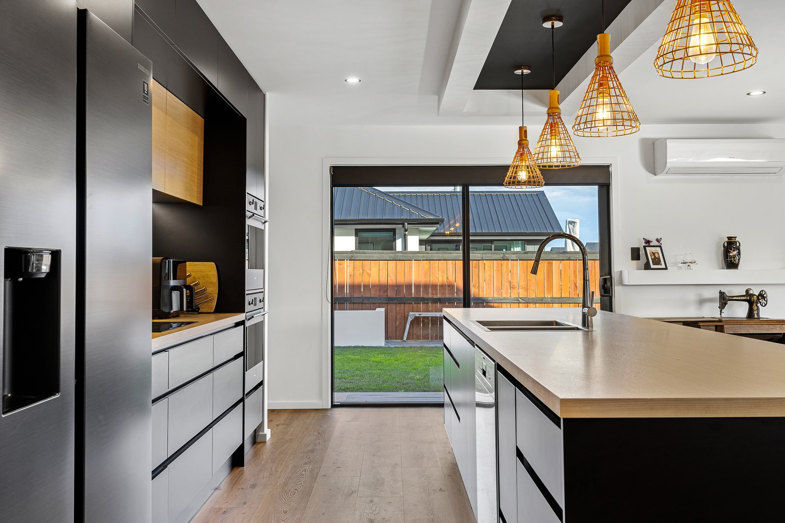 On the outskirts of Ashburton you’ll find this twin-gabled home resplendent in crisp white plaster accented with dark joinery and roofing, and vertical shiplap. It’s a study in strong, simple lines. It’s also a house that has every family want and need covered: four bedrooms, two bathrooms, a three-car garage with a workshop and attic storage, and plenty of other bells and whistles. The 243sqm floorplan is arranged in two wings with a link between. In the longer of the two, you’ll find the dark grey and timber-toned executive kitchen, which has flush cabinetry, feature splashback, sliding barn-style door and walk-in pantry. Radiating from this hub is the living zone with a statement curved fireplace and TV surround. The laundry and garage with internal access are also in this part of the house. In the other wing, you’ll find two bedrooms, including the main suite with tiled ensuite, walk-in wardrobe and underfloor heating for frosty days. The link that joins them has two more bedrooms, a family bathroom and separate toilet. Also connecting the pavilions, and making the most of the space between and beyond, is a timber deck. In summer, this is alfresco dining central. A flat, fenced section just steps away is the icing on this family-sized cake.