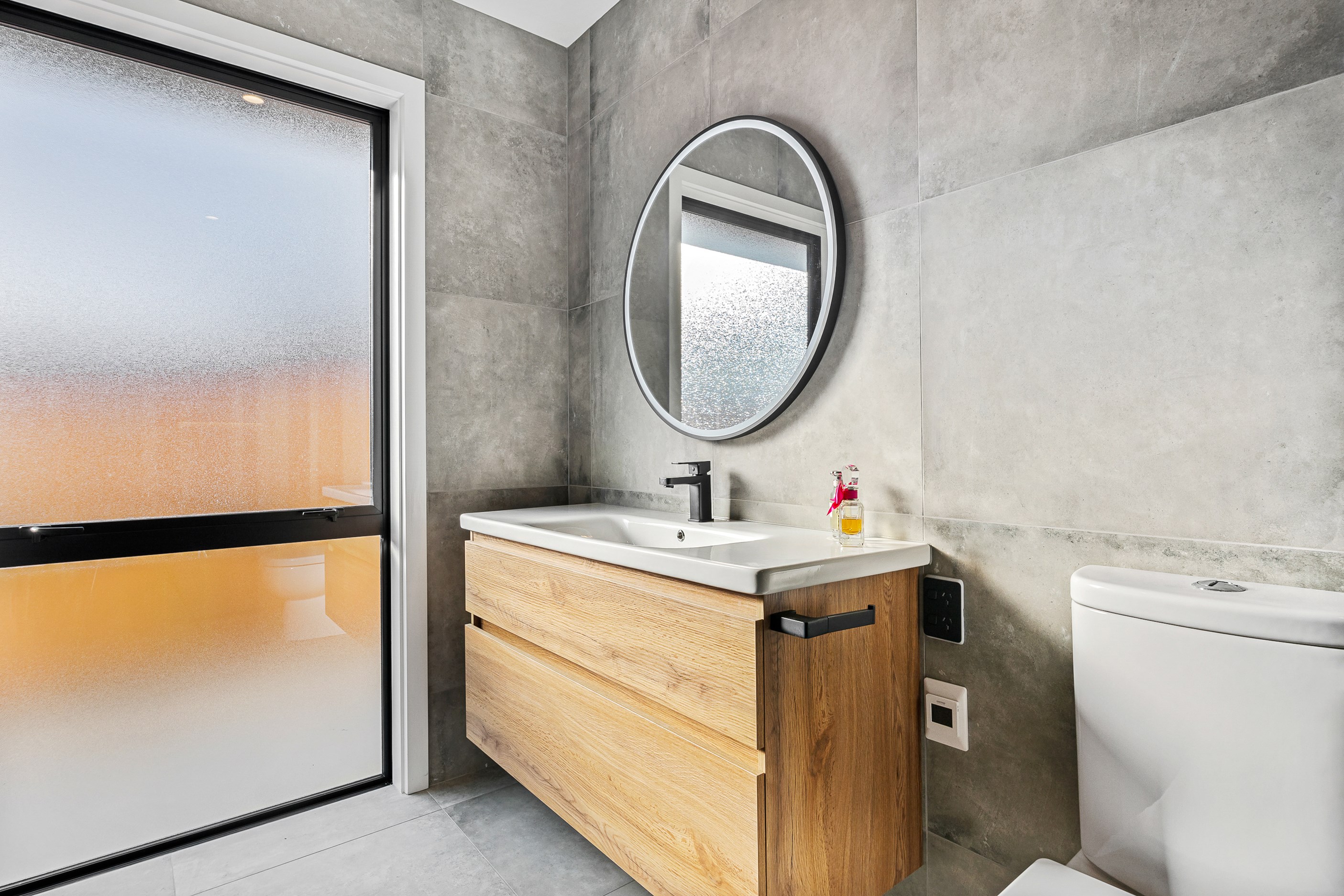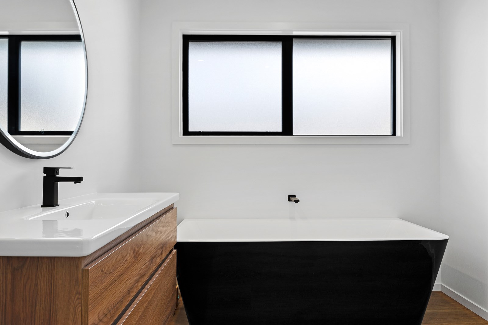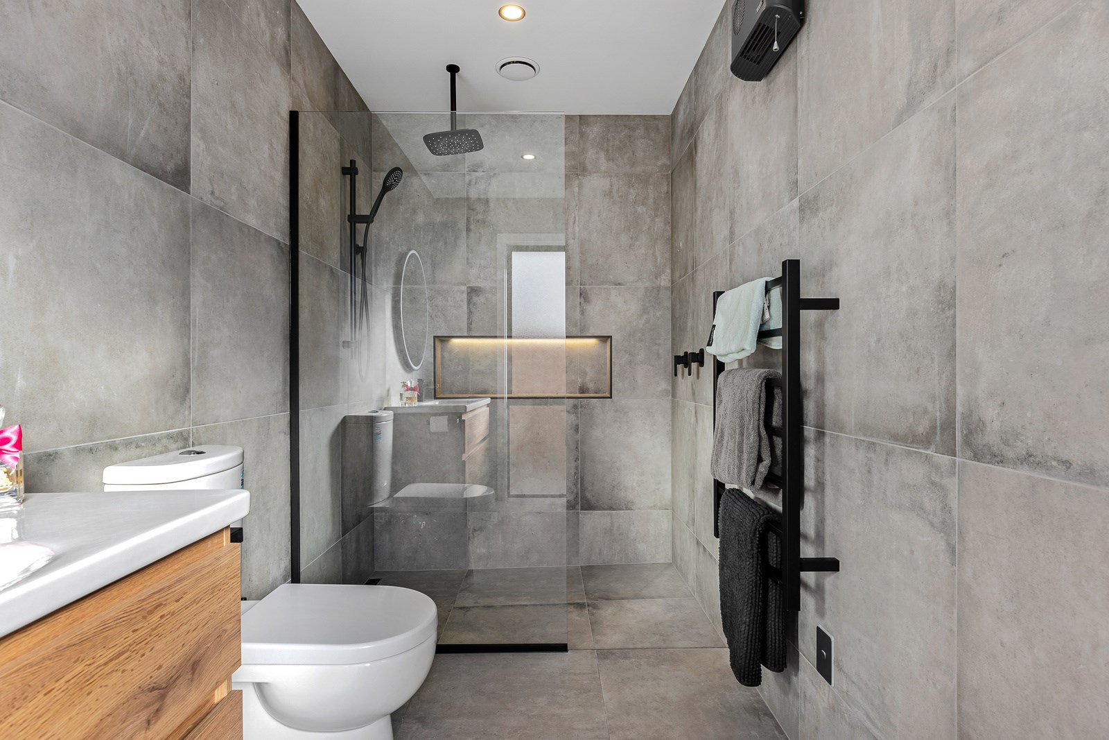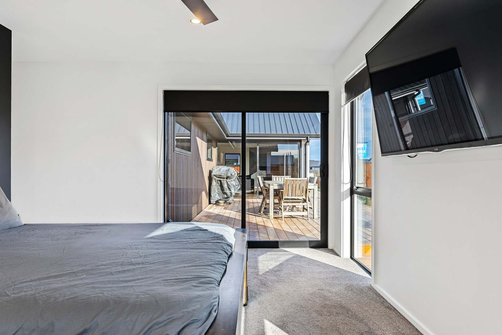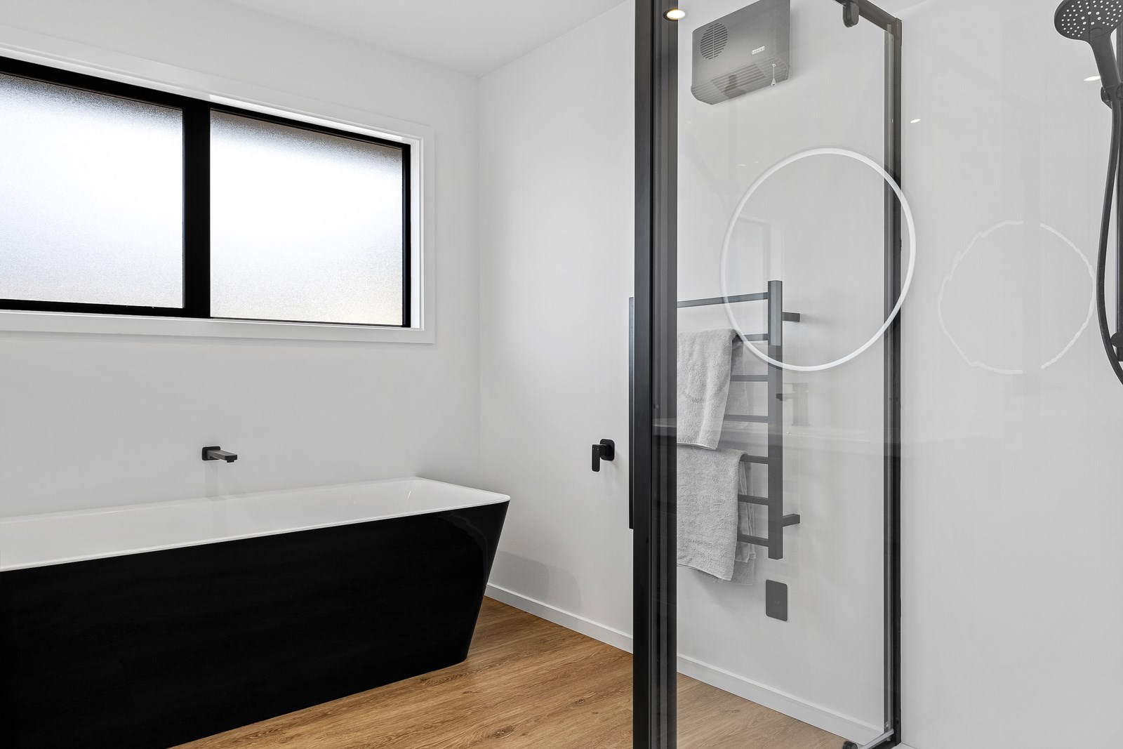 On the outskirts of Ashburton you’ll find this twin-gabled home resplendent in crisp white plaster accented with dark joinery and roofing, and vertical shiplap. It’s a study in strong, simple lines. It’s also a house that has every family want and need covered: four bedrooms, two bathrooms, a three-car garage with a workshop and attic storage, and plenty of other bells and whistles. The 243sqm floorplan is arranged in two wings with a link between. In the longer of the two, you’ll find the dark grey and timber-toned executive kitchen, which has flush cabinetry, feature splashback, sliding barn-style door and walk-in pantry. Radiating from this hub is the living zone with a statement curved fireplace and TV surround. The laundry and garage with internal access are also in this part of the house. In the other wing, you’ll find two bedrooms, including the main suite with tiled ensuite, walk-in wardrobe and underfloor heating for frosty days. The link that joins them has two more bedrooms, a family bathroom and separate toilet. Also connecting the pavilions, and making the most of the space between and beyond, is a timber deck. In summer, this is alfresco dining central. A flat, fenced section just steps away is the icing on this family-sized cake.