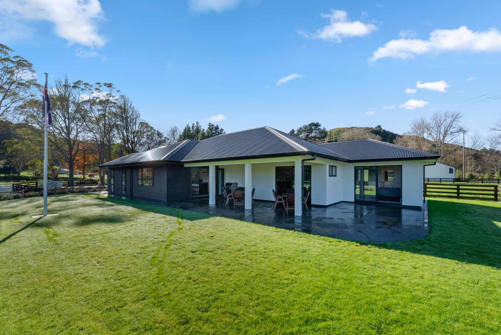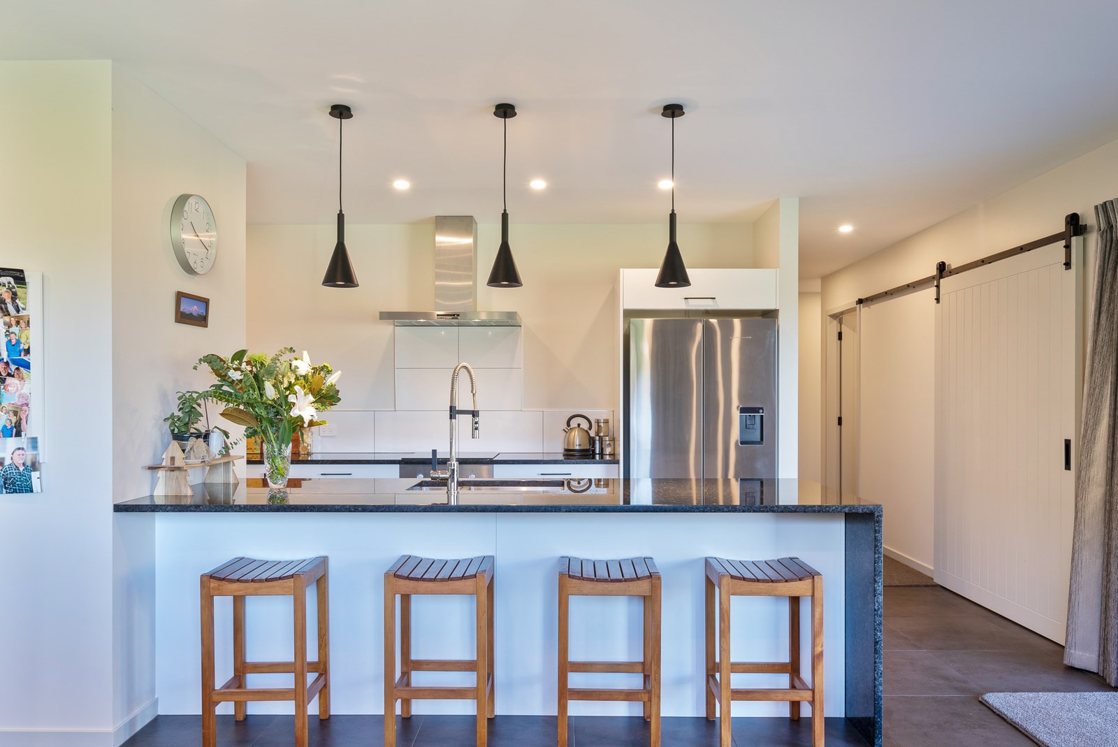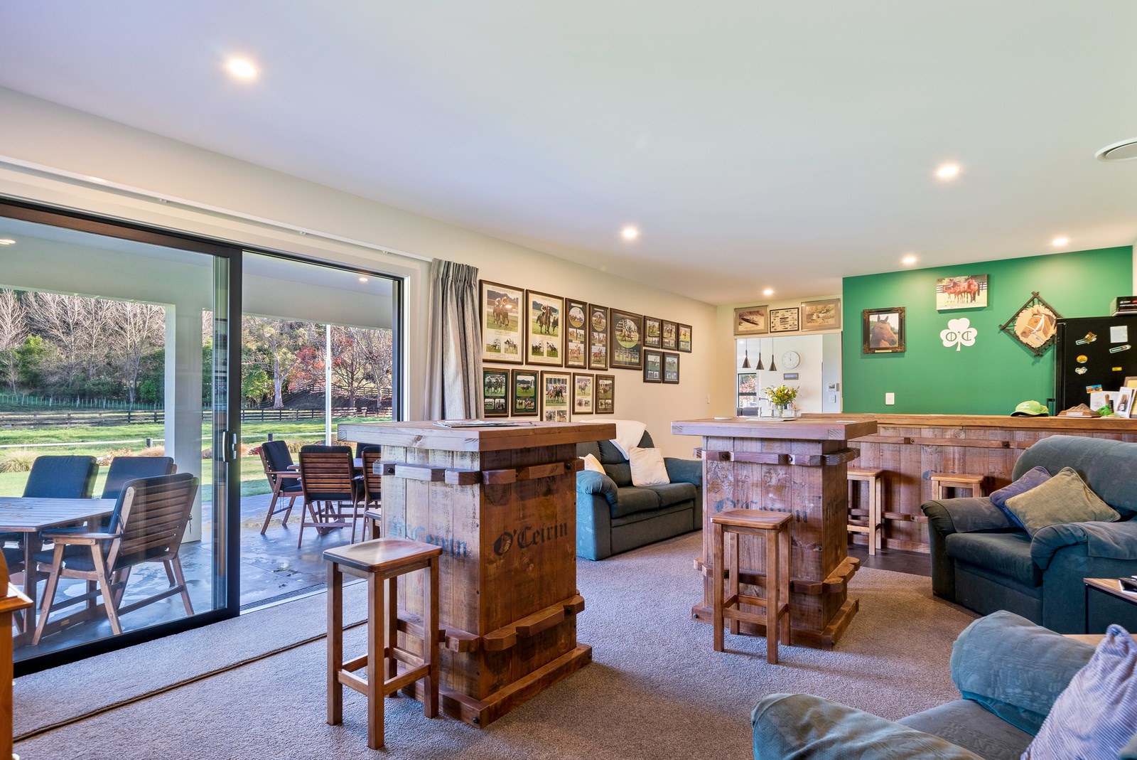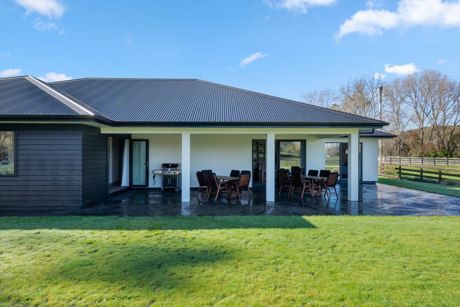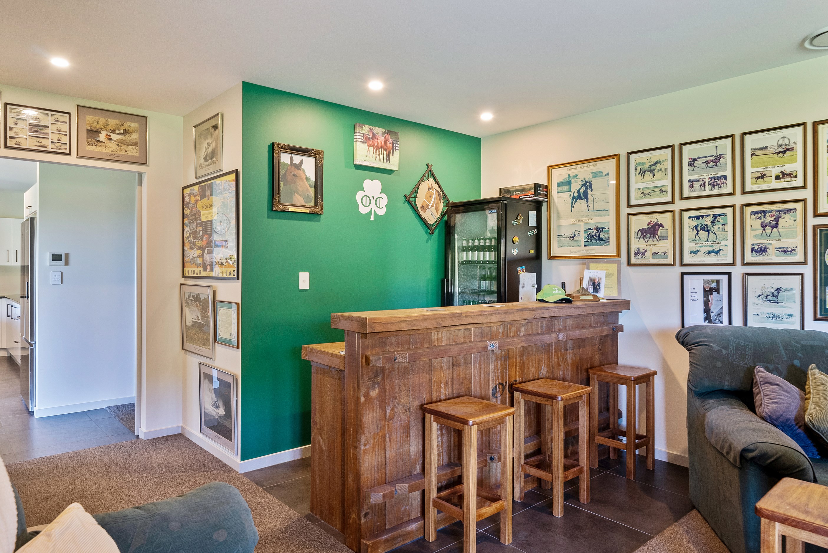 In equestrian country just out of Whanganui, you’ll find this 229sqm home built with the owners’ passion for racehorses in mind. The black-and-white charmer with three bedrooms and two bathrooms has the real look and feel of a ranch, with its wide eaves, curving driveway, shades-of-green pasture and triple garage with a sleepout and workshop. There’s more, however. This house has a separate room devoted to celebrating horse breeding and racing. Here you’ll find trophies, photographs, bar tables and a purpose-built bar with stools. It’s just the place in which to revel in successes and entertain others in the industry. Elsewhere in this handsome home, the equine theme has been reined in and you can focus on the high-spec features and craftsmanship on display. It’s most evident in the open-plan kitchen, dining and living space that merges into the outdoor living space, sheltering under the eaves. The kitchen, with a waterfall-end bench, topend fixtures and plenty of storage, has a scullery that winds around the kitchen corner. This communal area is the consummate place in which to host friends and family. The house finishes strongly with white plaster and dark weatherboard cladding, and long-run steel roofing.