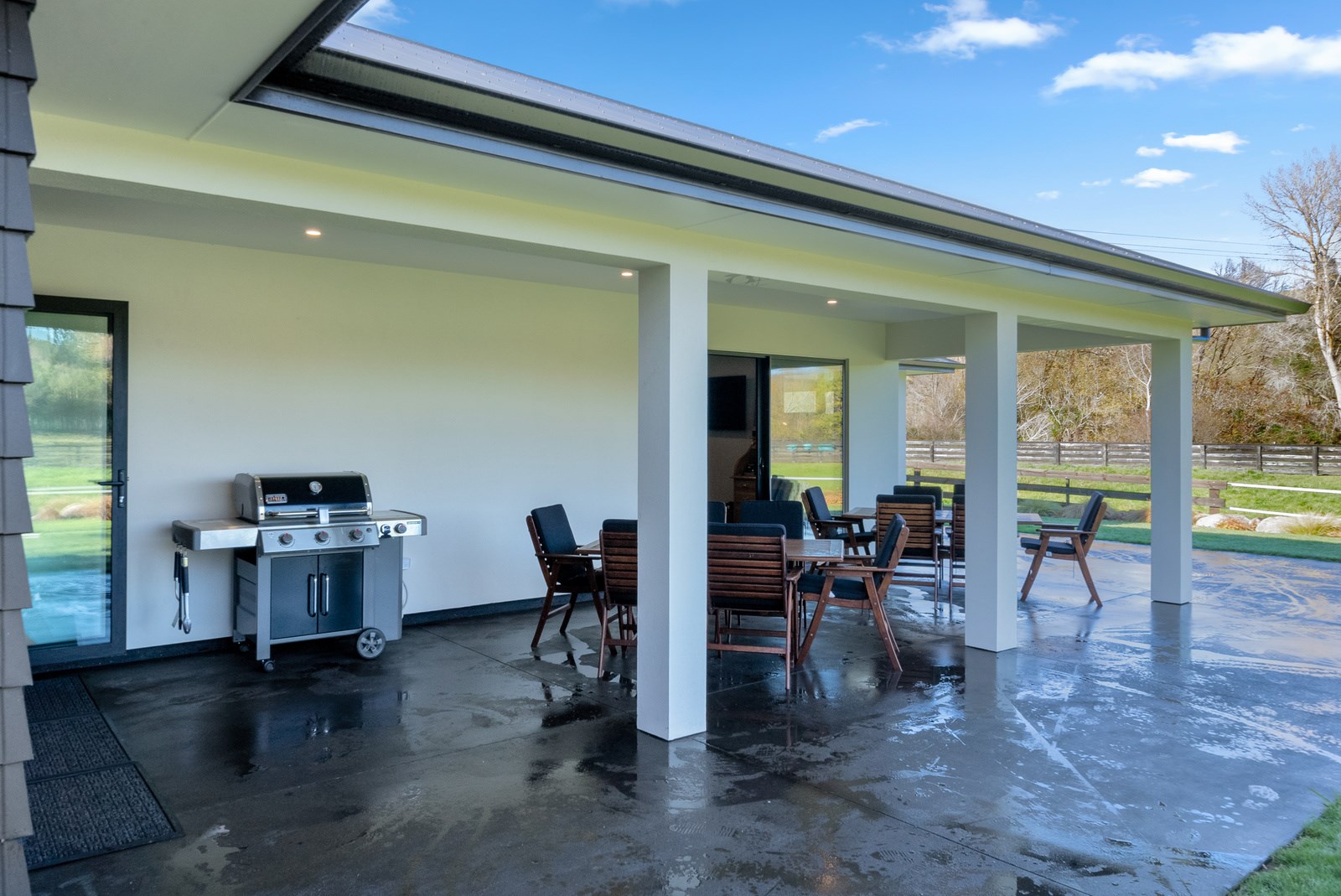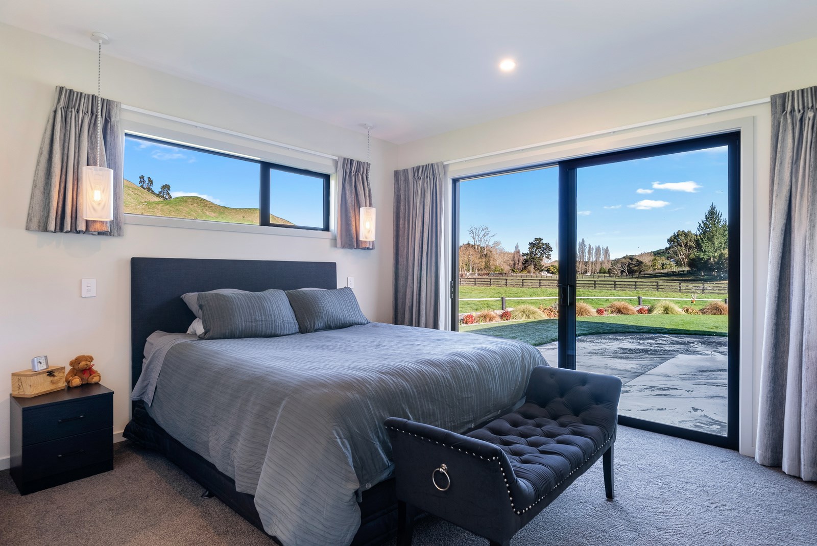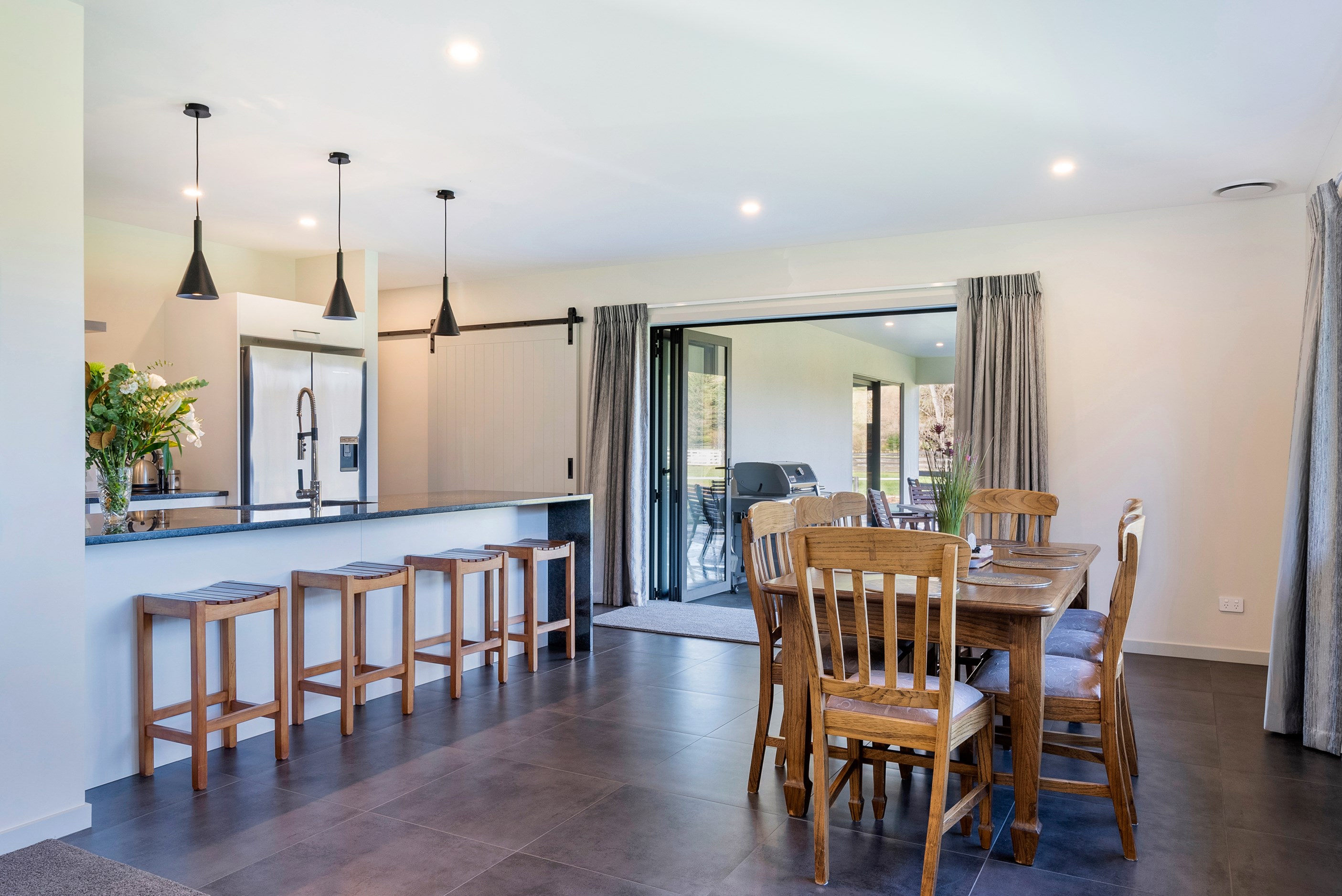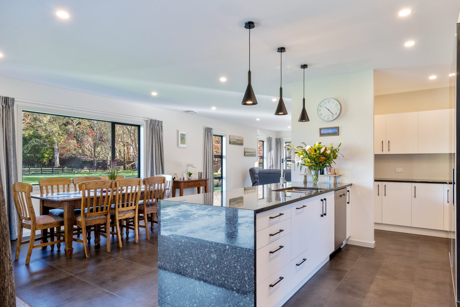 In equestrian country just out of Whanganui, you’ll find this 229sqm home built with the owners’ passion for racehorses in mind. The black-and-white charmer with three bedrooms and two bathrooms has the real look and feel of a ranch, with its wide eaves, curving driveway, shades-of-green pasture and triple garage with a sleepout and workshop. There’s more, however. This house has a separate room devoted to celebrating horse breeding and racing. Here you’ll find trophies, photographs, bar tables and a purpose-built bar with stools. It’s just the place in which to revel in successes and entertain others in the industry. Elsewhere in this handsome home, the equine theme has been reined in and you can focus on the high-spec features and craftsmanship on display. It’s most evident in the open-plan kitchen, dining and living space that merges into the outdoor living space, sheltering under the eaves. The kitchen, with a waterfall-end bench, topend fixtures and plenty of storage, has a scullery that winds around the kitchen corner. This communal area is the consummate place in which to host friends and family. The house finishes strongly with white plaster and dark weatherboard cladding, and long-run steel roofing.