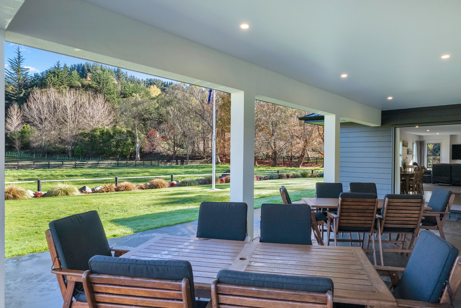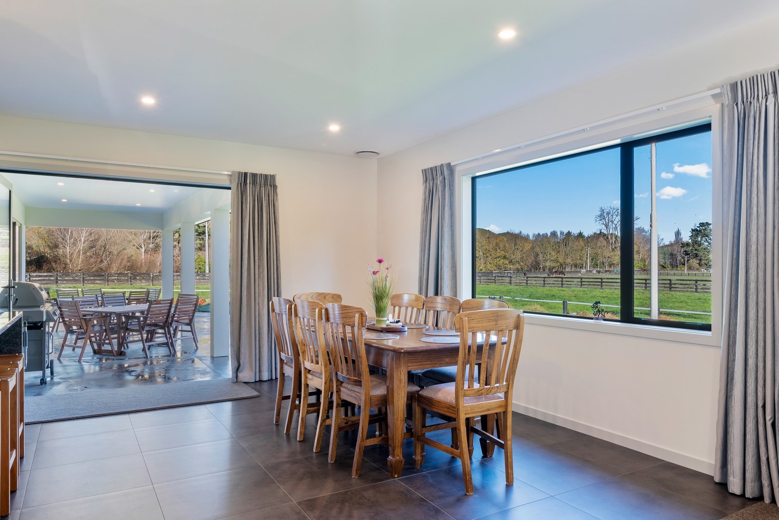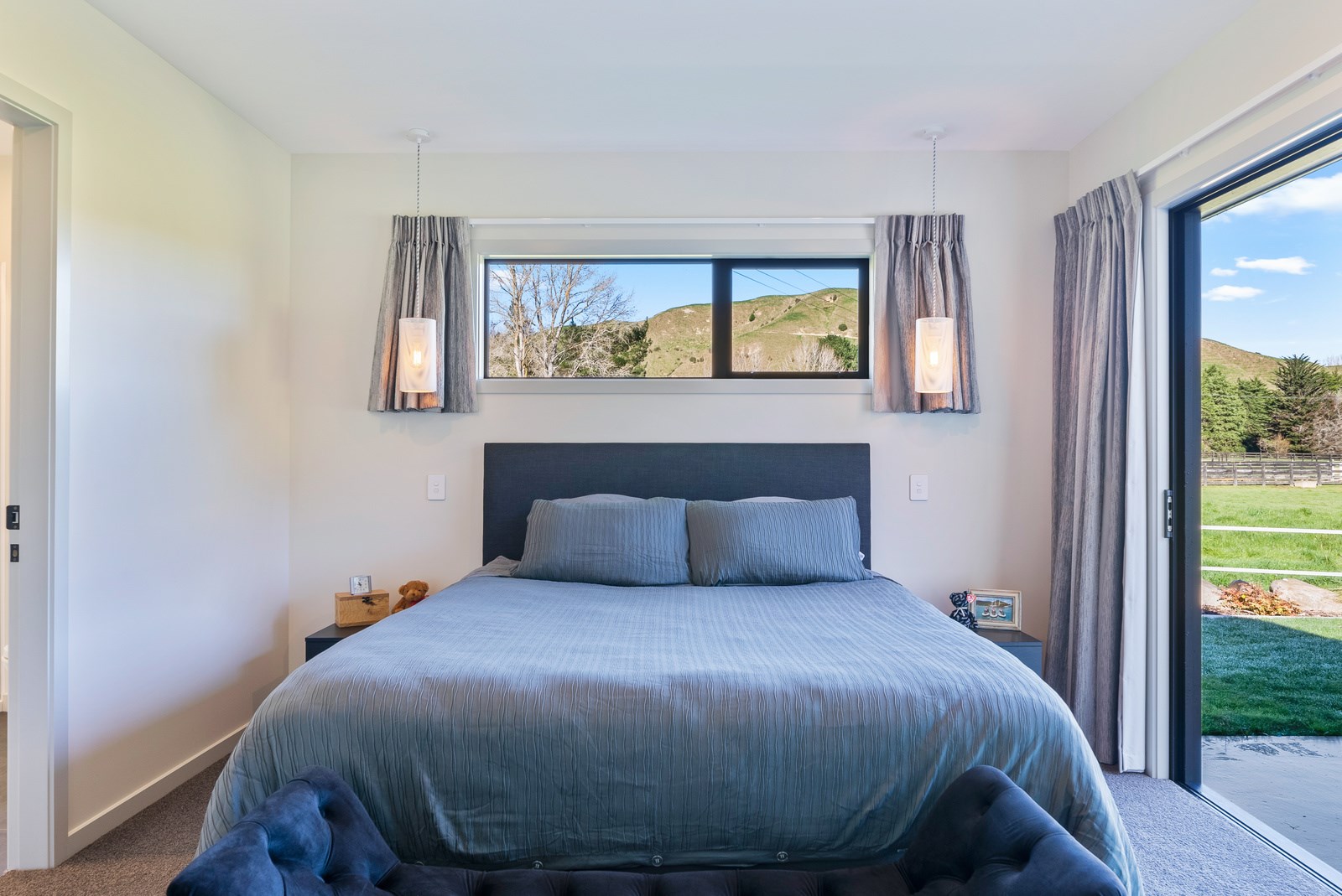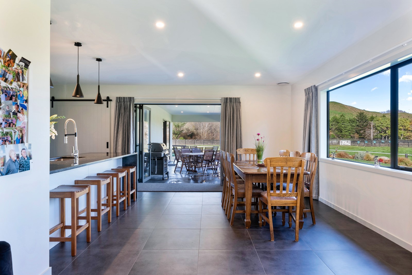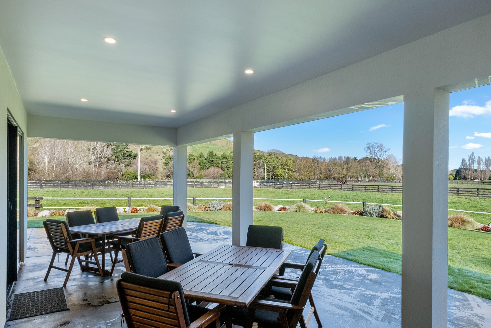 In equestrian country just out of Whanganui, you’ll find this 229sqm home built with the owners’ passion for racehorses in mind. The black-and-white charmer with three bedrooms and two bathrooms has the real look and feel of a ranch, with its wide eaves, curving driveway, shades-of-green pasture and triple garage with a sleepout and workshop. There’s more, however. This house has a separate room devoted to celebrating horse breeding and racing. Here you’ll find trophies, photographs, bar tables and a purpose-built bar with stools. It’s just the place in which to revel in successes and entertain others in the industry. Elsewhere in this handsome home, the equine theme has been reined in and you can focus on the high-spec features and craftsmanship on display. It’s most evident in the open-plan kitchen, dining and living space that merges into the outdoor living space, sheltering under the eaves. The kitchen, with a waterfall-end bench, topend fixtures and plenty of storage, has a scullery that winds around the kitchen corner. This communal area is the consummate place in which to host friends and family. The house finishes strongly with white plaster and dark weatherboard cladding, and long-run steel roofing.