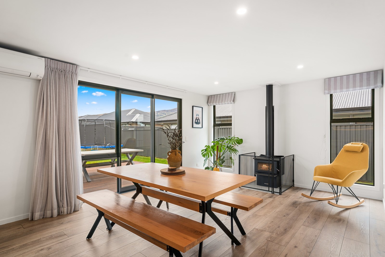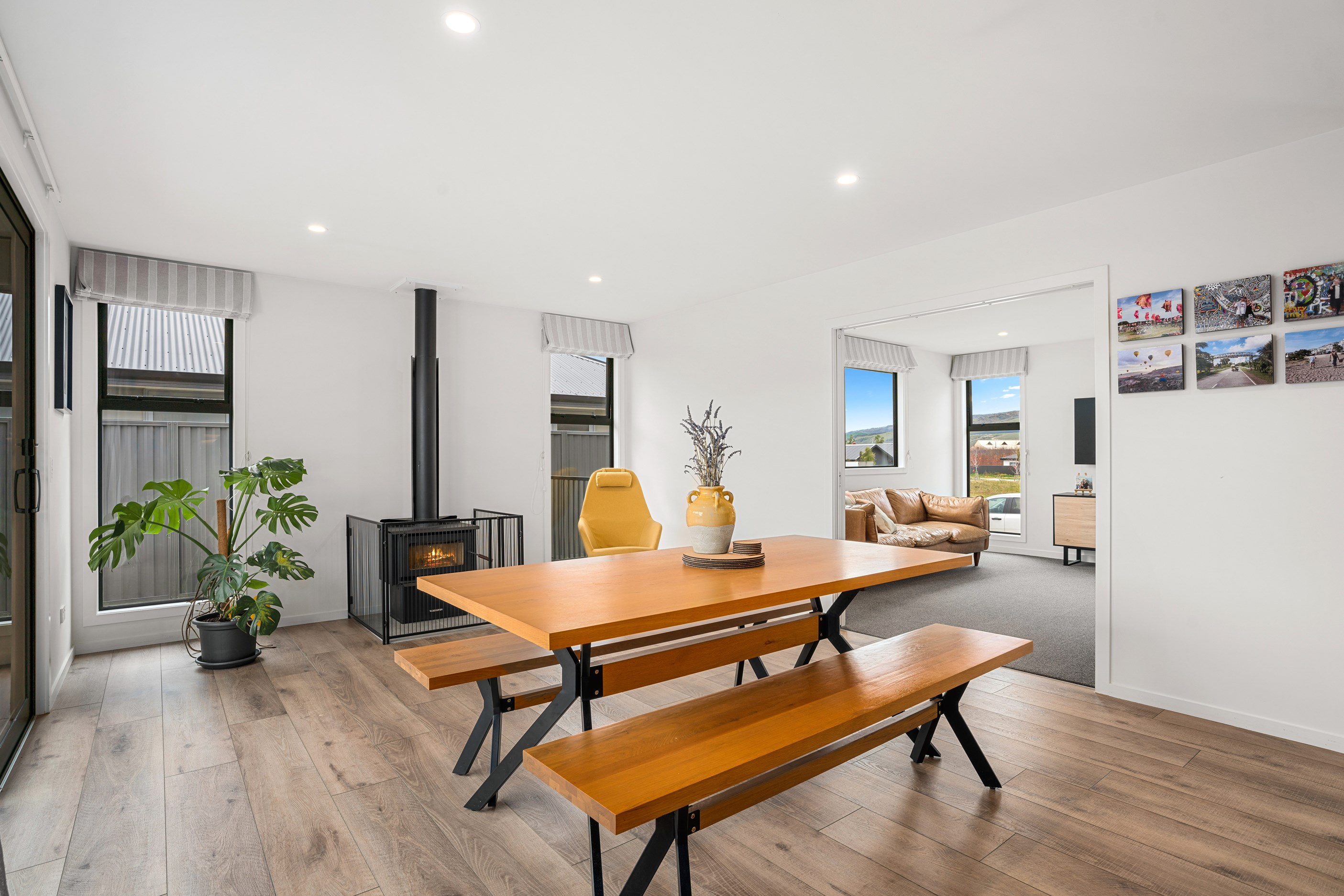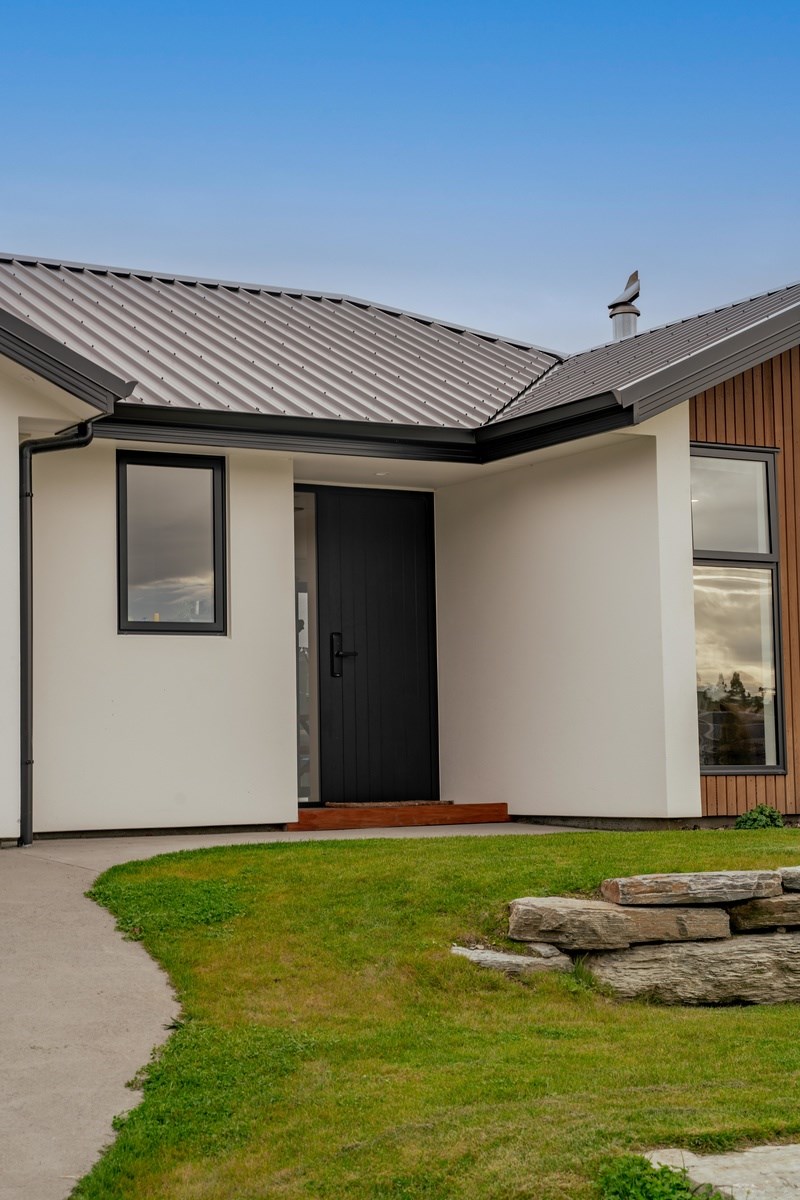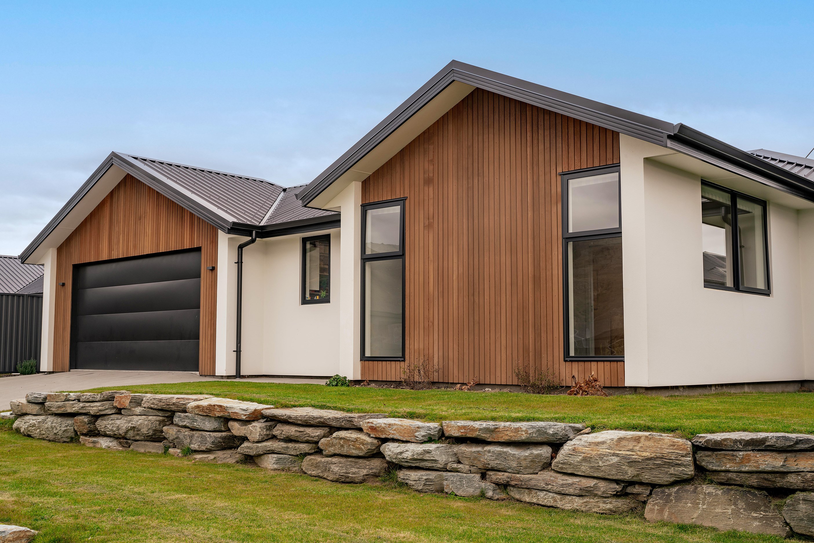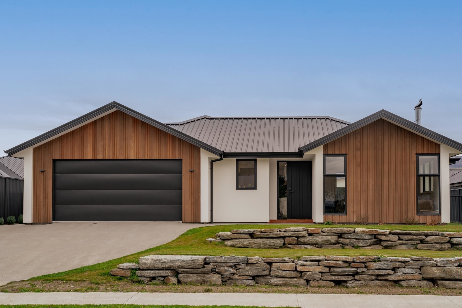 Twin gables, open-plan living, four bedrooms and two bathrooms — welcome to your ideal family home. Add a double garage, separate lounge, flat section and L-shaped deck, and this 180sqm house goes from ideal to next-level appeal. You can never go wrong with a classic design and this one, with a vertical western red cedar and plaster exterior and dark steel roof, is a case in point. Lines of stacked schist break up the front lawn and tie the house to its Central Otago locale. Open the front door and you won’t be disappointed. There’s an instant feeling of space, thanks to crisp walls and a streamlined white-on-white kitchen with a walk-in pantry. Don’t assume that pale means boring. Far from it. A trio of pendants hovering above the island and a splashback in pale mint tiles ramp up the interest. The carpeted lounge off the side of the open-plan zone benefits from lots of double glazing and can be closed off with double cavity sliders. Anyone for a movie? A central hallway leads to the bedrooms and bathroom with a tiled shower, wood-look floating vanity and bath. The main bedroom, at the end of hall for privacy and space, has a walk-in wardrobe, ensuite and plenty of natural light. This is a modern classic, pure and simple.